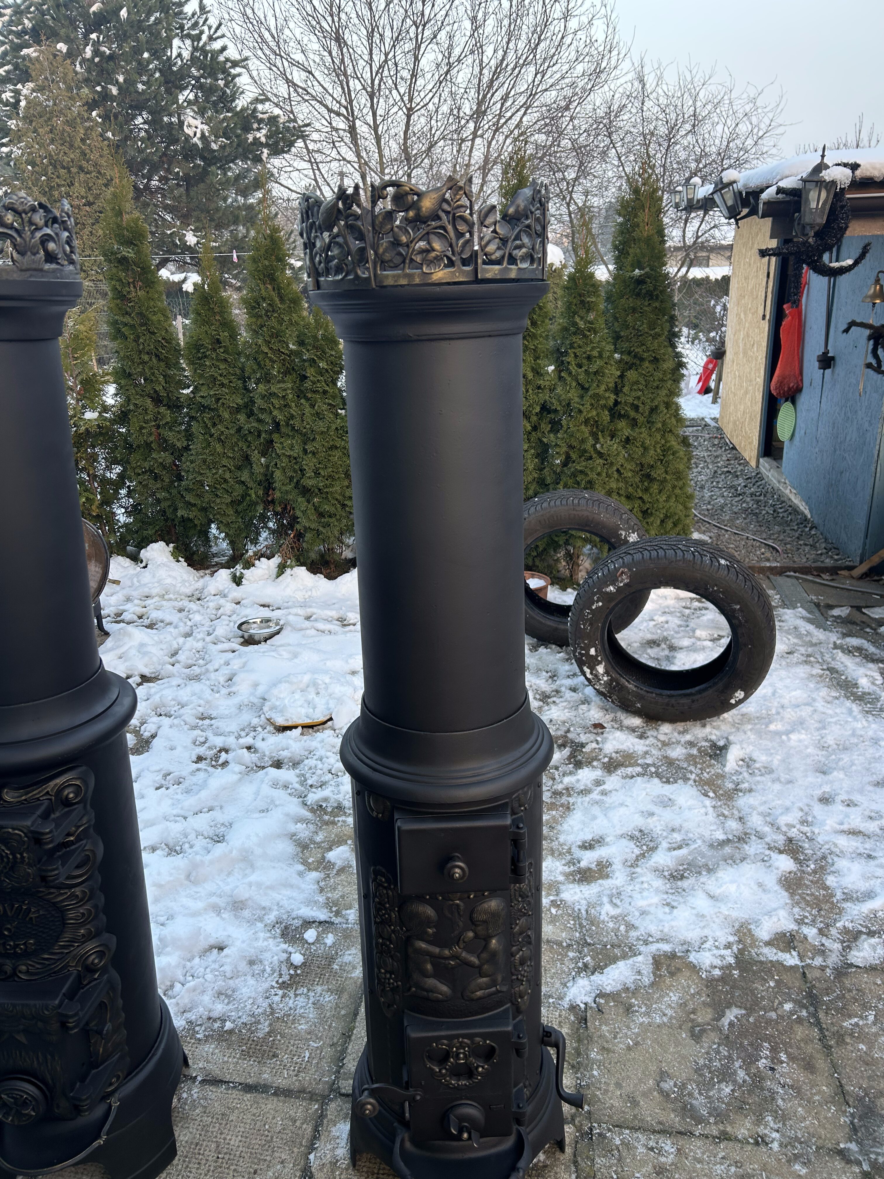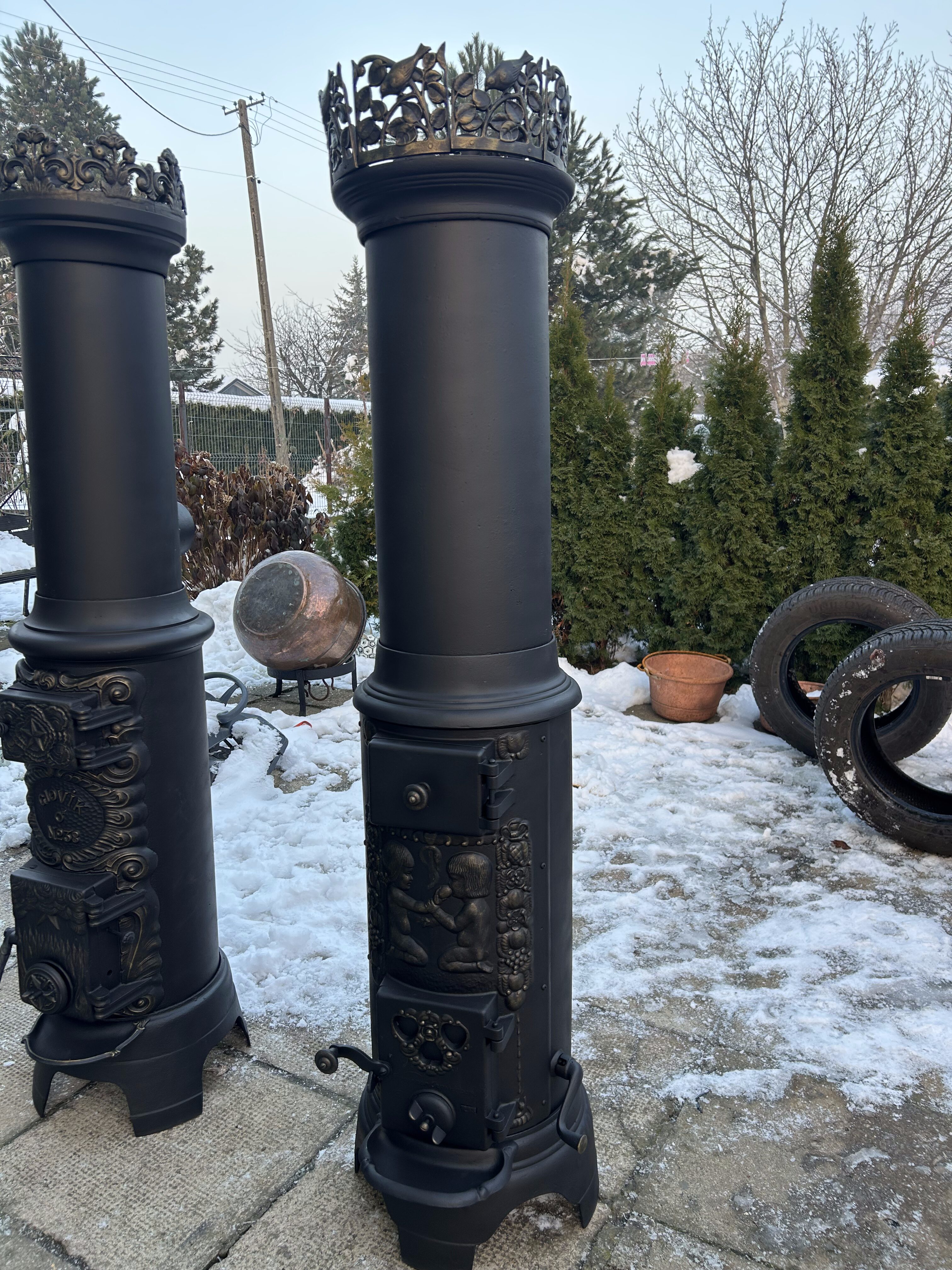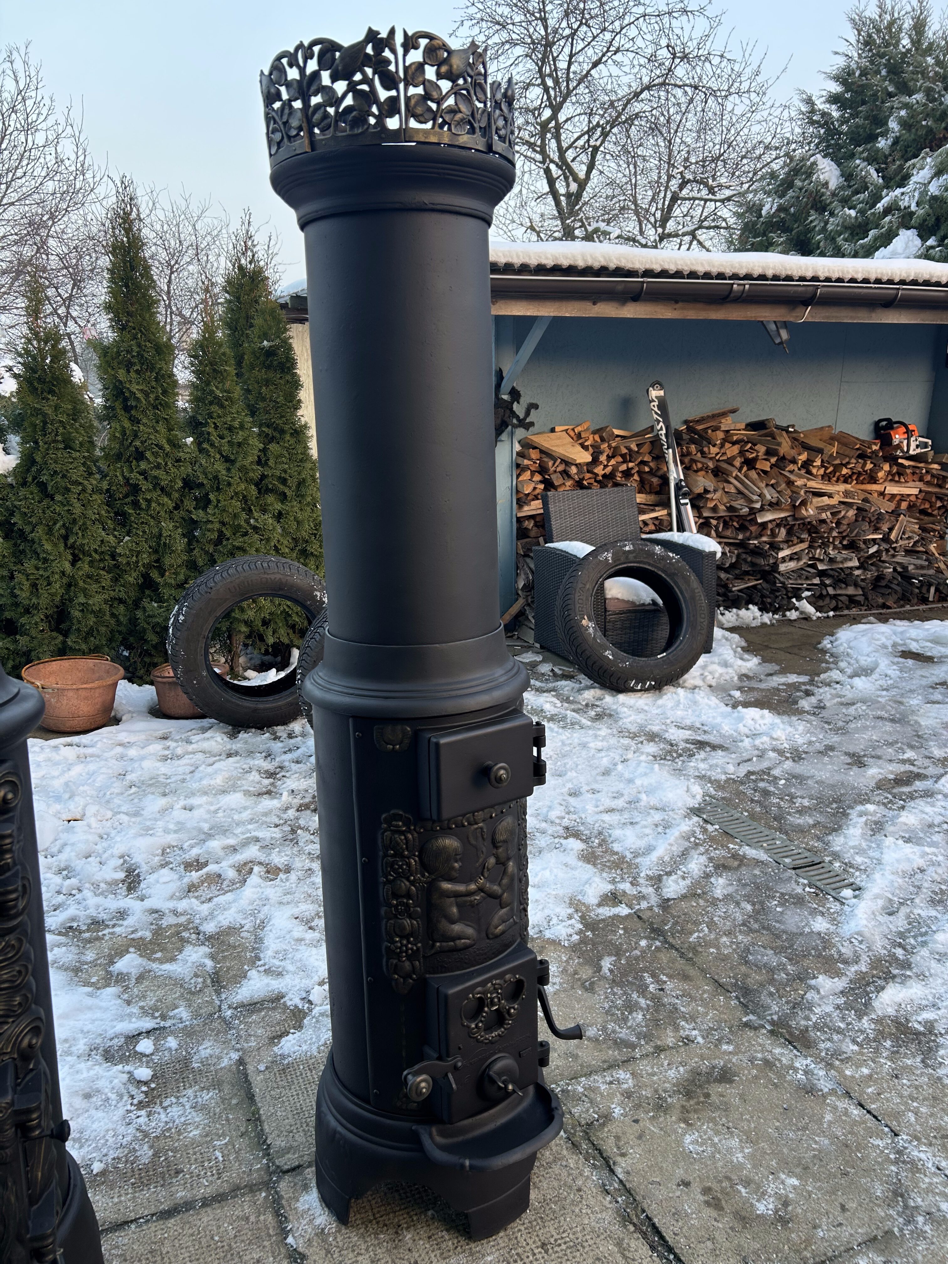 Piec został starannie odrestaurowany: wypiaskowany, pomalowany trzykrotnie czarną farbą żaroodporną oraz subtelnie wykończony złotą farbą żaroodporną, co podkreśla bogate ornamenty i dodaje mu elegancji. Zwieńczeniem całości jest dekoracyjna korona – osobny element, który dodatkowo podkreśla monumentalny charakter pieca.