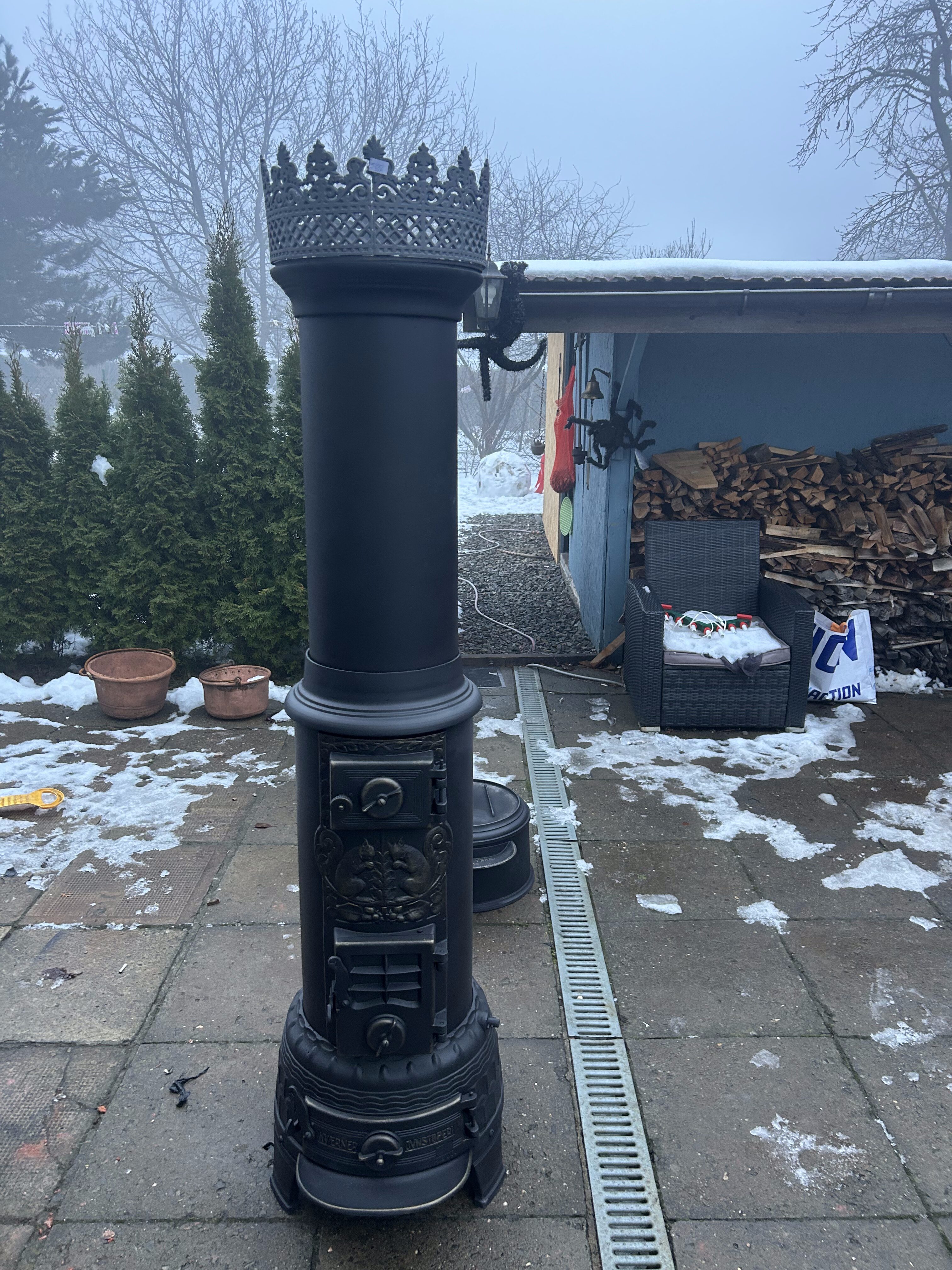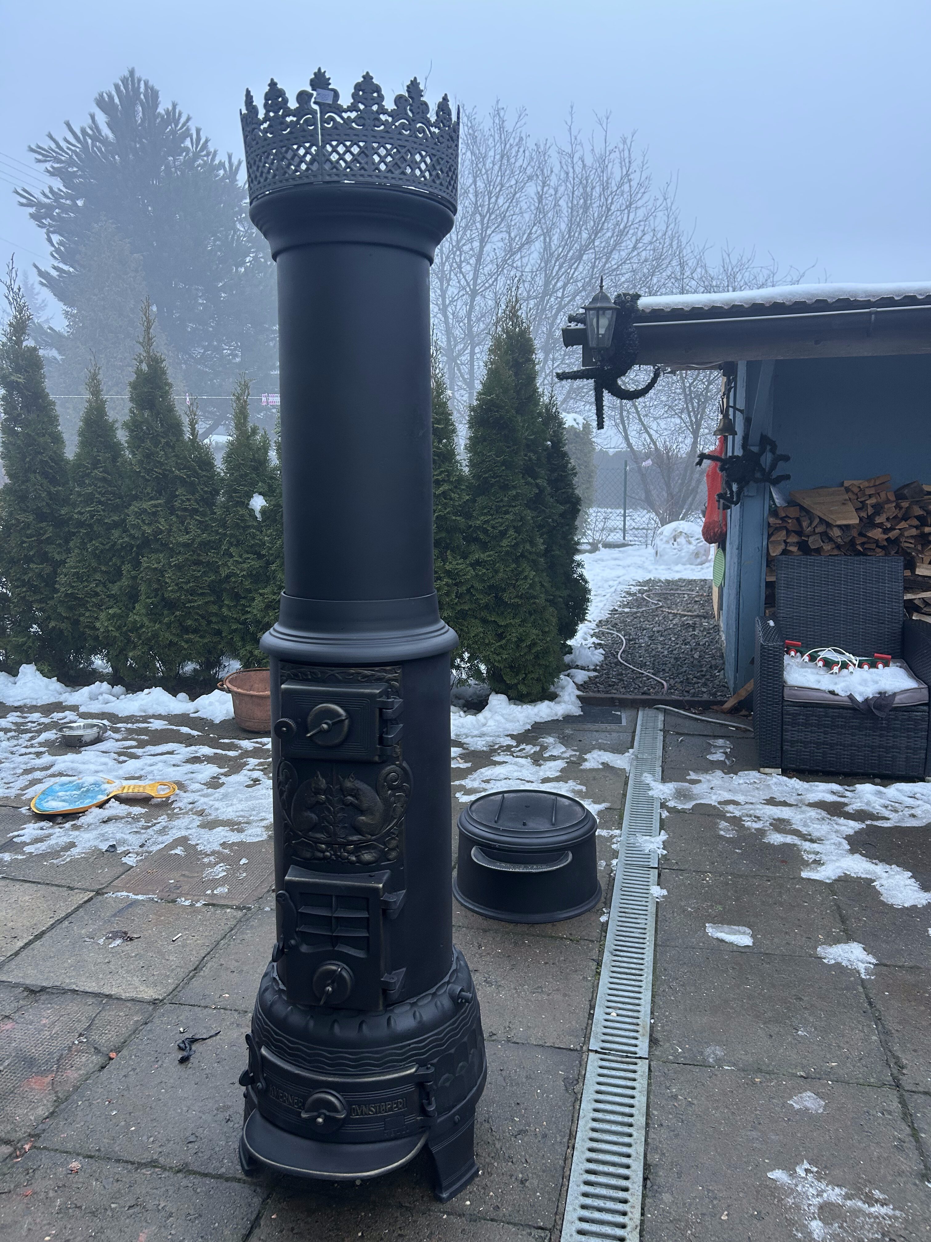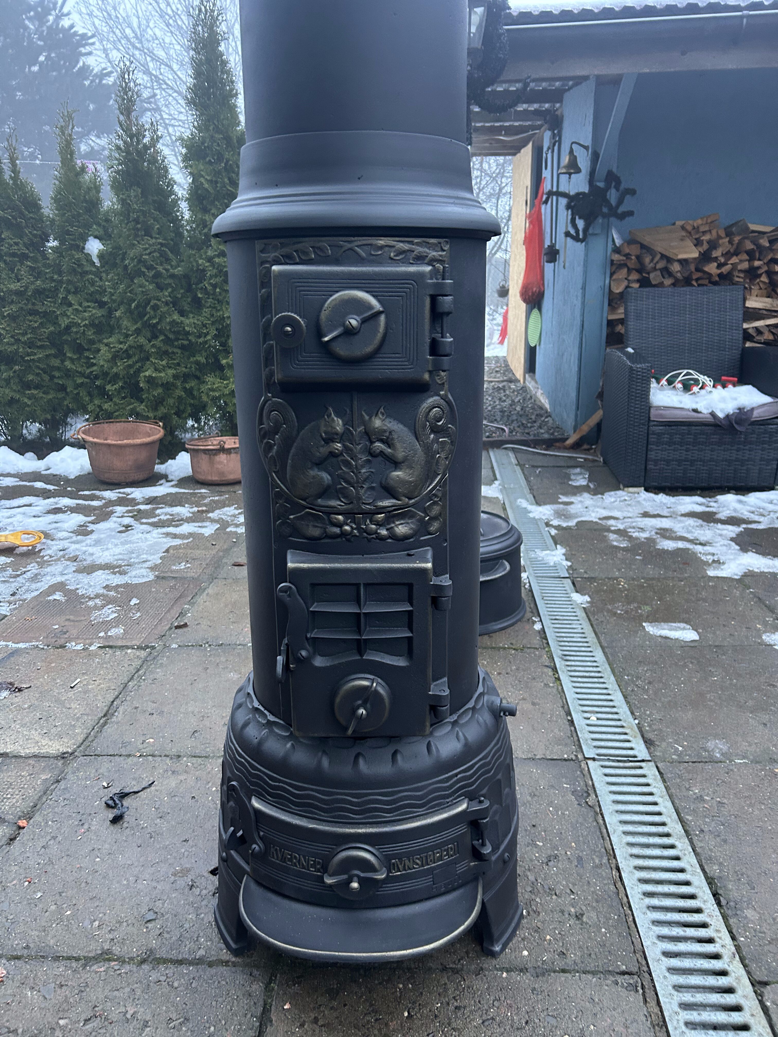 Imponujący piec żeliwny Jotul Kvarner Ovnstøperi, pochodzący z cenionej norweskiej odlewni, znanej z solidnych, bogato zdobionych konstrukcji. Ten rzadko spotykany model wyróżnia się dekoracyjną płaskorzeźbą przedstawiającą dwie wiewiórki na froncie pieca – motyw charakterystyczny dla norweskiego wzornictwa, symbolizujący spryt, ruch i harmonię z naturą.