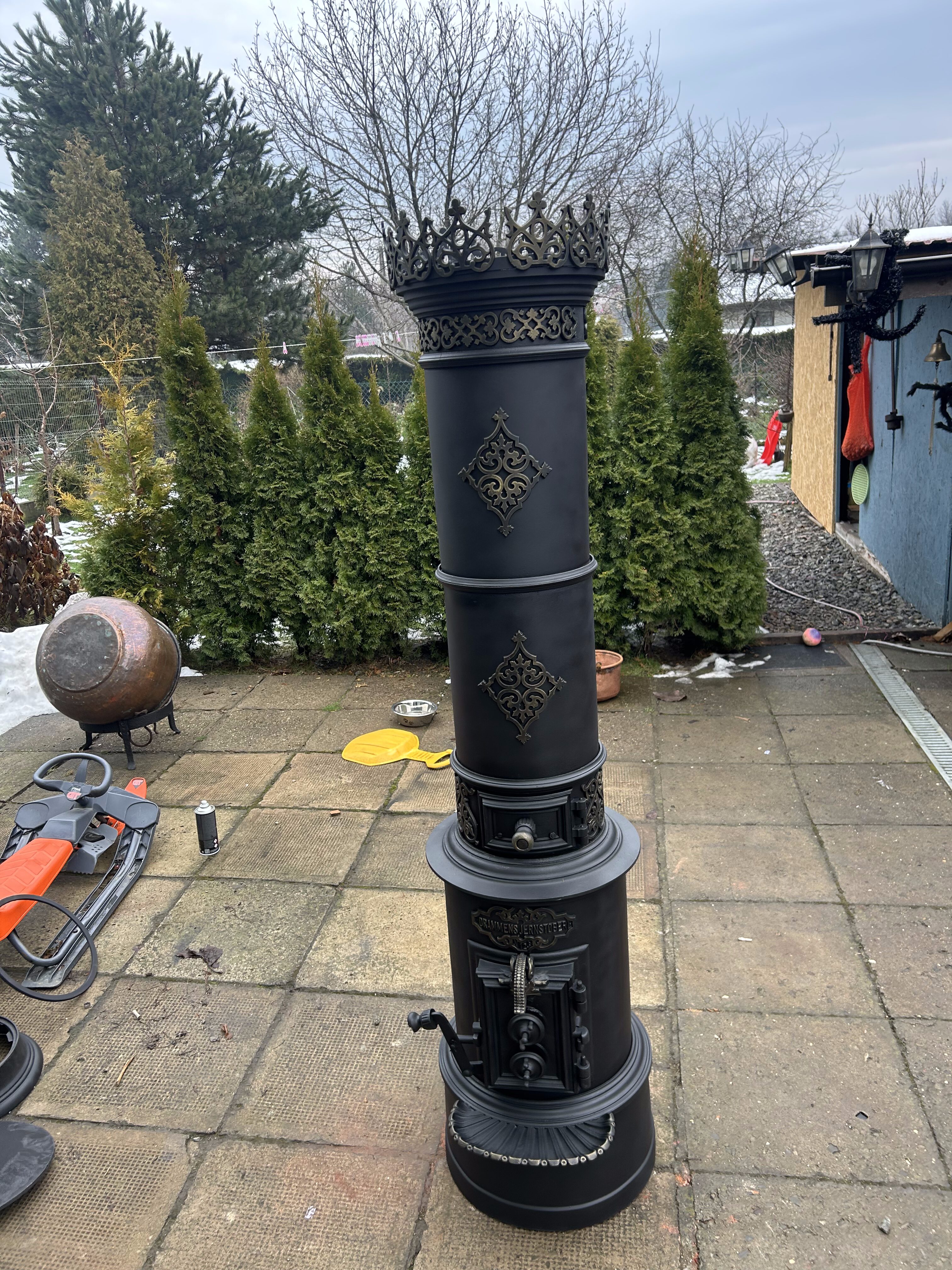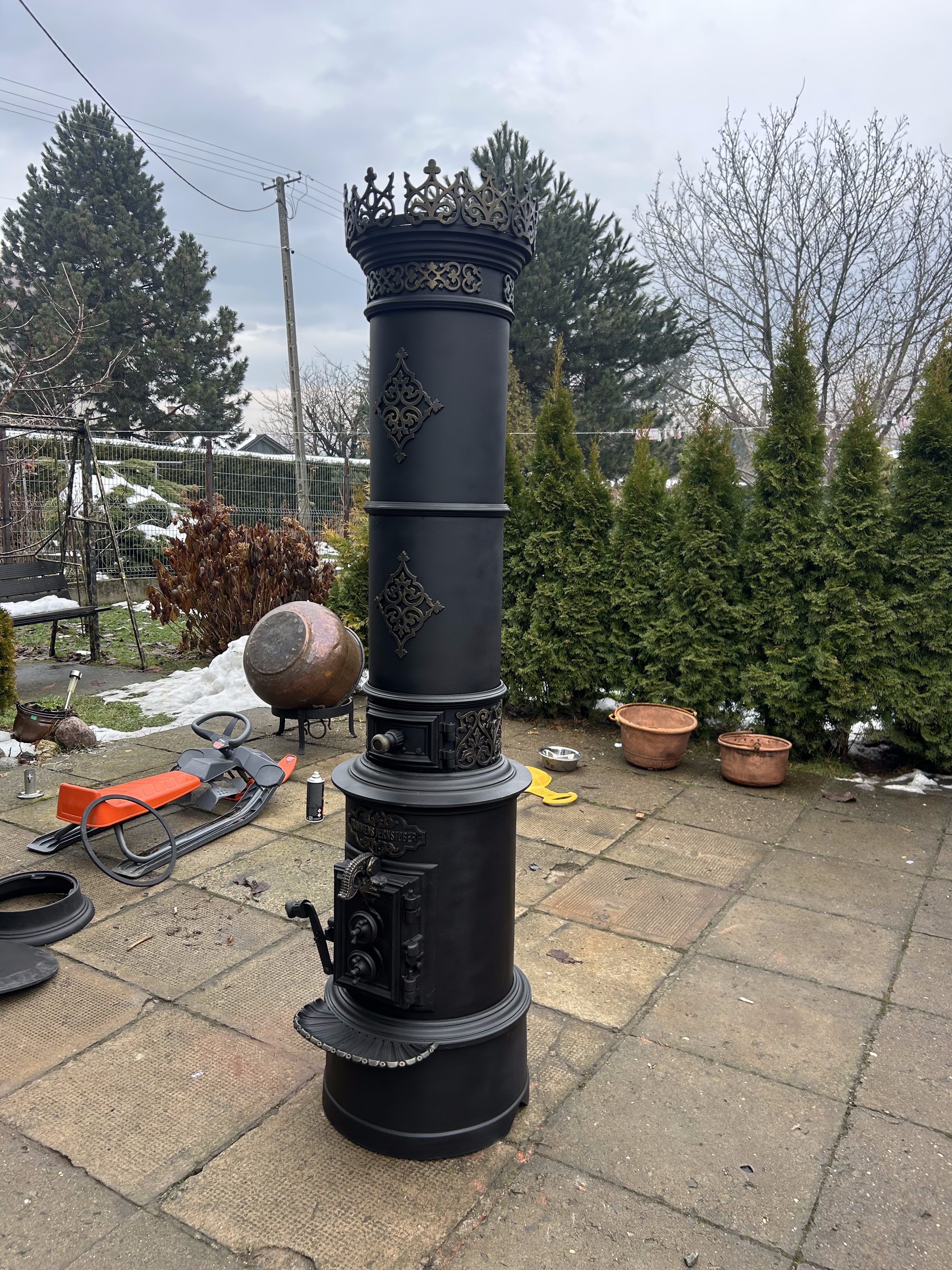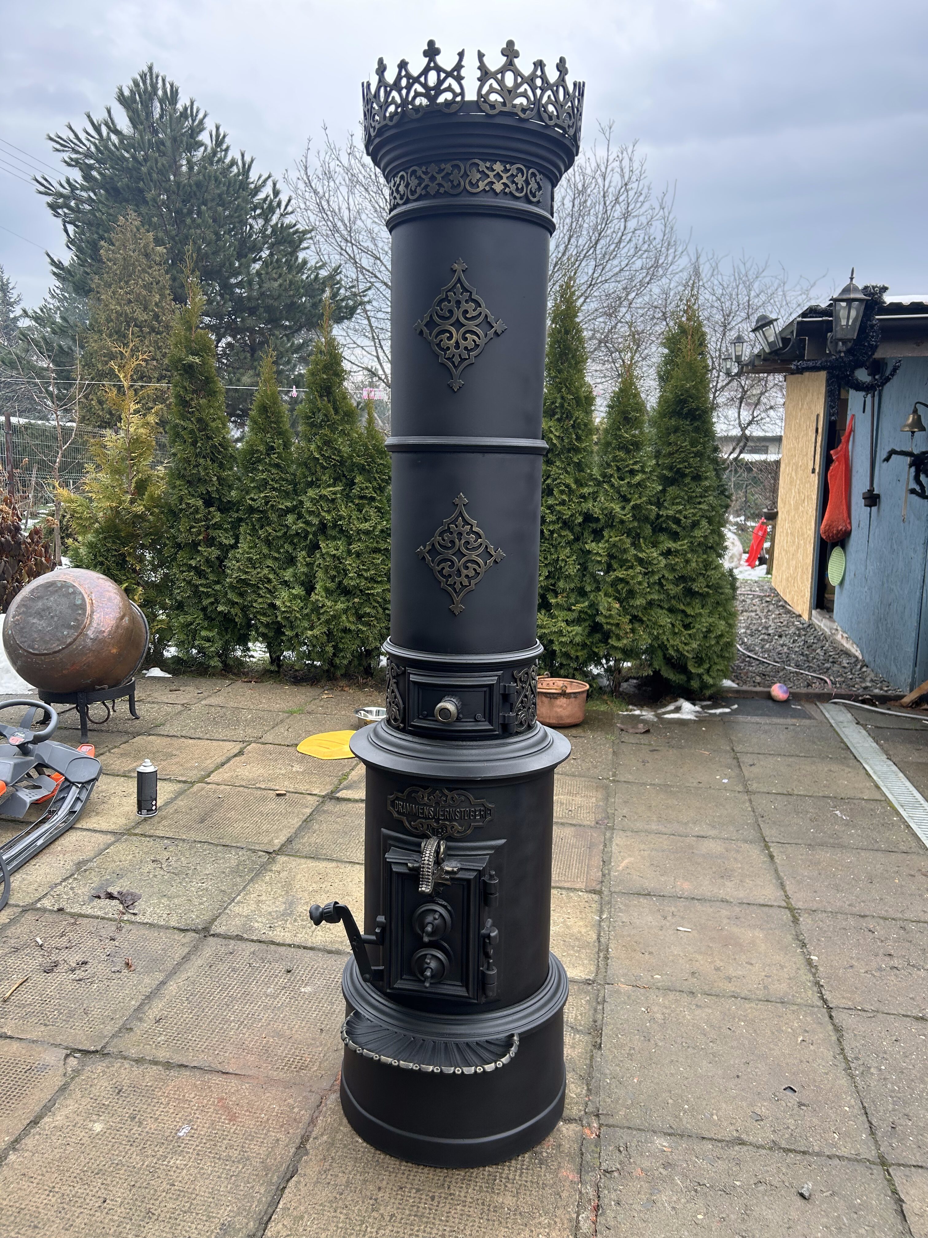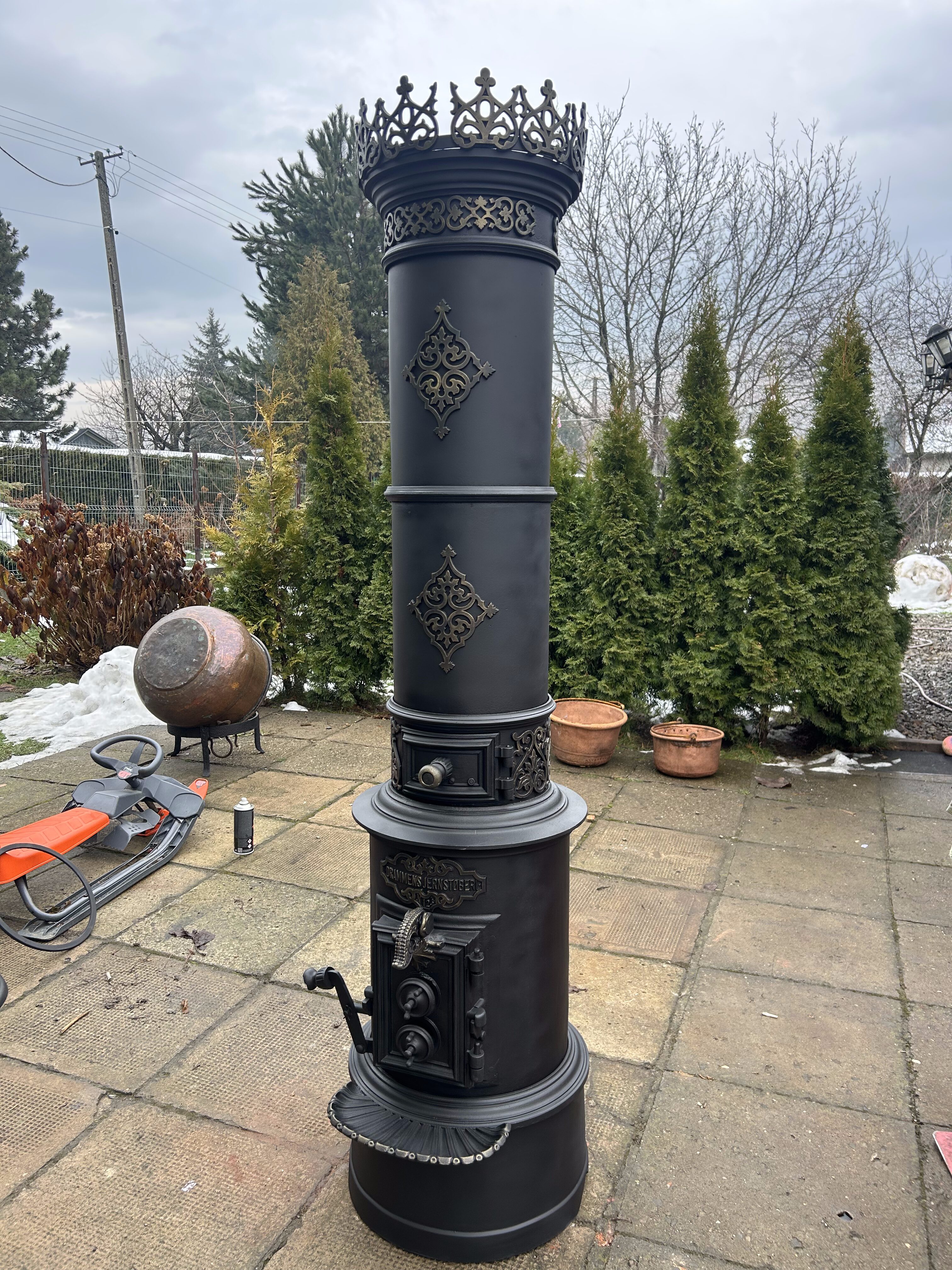 Całość została profesjonalnie odnowiona: piec wypiaskowano, pomalowano trzykrotnie farbą żaroodporną w odcieniu głębokiej czerni i ozdobiono złotą farbą żaroodporną, wydobywającą każdy detal zdobień. Wnętrze wyłożone zostało szamotem, co poprawia efektywność grzewczą i trwałość. Piec jest w pełni sprawny i gotowy do użytku.