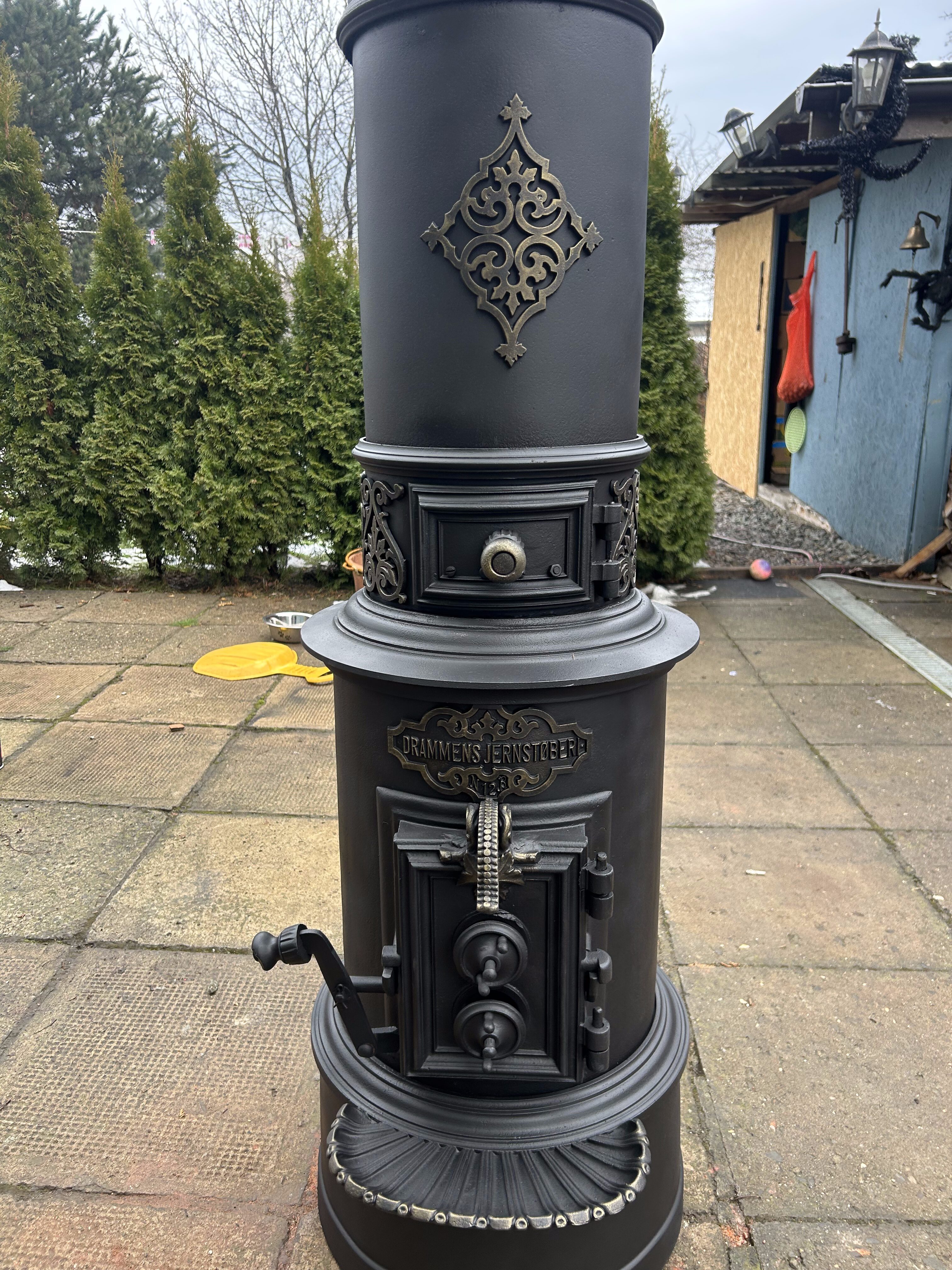 Wyjątkowo zdobiony, odrestaurowany piec żeliwny norweskiej produkcji, pochodzący z prestiżowej odlewni Drammens Jernstøberi, model 12B. W ogłoszeniu oznaczony jako piec żeliwny Jotul ze względu na stylistykę i charakterystyczne cechy norweskiego wzornictwa.