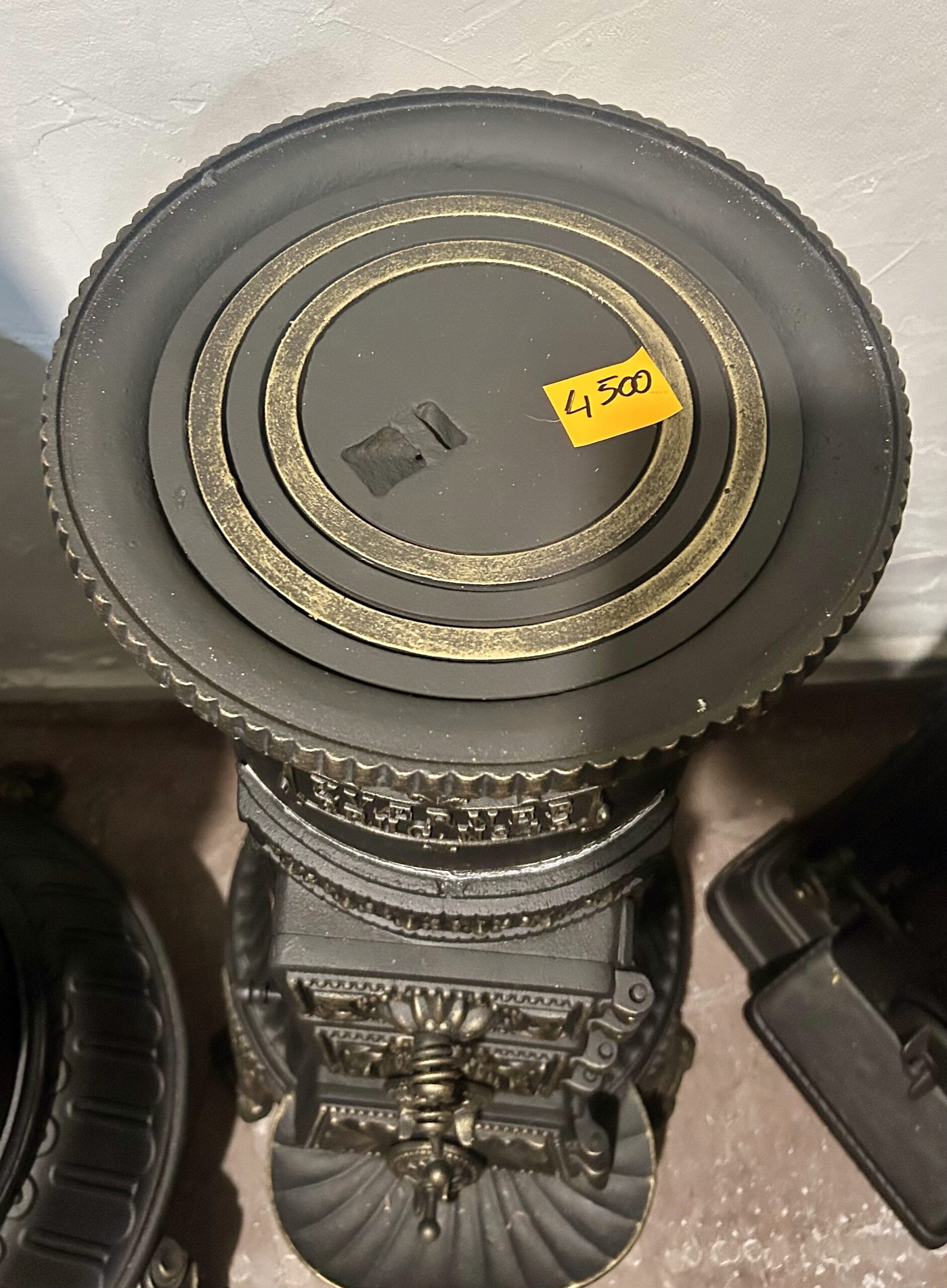 - Wykończenie: czarny kolor z ozdobnymi złotymi akcentami, pomalowany farbą żaroodporną.