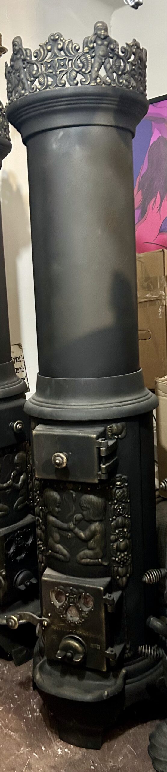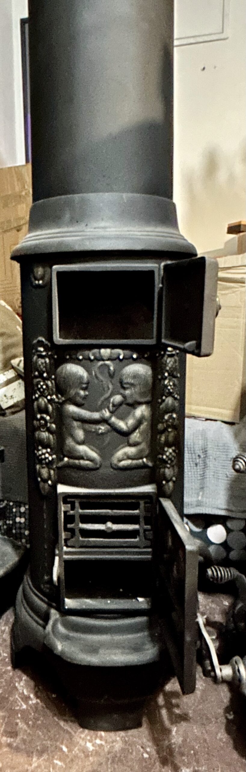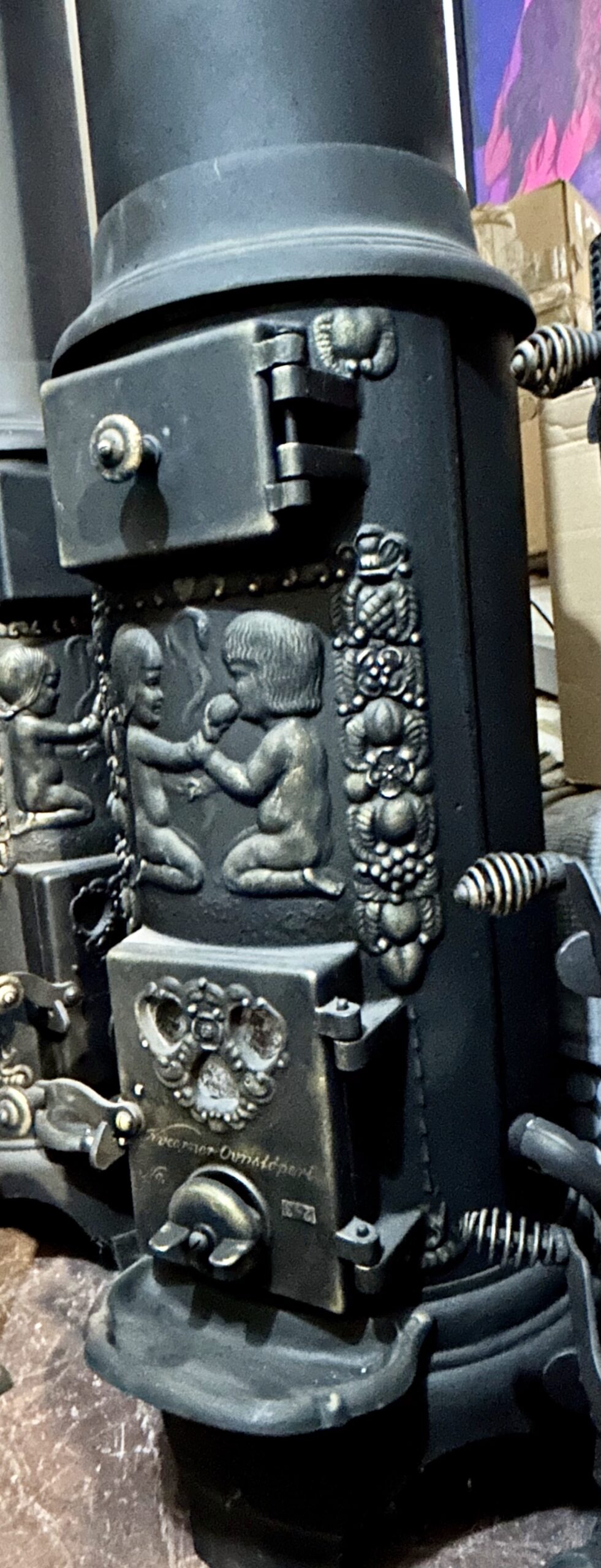 Tagi: KVARNER OVNSFOPERI NO 243, motyw Adama i Ewy, piec czarny ze złotymi zdobieniami, piec do salonu, piec klasyczny, piec na drewno, piec na wysyłkę, piec okrągły, piec retro, piec rustykalny, piec vintage, piec z iskrownikiem, piec z koroną, piec z szamotem, piec z trzema świetlikami, piec z wylotem 125 fi, piec żeliwny, stylowy piec żeliwny, żeliwny piec ozdobny, żeliwny piec z koroną.