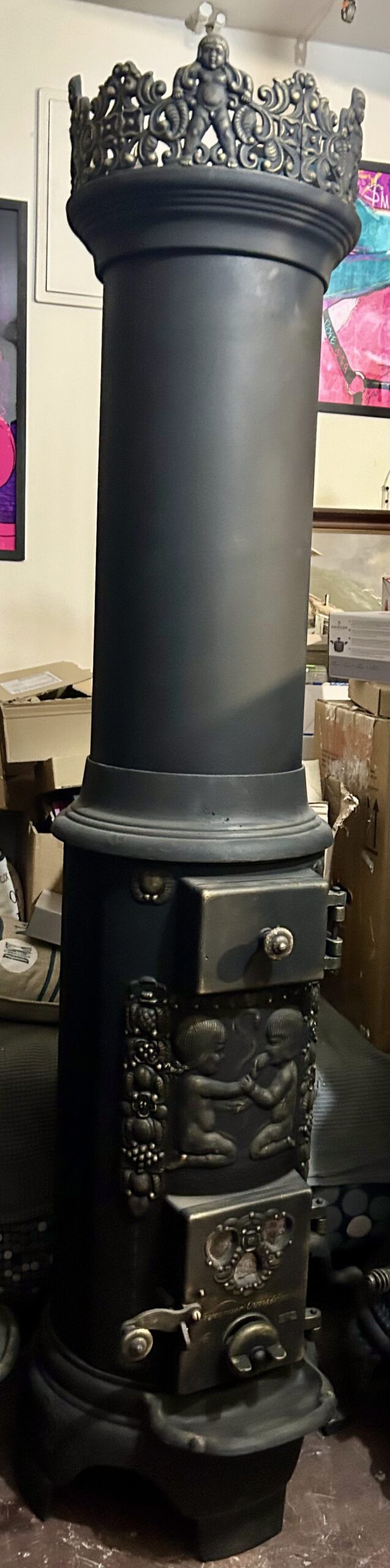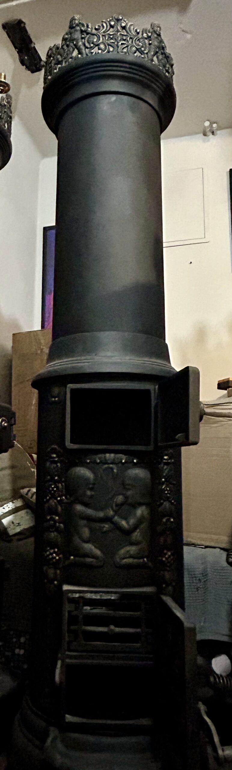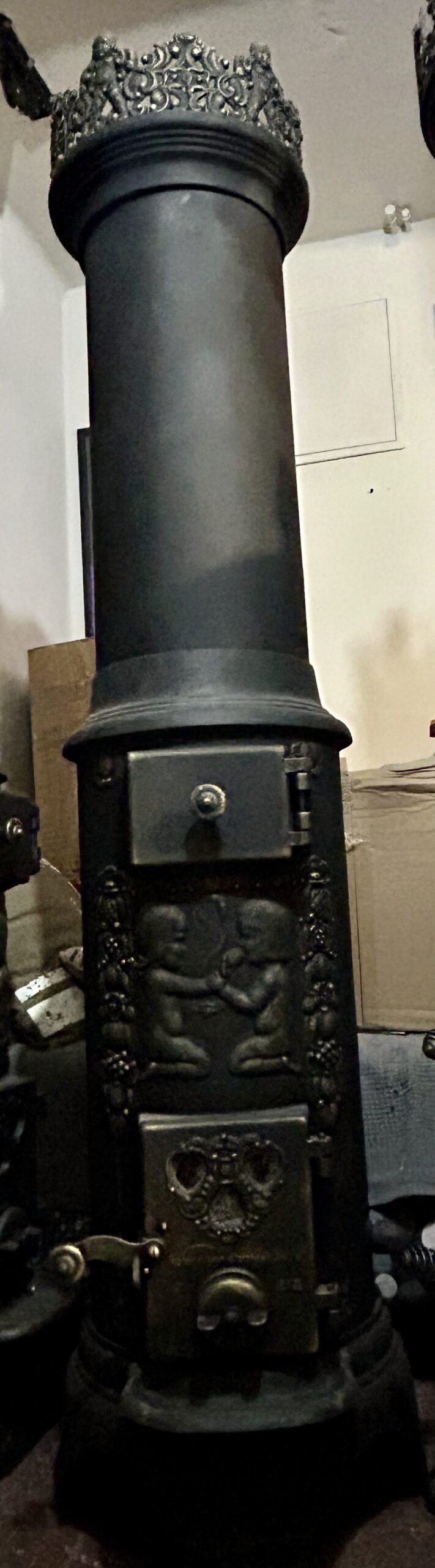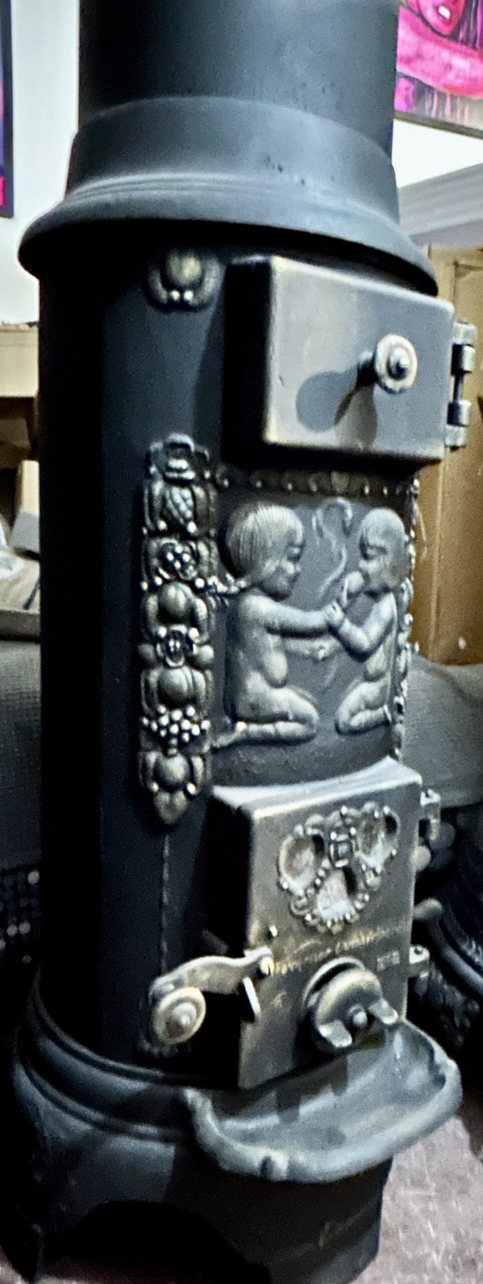 Tagi: KVARNER OVNSFOPERI NO 243, motyw Adama i Ewy, piec czarny ze złotymi zdobieniami, piec do salonu, piec klasyczny, piec na drewno, piec na wysyłkę, piec okrągły, piec retro, piec rustykalny, piec vintage, piec z iskrownikiem, piec z koroną, piec z szamotem, piec z trzema świetlikami, piec z wylotem 125 fi, piec żeliwny, stylowy piec żeliwny, żeliwny piec ozdobny, żeliwny piec z koroną.