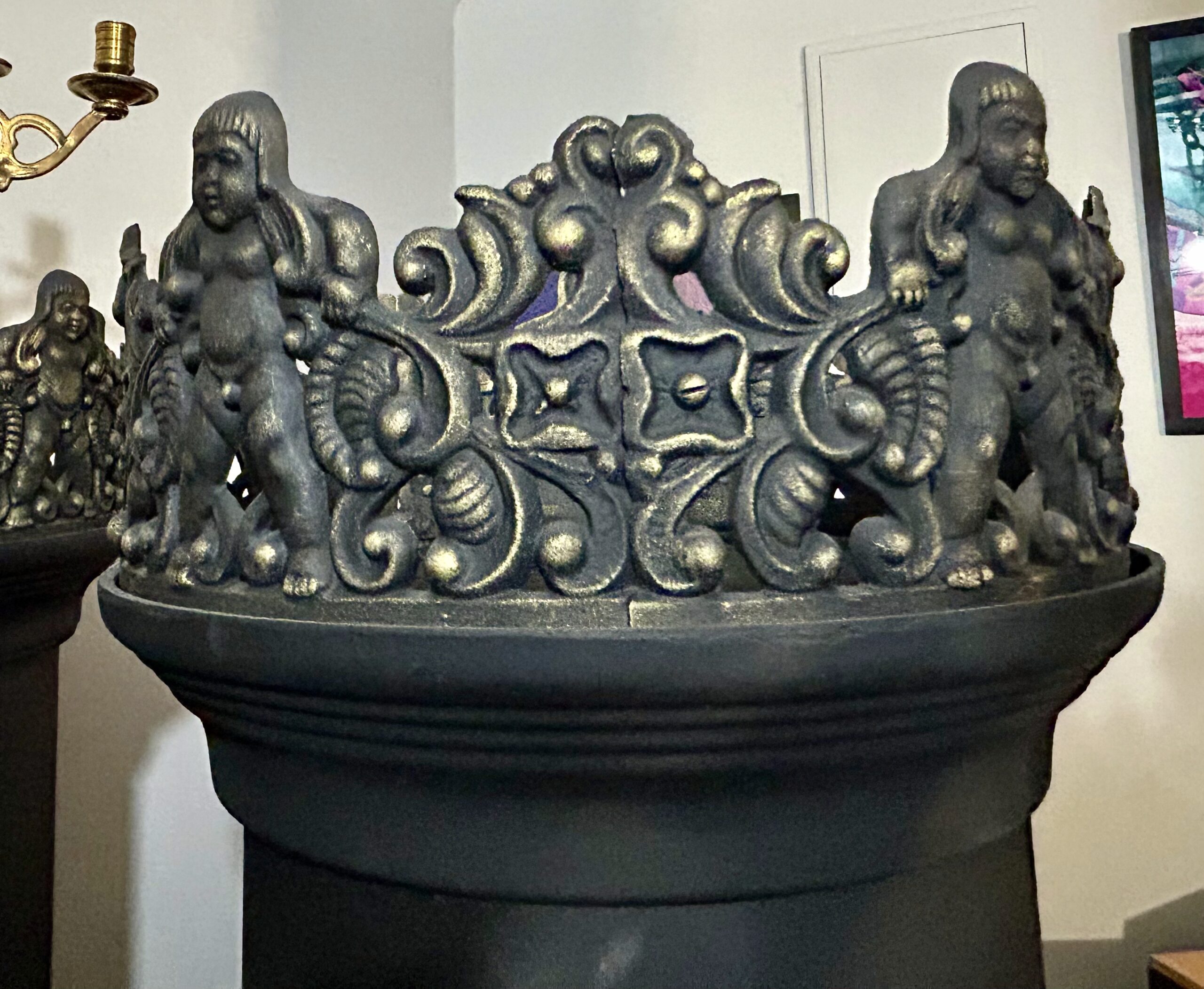 Wyjątkowy piec żeliwny o klasycznym, okrągłym kształcie, łączący solidność wykonania z bogatym zdobieniem. Model KVARNER OVNSFOPERI NO 243 wyróżnia się pięknym motywem Adama i Ewy w rajskim ogrodzie, podkreślonym złotymi detalami na tle czarnej farby żaroodpornej. Zwieńczony koroną z podobizną chłopca, zachwyca estetyką i precyzją wykonania.