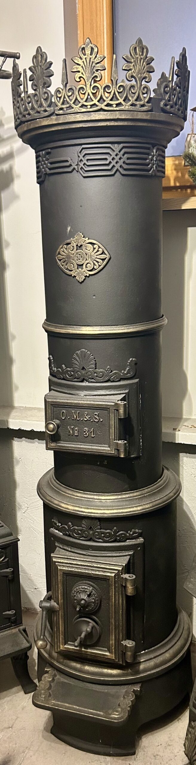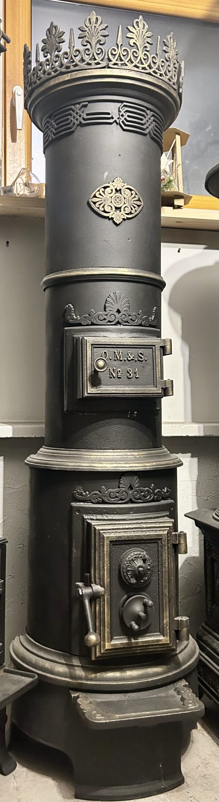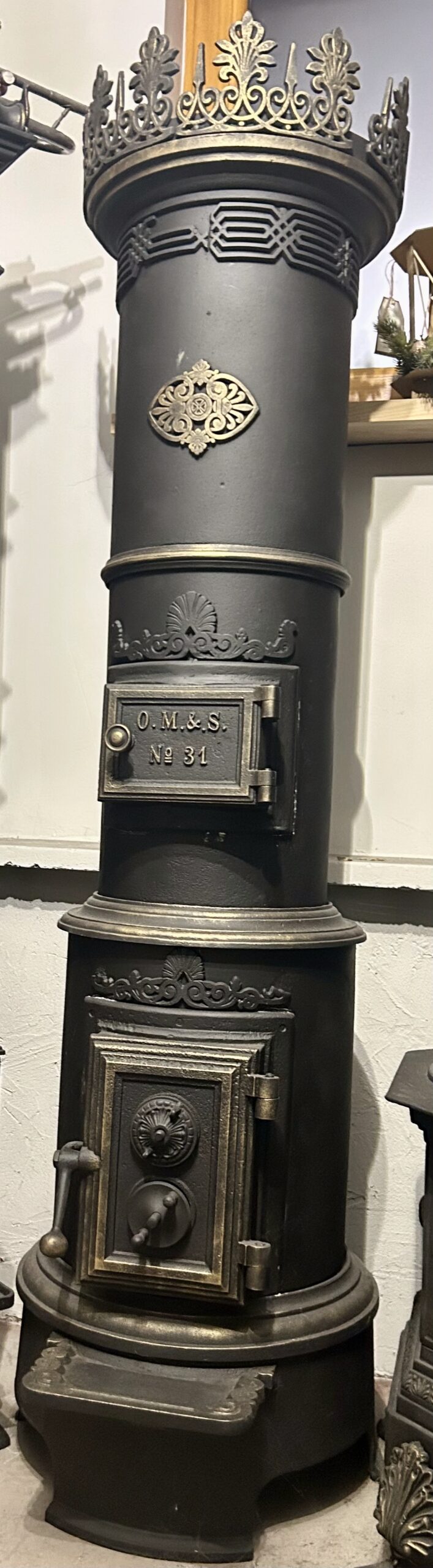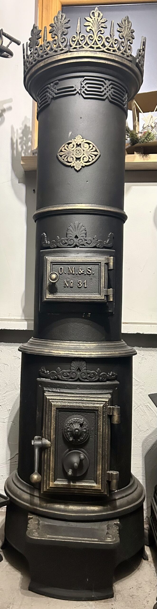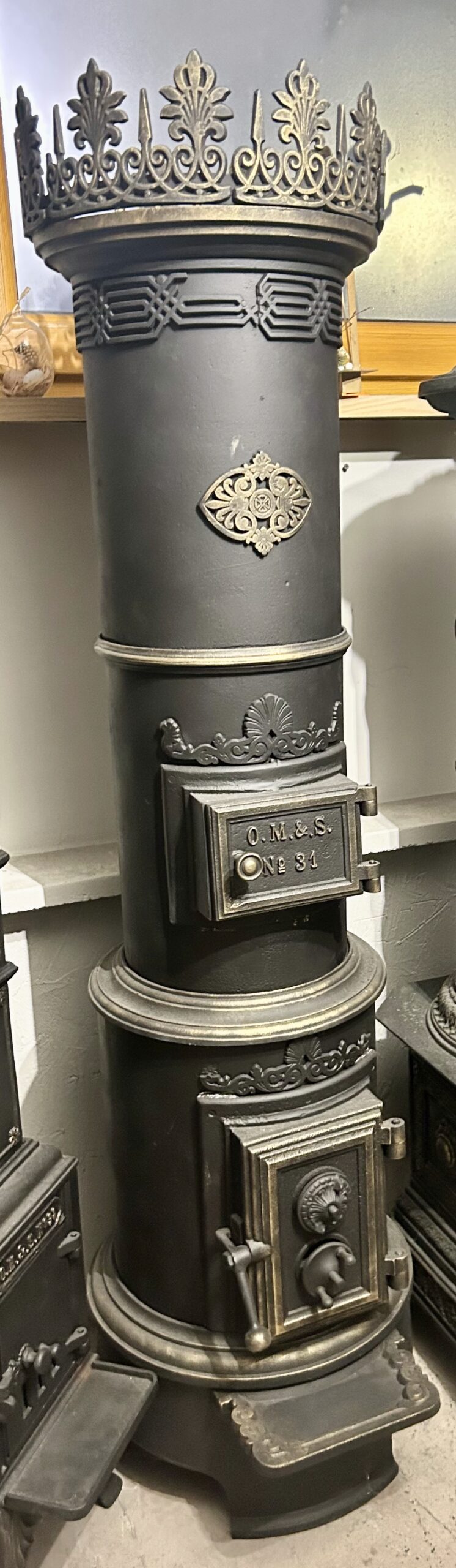 Wyjątkowy piec żeliwny firmy O.M.&.S. No 31, przywieziony z Norwegii, zachwyca swoją niezwykłą konstrukcją i zdobieniami. Piec ma okrągły kształt przypominający wieżę w szachach, co nadaje mu unikatowy i majestatyczny charakter. Wyposażony w koronę oraz balkonik na popiół, łączy w sobie funkcjonalność z wyjątkową estetyką.