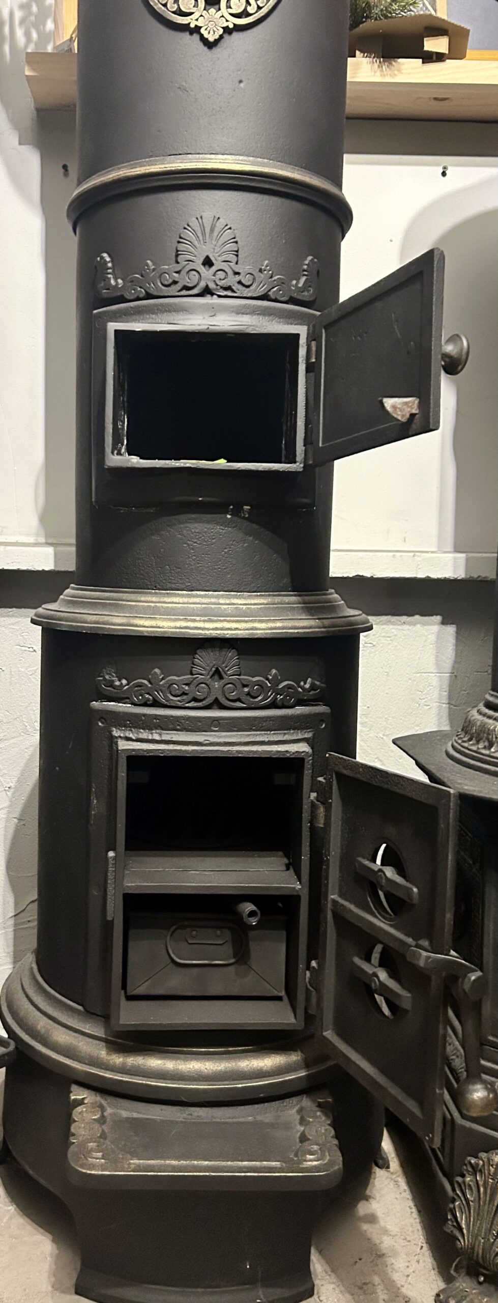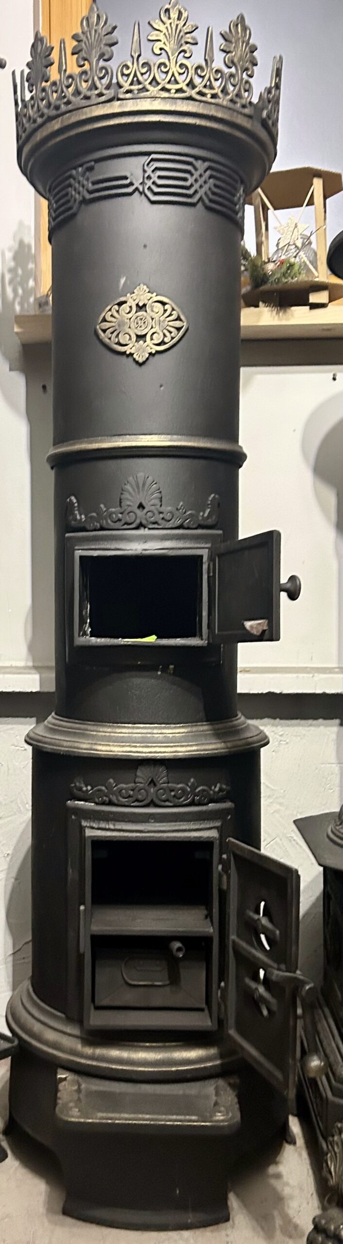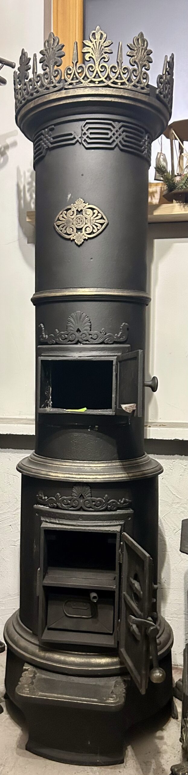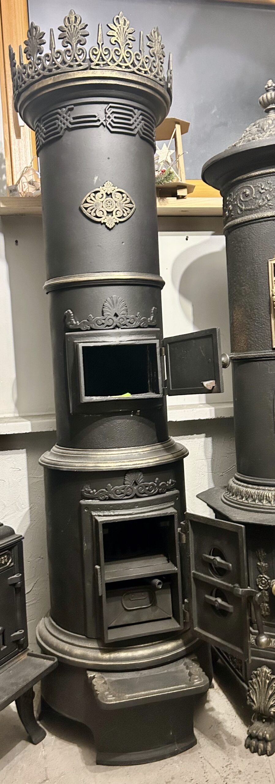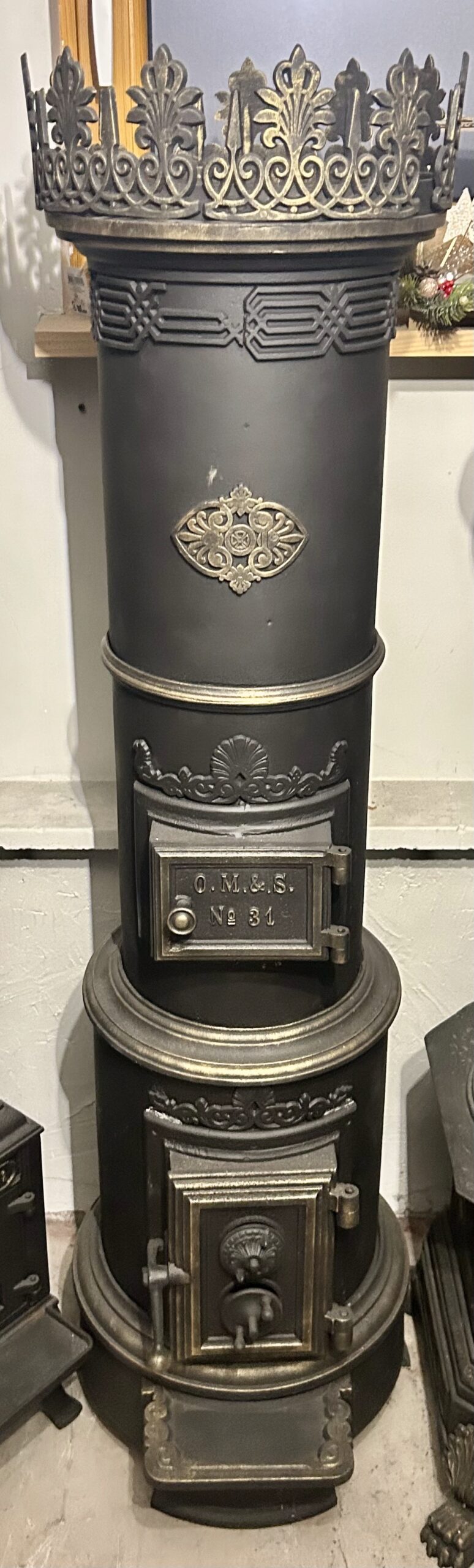 Wyjątkowy piec żeliwny firmy O.M.&.S. No 31, przywieziony z Norwegii, zachwyca swoją niezwykłą konstrukcją i zdobieniami. Piec ma okrągły kształt przypominający wieżę w szachach, co nadaje mu unikatowy i majestatyczny charakter. Wyposażony w koronę oraz balkonik na popiół, łączy w sobie funkcjonalność z wyjątkową estetyką.