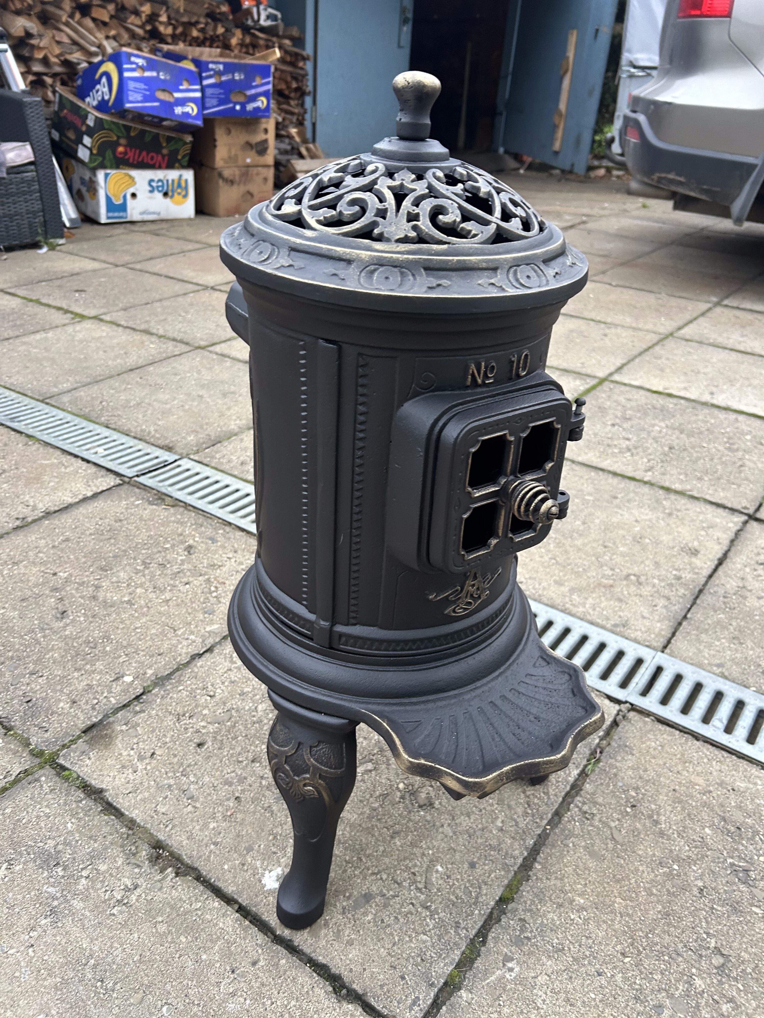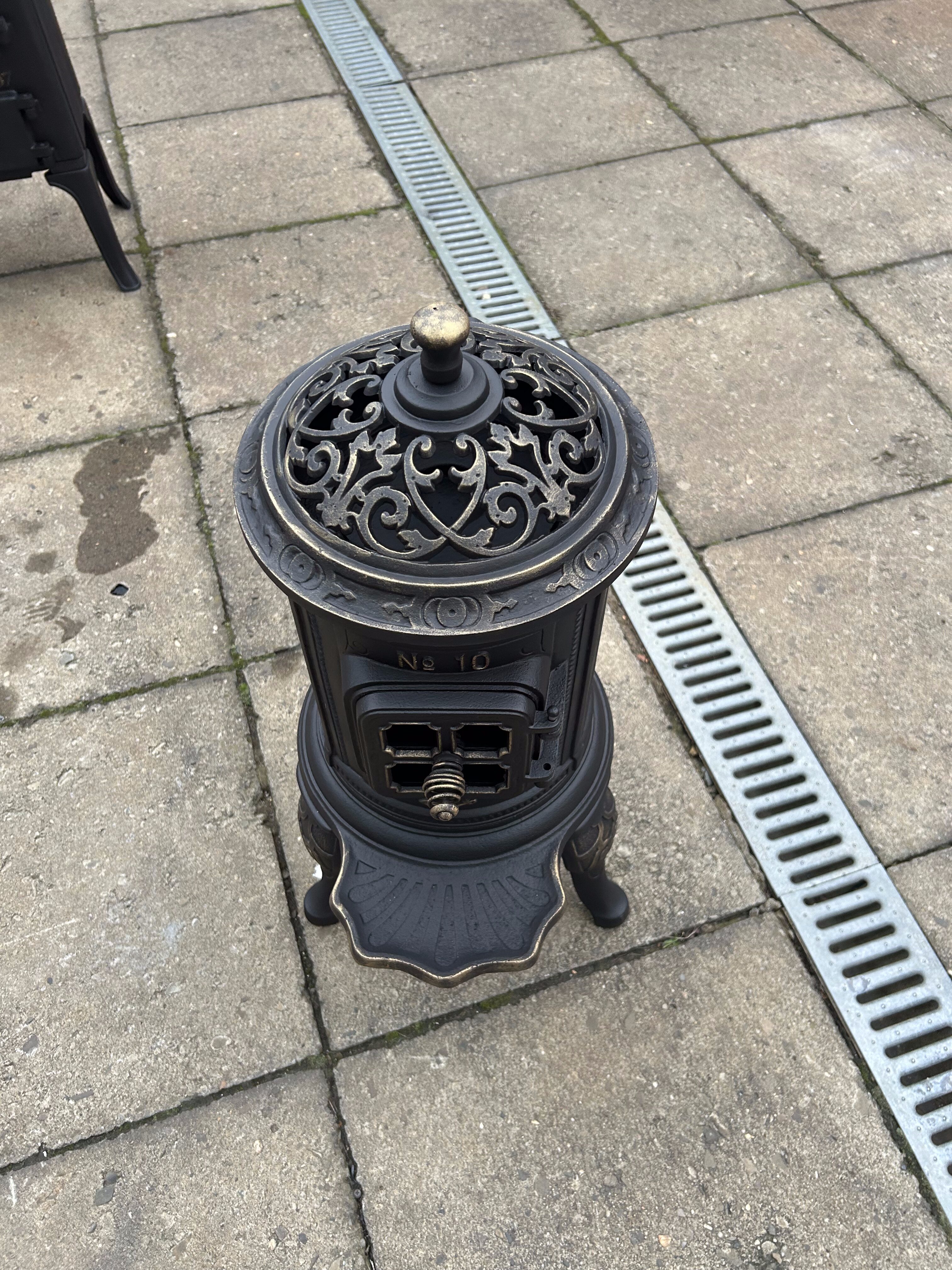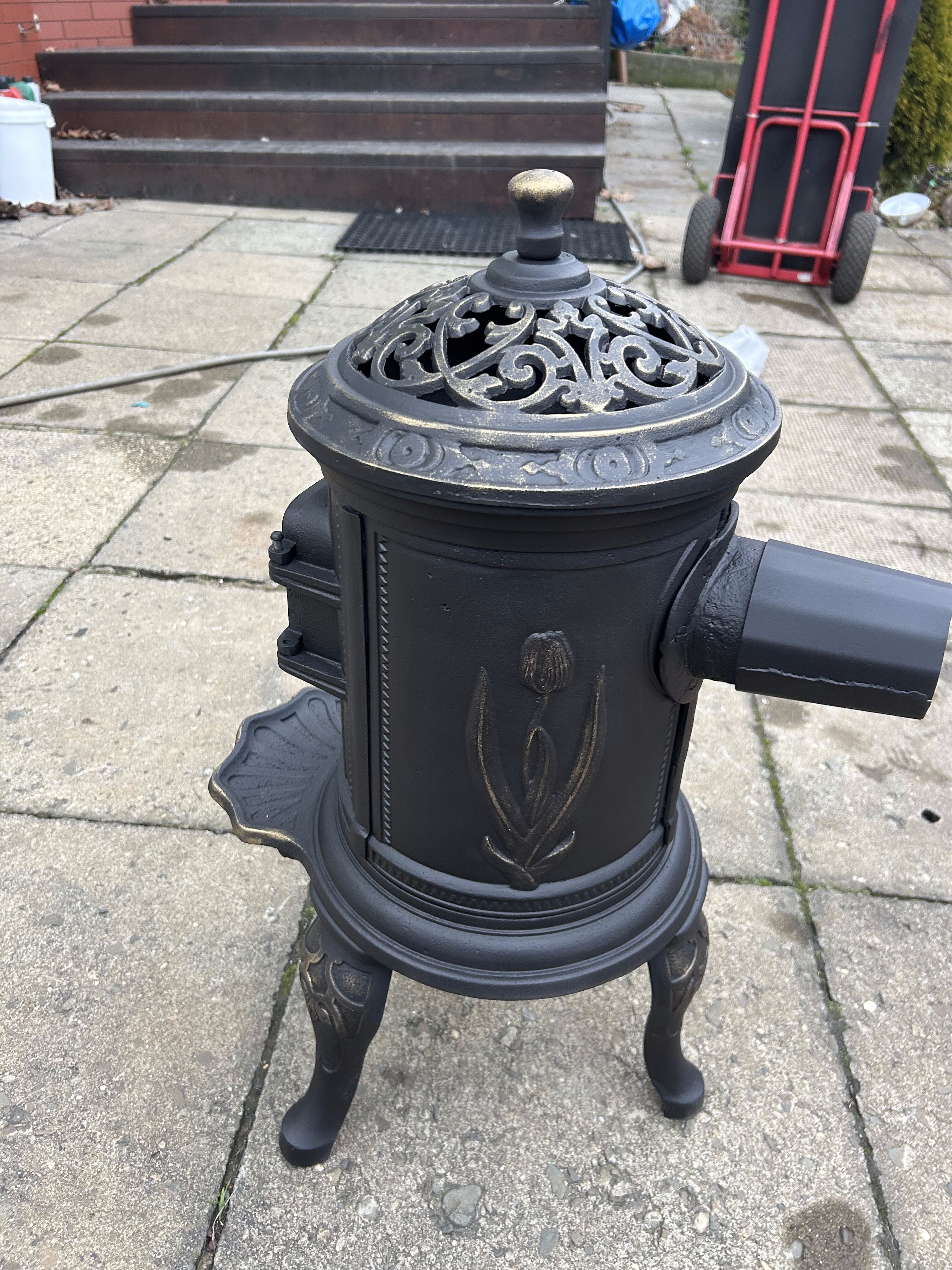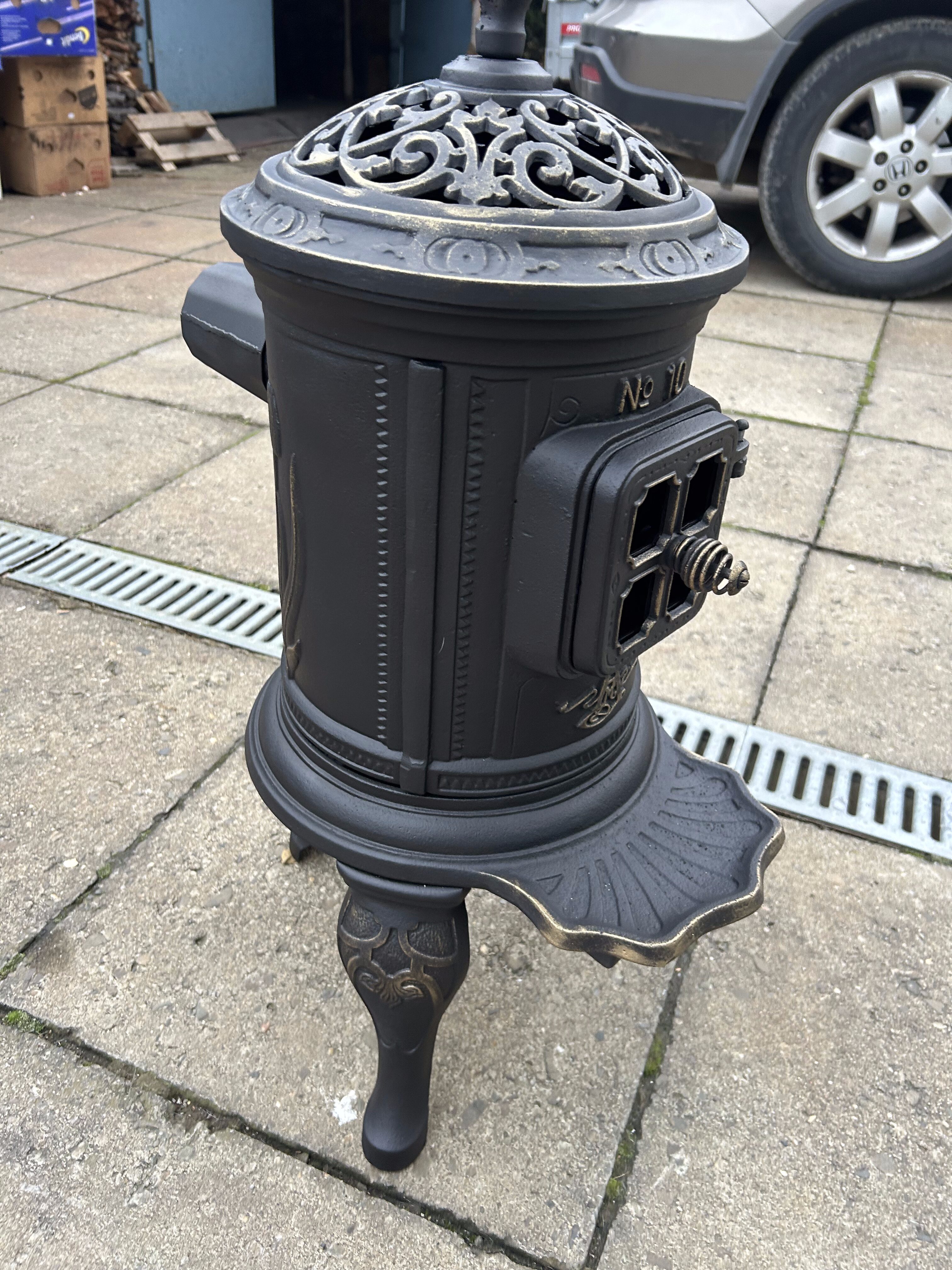 Ten ozdobny piec żeliwny to prawdziwa biżuteria wnętrza – ażurowa czapeczka, złocone detale i klasyczna, okrągła forma tworzą wyjątkową całość, która łączy użytkowość i dekoracyjność na najwyższym poziomie.