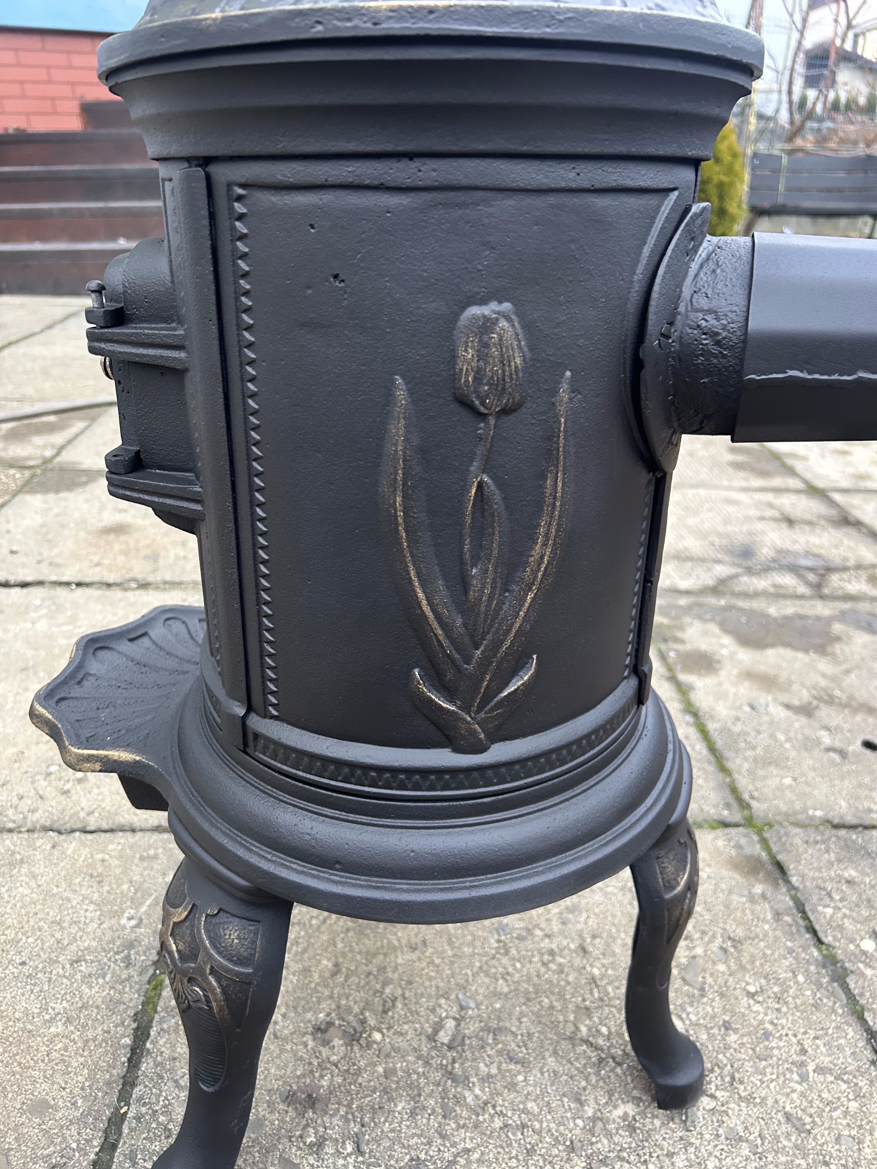 Elegancki, w pełni odrestaurowany piec żeliwny nr 10 – model o wyjątkowo dekoracyjnej formie, z misternie ażurowaną czapeczką oraz charakterystycznymi, bogatymi zdobieniami podkreślonymi złotą farbą żaroodporną. Ten typ pieców to prawdziwe perełki dawnych hut odlewniczych: łączą majestatyczną formę, funkcjonalność i kunszt rzemieślniczy.
