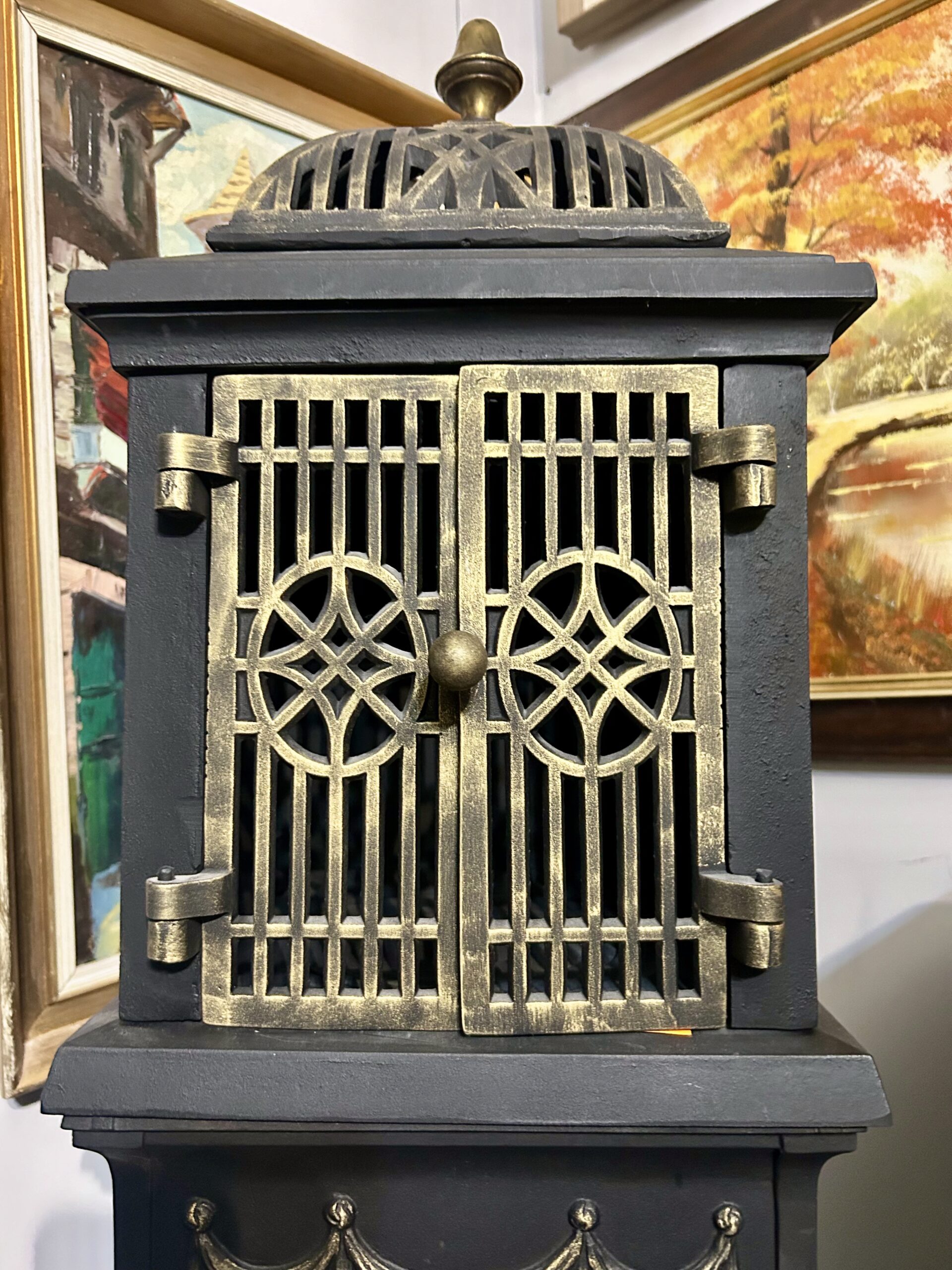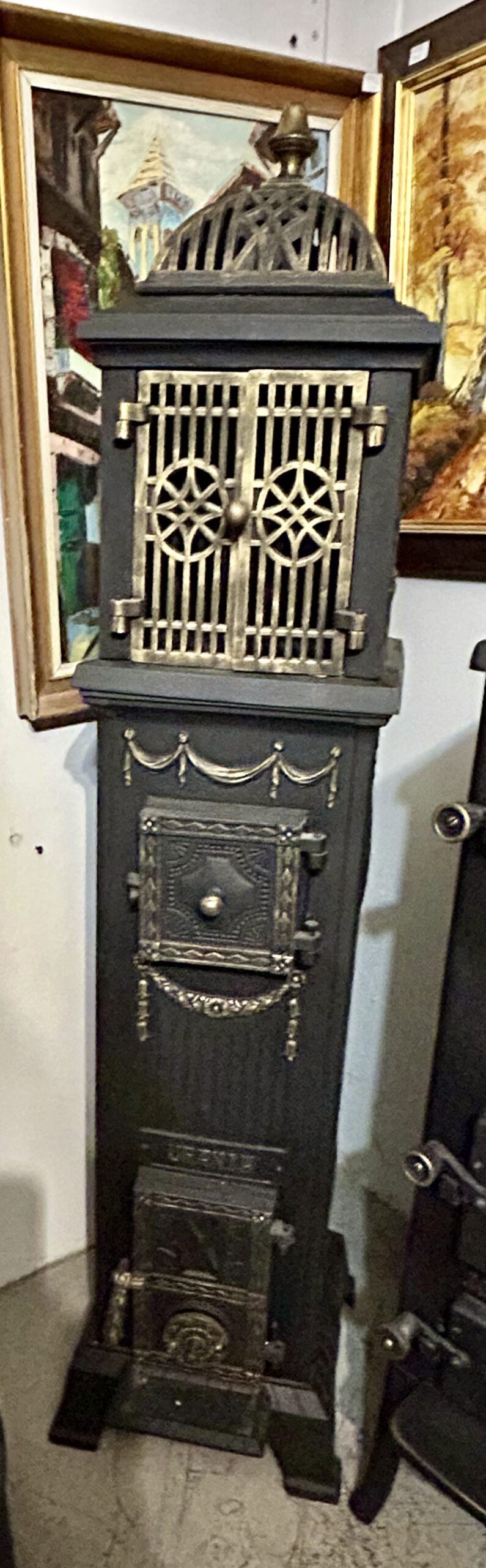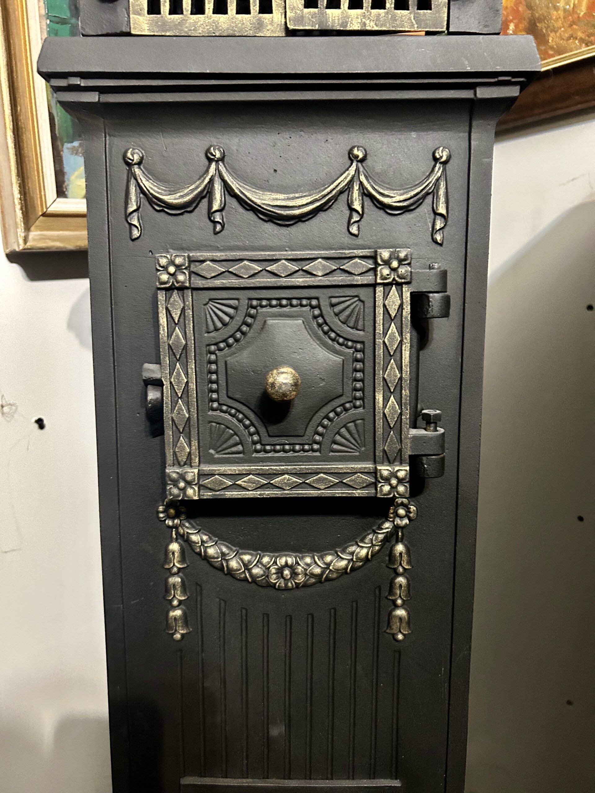 - Odrestaurowanie: Wypiaskowany, pomalowany trzykrotnie czarną farbą żaroodporną, ozdobiony złotą farbą żaroodporną,