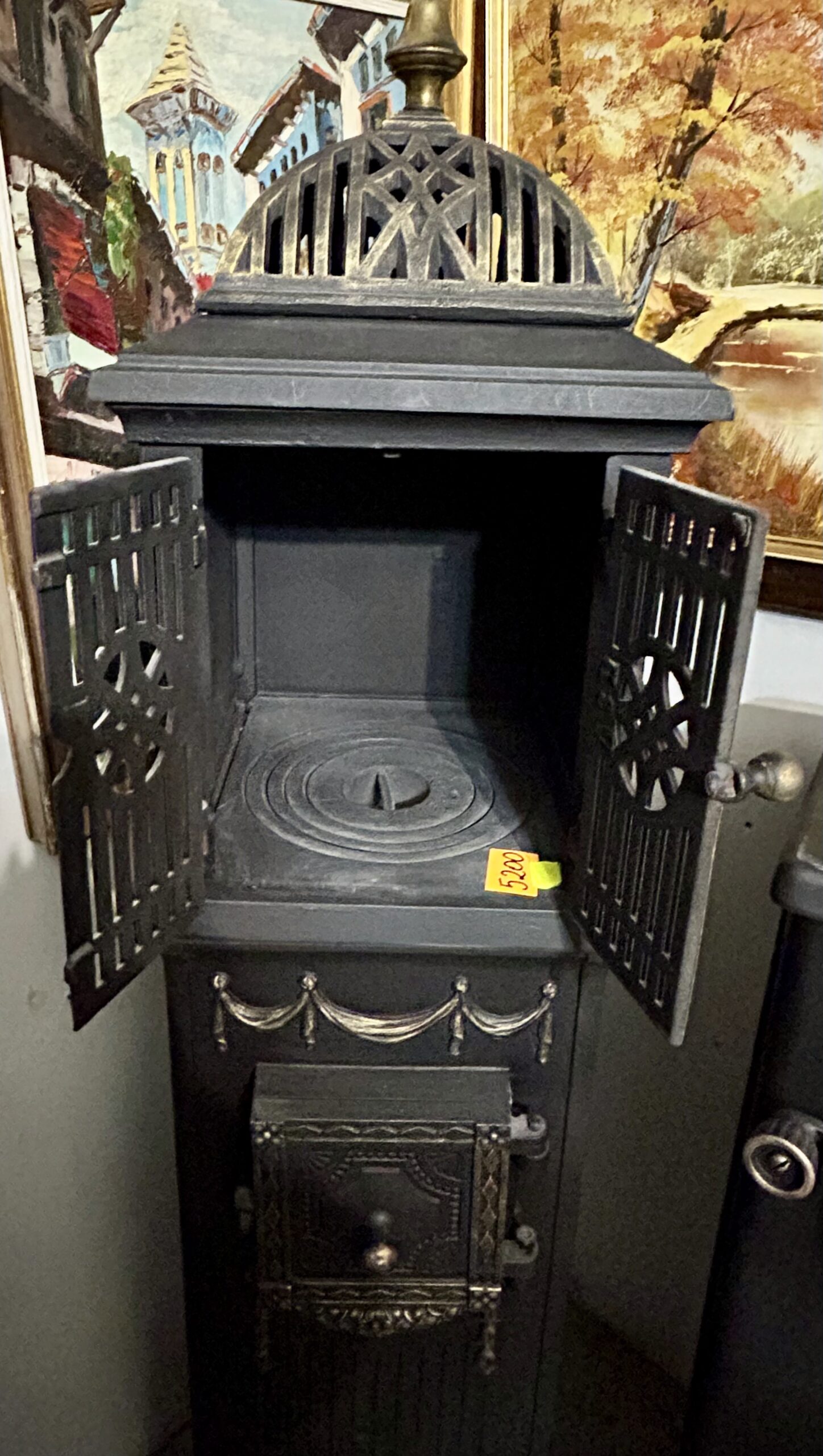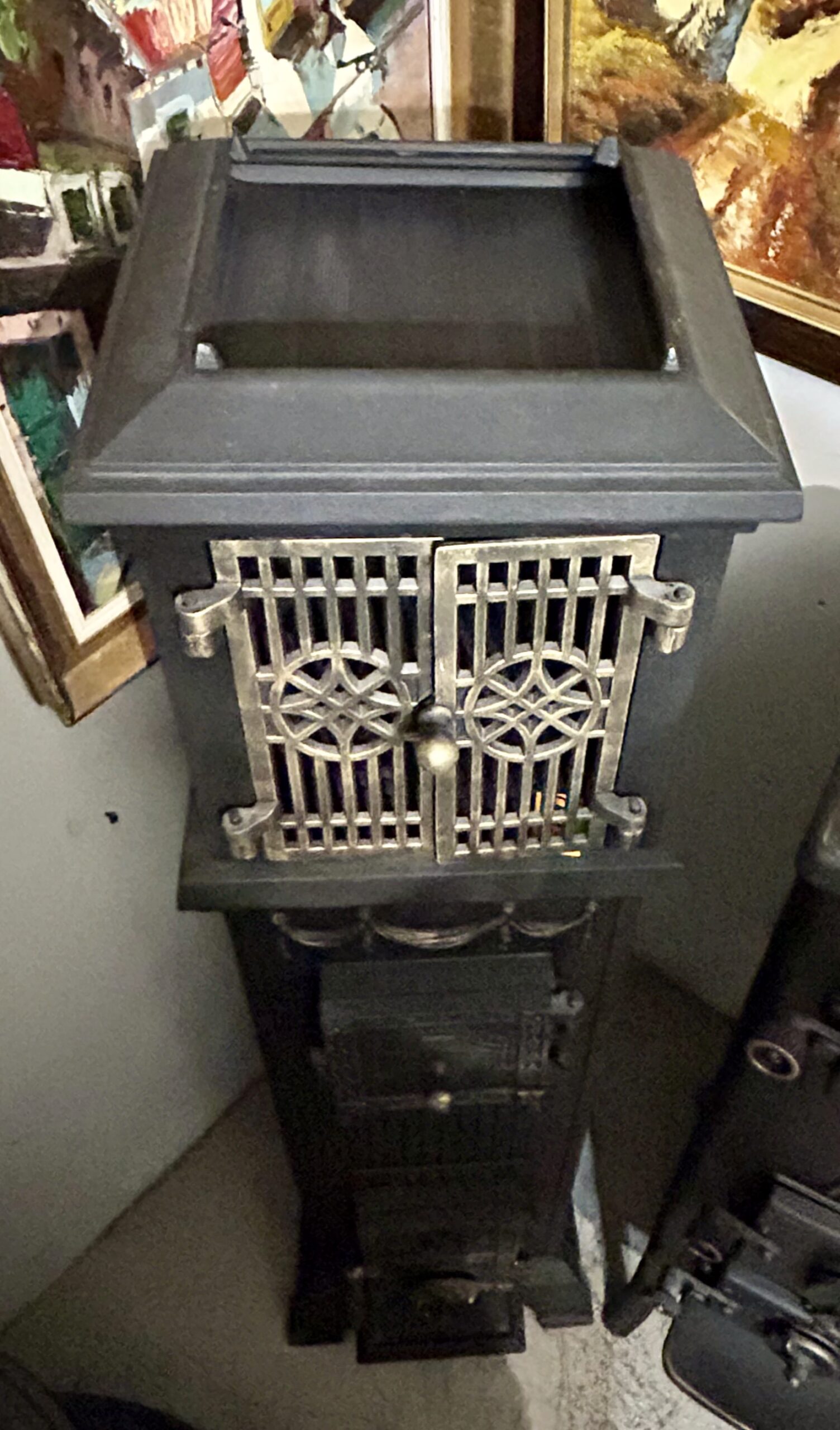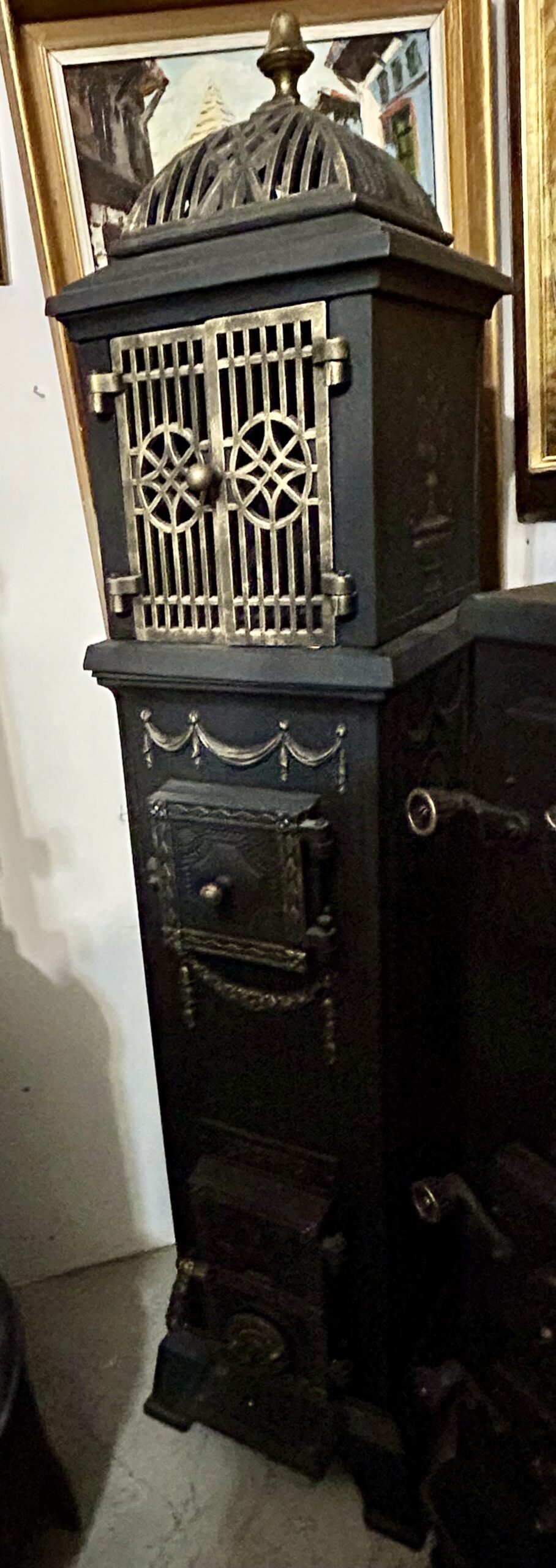 - Odrestaurowanie: Wypiaskowany, pomalowany trzykrotnie czarną farbą żaroodporną, ozdobiony złotą farbą żaroodporną,