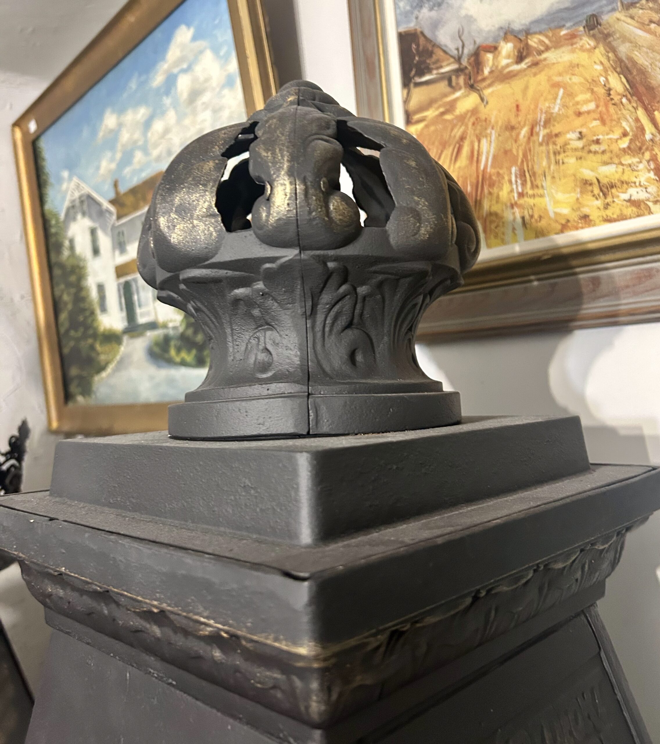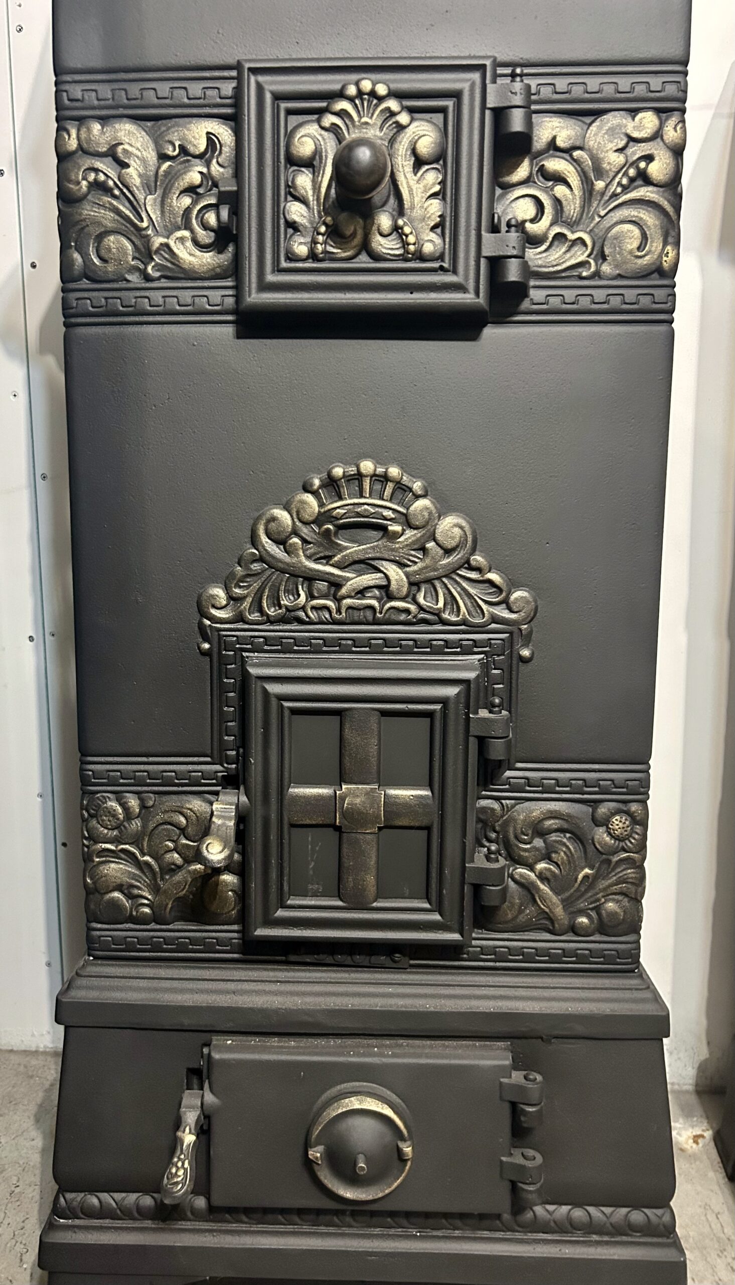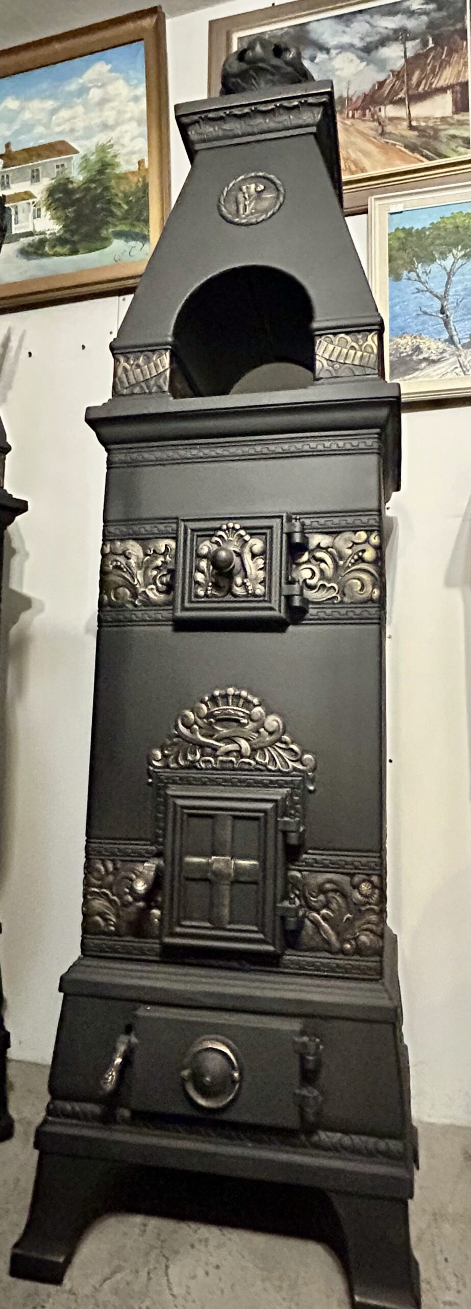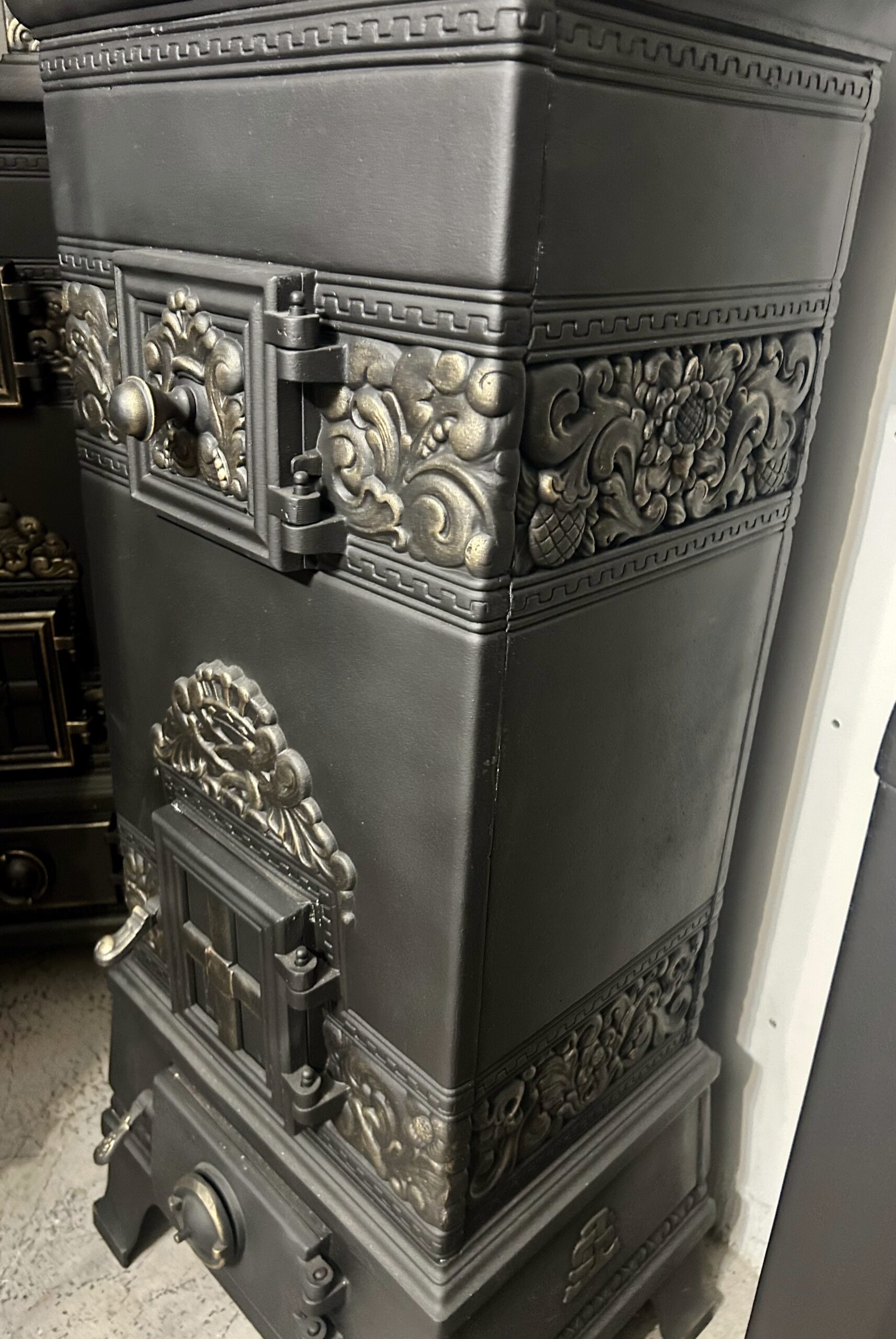 Imponujący piec żeliwny z berłem na szczycie to wyjątkowy element dekoracyjny i praktyczne źródło ciepła. Wypiaskowany, trzykrotnie pomalowany farbą żaroodporną w czarnym kolorze, ozdobiony złotymi akcentami, zachwyca zarówno trwałością, jak i kunsztem wykonania.