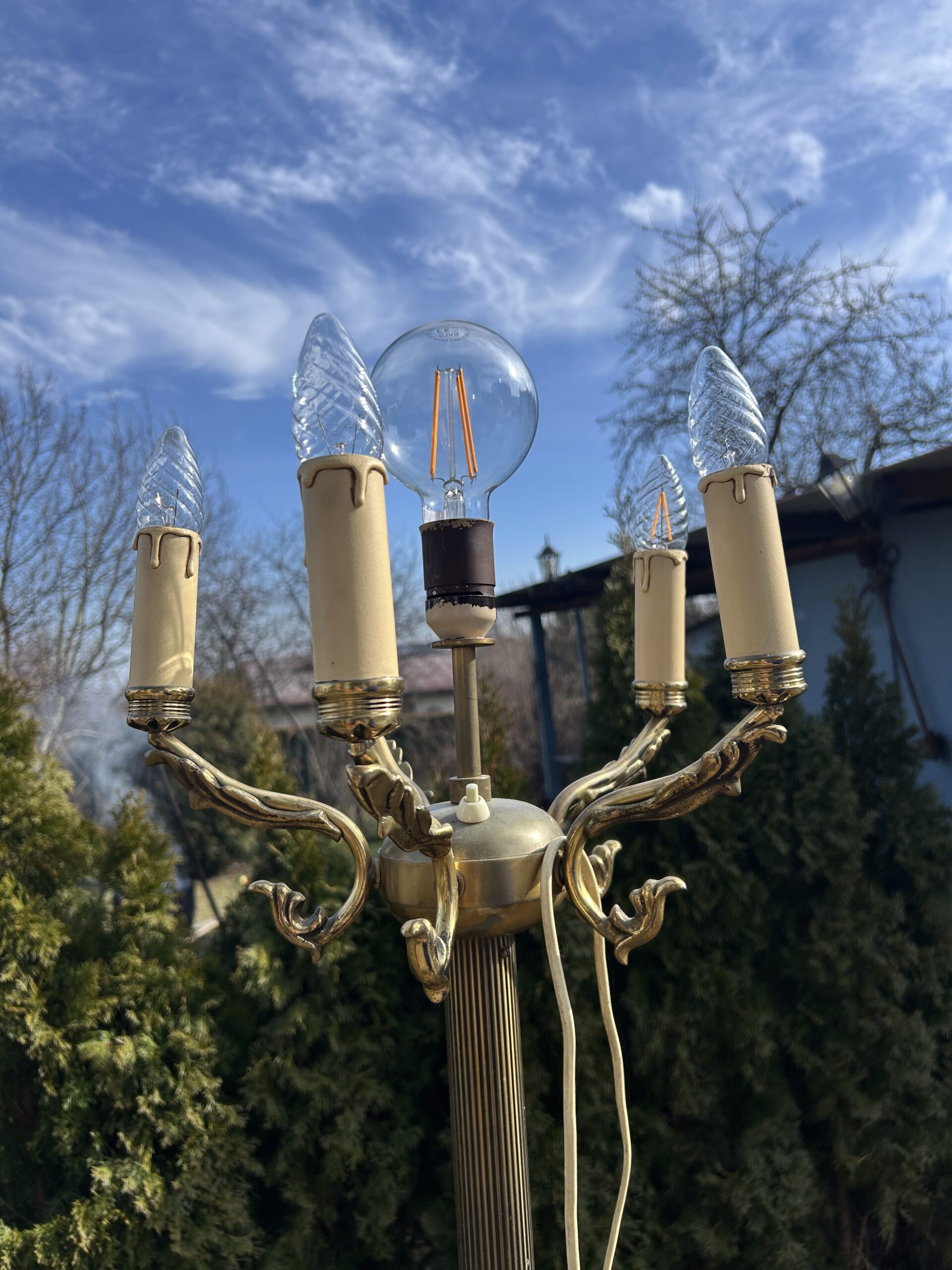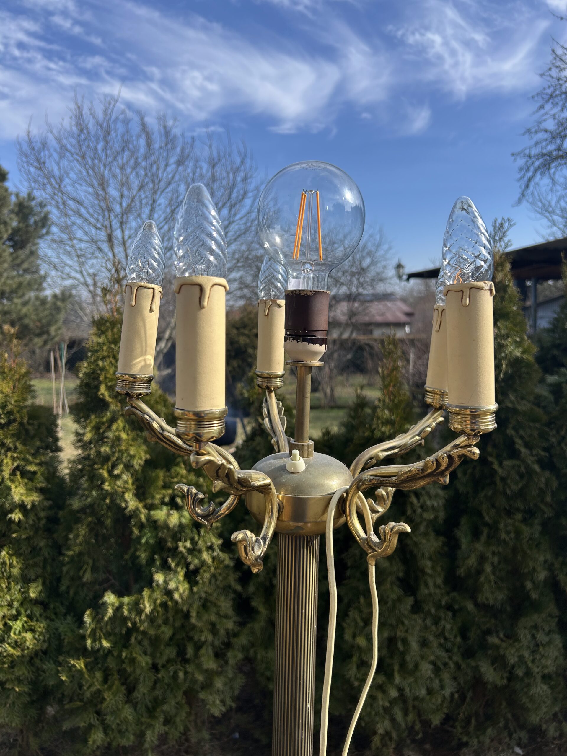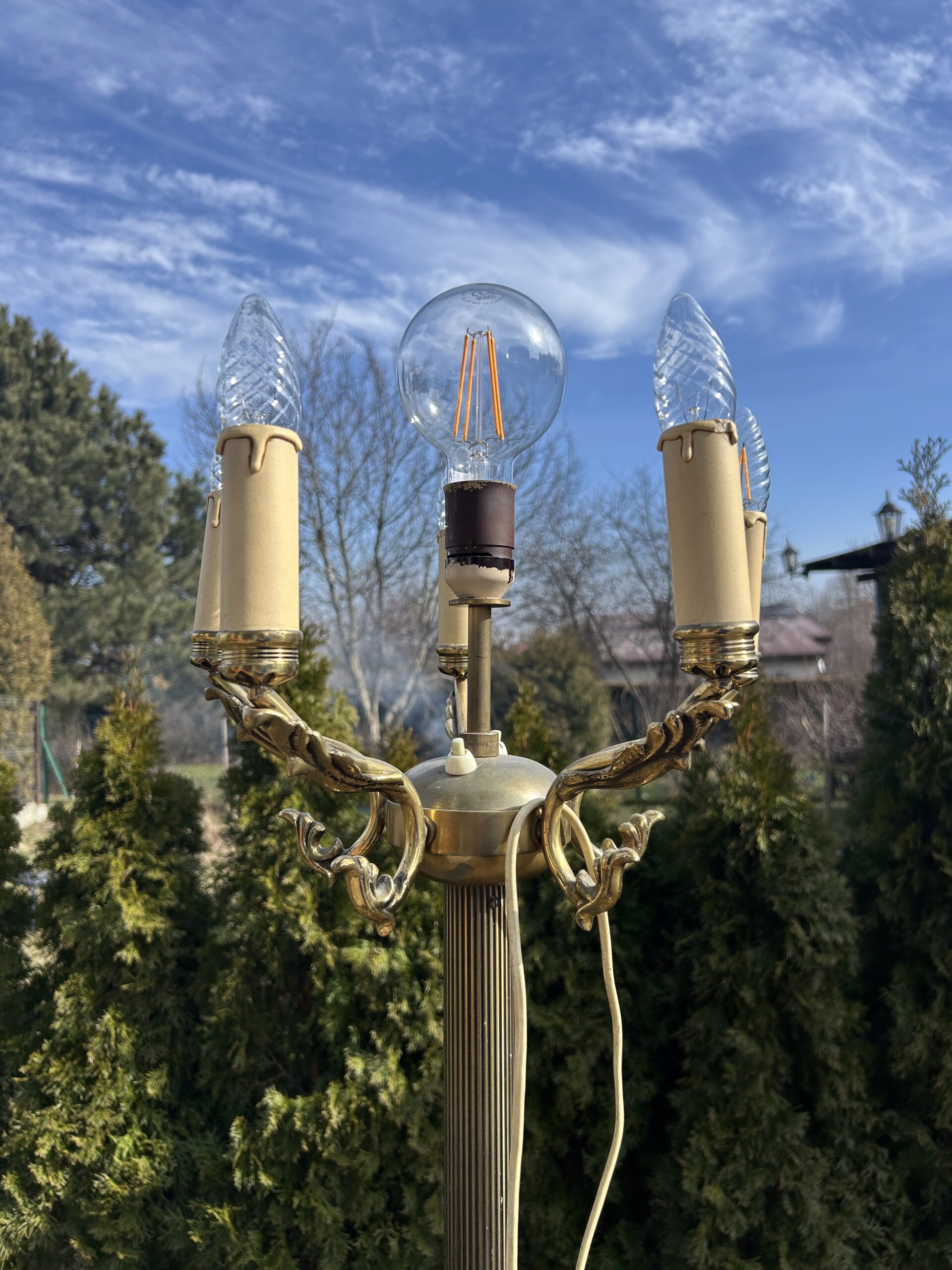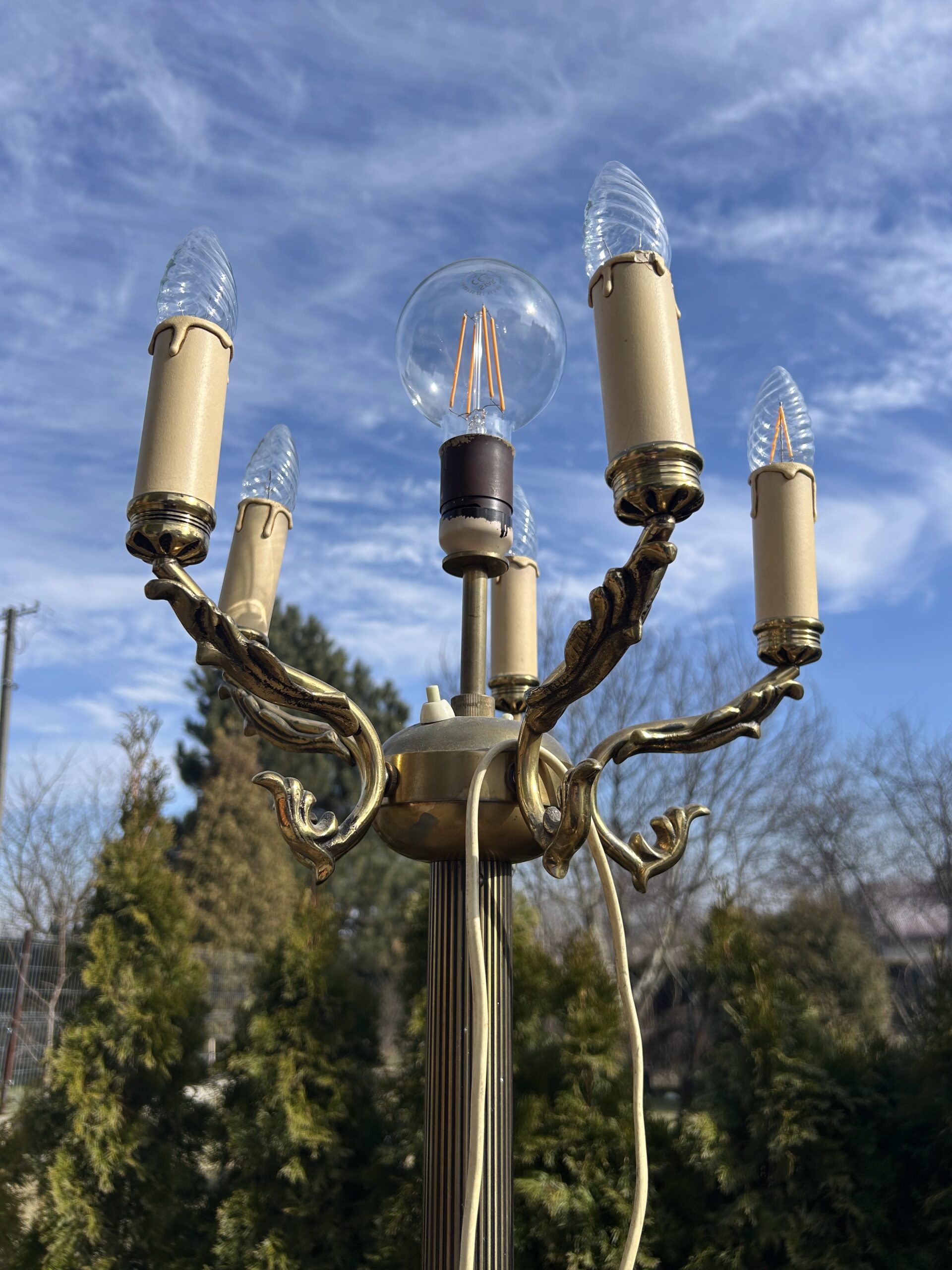 Wyjątkowa lampa stojąca, wykonana z mosiądzu i zdobiona misternymi detalami, która stanie się niepowtarzalnym akcentem w każdym wnętrzu. Lampa została zaprojektowana z myślą o wyjątkowej funkcjonalności – posiada 6 żarówek: pięć umieszczonych na ozdobnych pałąkach oraz jedną na szczycie, tworząc efektowny i równomierny rozkład światła. Dwa fluorescencyjne włączniki, świecące w ciemności, podkreślają nowoczesny akcent tego klasycznego dzieła, gwarantując łatwość obsługi nawet w nocy.