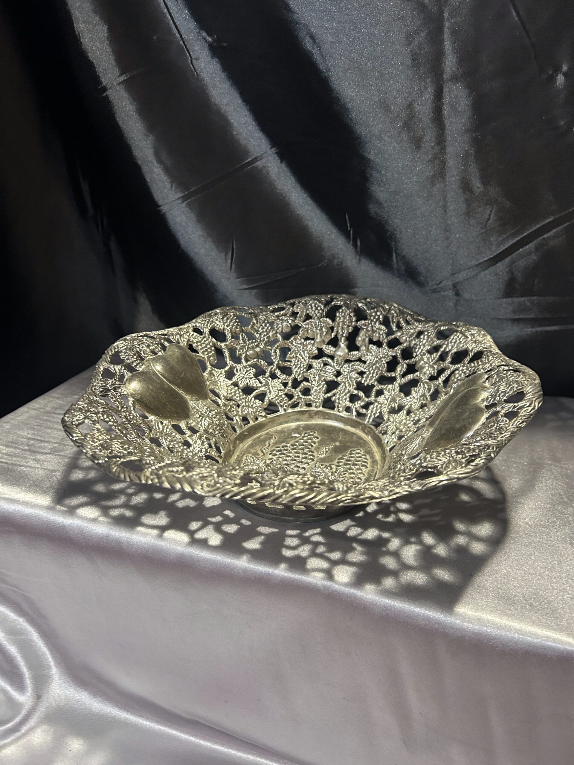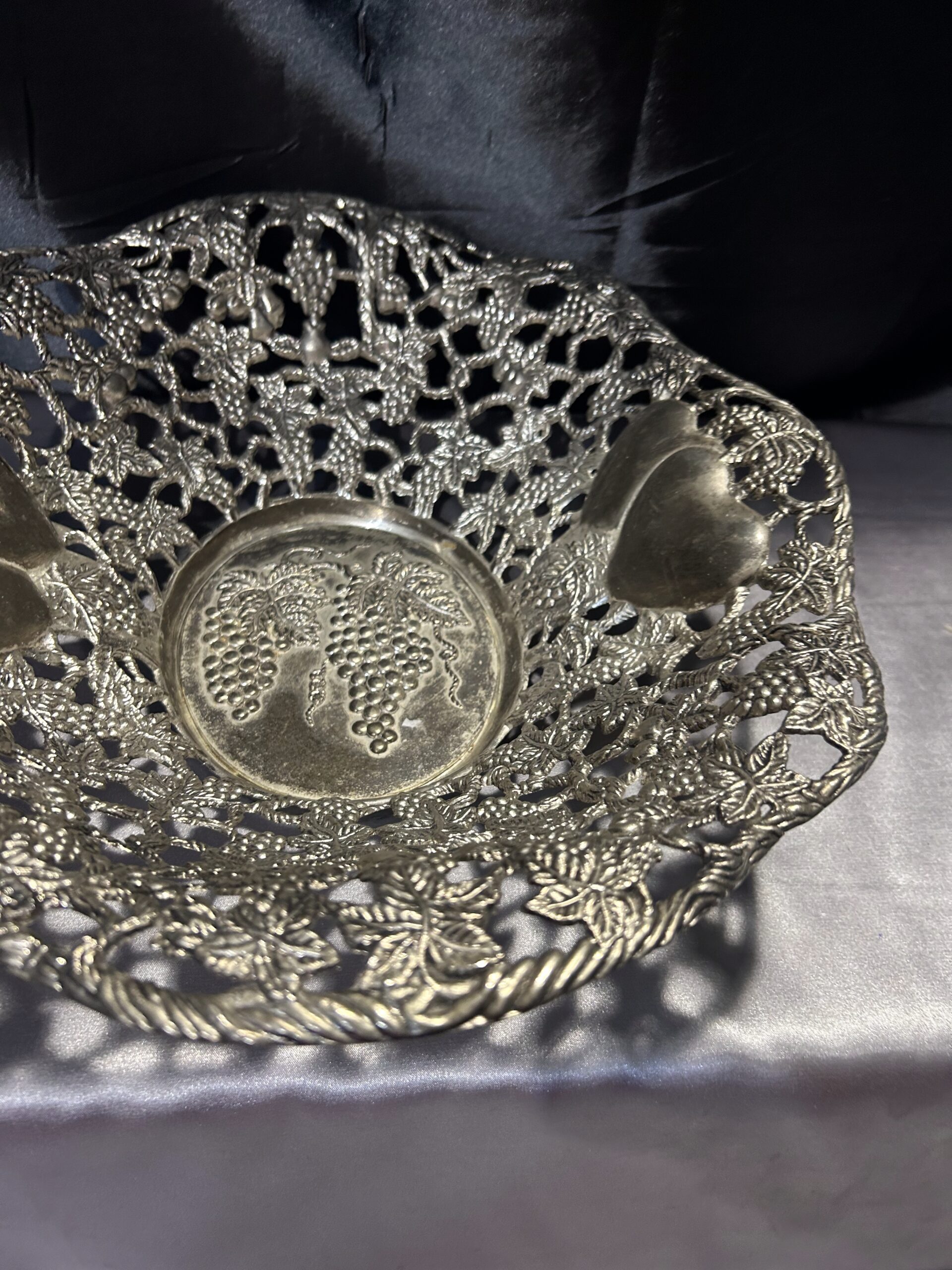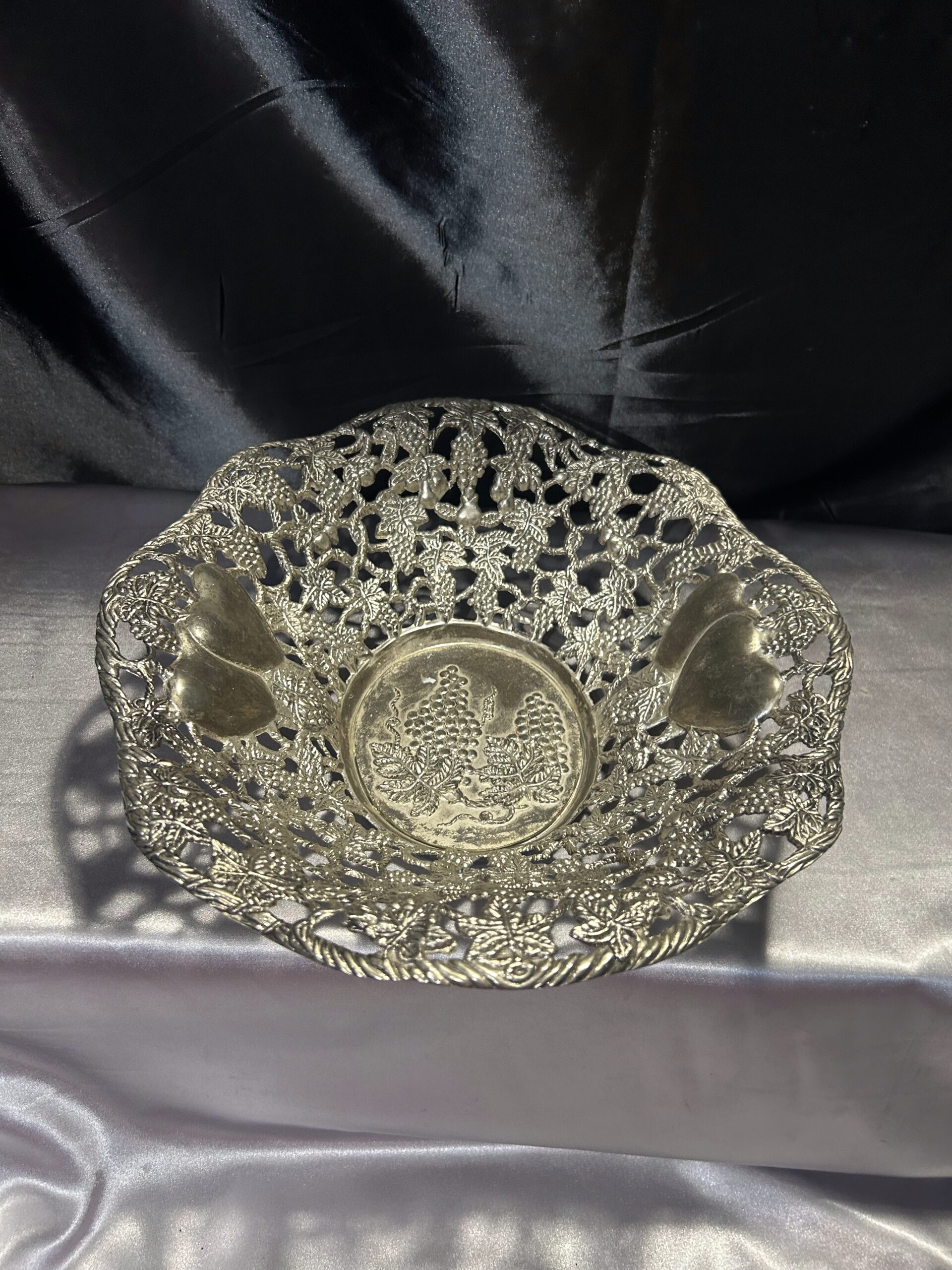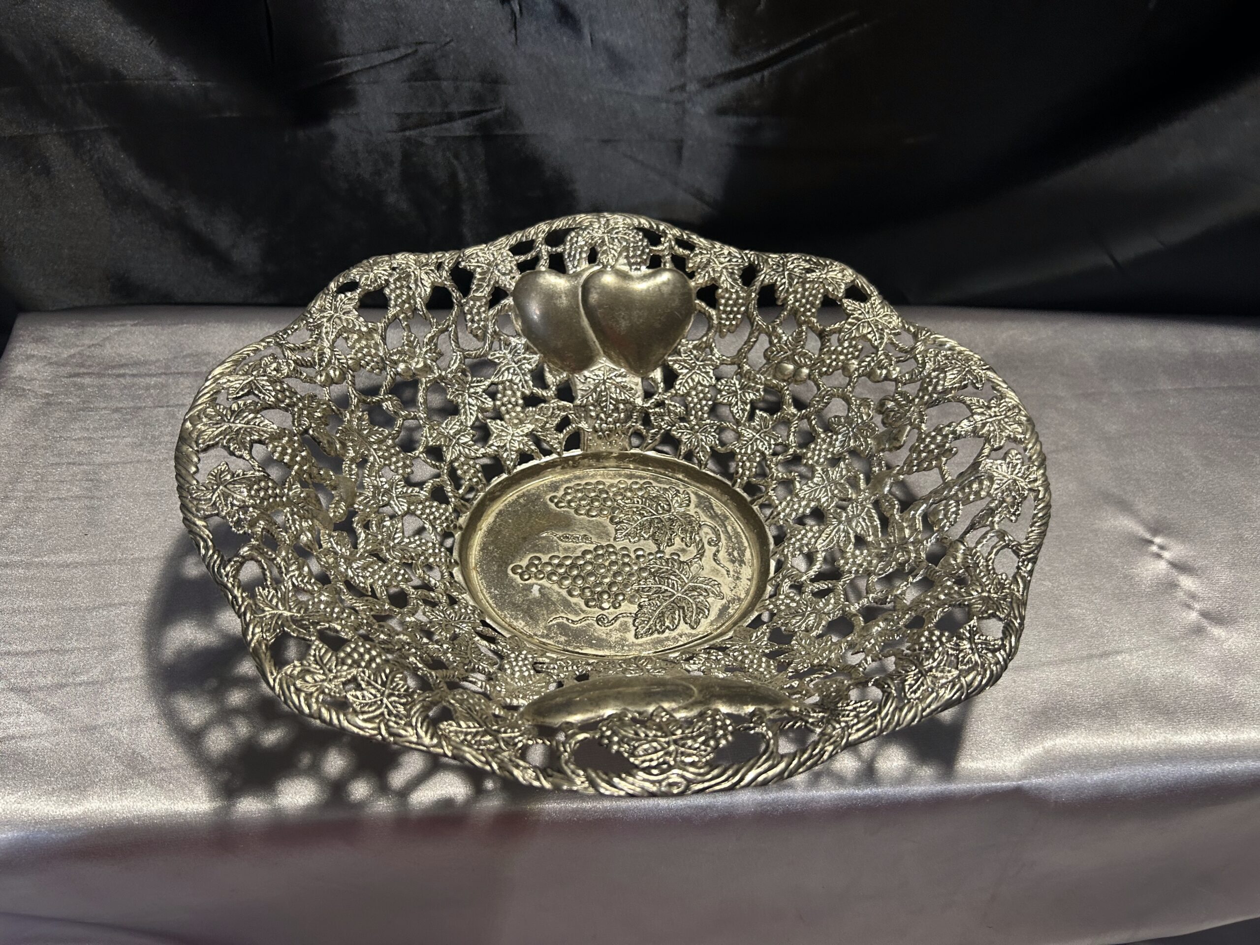 Piękna Misa Ażurowa – Zdobiona Motywem Serc, Winogron i Wiśni, Mosiądz Pobiał
