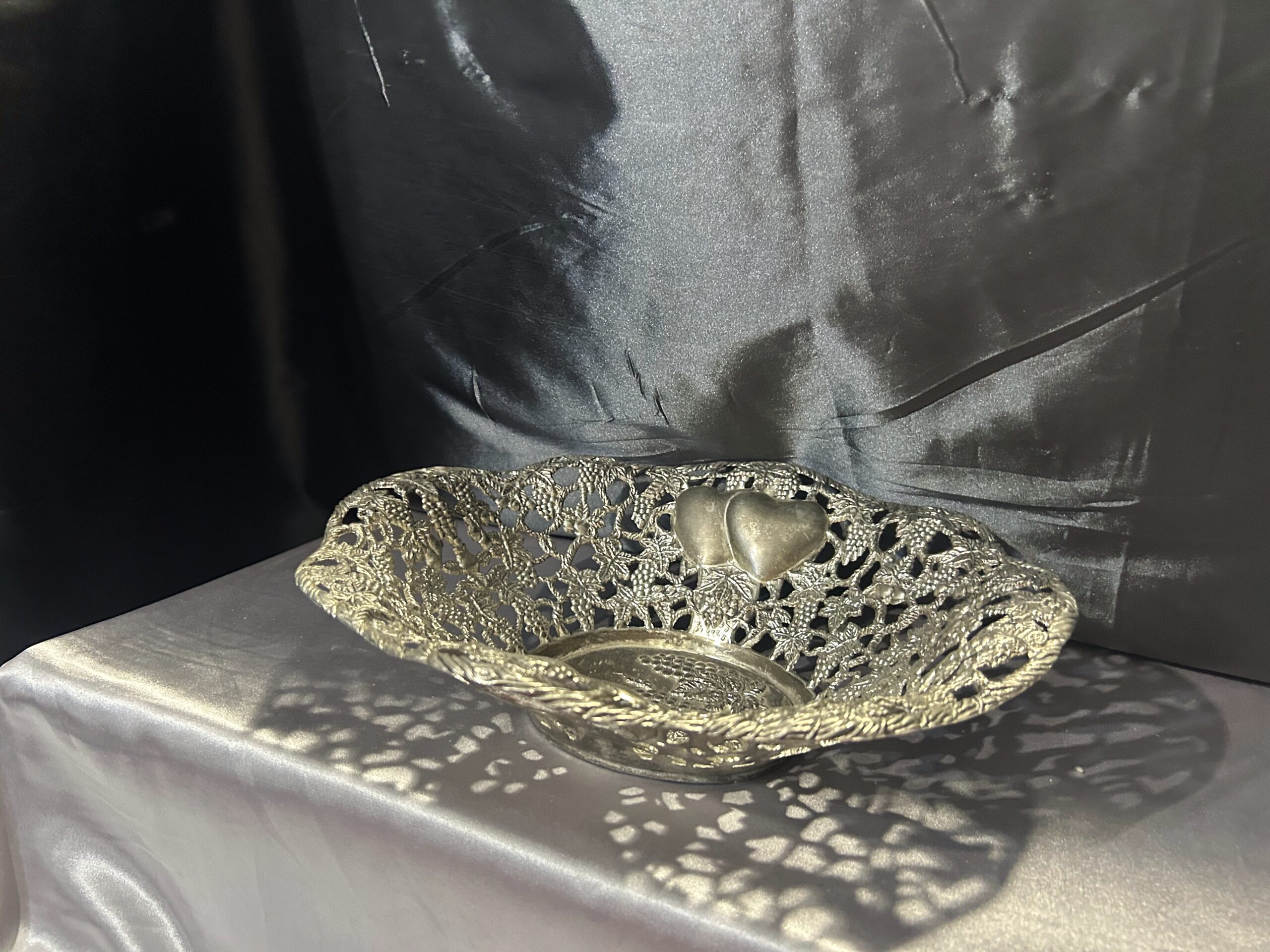 Oferujemy wyjątkową, ażurową misę dekoracyjną wykonaną z mosiądzu pobiał. Jej subtelne zdobienia przedstawiają dwa serca, winogrona, wiśnie oraz liście winorośli, tworząc harmonijną i elegancką kompozycję. To unikalny element dekoracyjny, który idealnie sprawdzi się jako patera na owoce lub ozdobna misa na stół.