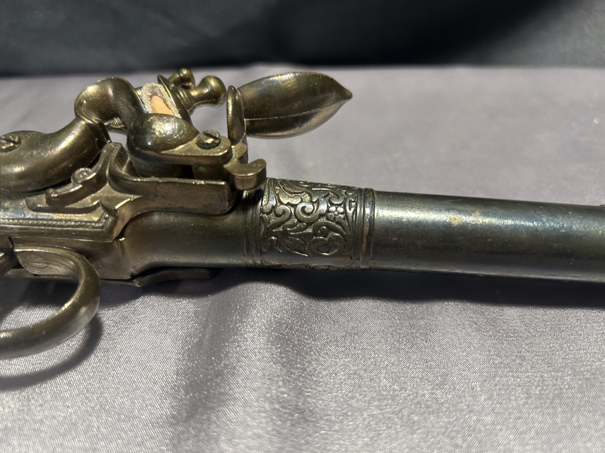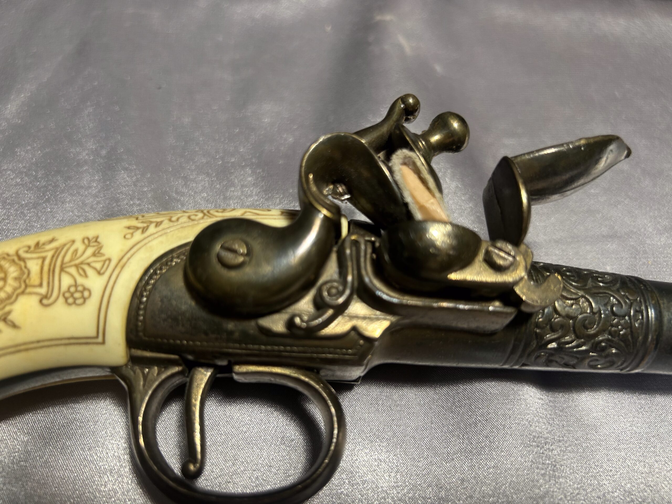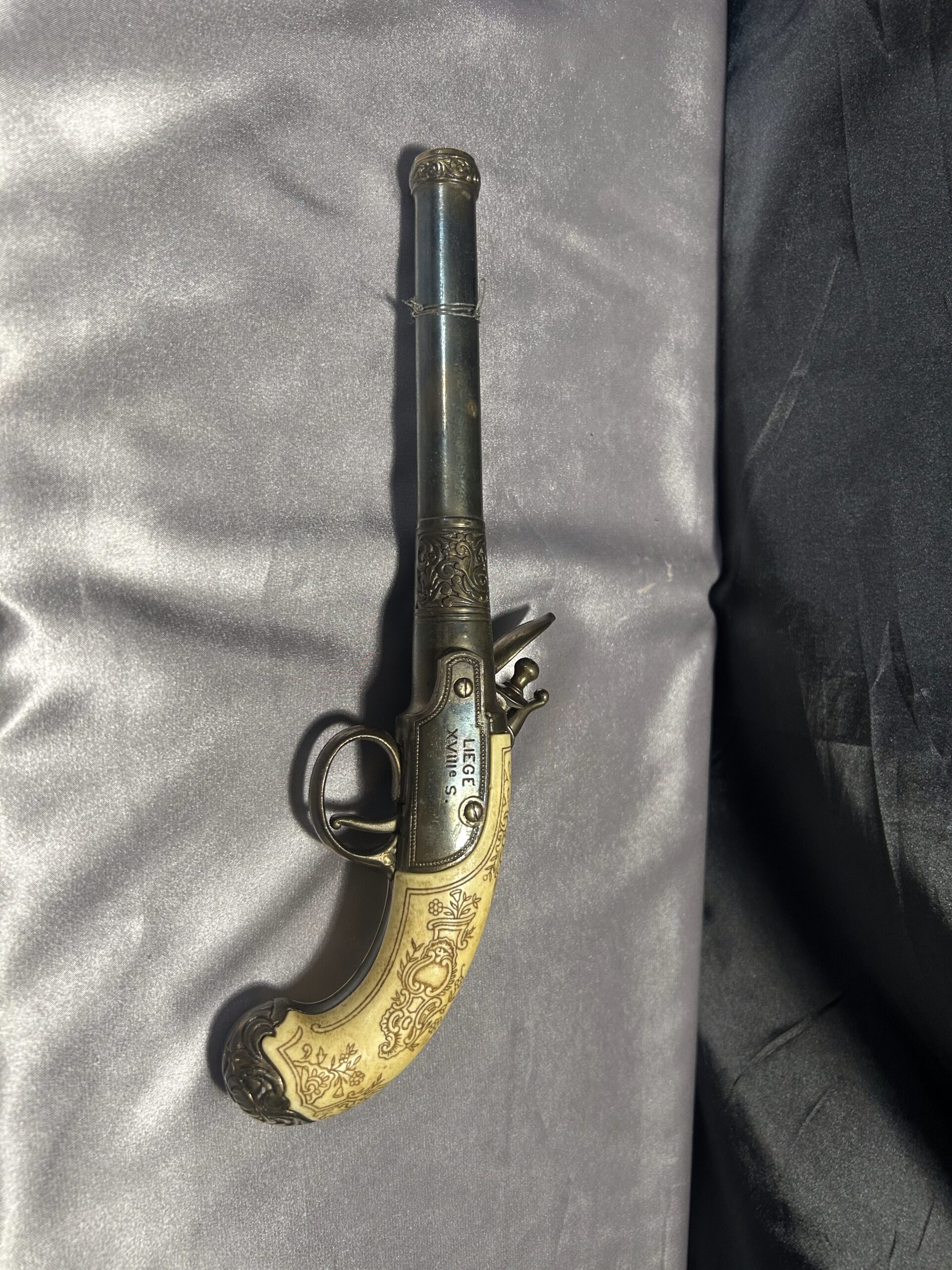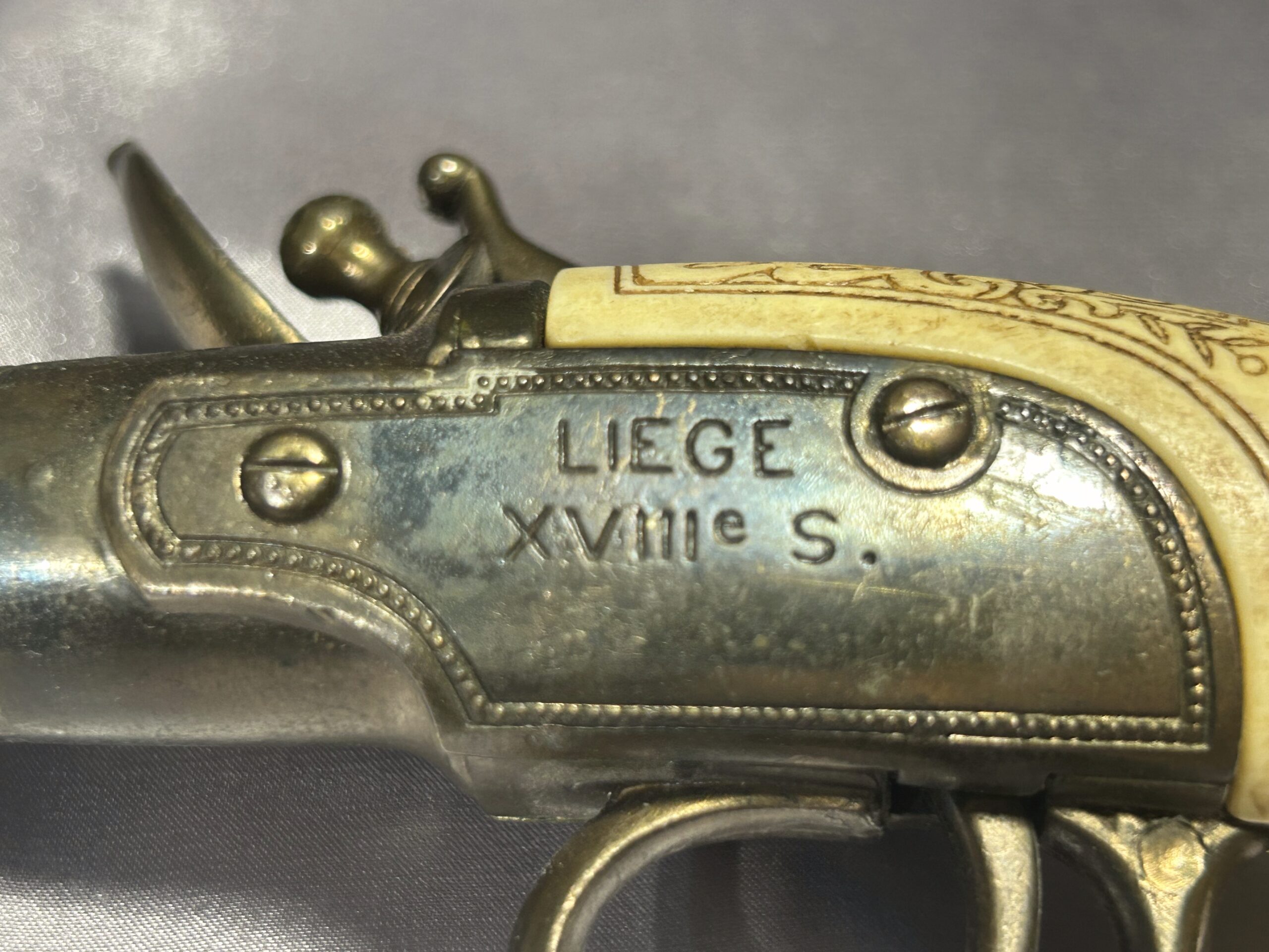 Piękna replika pistoletu skałkowego z XVIII wieku, sygnowana LIEGE XVIII e s.. Rzeźbiona rękojeść oraz staranne wykończenie czynią z niego doskonałą ozdobę oraz wyjątkowy element kolekcjonerski.