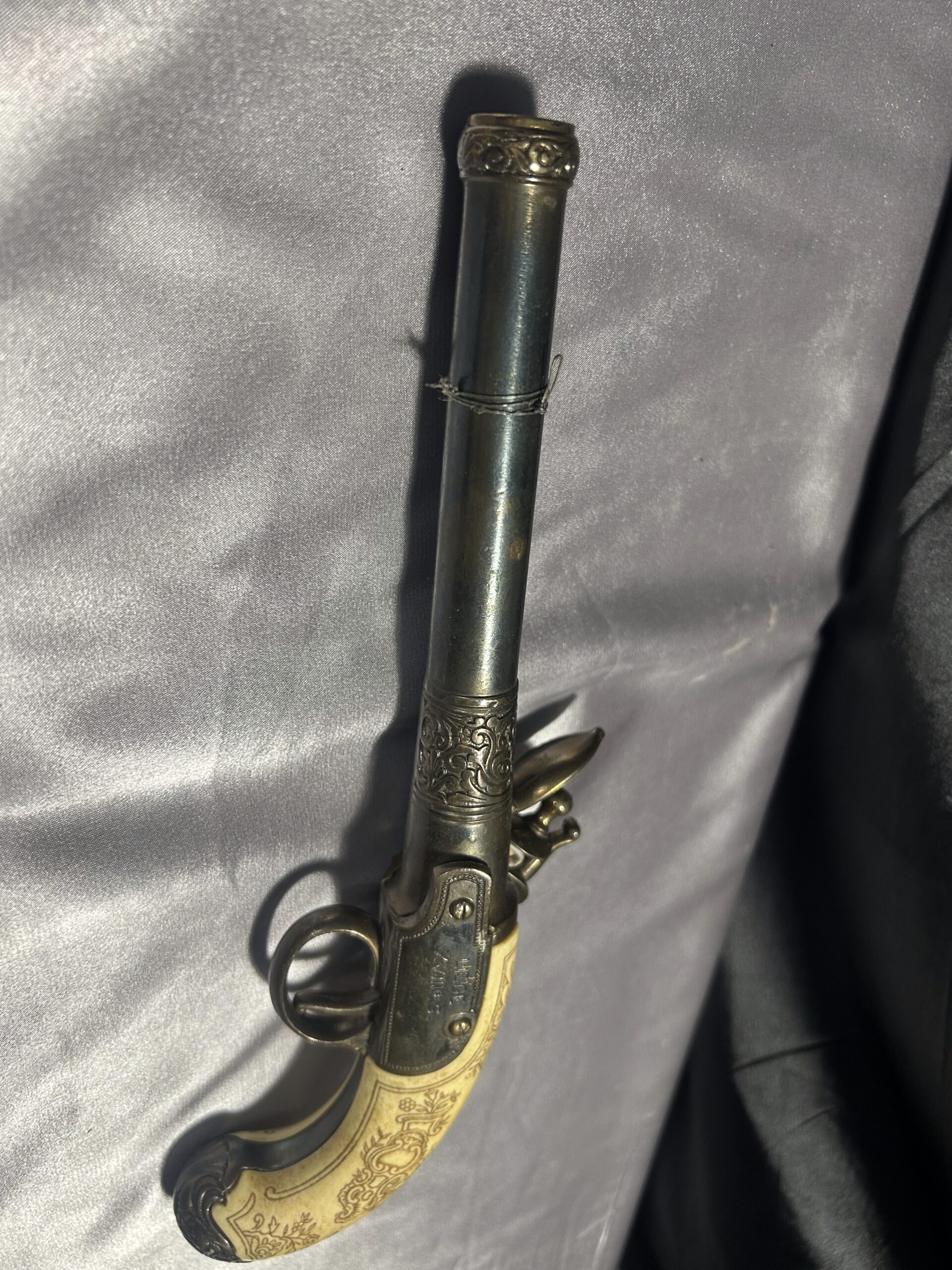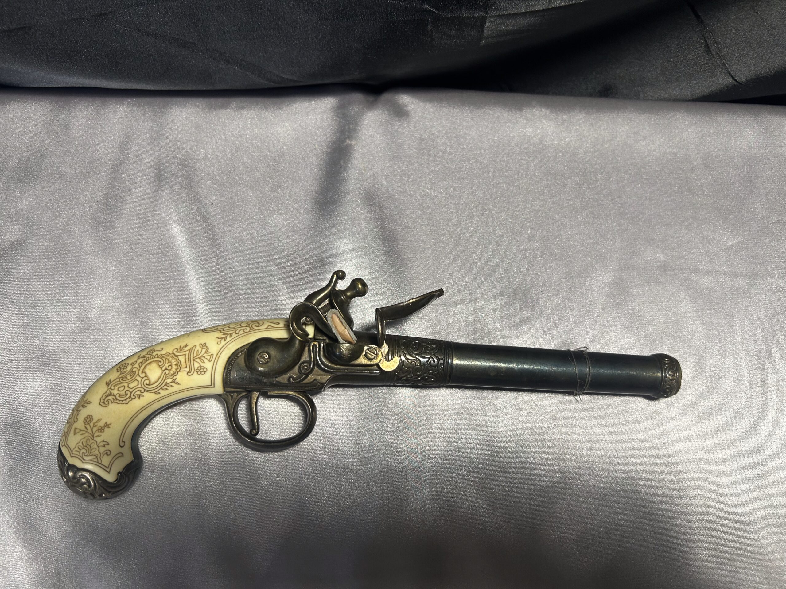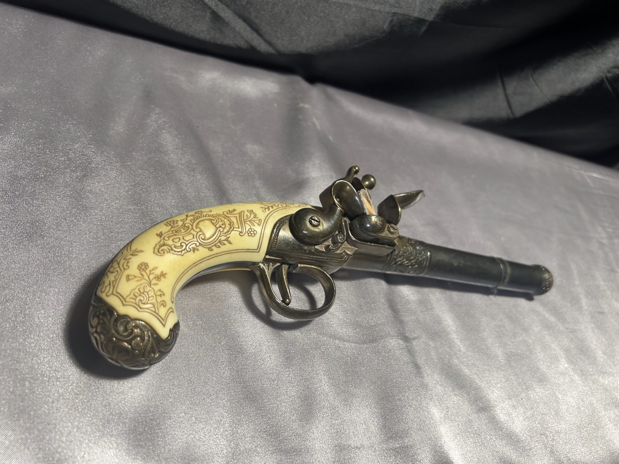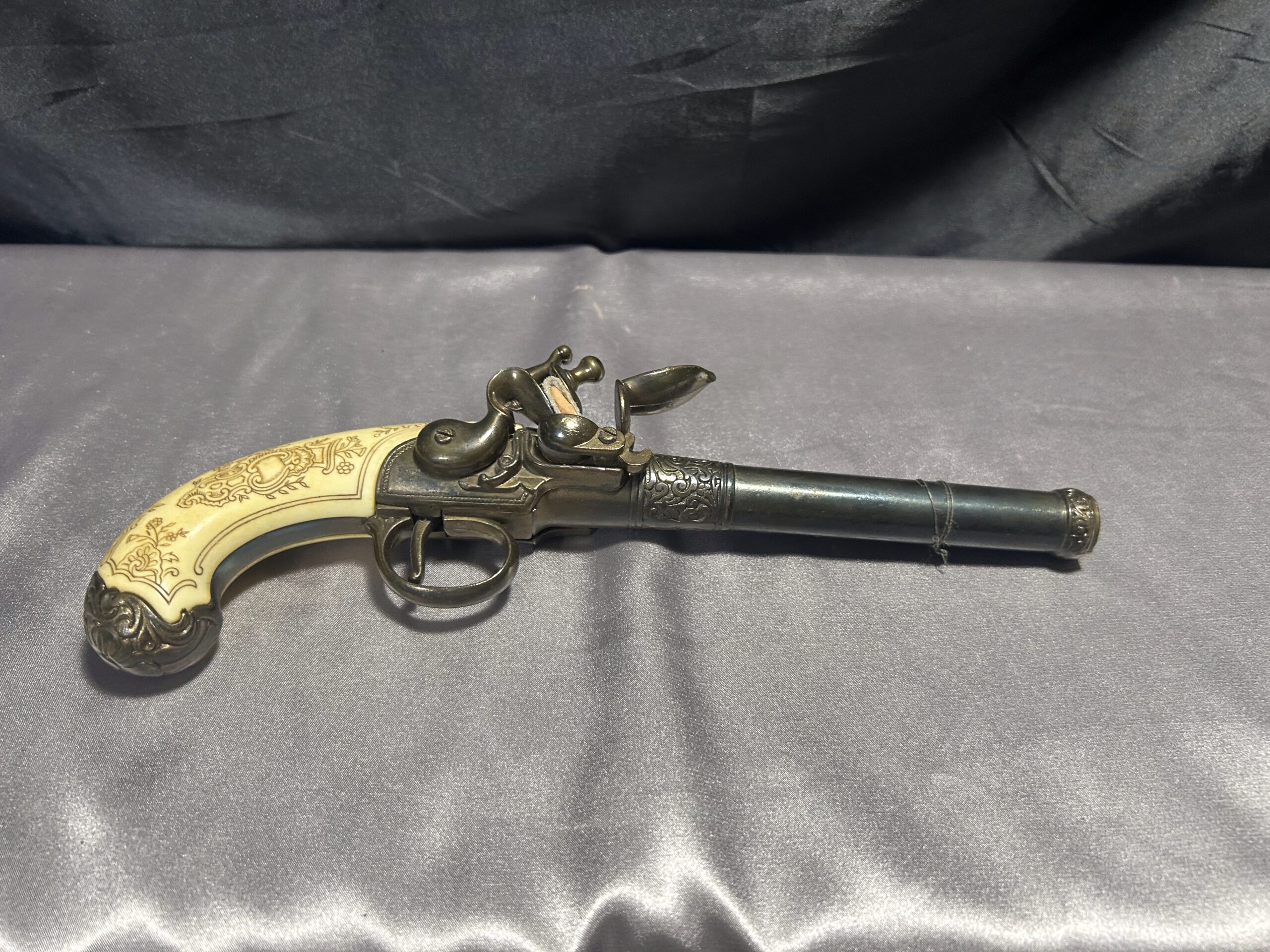 Piękna replika pistoletu skałkowego z XVIII wieku, sygnowana LIEGE XVIII e s.. Rzeźbiona rękojeść oraz staranne wykończenie czynią z niego doskonałą ozdobę oraz wyjątkowy element kolekcjonerski.