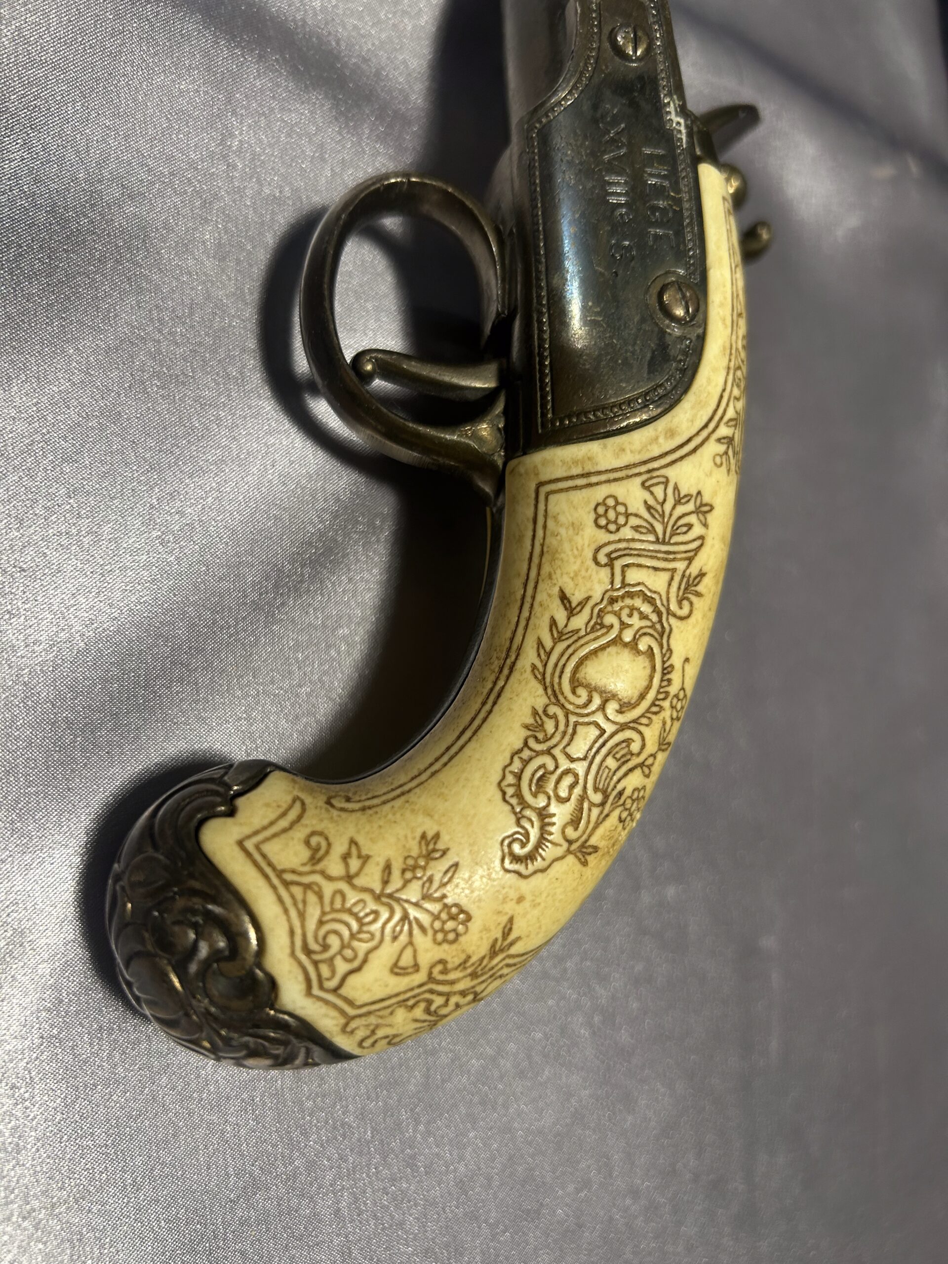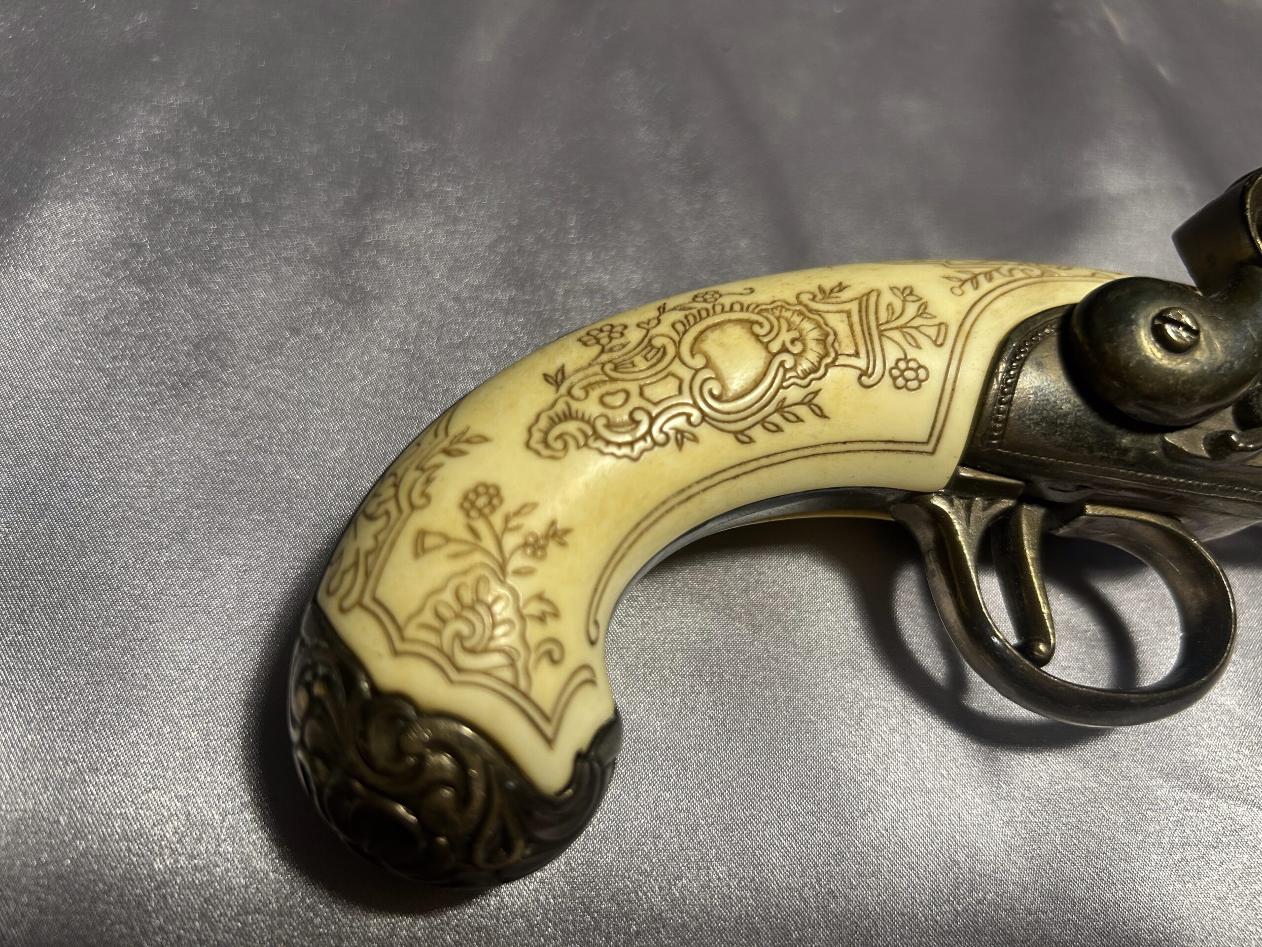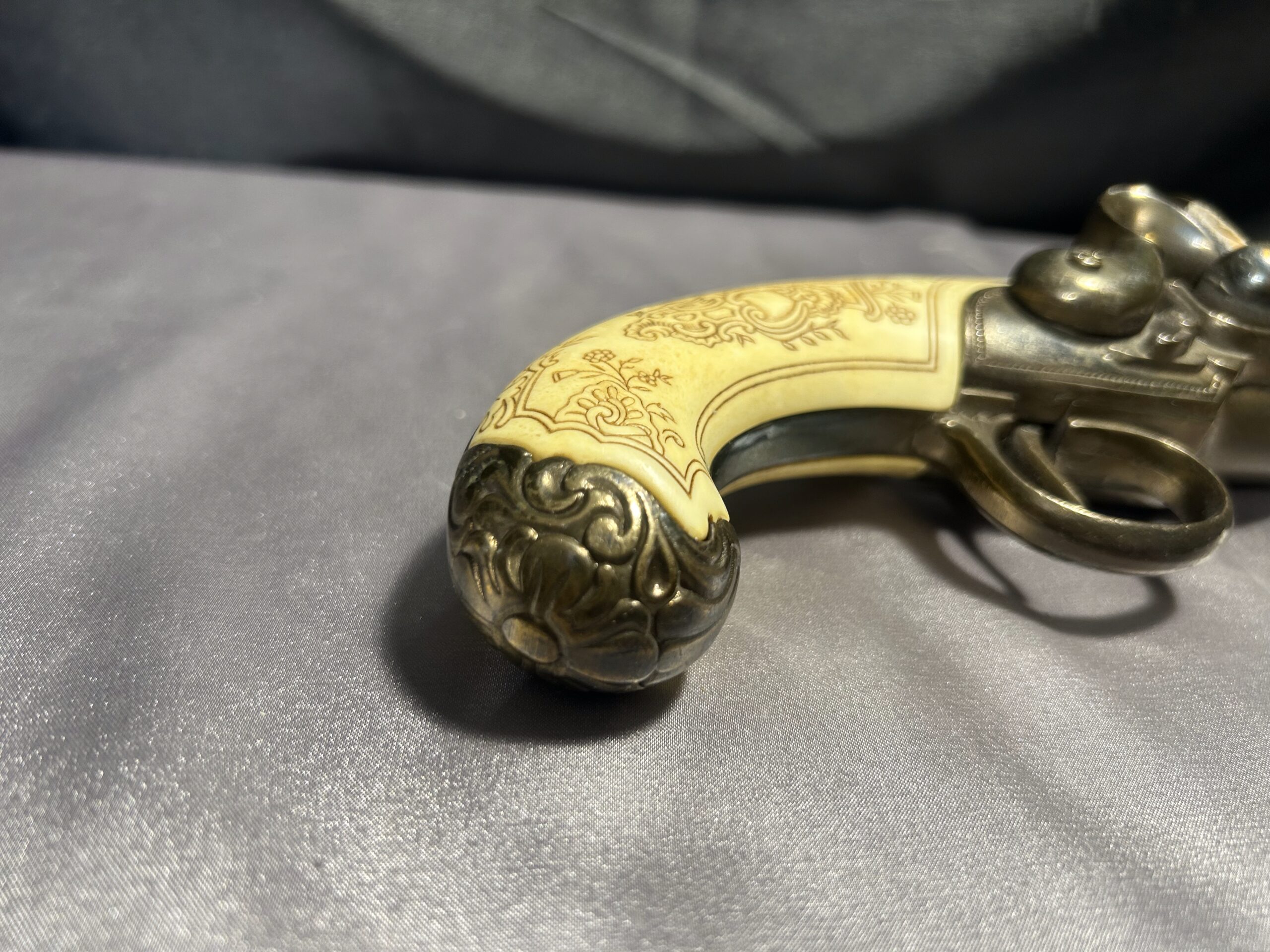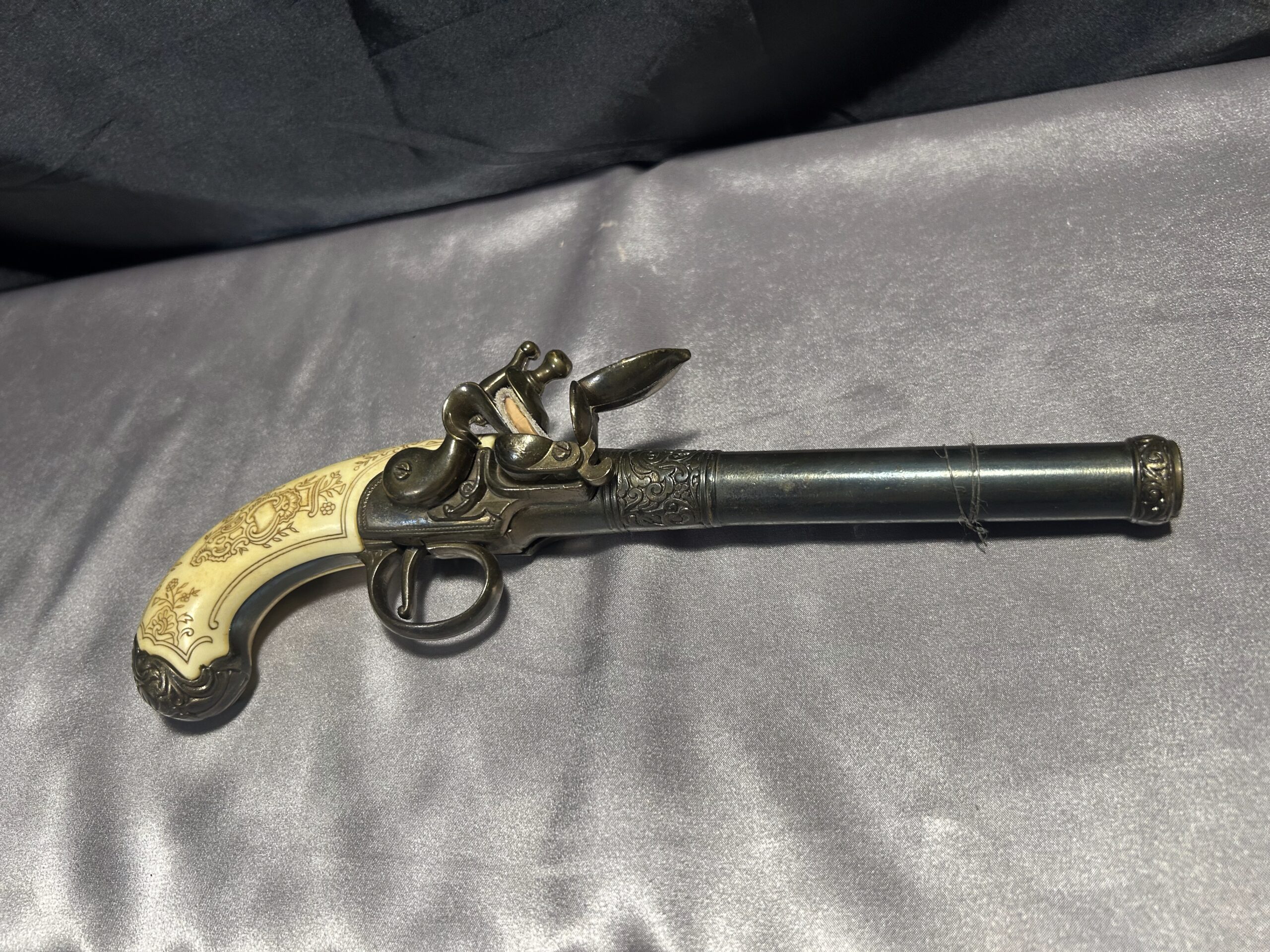 Piękna replika pistoletu skałkowego z XVIII wieku, sygnowana LIEGE XVIII e s.. Rzeźbiona rękojeść oraz staranne wykończenie czynią z niego doskonałą ozdobę oraz wyjątkowy element kolekcjonerski.