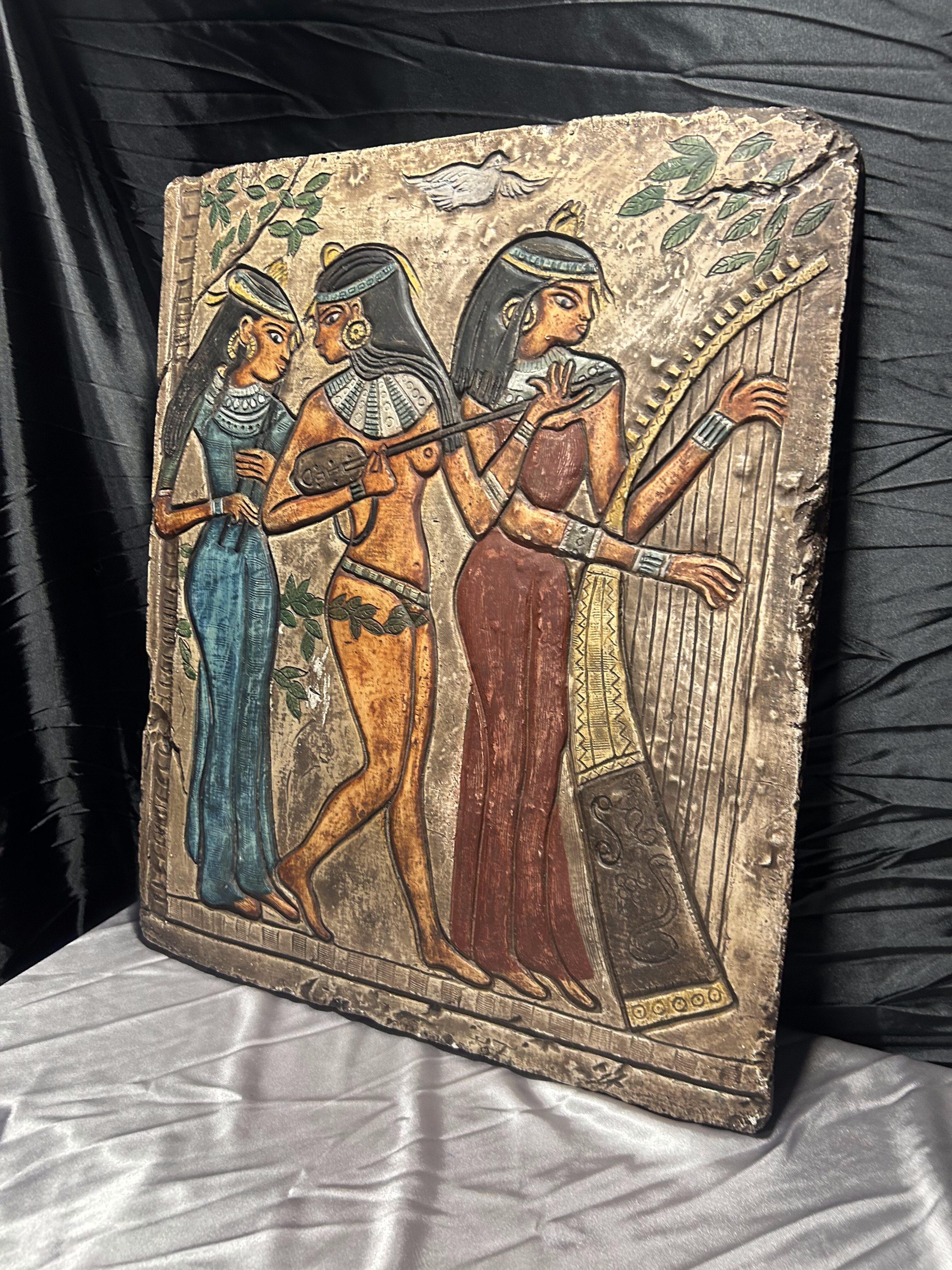 Unikatowa płaskorzeźba o imponujących wymiarach i wadze, przedstawiająca trzy postacie egipskie – tancerki i muzykantki z harfą oraz lutnią. Motyw nawiązuje do sztuki starożytnego Egiptu, gdzie tego typu przedstawienia zdobiły ściany grobowców i pałaców, ukazując życie dworskie, rozrywki i rytuały.