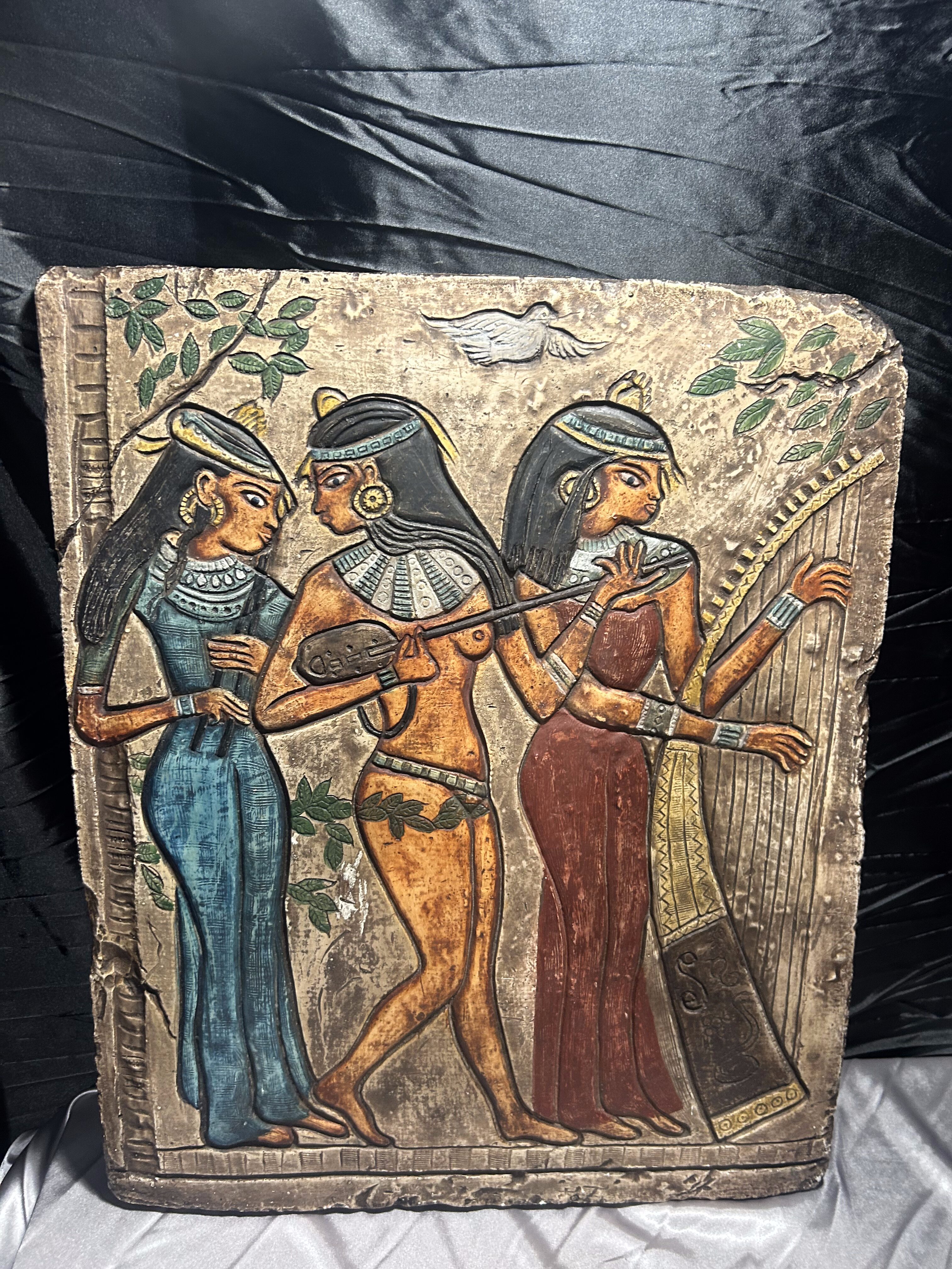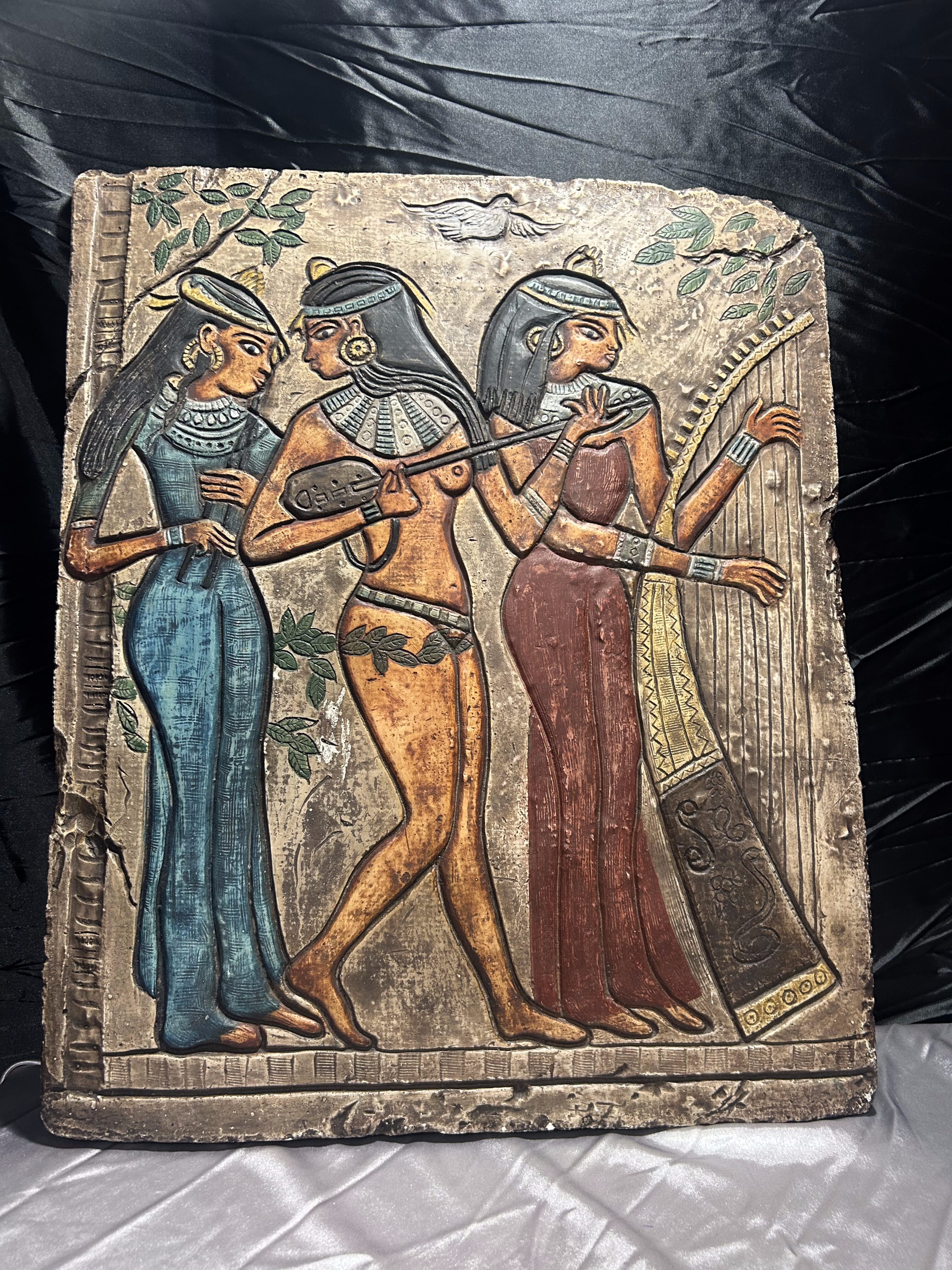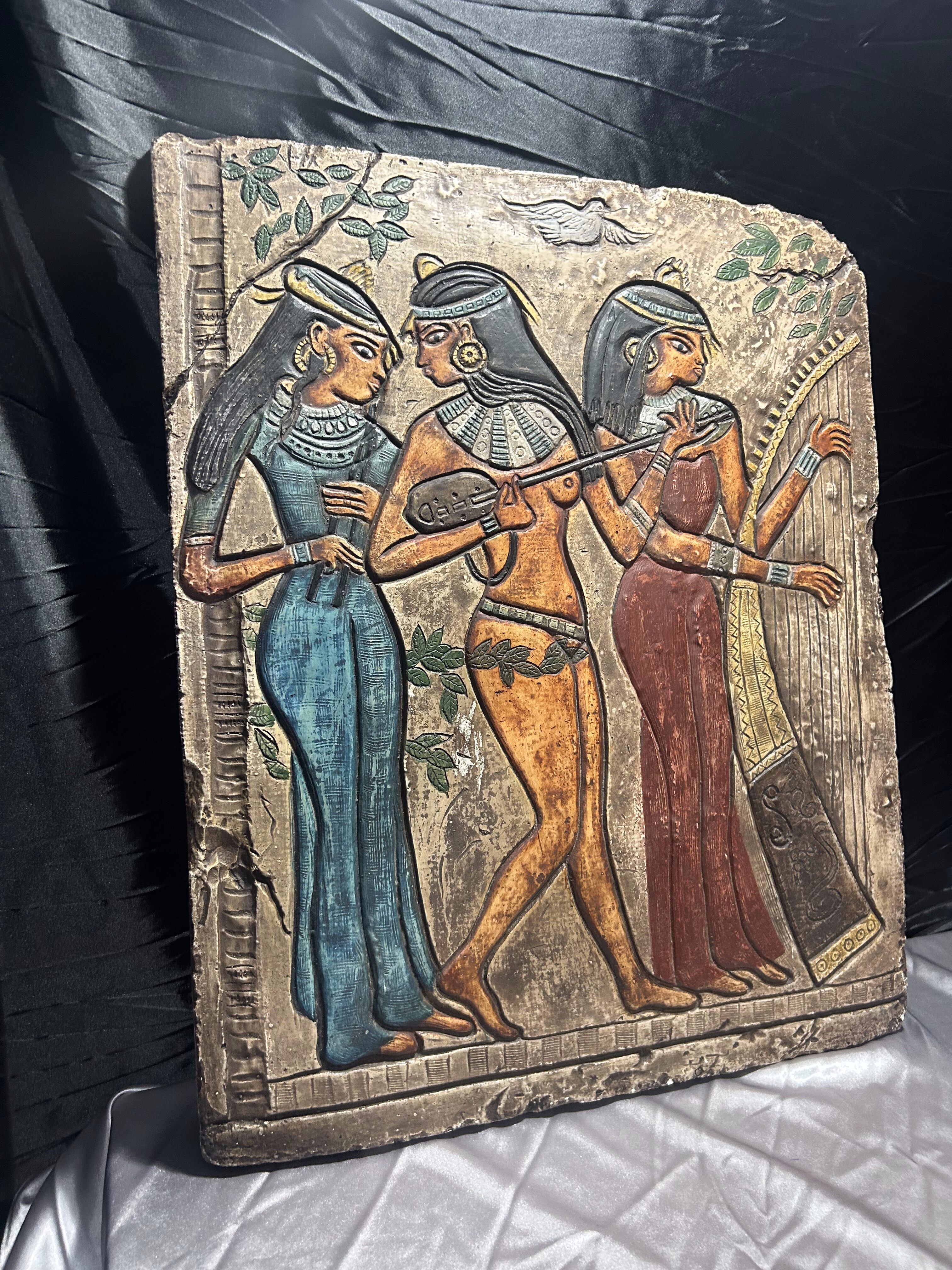 Egipskie płaskorzeźby to sztuka rozwijana już od okresu Starego Państwa (ok. 2686–2181 p.n.e.), a przedstawienia muzyków i tancerek szczególnie popularne były w Nowym Państwie (ok. 1550–1070 p.n.e.). Prezentowany egzemplarz jest współczesną repliką inspirowaną tą tradycją, stworzoną jako dekoracja o charakterze historycznym i edukacyjnym.
