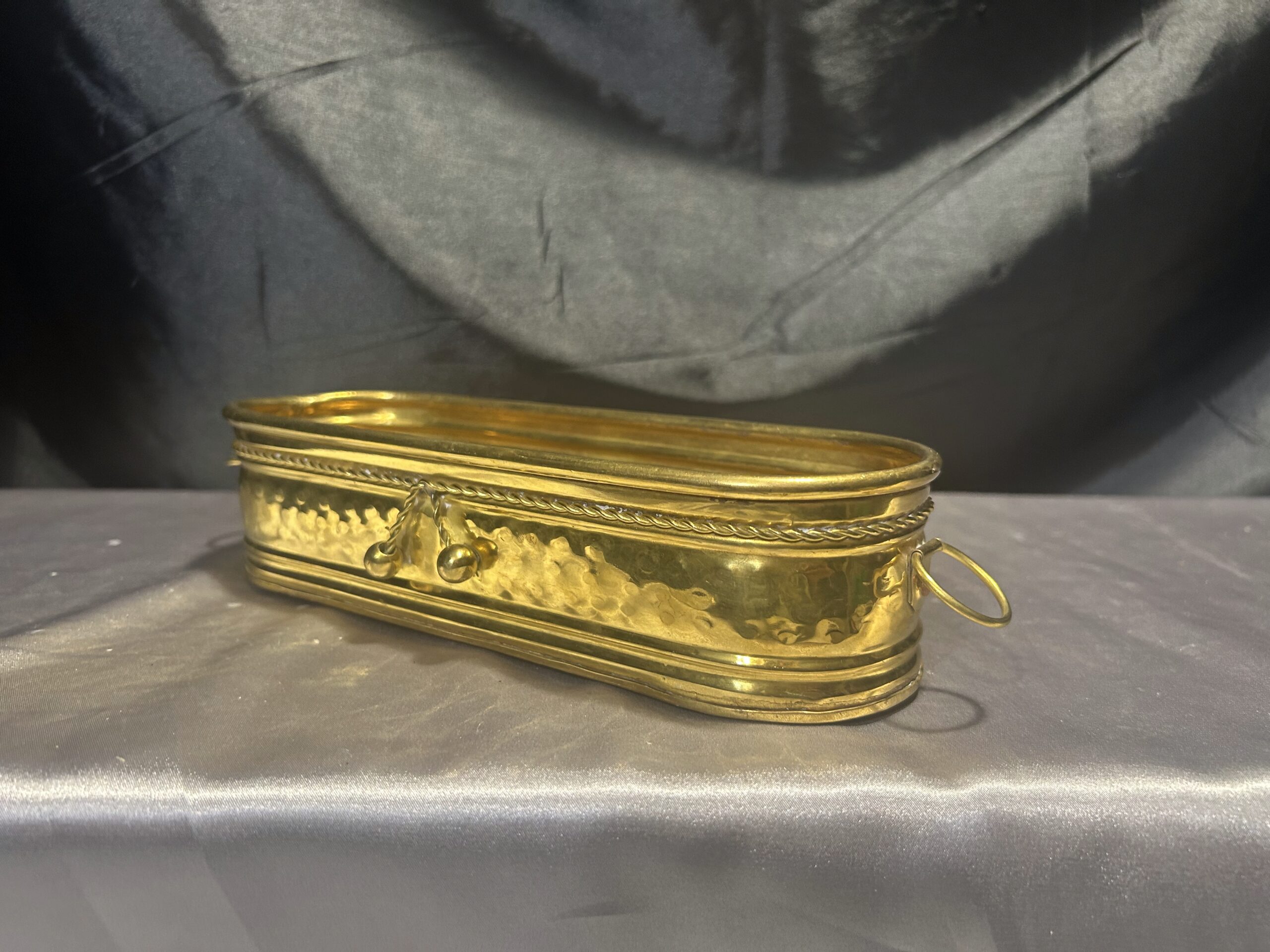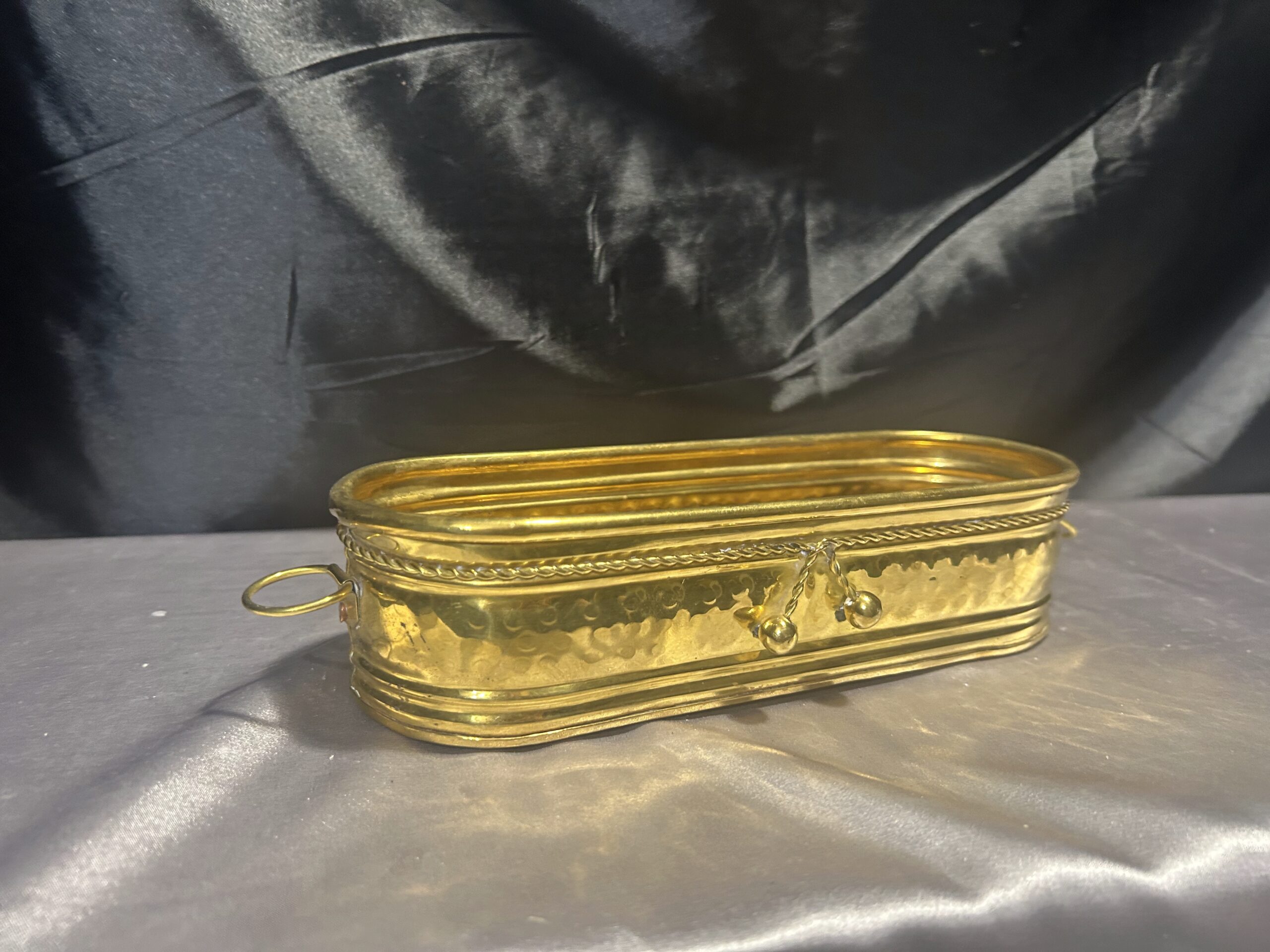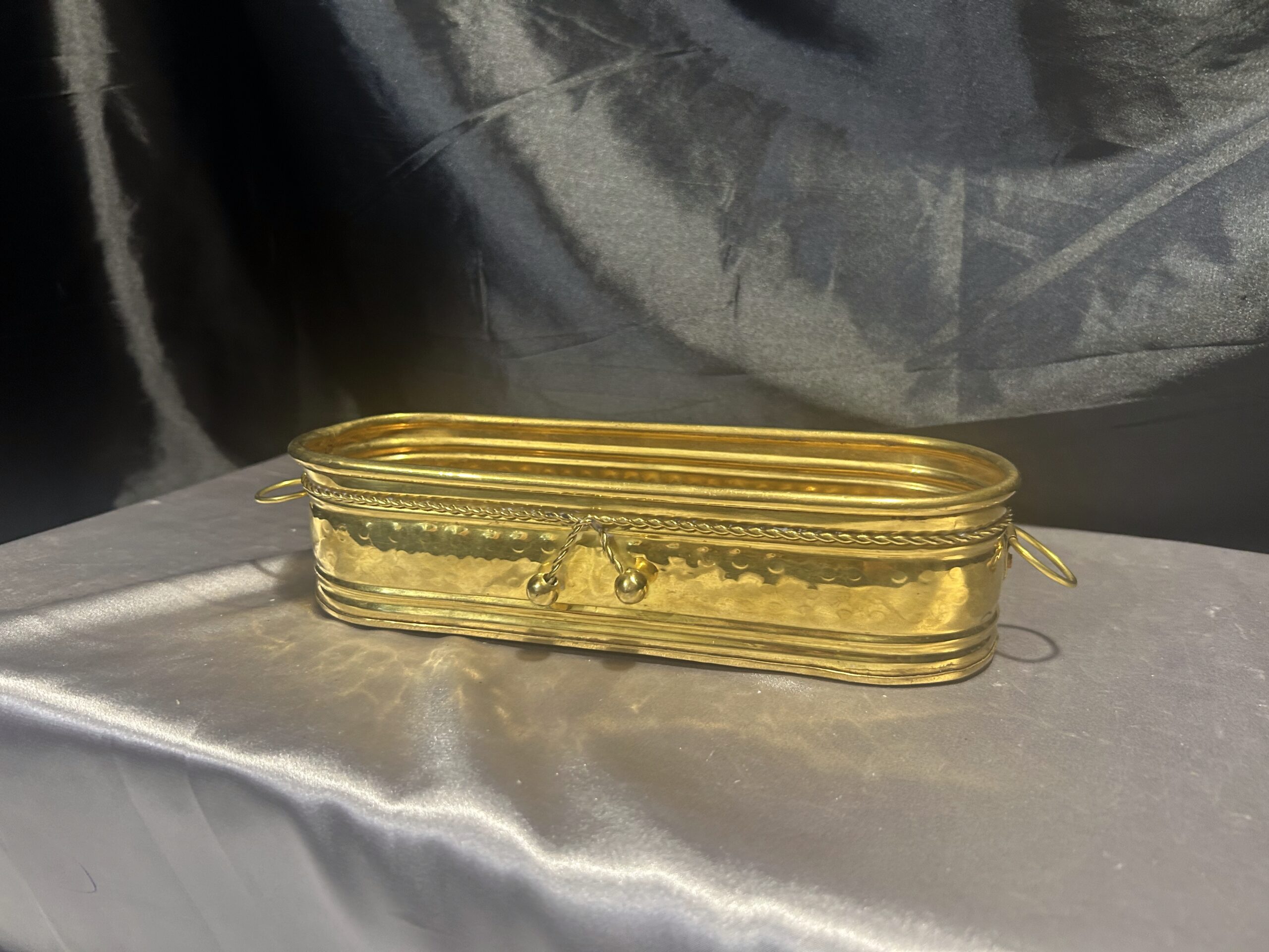 Stylowy, podłużny kwietnik wykonany z mosiądzu, który łączy w sobie klasyczną elegancję i funkcjonalność. Jego solidna konstrukcja oraz szlachetny połysk mosiądzu sprawiają, że doskonale prezentuje się w każdym wnętrzu. Może służyć jako ozdoba na parapecie, stole lub komodzie, podkreślając urok roślin doniczkowych.