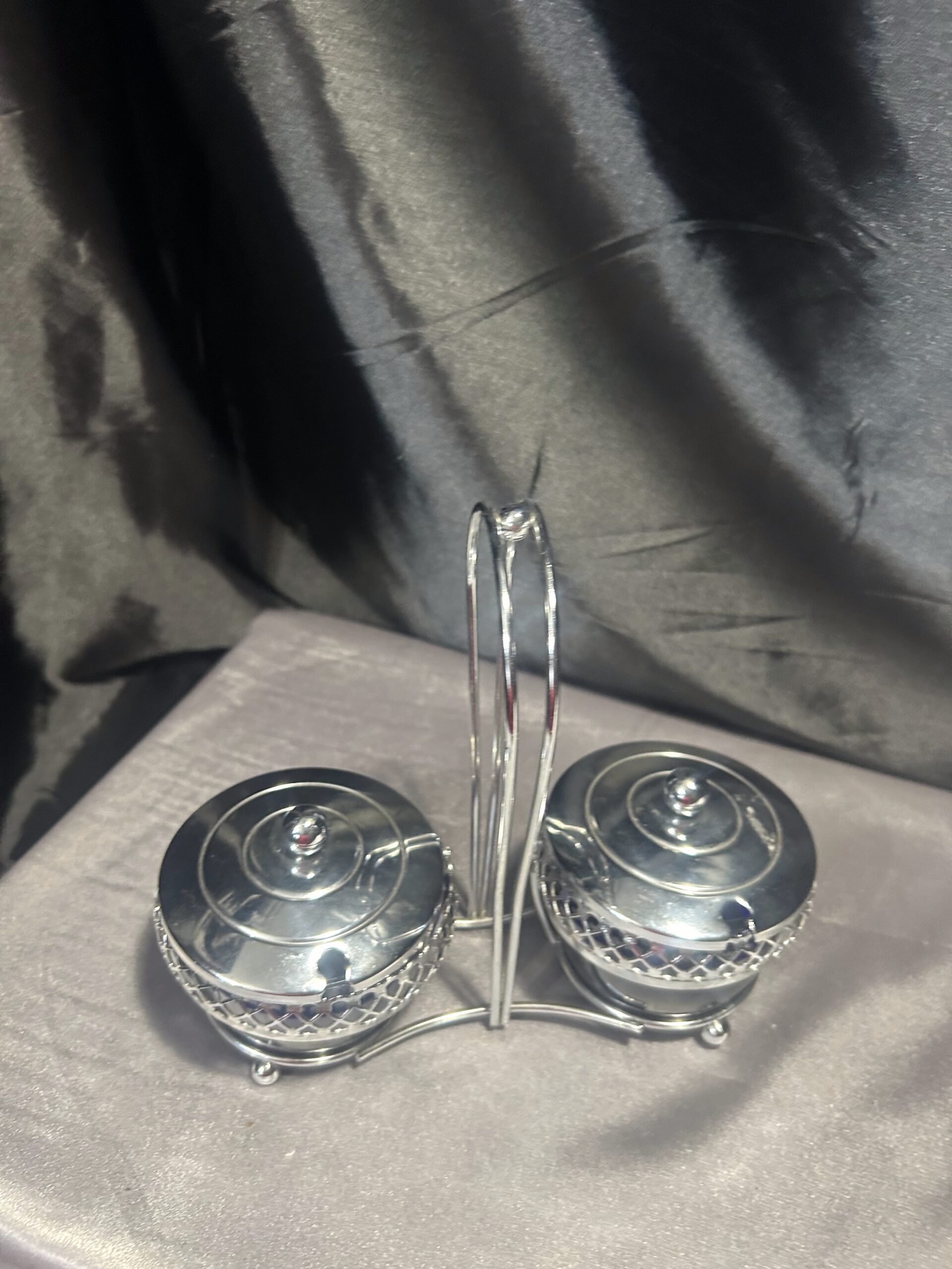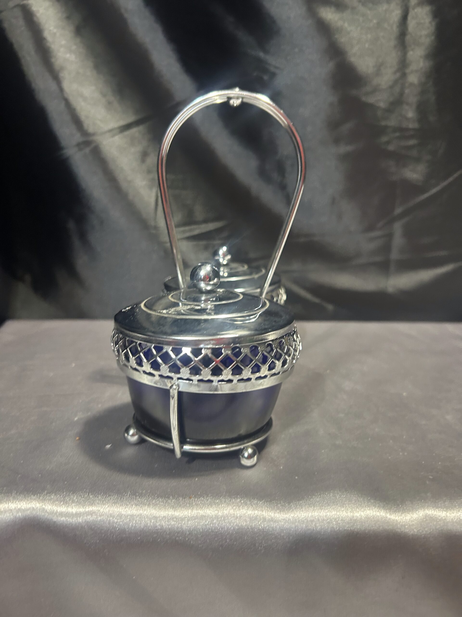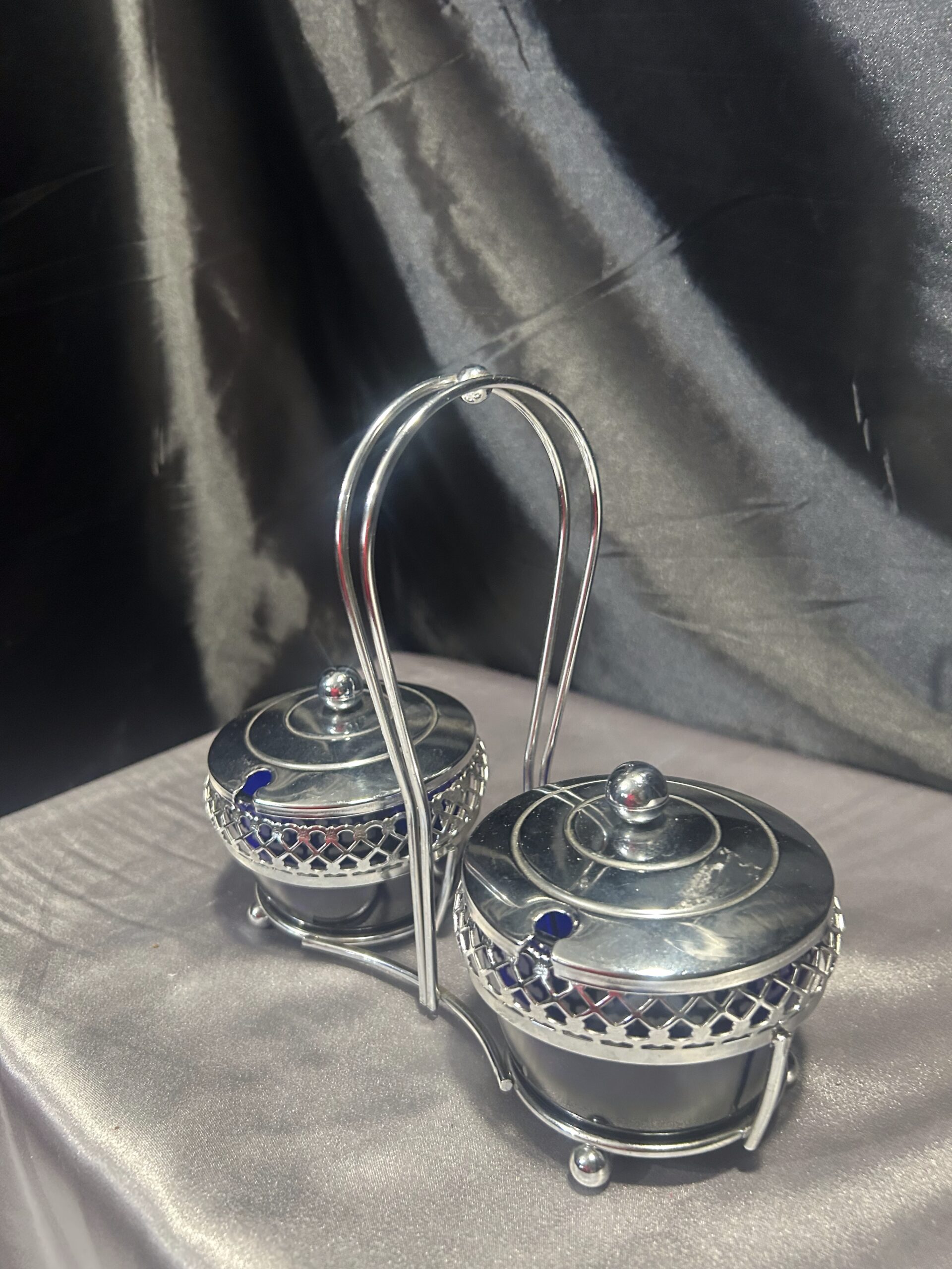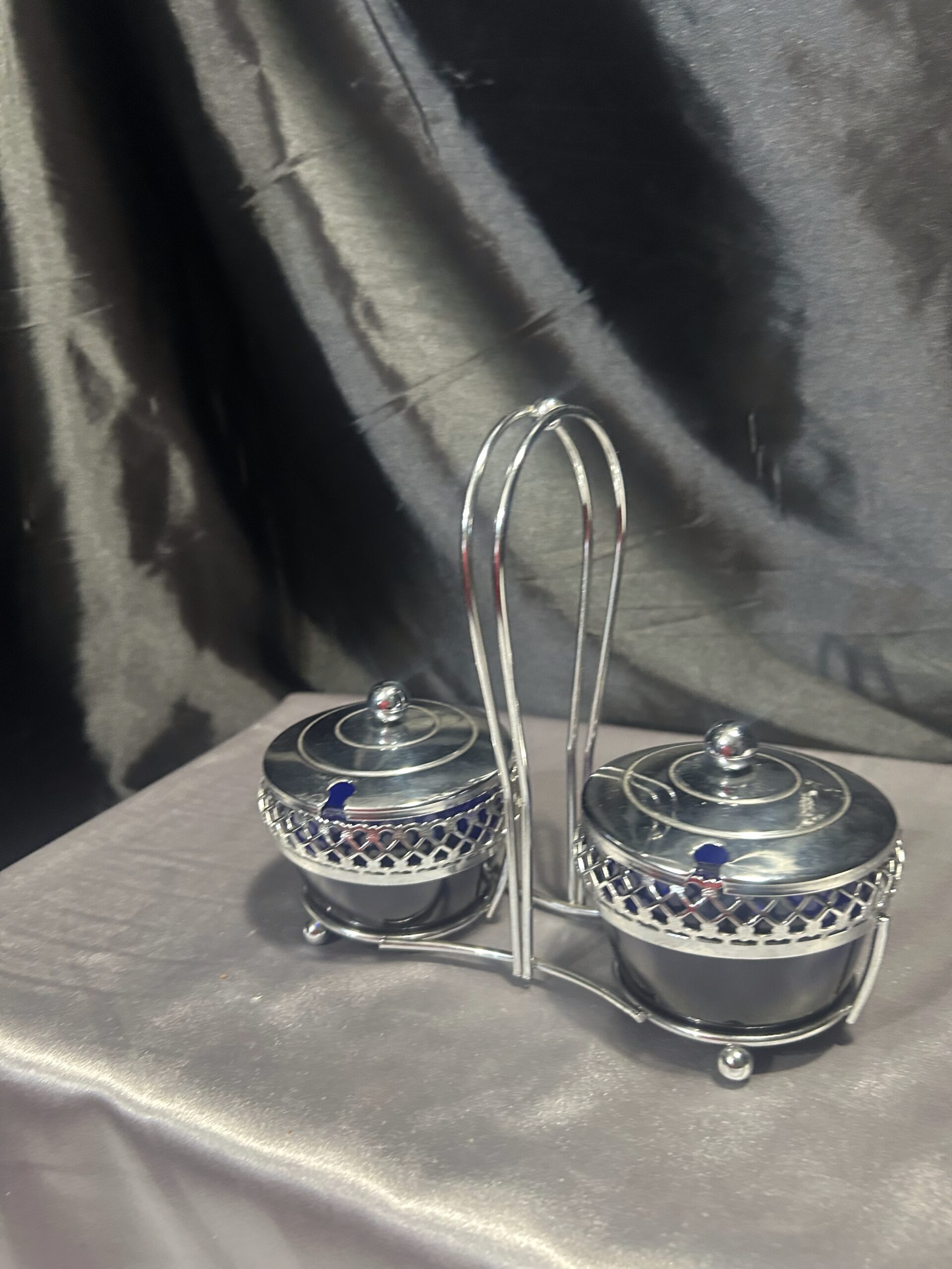Oferujemy elegancką podwójną cukiernicę – przyprawnik, wykonaną z pięknego chabrowego szkła i misternie zdobionego, ażurowego metalu. Obie komory posiadają stylowe pokrywki z wycięciem na łyżeczkę, co czyni je nie tylko efektownymi, ale i praktycznymi. Centralnie umieszczone ucho do trzymania zapewnia wygodę użytkowania, a całość prezentuje się niezwykle klasycznie i elegancko.