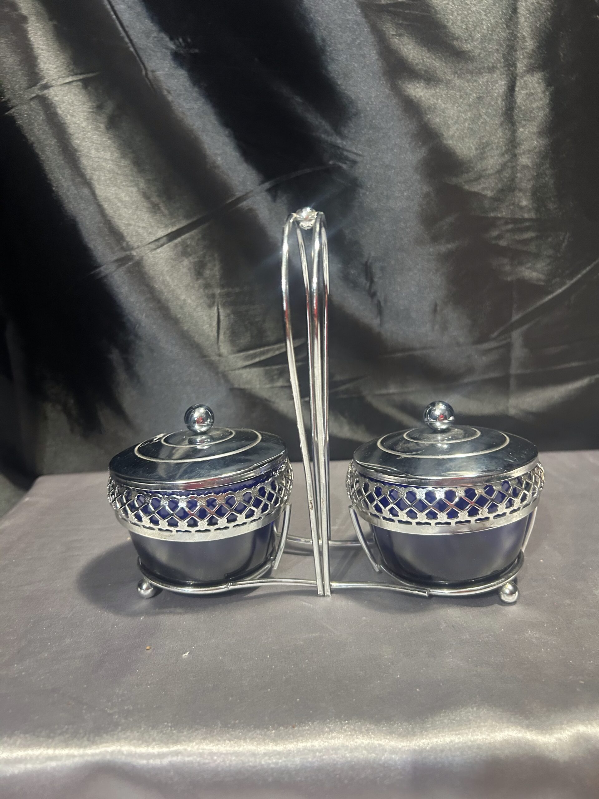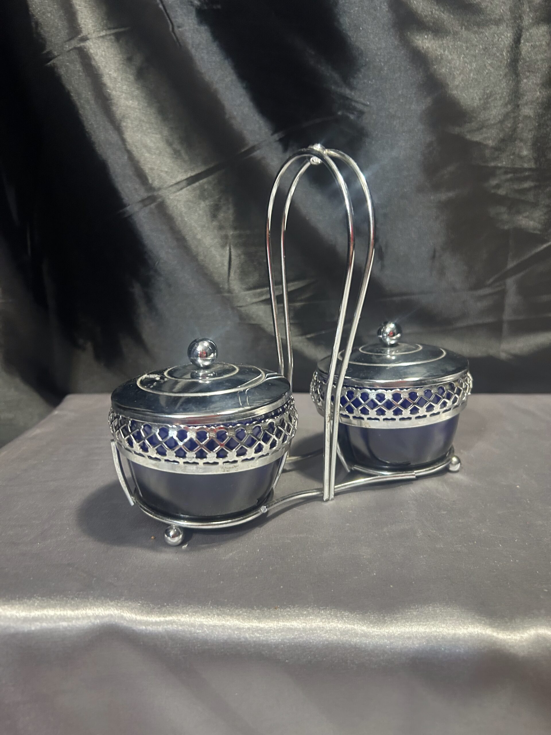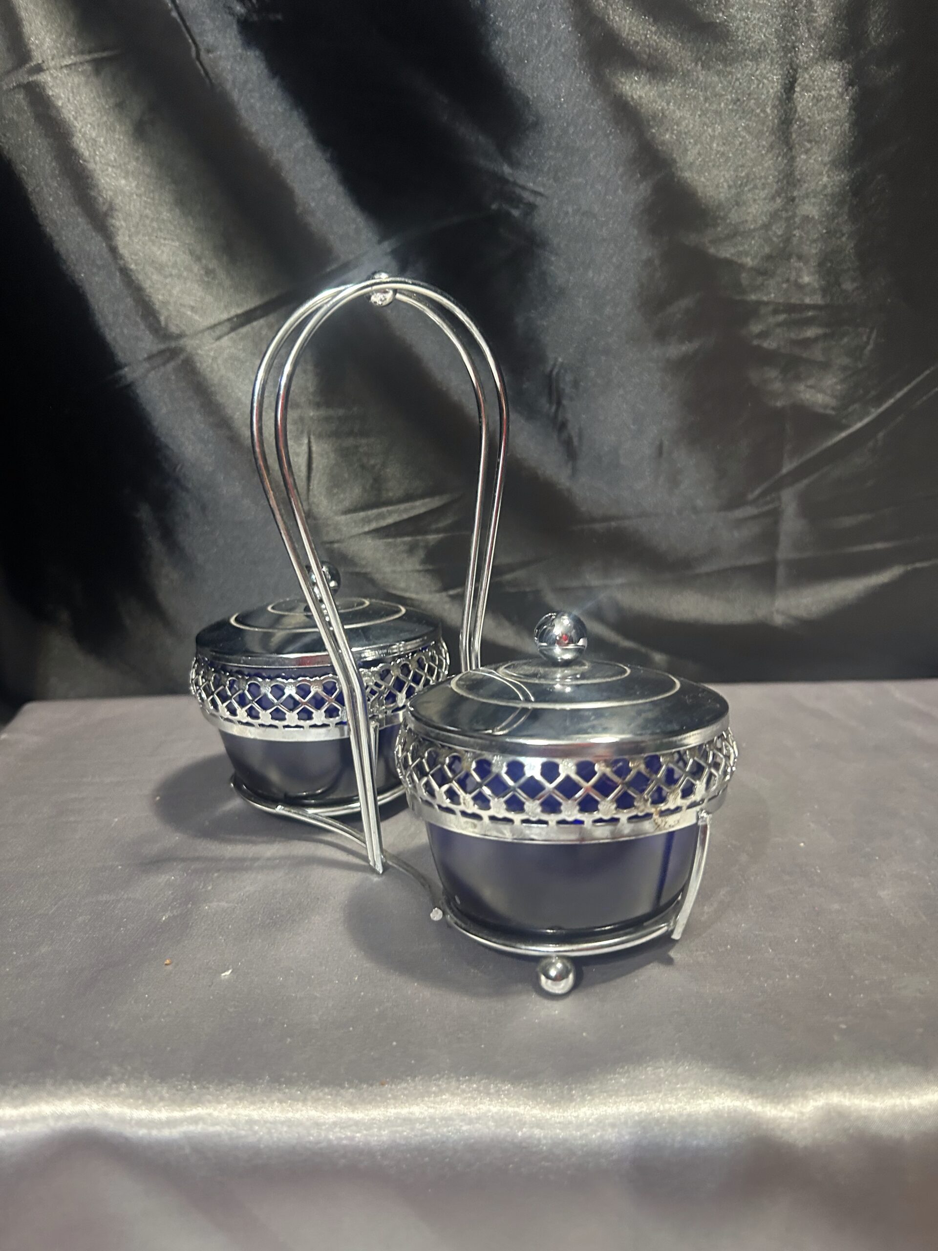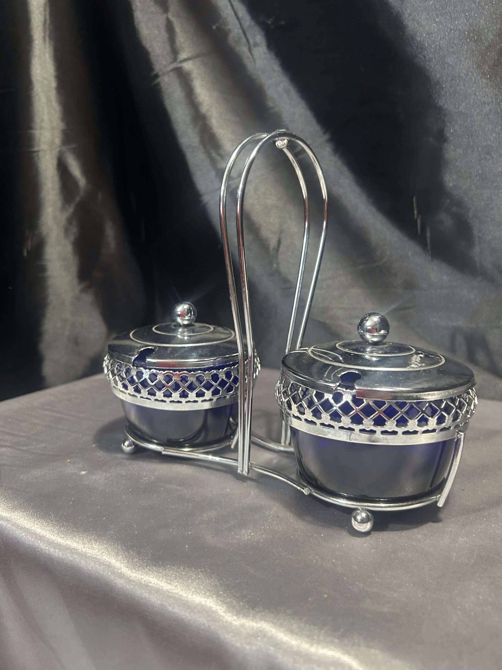 Podwójna Cukiernica – Przyprawnik z Chabrowego Szkła i Ażurowego Metalu, Z Pokrywkami i Uchem
