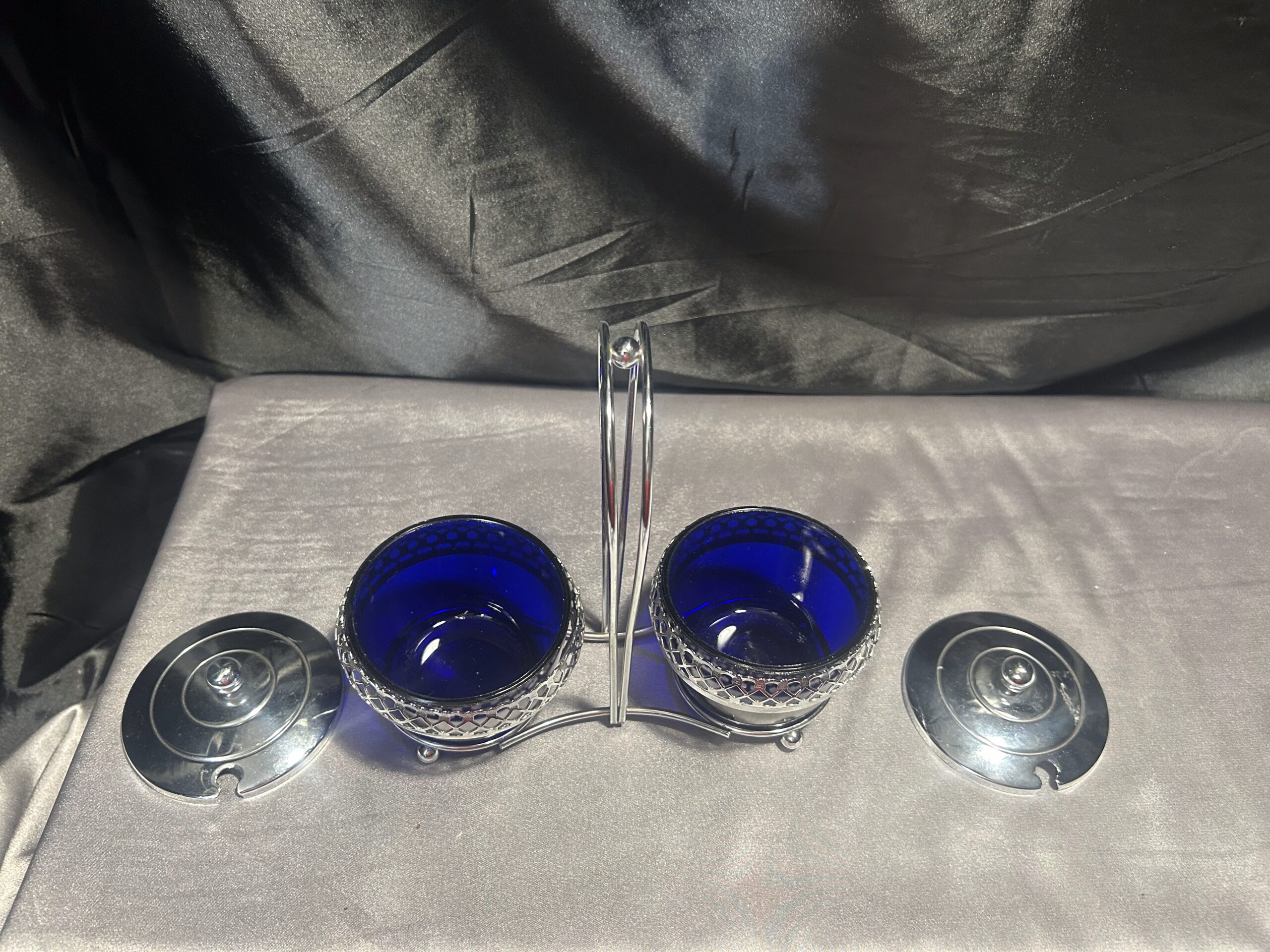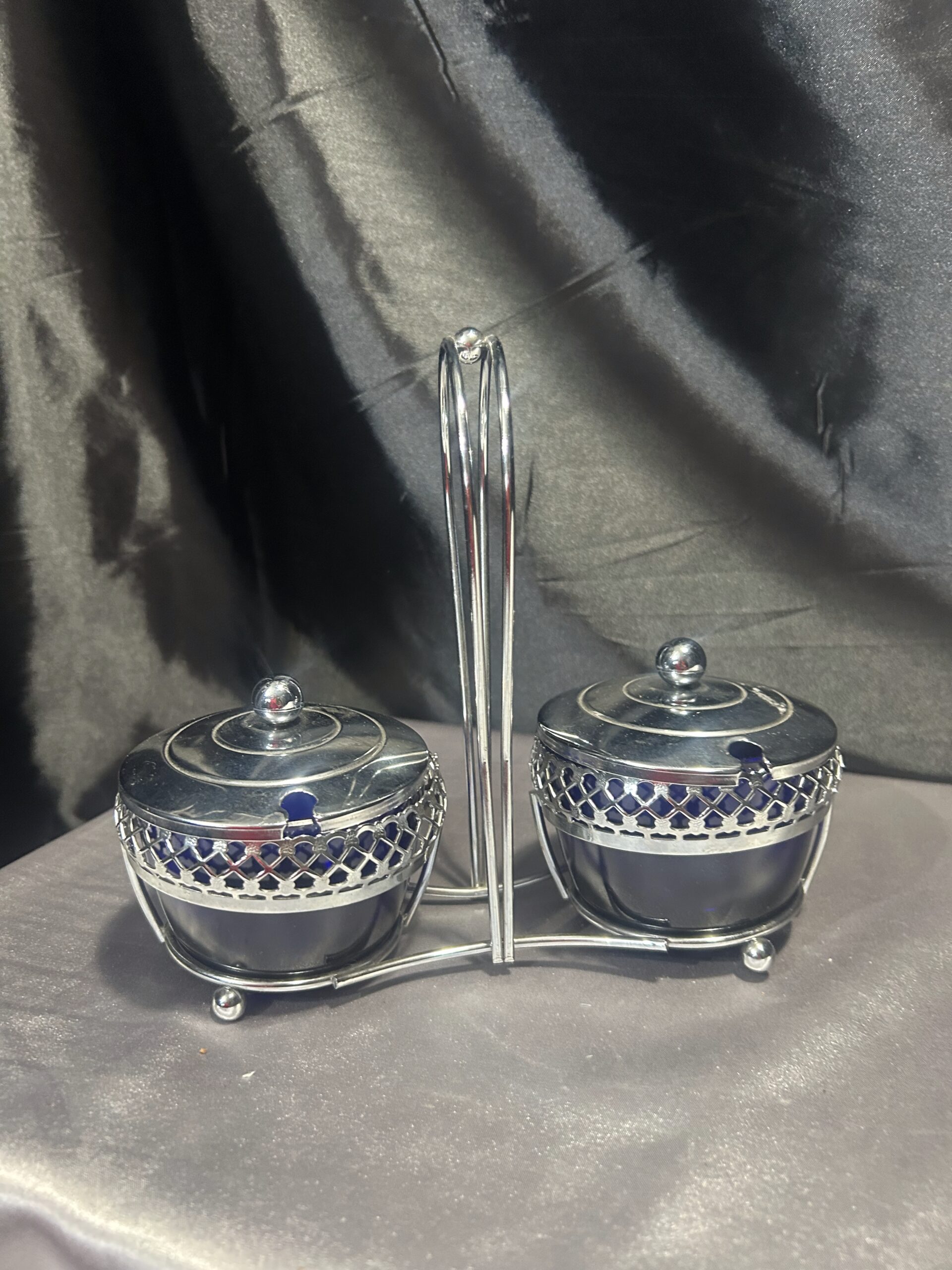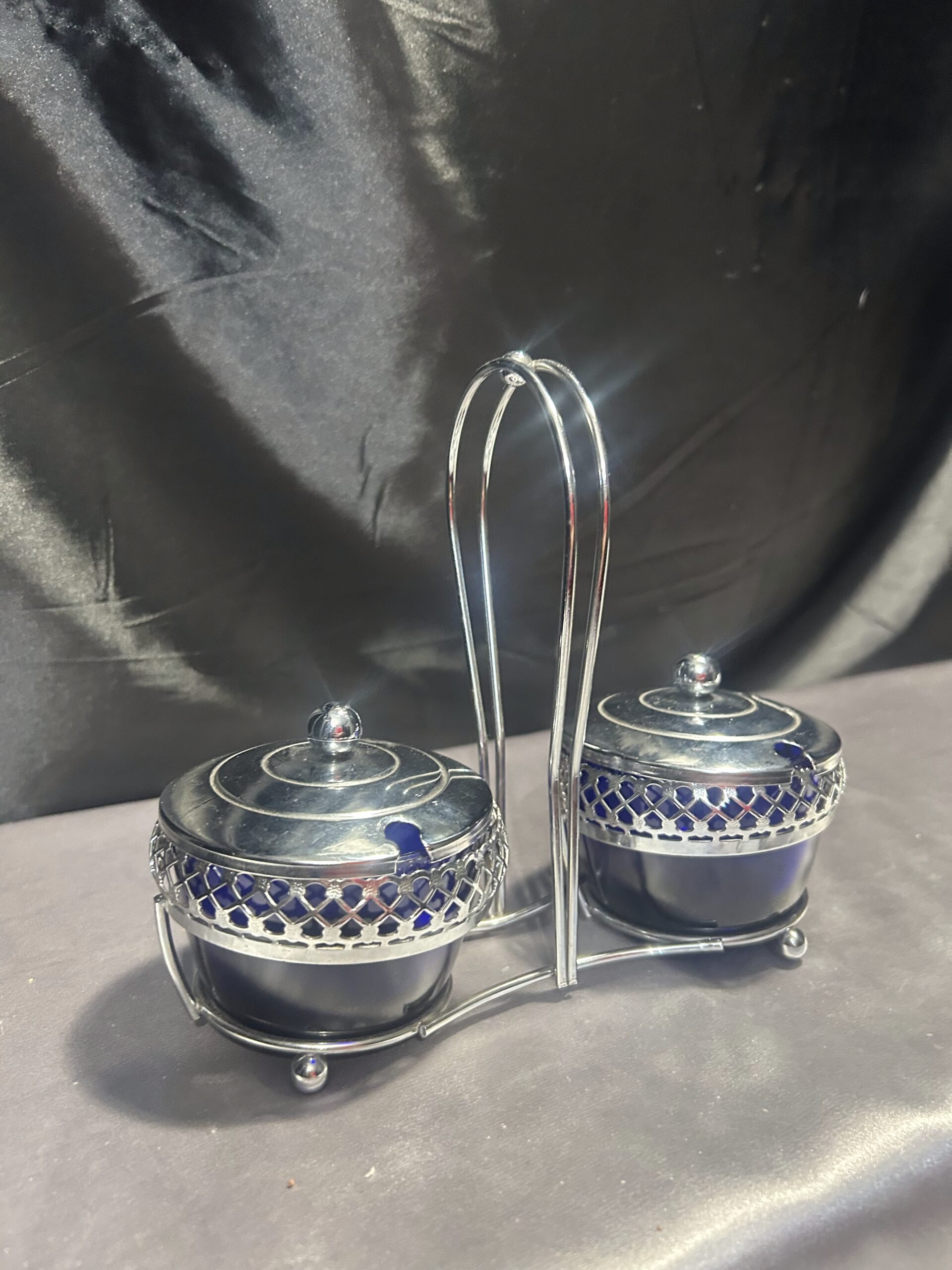 Podwójna Cukiernica – Przyprawnik z Chabrowego Szkła i Ażurowego Metalu, Z Pokrywkami i Uchem