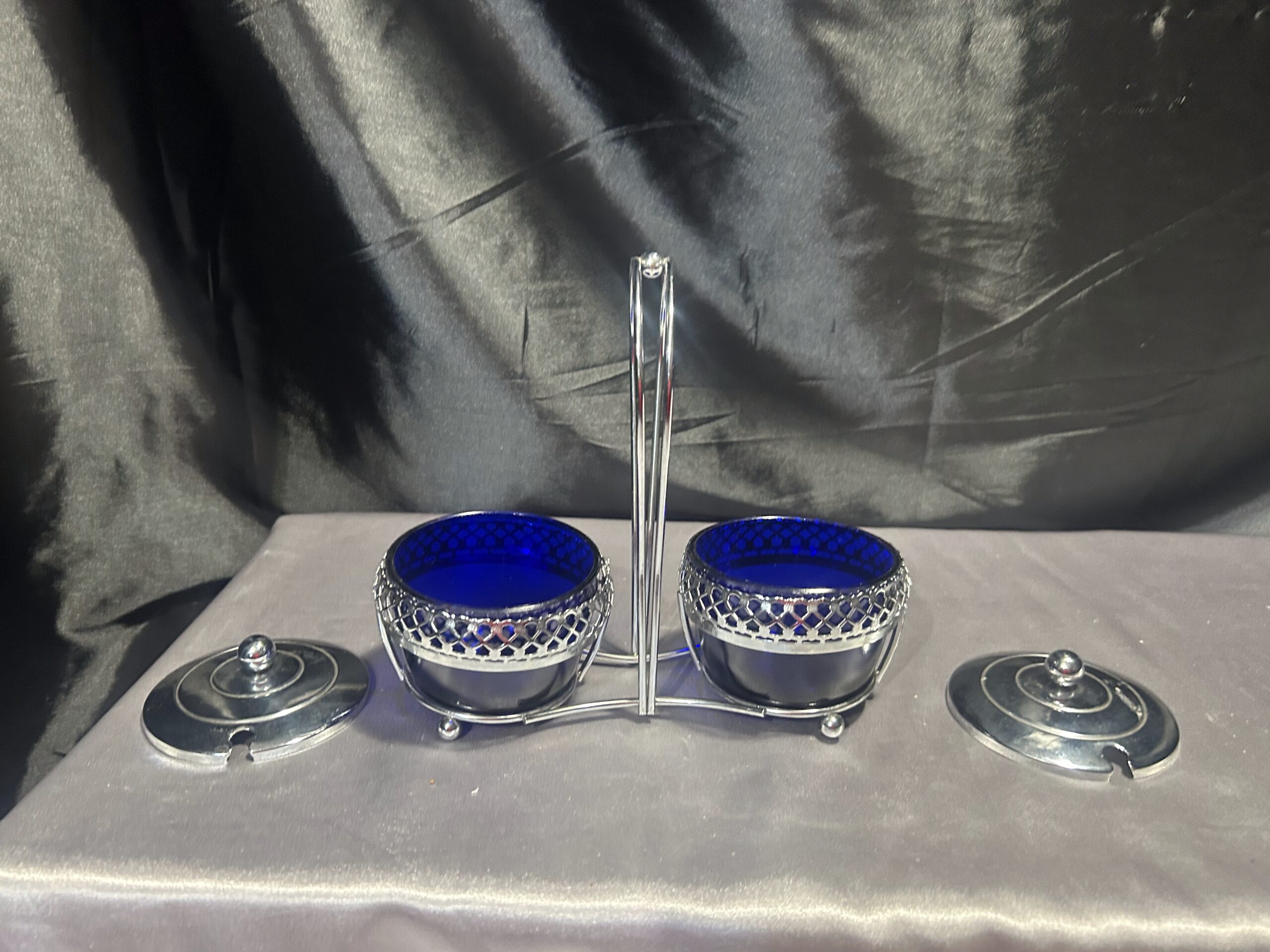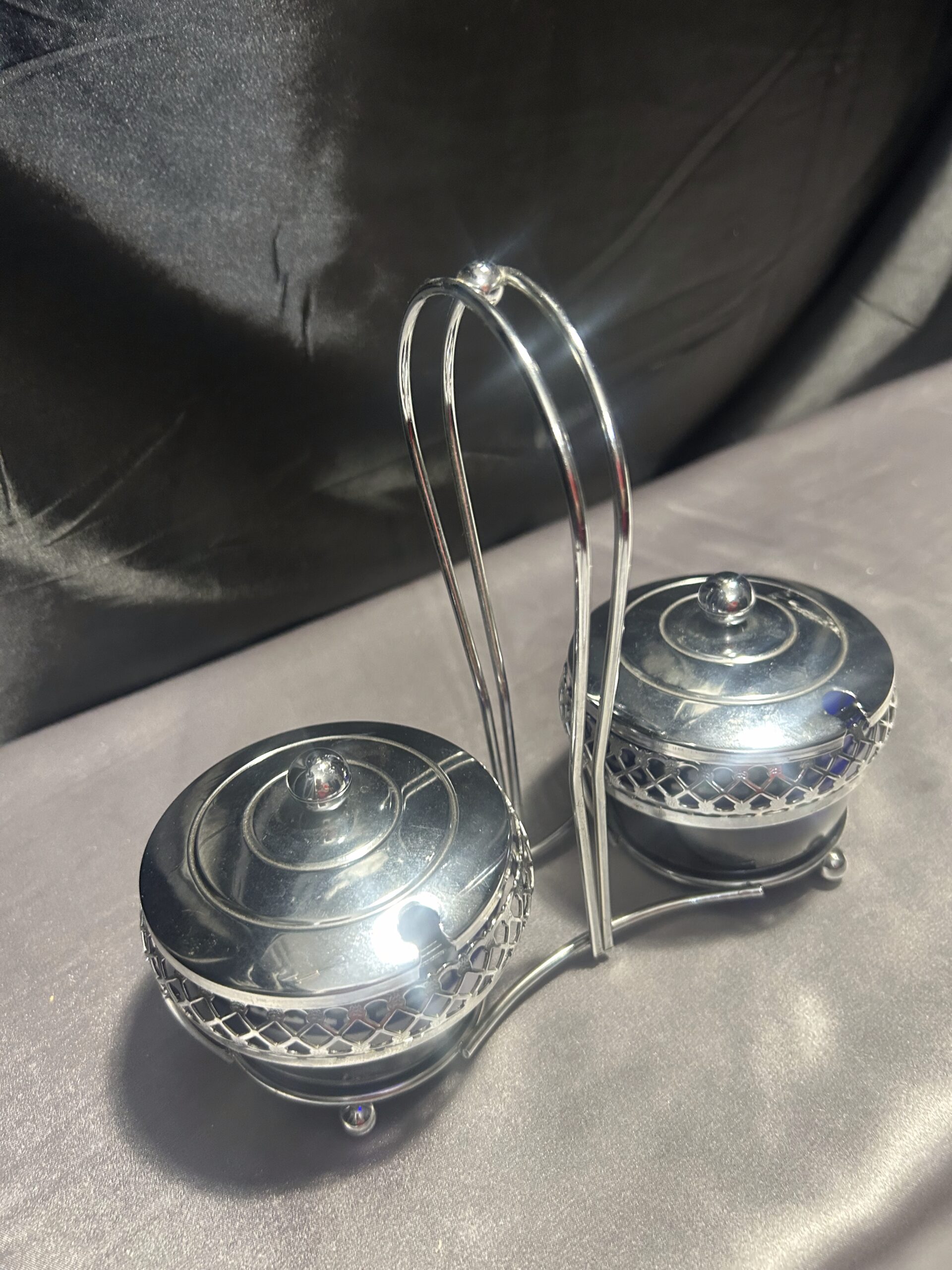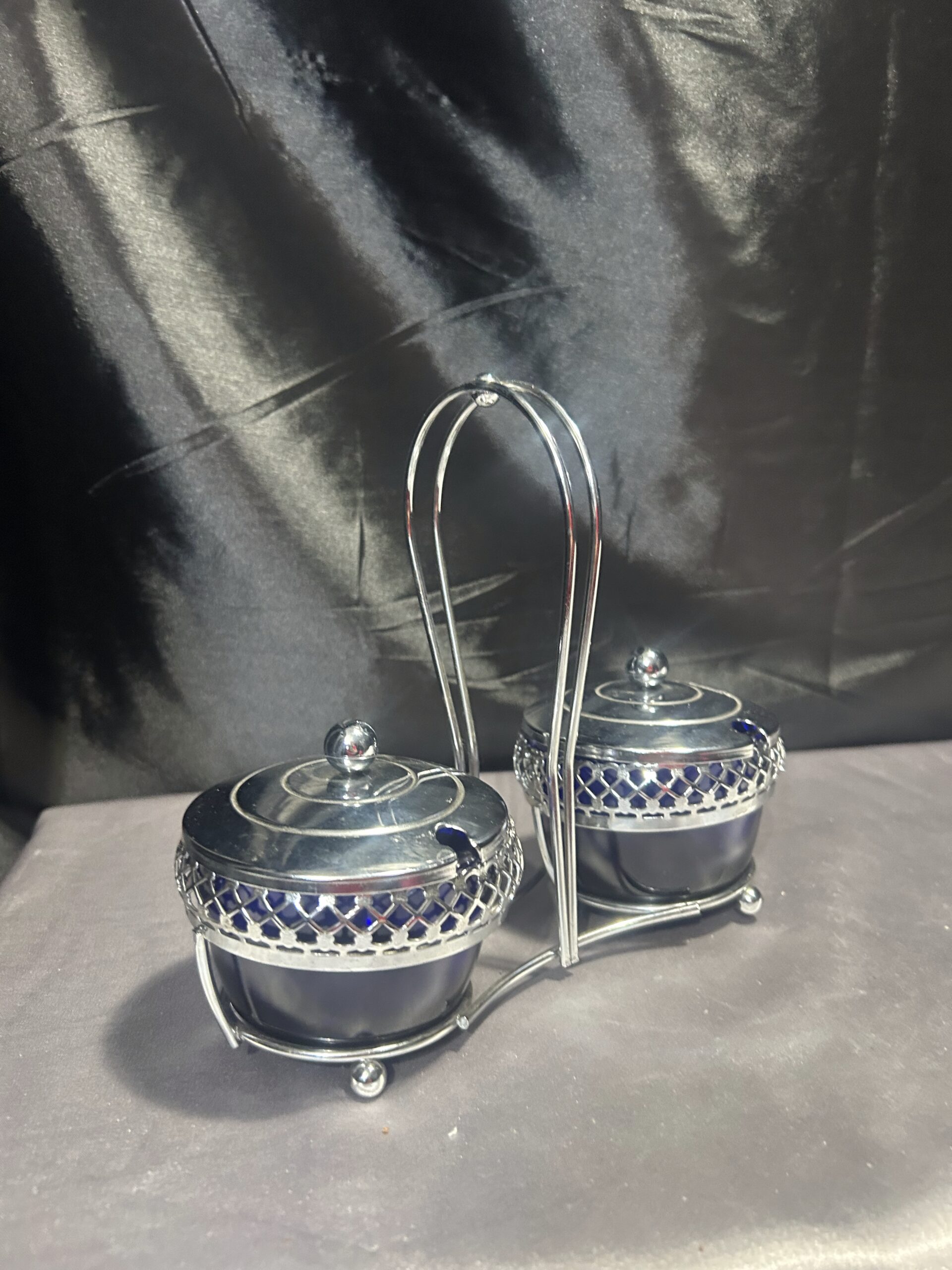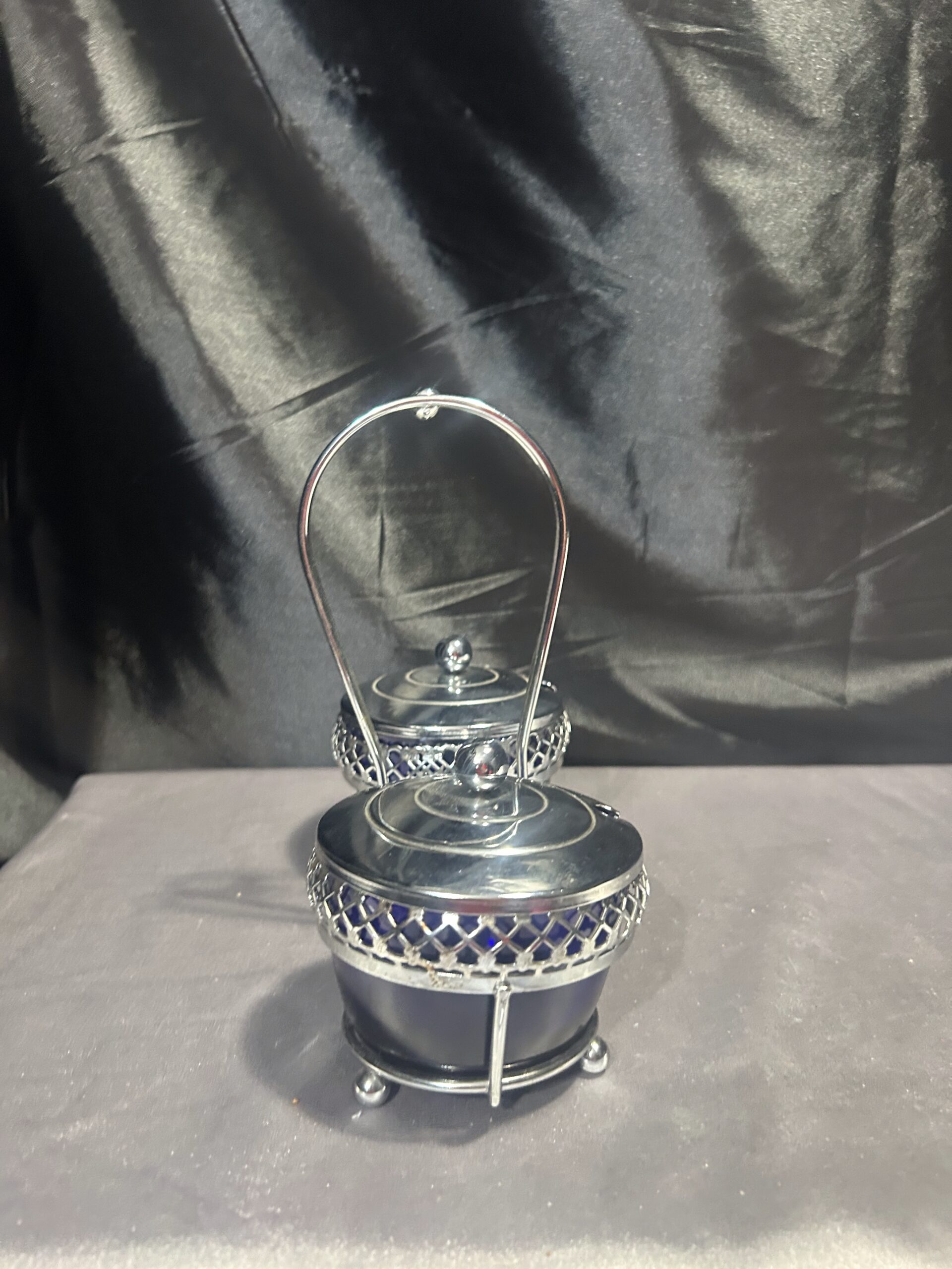 Podwójna Cukiernica – Przyprawnik z Chabrowego Szkła i Ażurowego Metalu, Z Pokrywkami i Uchem