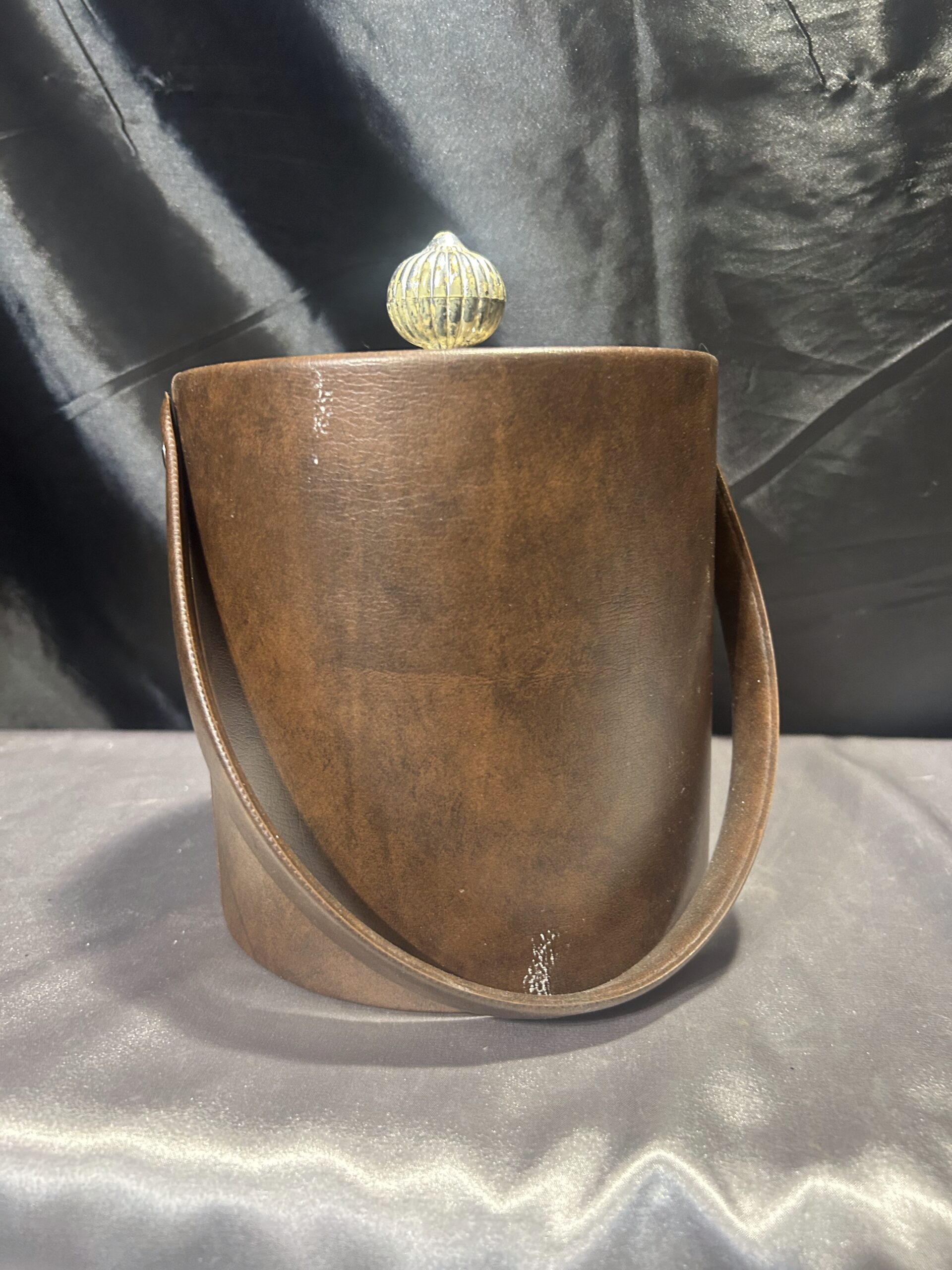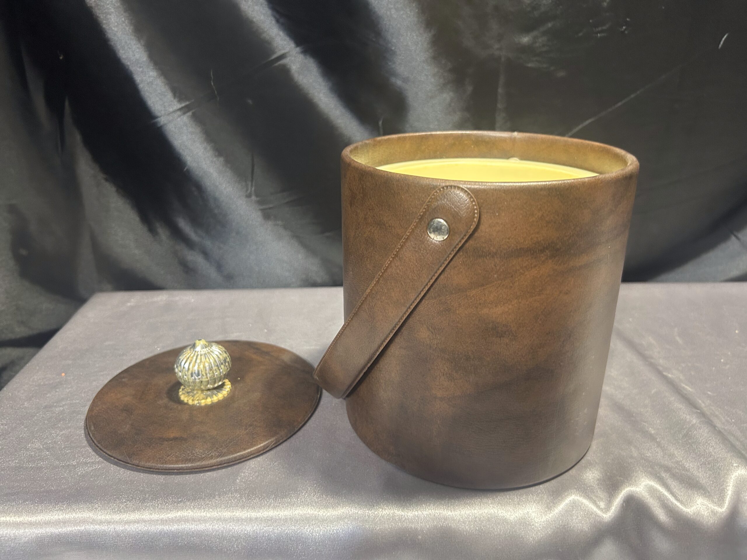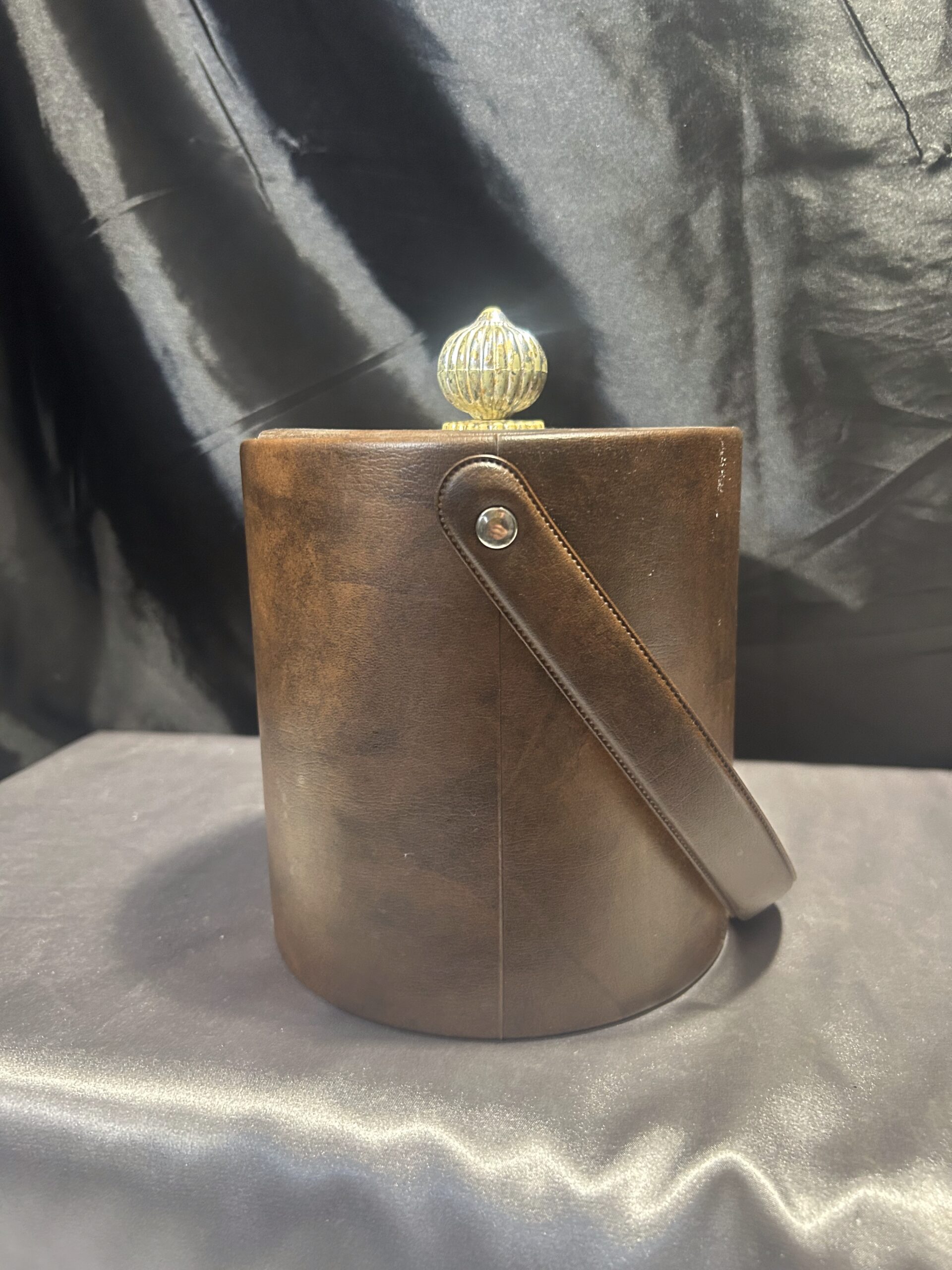 Prezentujemy stylowy pojemnik na lód, którego powierzchnia została pokryta materiałem przypominającym ekoskórę w eleganckim brązowym kolorze. Jego klasyczna forma i praktyczne ucho do noszenia sprawiają, że jest zarówno funkcjonalnym, jak i dekoracyjnym elementem wyposażenia.