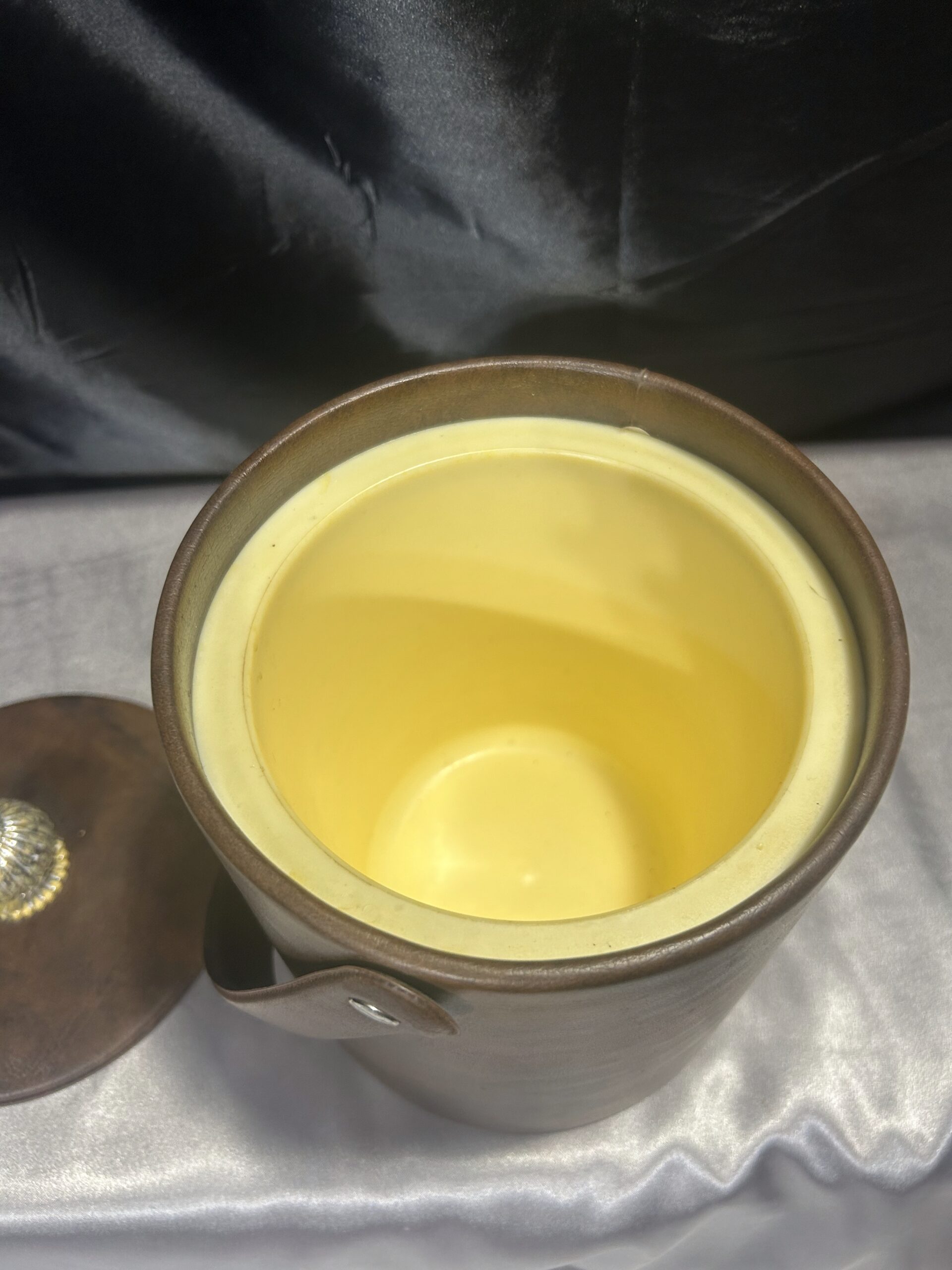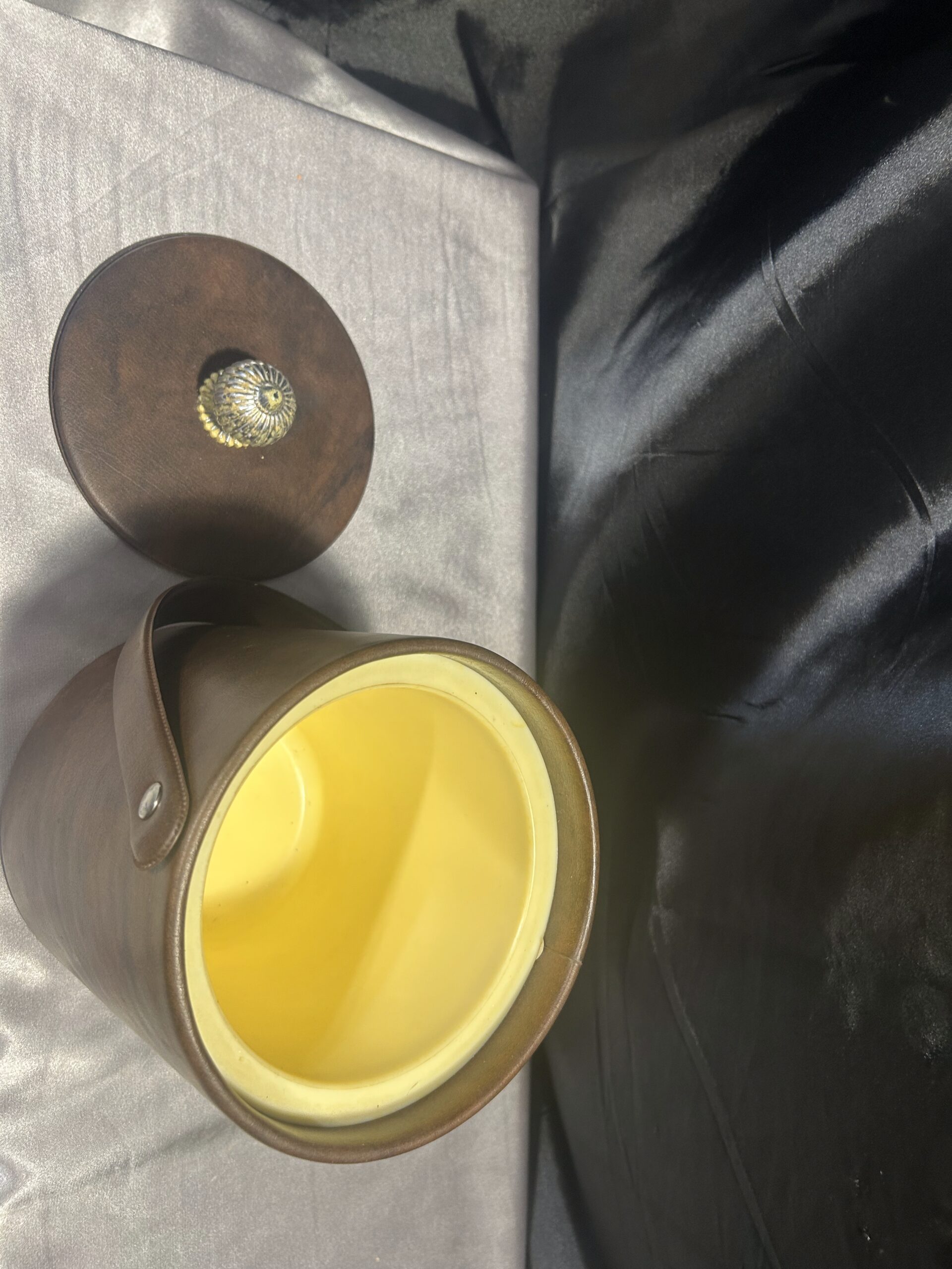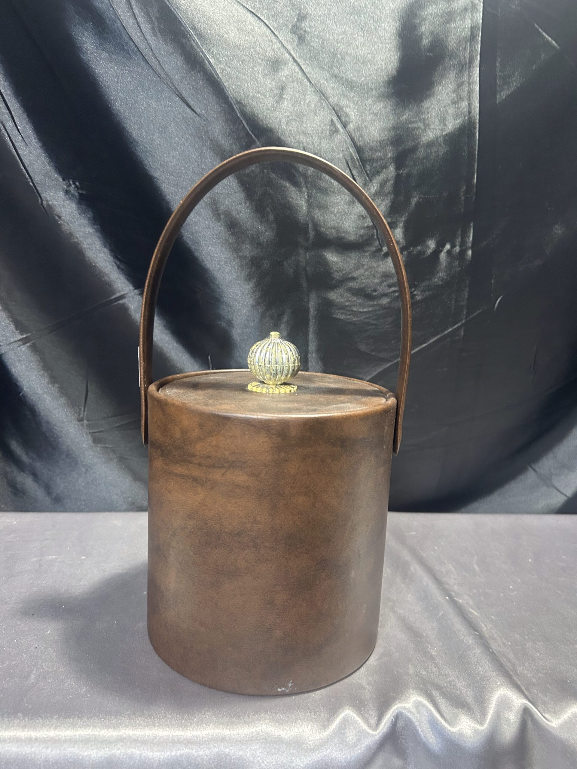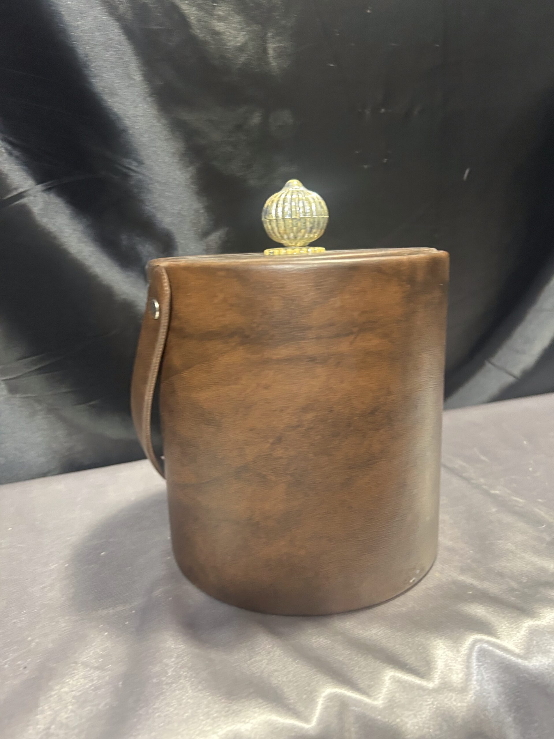 Prezentujemy stylowy pojemnik na lód, którego powierzchnia została pokryta materiałem przypominającym ekoskórę w eleganckim brązowym kolorze. Jego klasyczna forma i praktyczne ucho do noszenia sprawiają, że jest zarówno funkcjonalnym, jak i dekoracyjnym elementem wyposażenia.