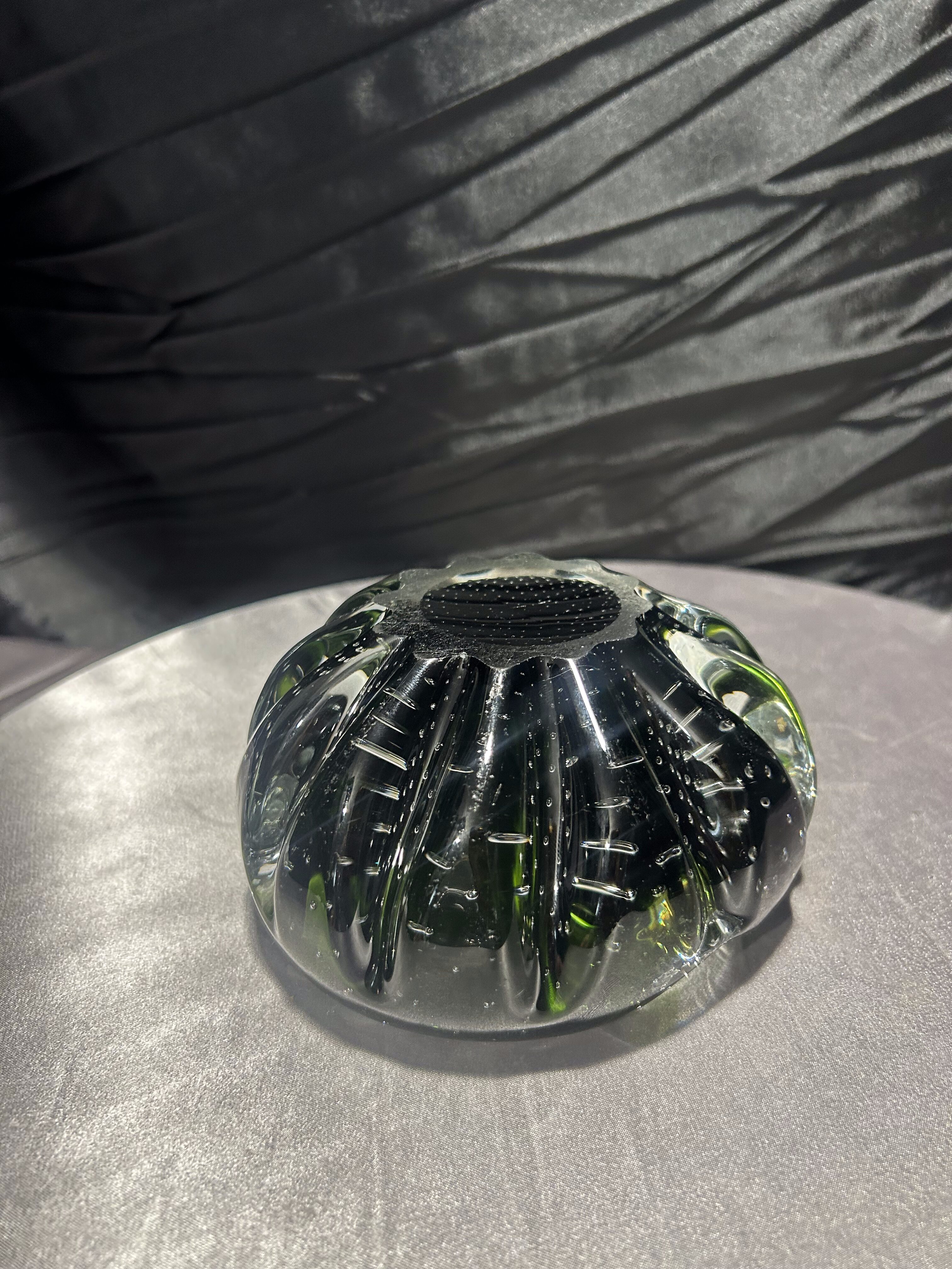 Oferuję wyjątkową popielniczkę wykonaną w słynnej włoskiej technice Murano. Szkło w odcieniu zieleni kryje w sobie misternie zatopione, regularne bąbelki powietrza – charakterystyczny efekt bullicante, który nadaje przedmiotowi głębi i lekkości optycznej.