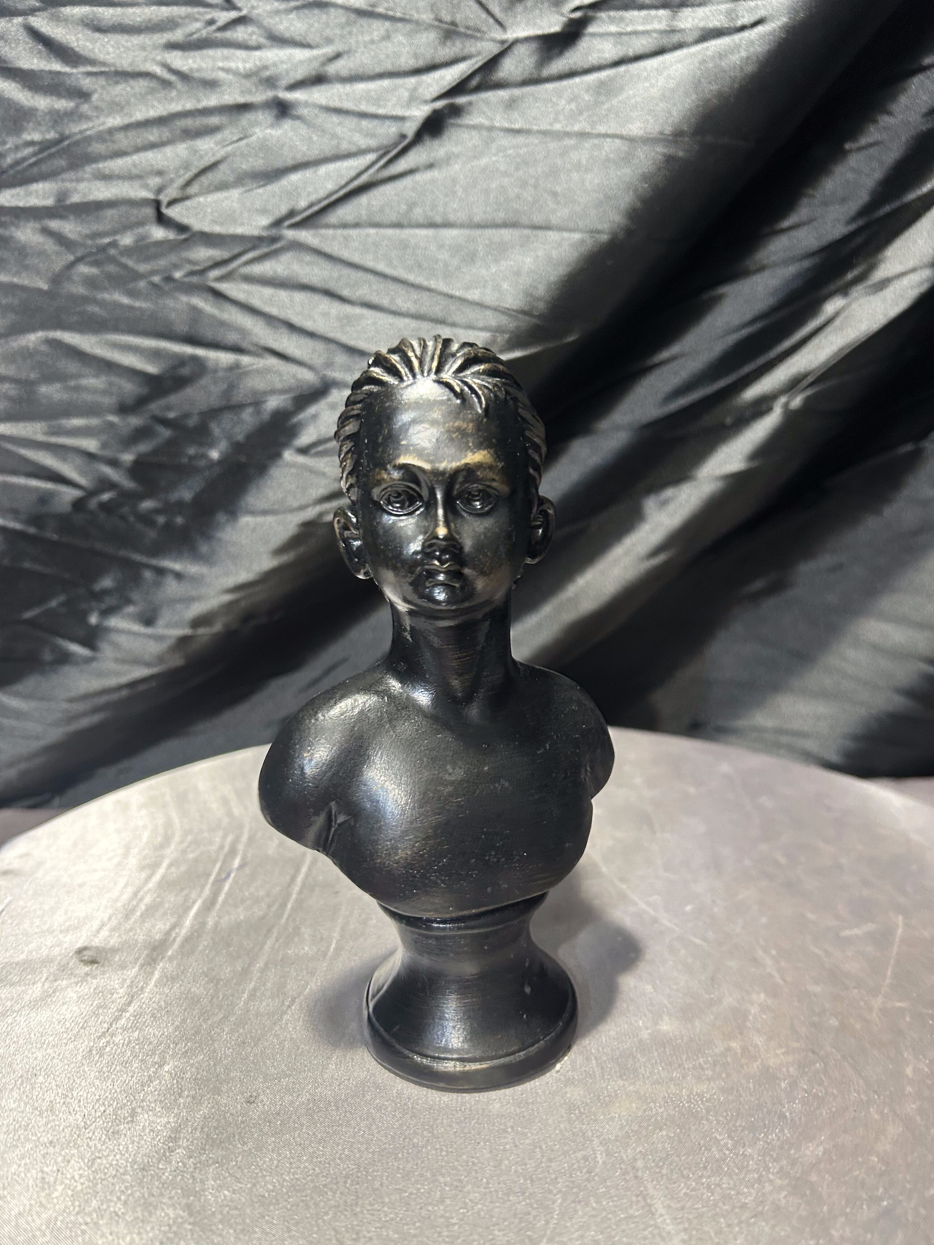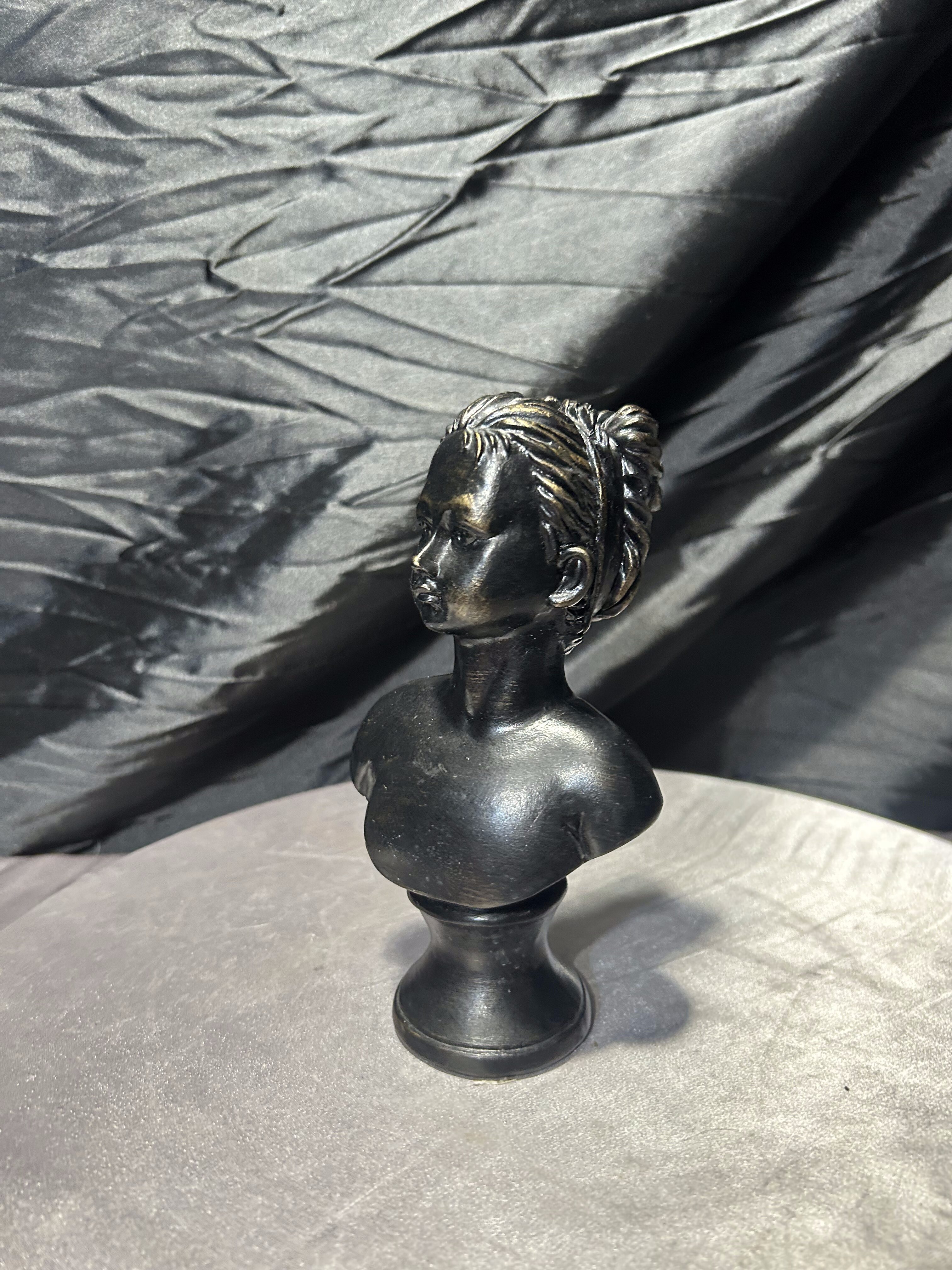 Dekoracyjne popiersie przedstawiające młodego mężczyznę, utrzymane w ciemnym, grafitowo-czarnym odcieniu z delikatnymi przetarciami podkreślającymi rzeźbiarskie detale twarzy. Wyrazista mimika, realistycznie oddane rysy oraz proporcjonalna forma nadają całości klasyczny, ponadczasowy charakter.
