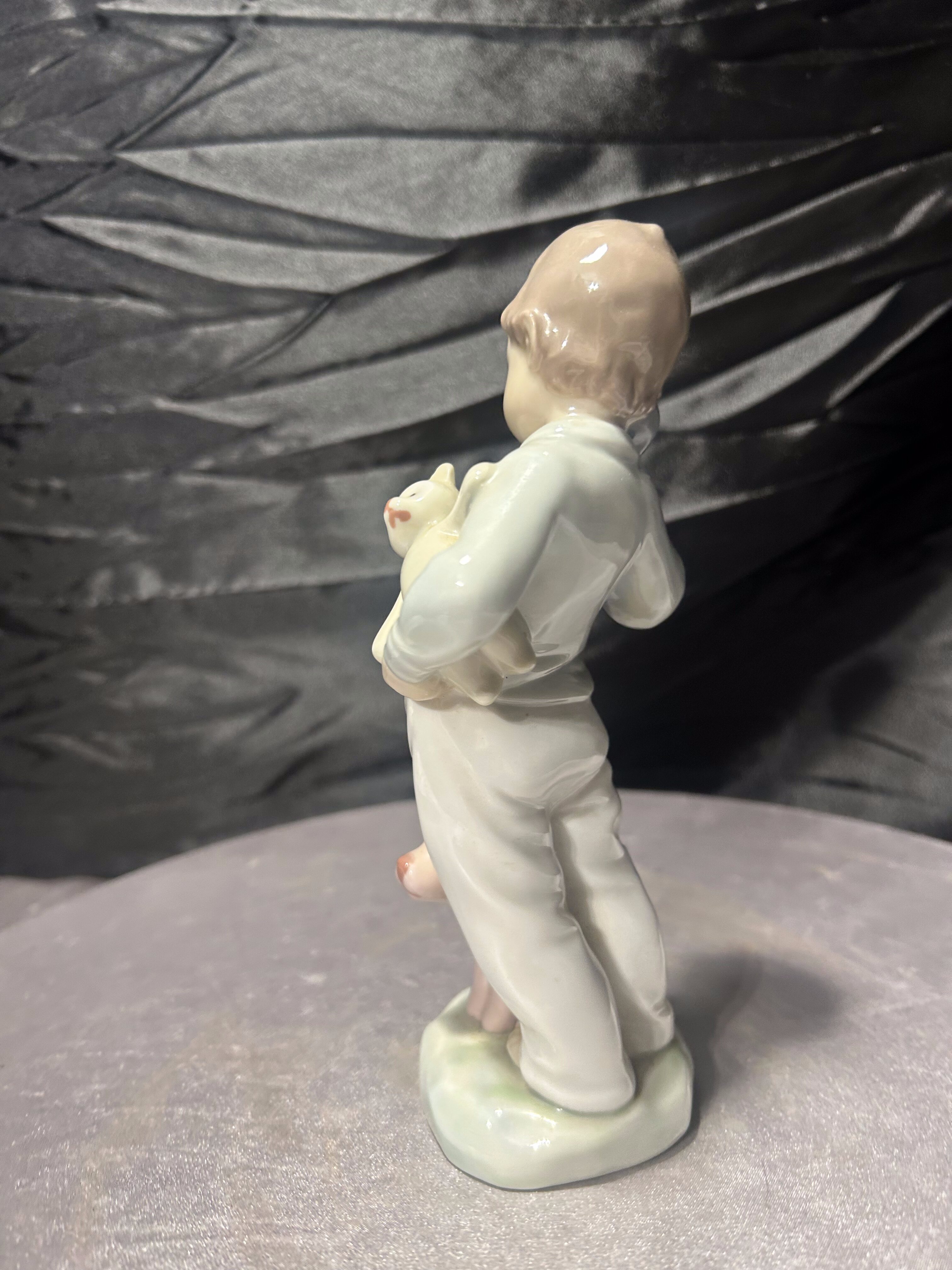 Oryginalna figurka porcelanowa hiszpańskiej marki Lladró, sygnowana „NAO by Lladró Daisa 1987”. Przedstawia chłopca trzymającego misia i telefon, z pieskiem u nóg. Figurki tej marki są znane z wysokiej jakości materiału, delikatnego malowania i ręcznego wykonania, co czyni je cenionymi elementami kolekcji porcelany dekoracyjnej.