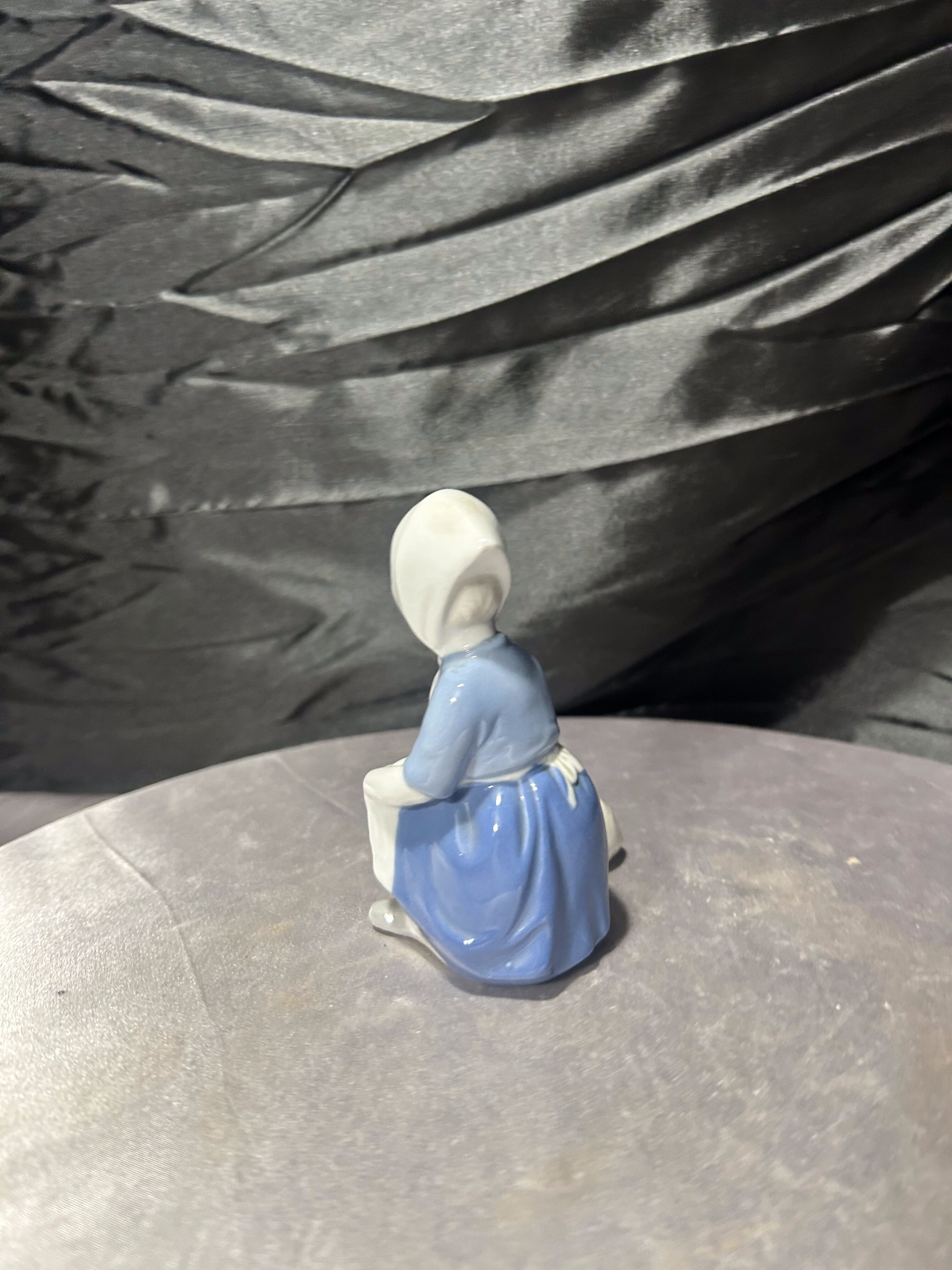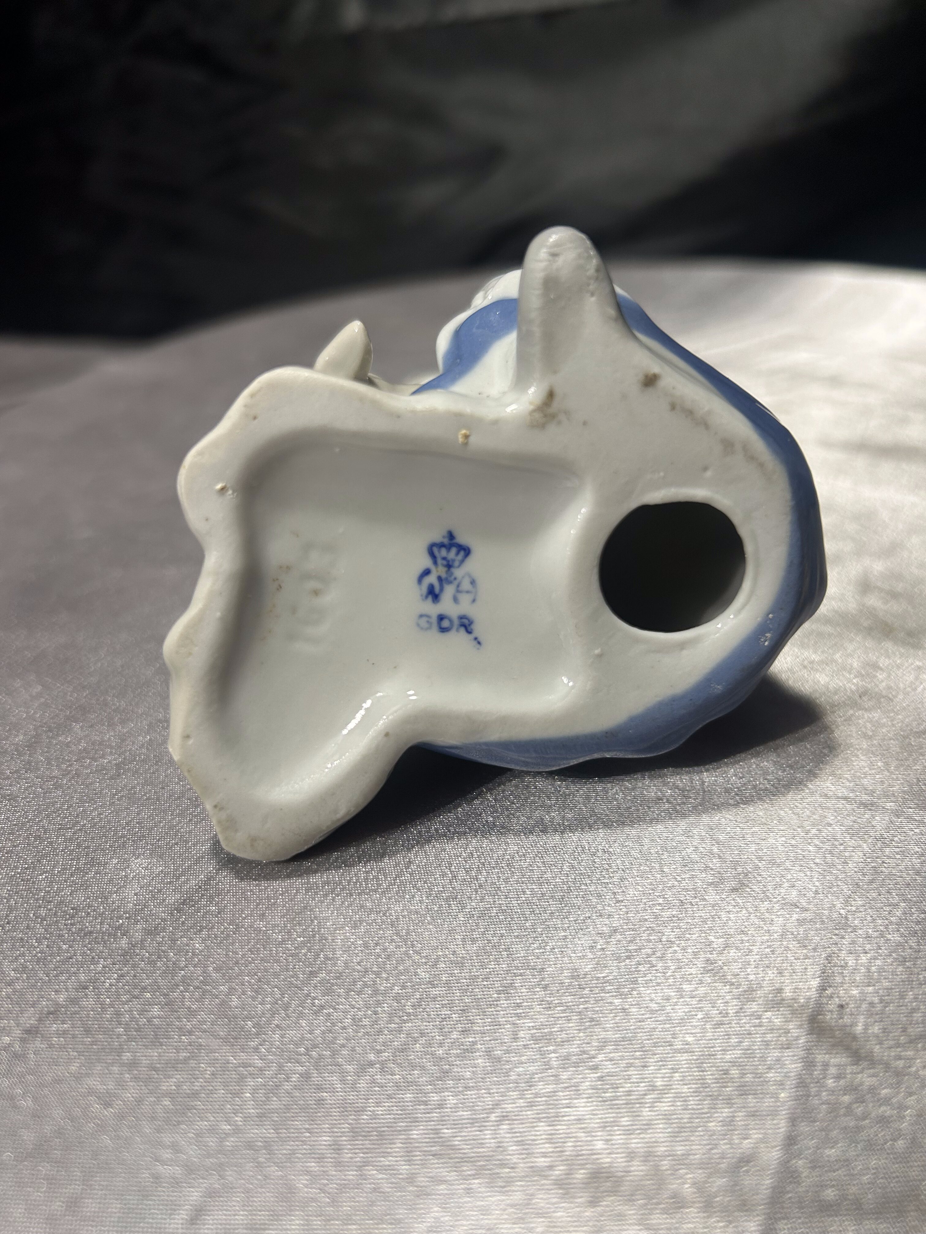 Na spodzie figurki znajduje się niebieska sygnatura z oznaczeniem GDR (German Democratic Republic), stosowanym w okresie istnienia Niemieckiej Republiki Demokratycznej, czyli przed 1990 rokiem. Tego typu oznaczenia były charakterystyczne dla wyrobów porcelanowych produkowanych w państwowych manufakturach porcelany w dawnej NRD. Sygnatura potwierdza pochodzenie figurki oraz jej autentyczność jako wyrobu niemieckiej porcelany z epoki.