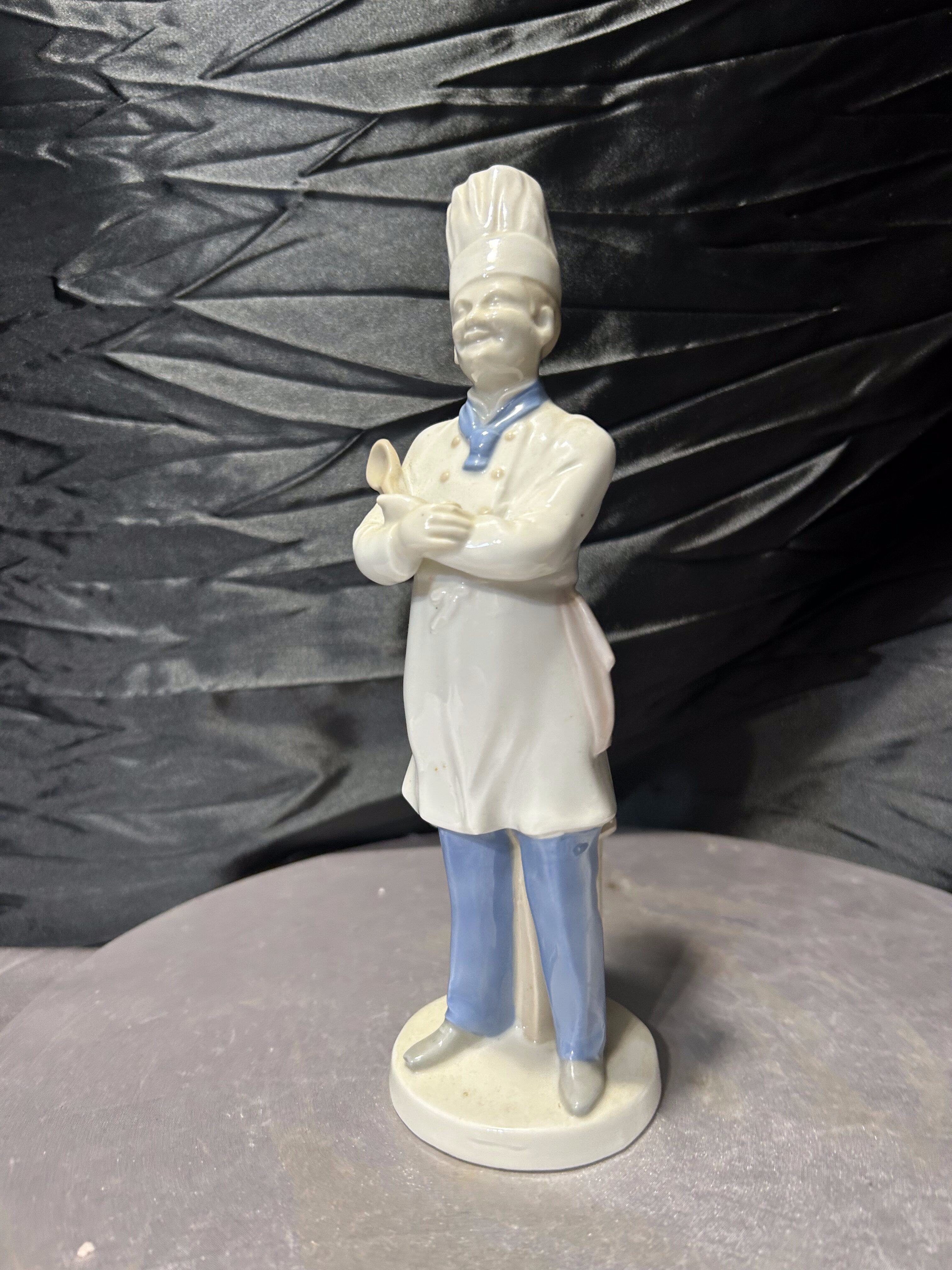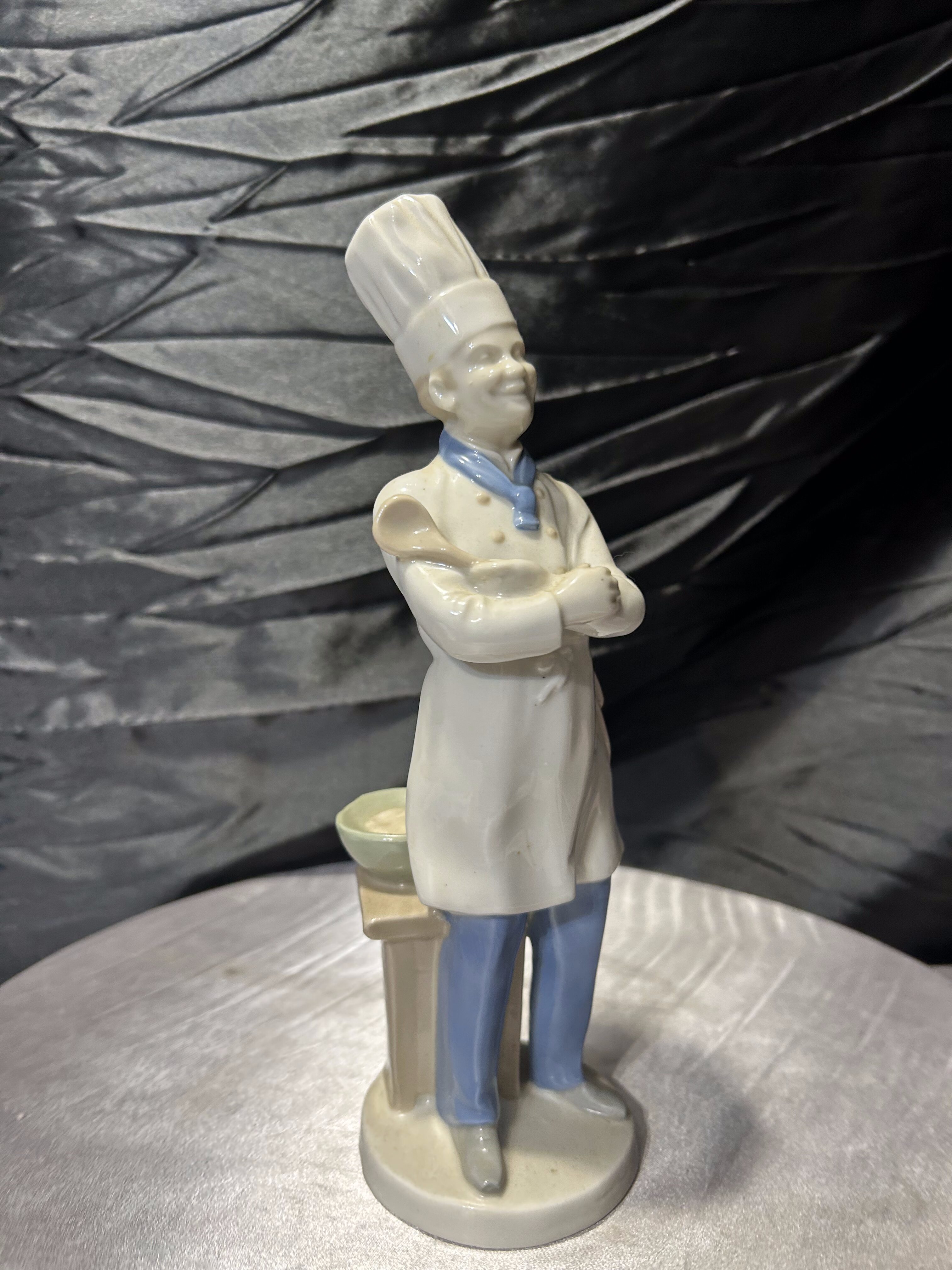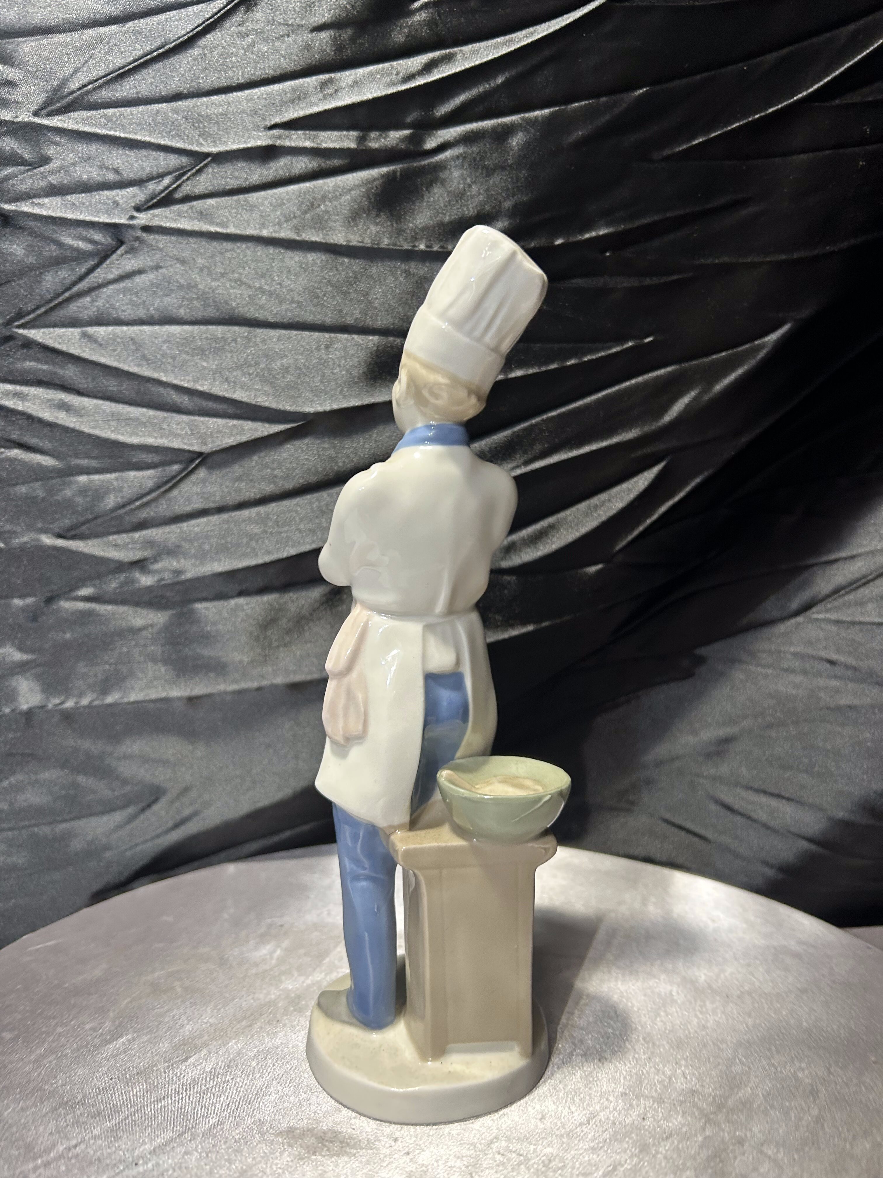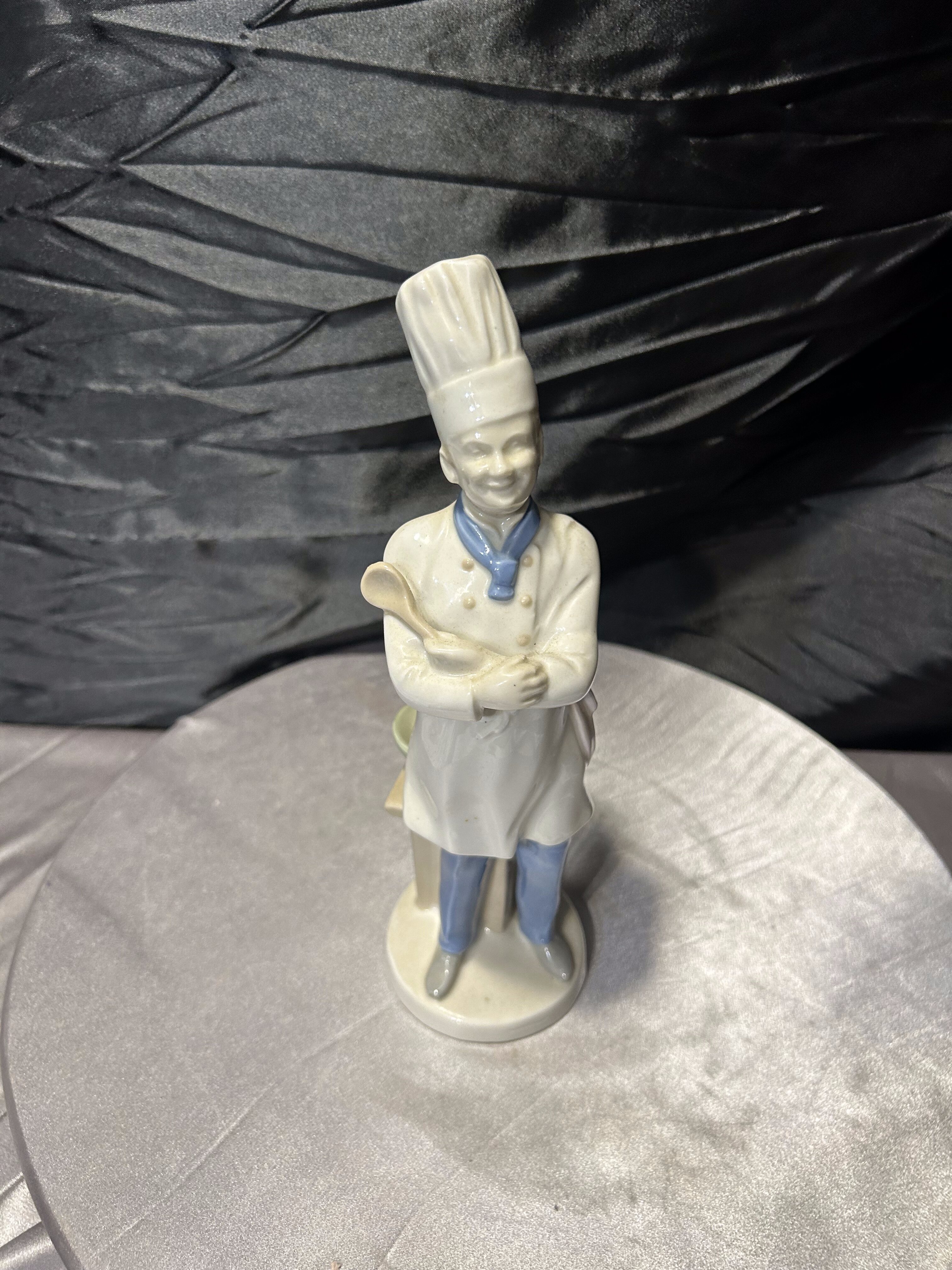Porcelanowa figurka przedstawiająca kucharza w tradycyjnym stroju gastronomicznym z wysoką czapką oraz łyżką kuchenną. Postać została wykonana z dużą dbałością o detale – widoczne są elementy stroju, guziki, chusta pod szyją oraz charakterystyczna czapka szefa kuchni.