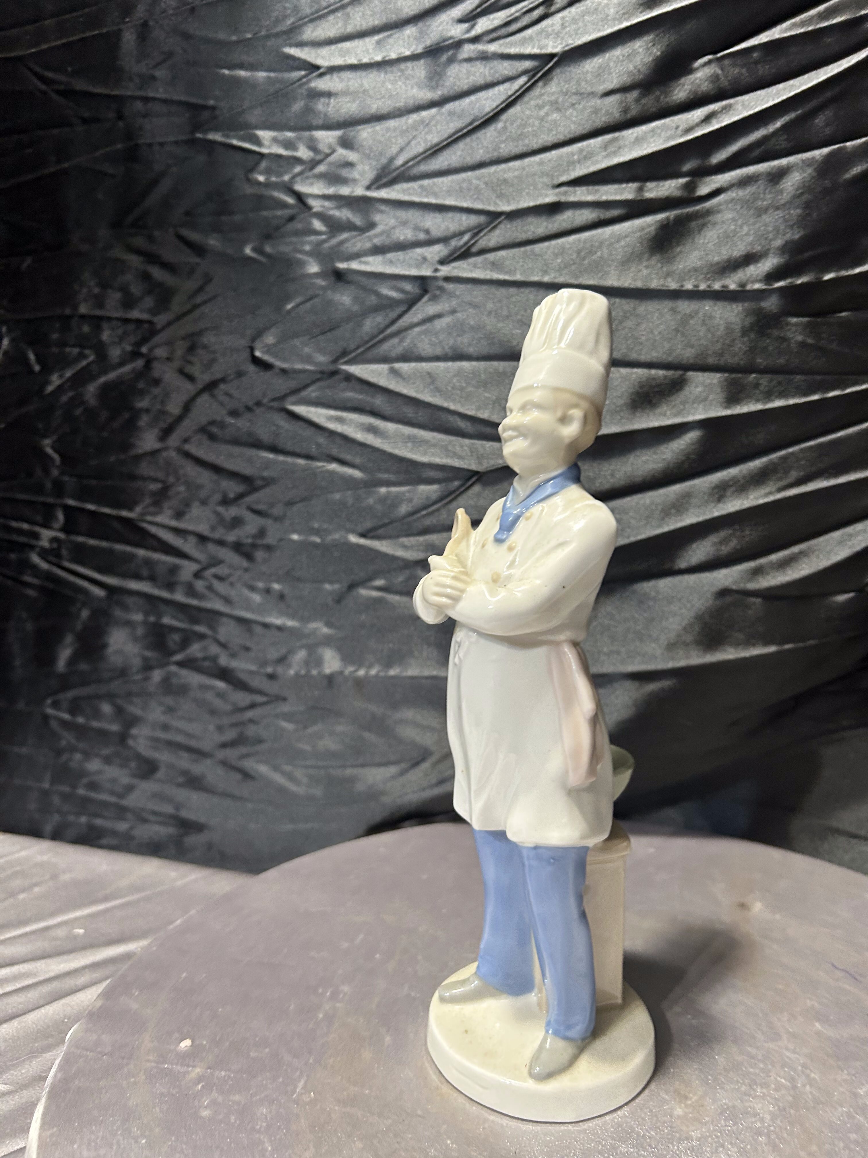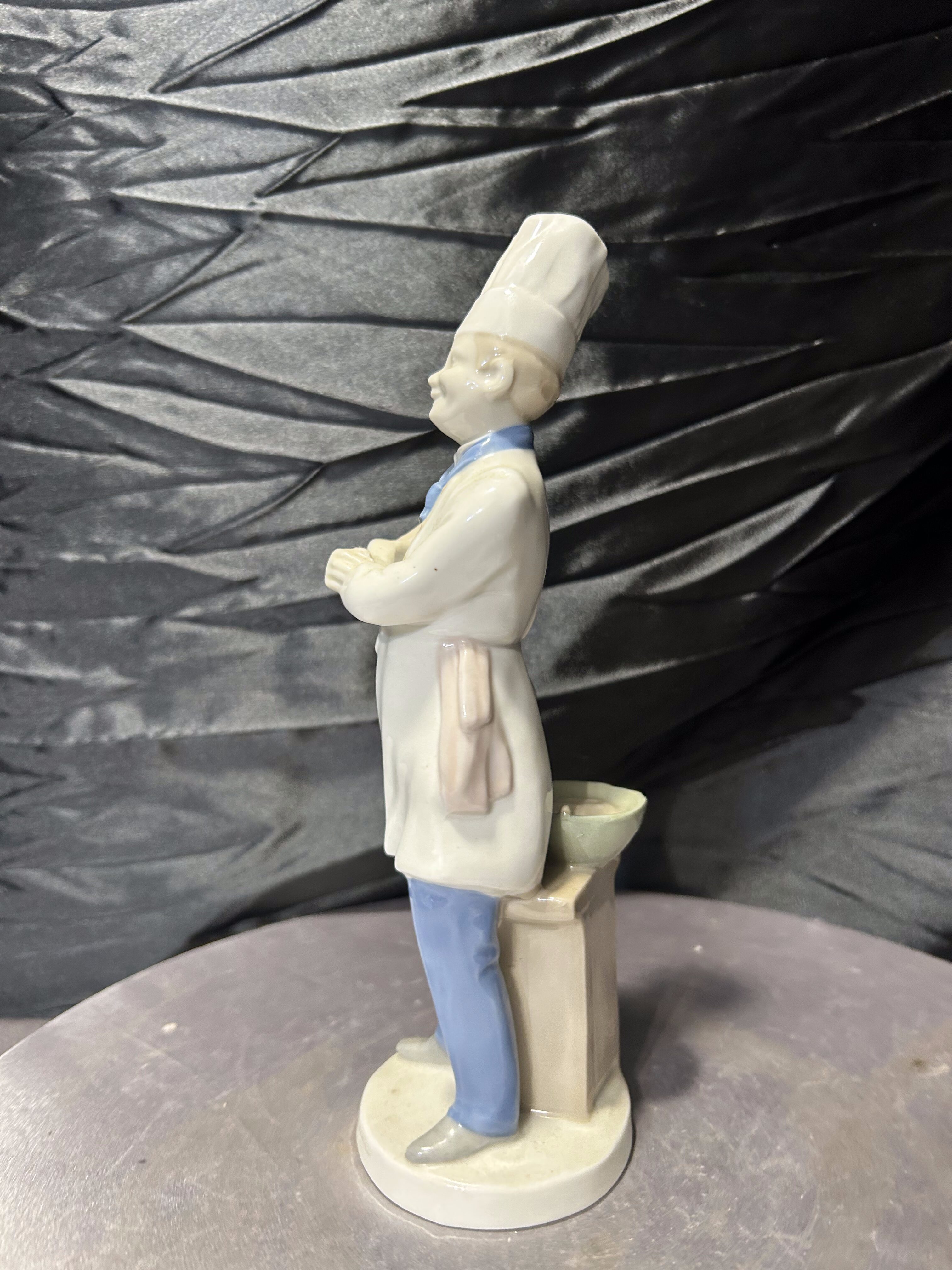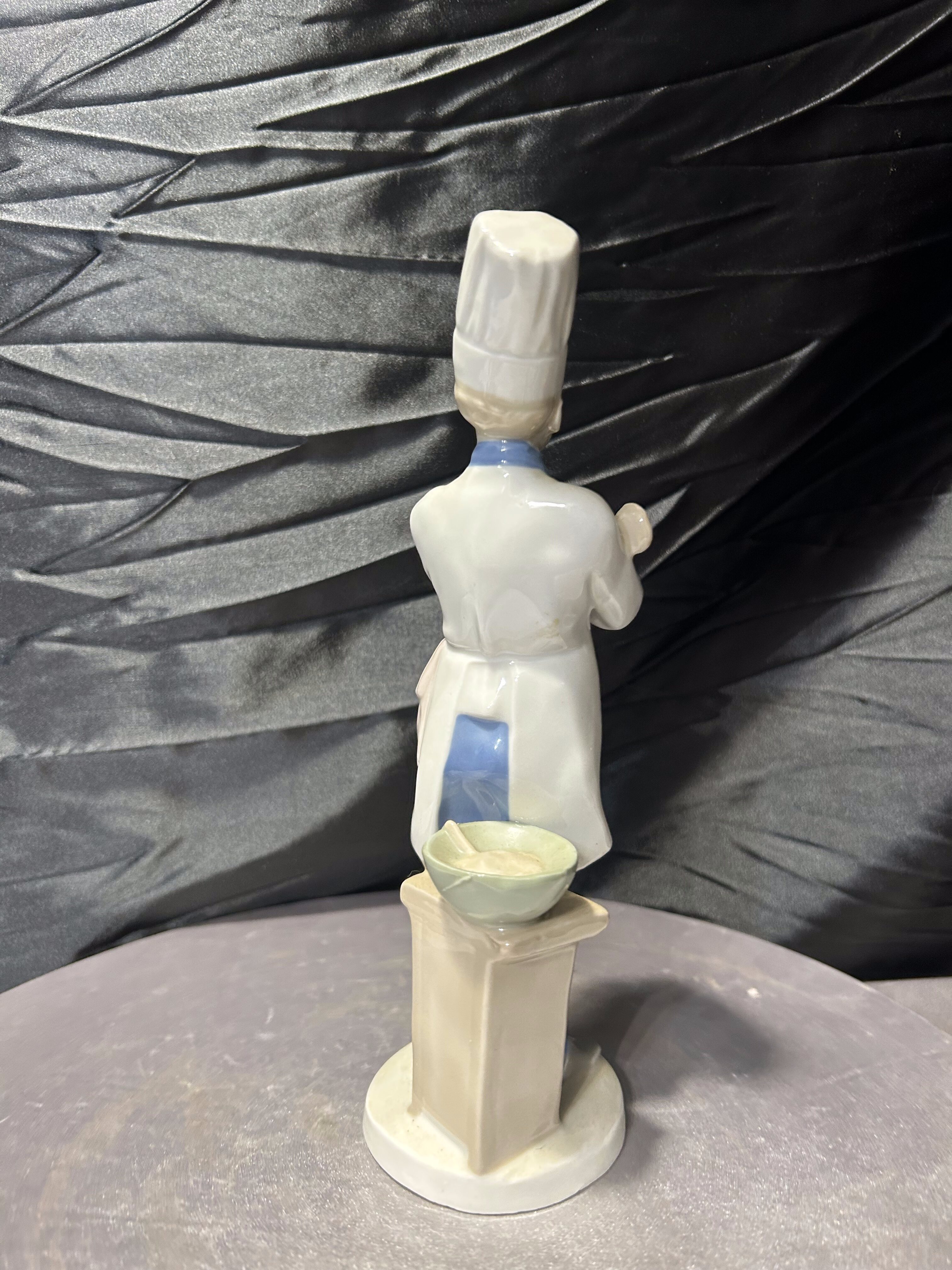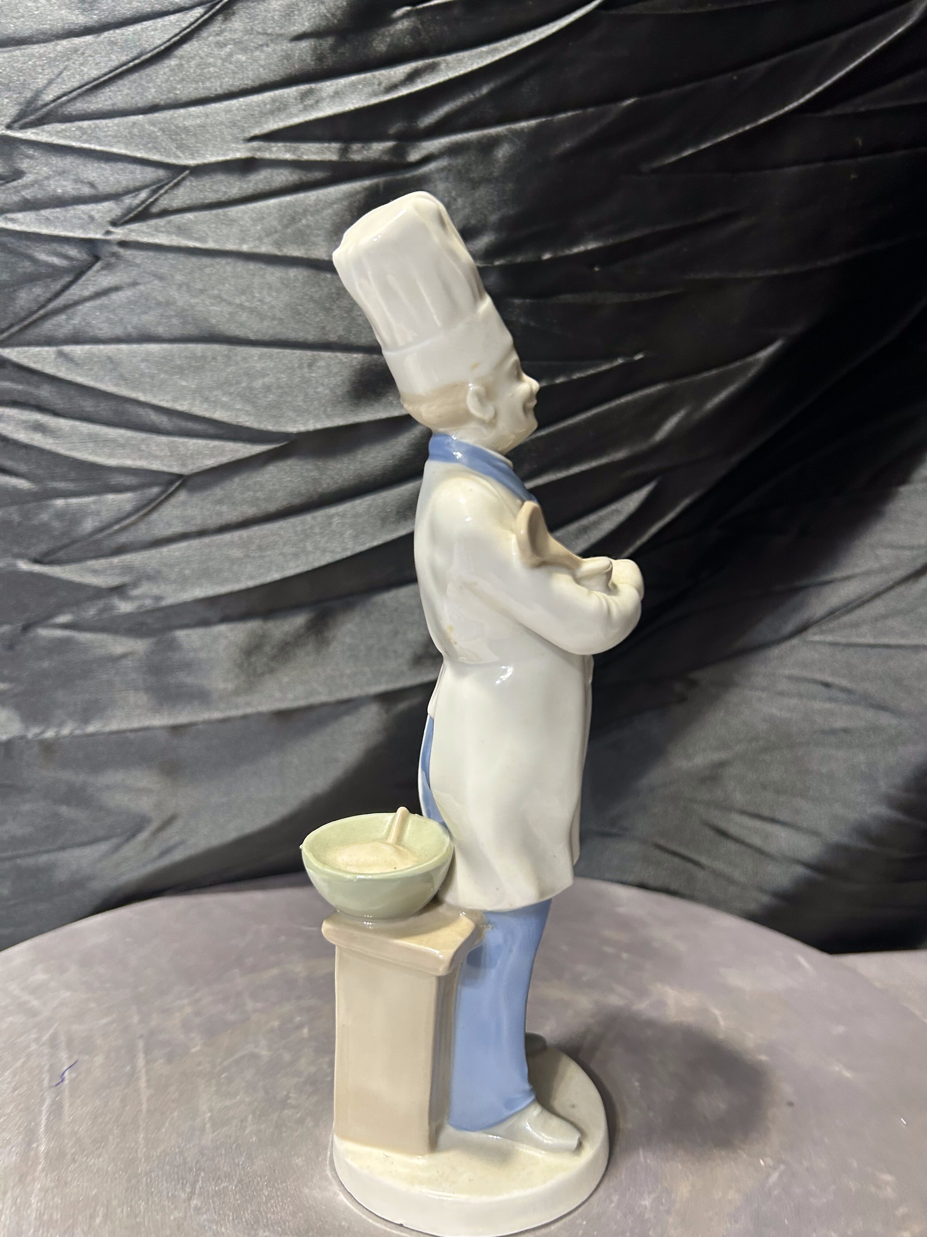 Porcelanowa figurka przedstawiająca kucharza w tradycyjnym stroju gastronomicznym z wysoką czapką oraz łyżką kuchenną. Postać została wykonana z dużą dbałością o detale – widoczne są elementy stroju, guziki, chusta pod szyją oraz charakterystyczna czapka szefa kuchni.