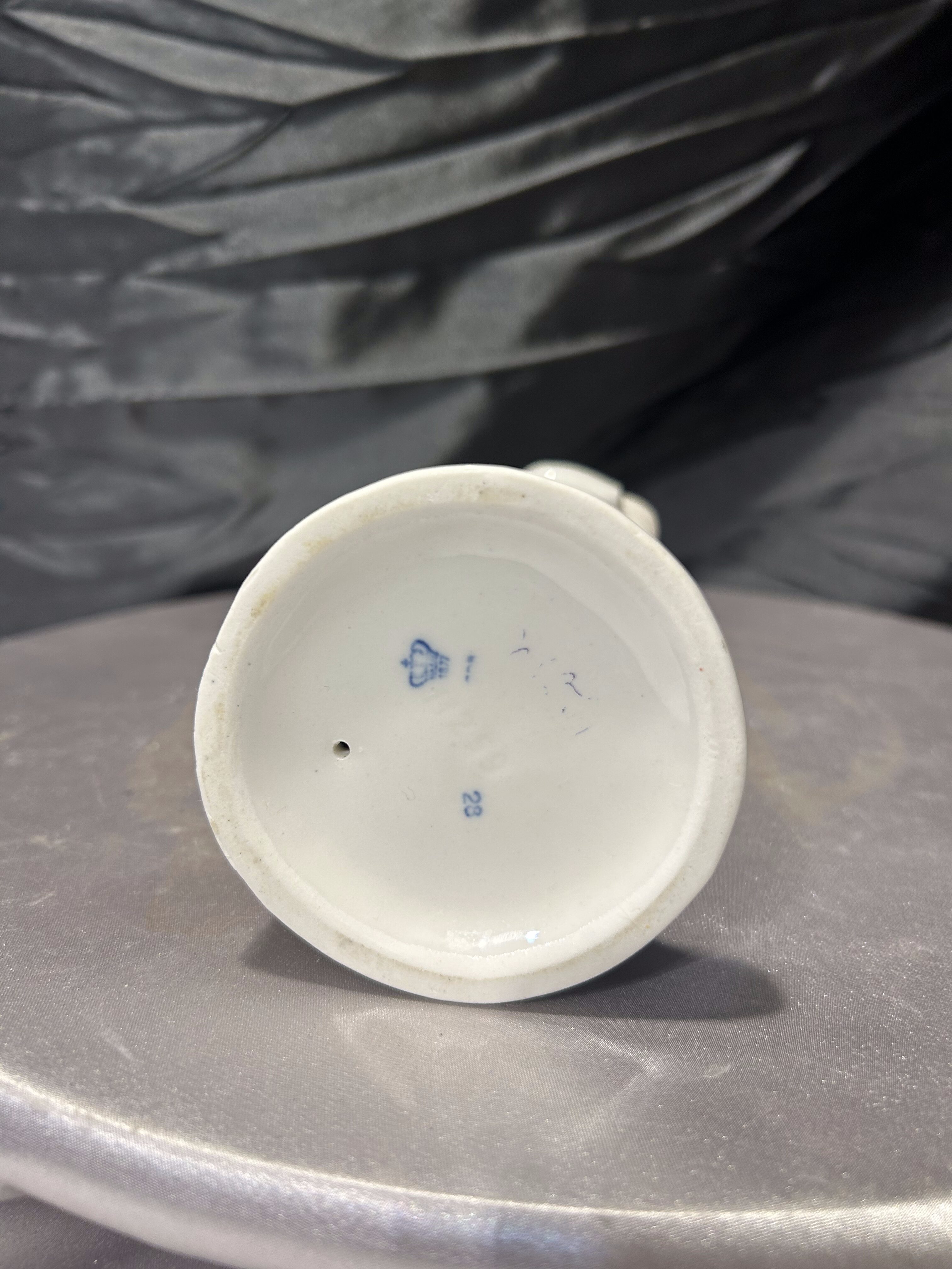 Figurka jest sygnowana na spodzie znakiem korony stosowanym przez niemieckie manufaktury porcelany z regionu Bavaria (Kronach). Oznaczenie to było używane przez fabryki porcelany w drugiej połowie XX wieku. Dodatkowy numer 28 wskazuje na model figurki w katalogu producenta.