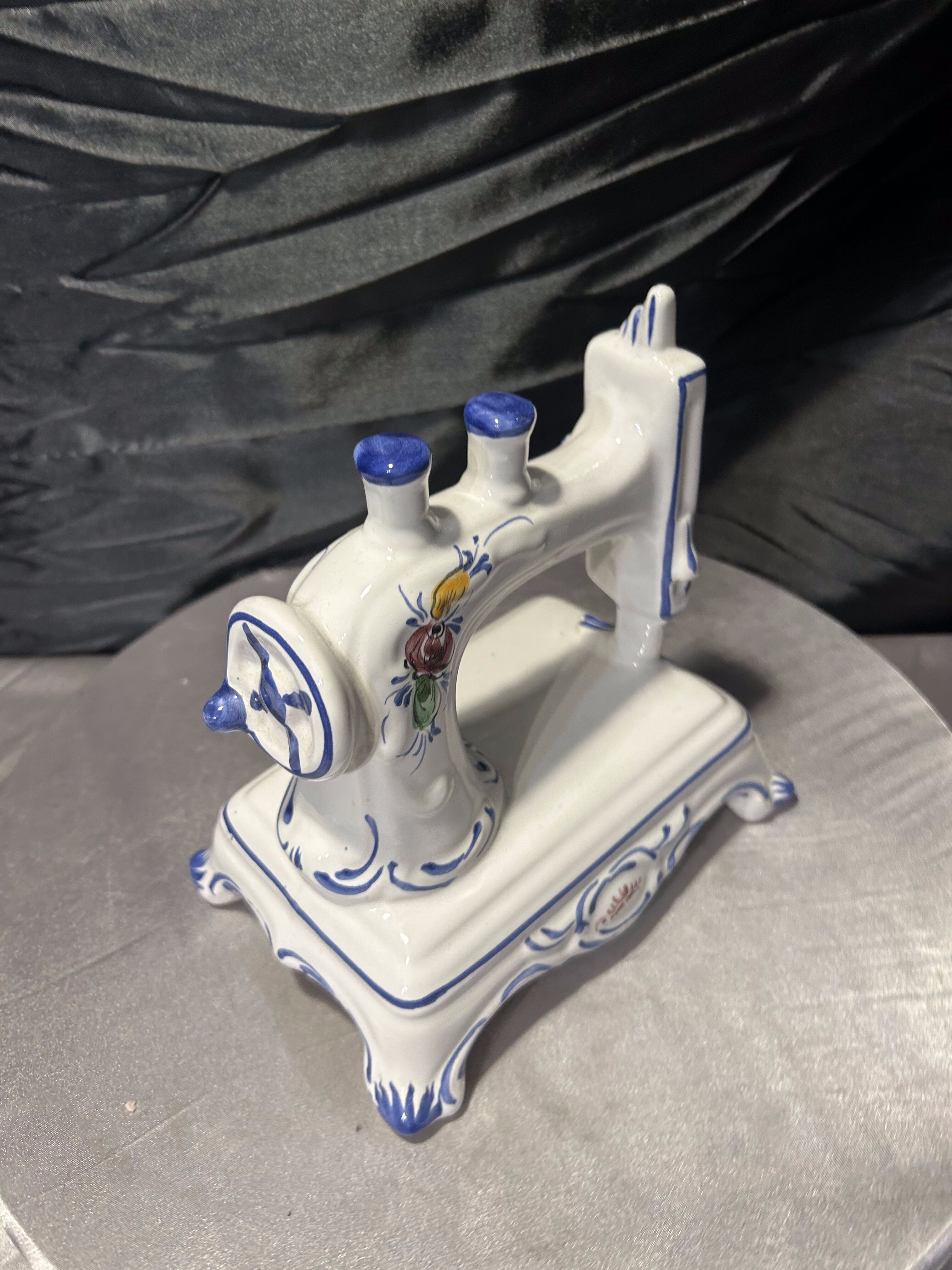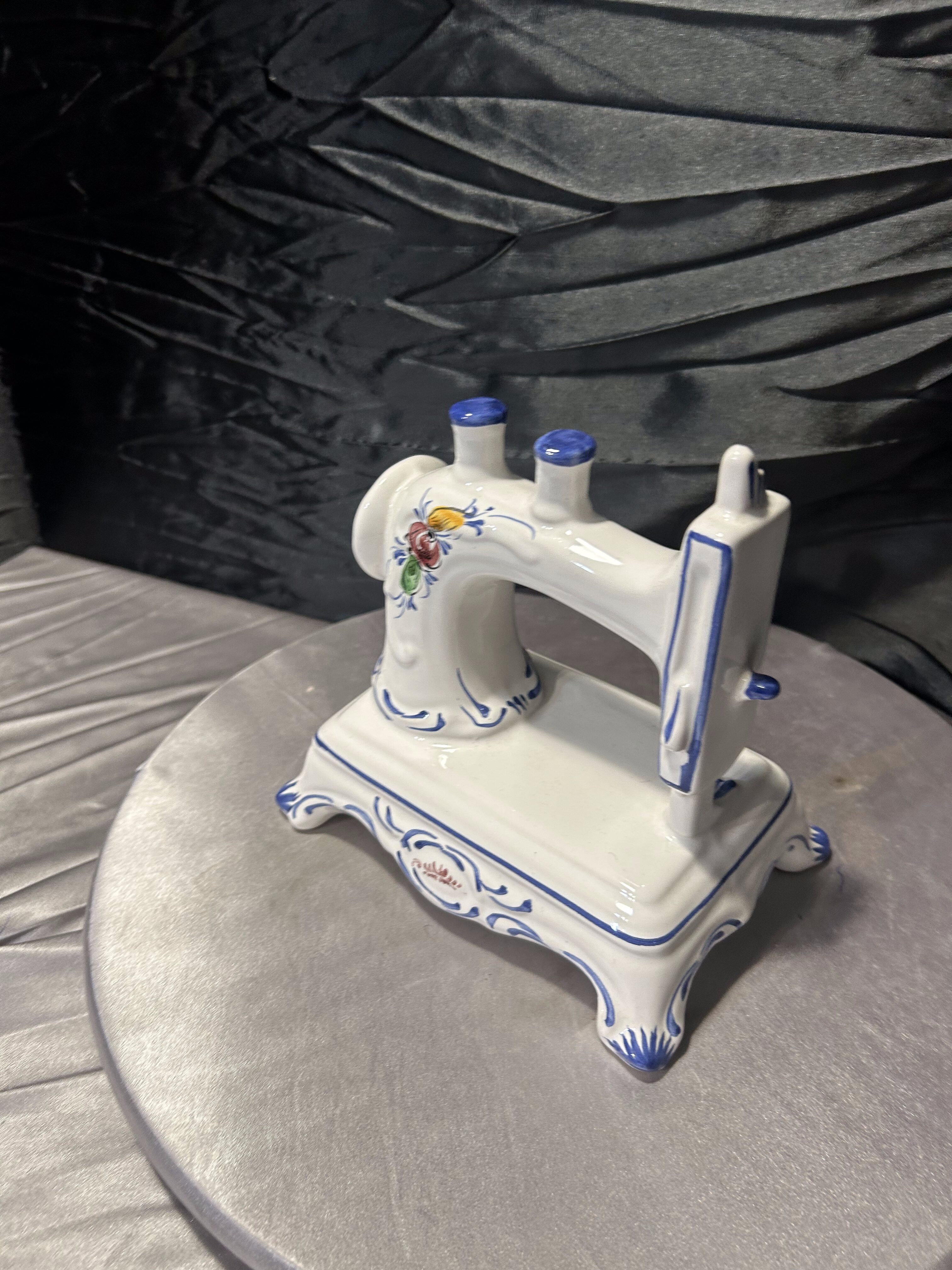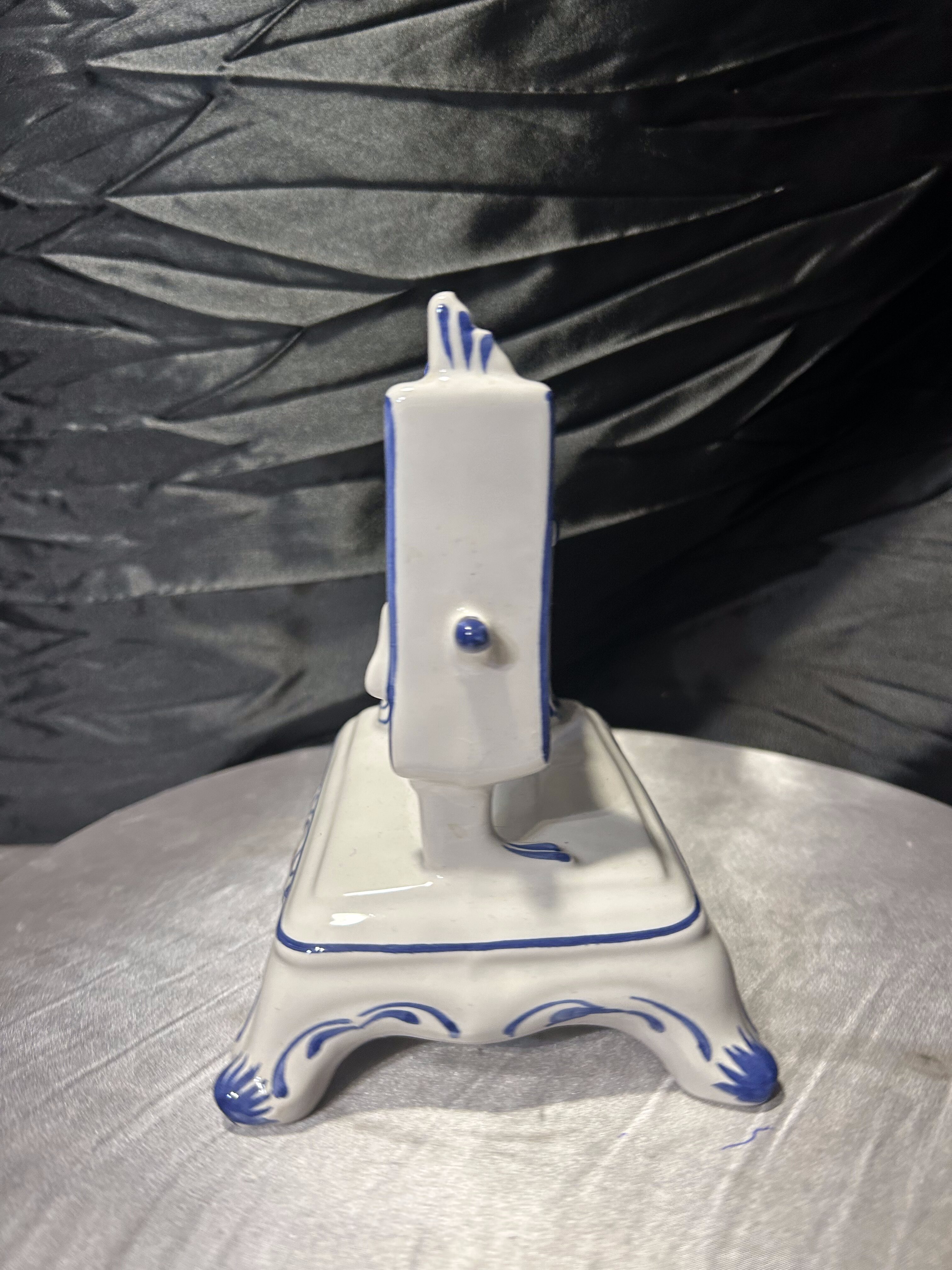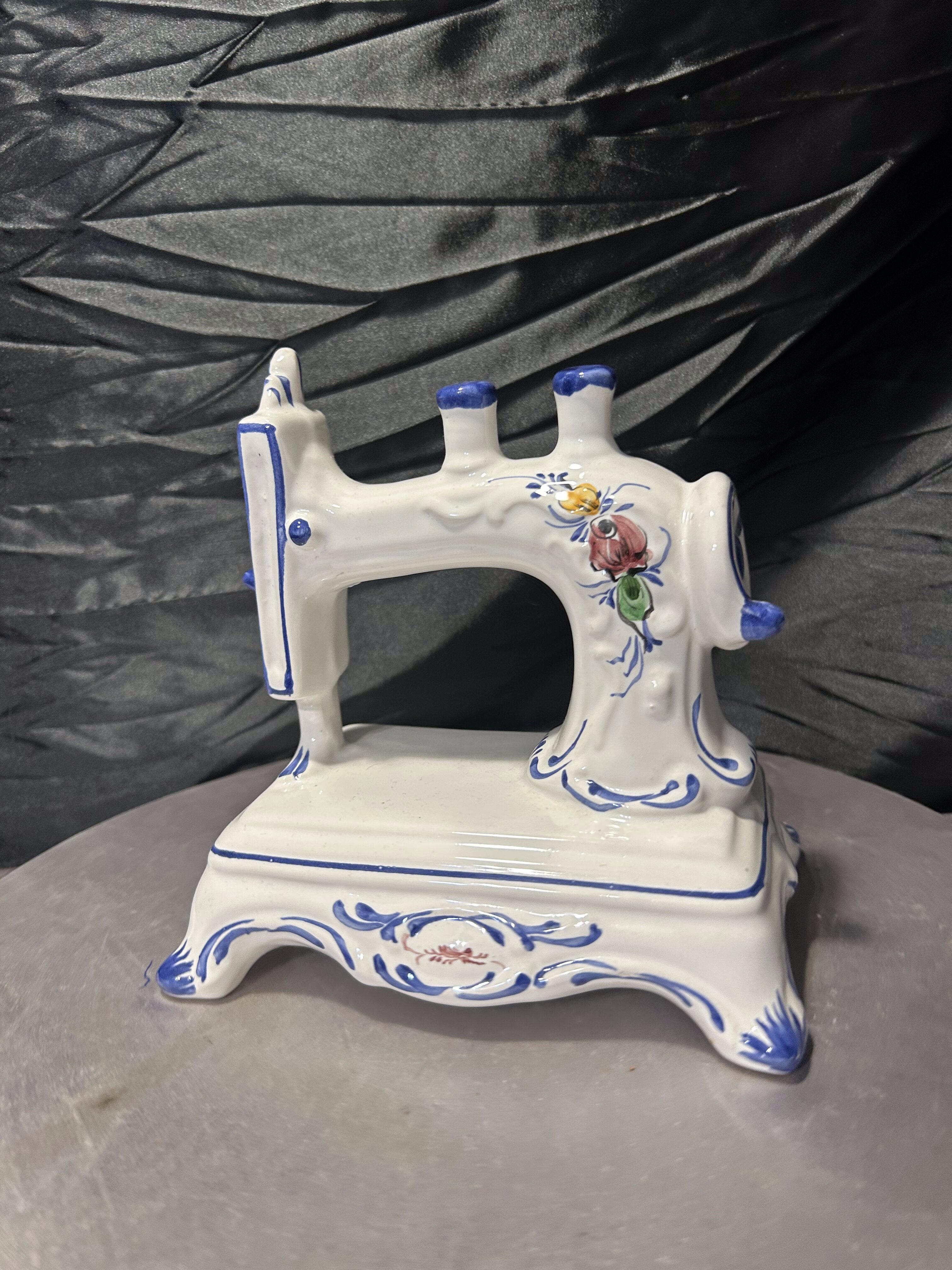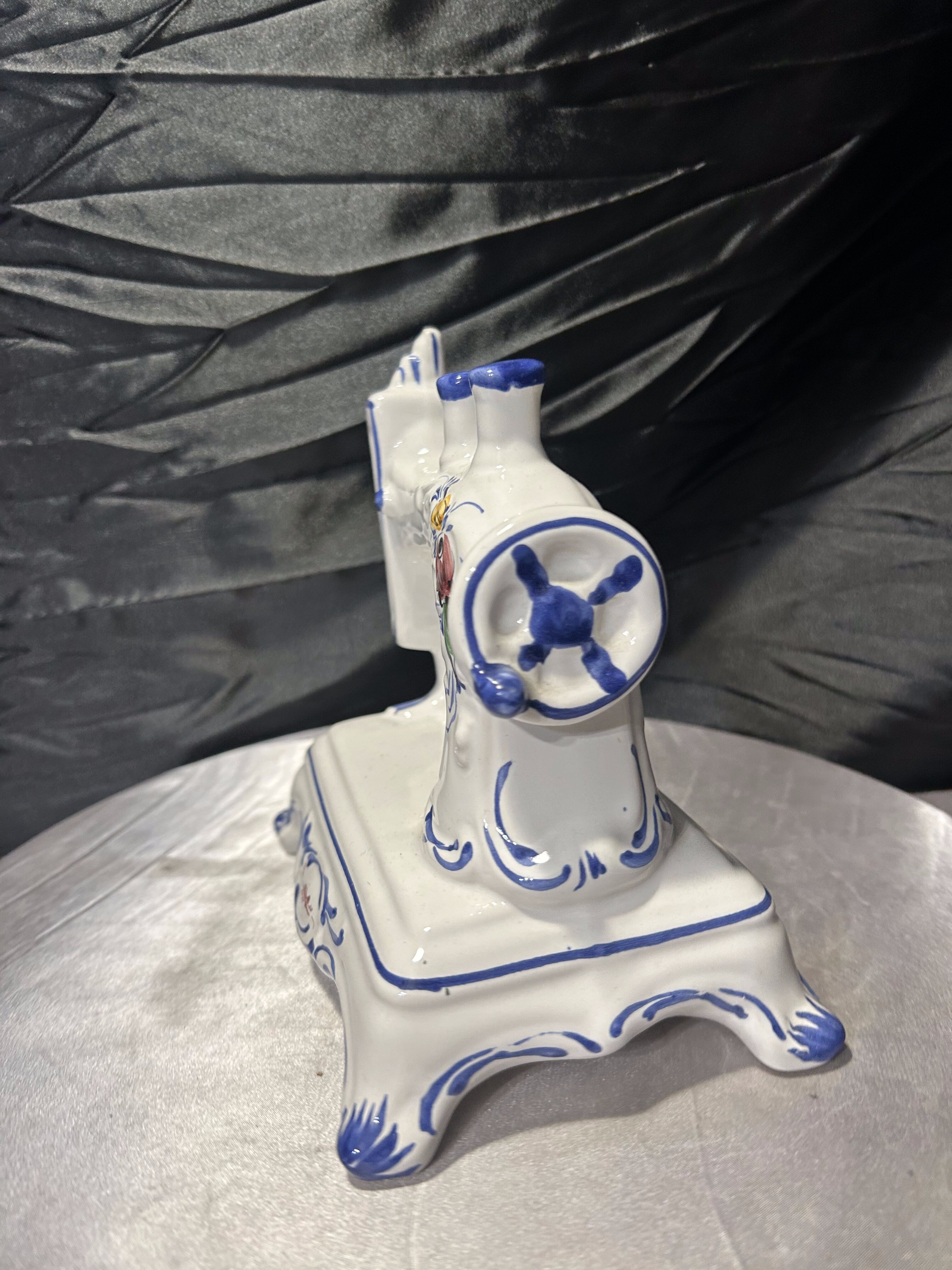 Oryginalna figurka dekoracyjna przedstawiająca stylizowaną maszynę do szycia, wykonaną z porcelany. Całość utrzymana jest w klasycznej białej kolorystyce z ręcznie malowanymi zdobieniami w odcieniach kobaltu oraz subtelnymi motywami kwiatowymi.