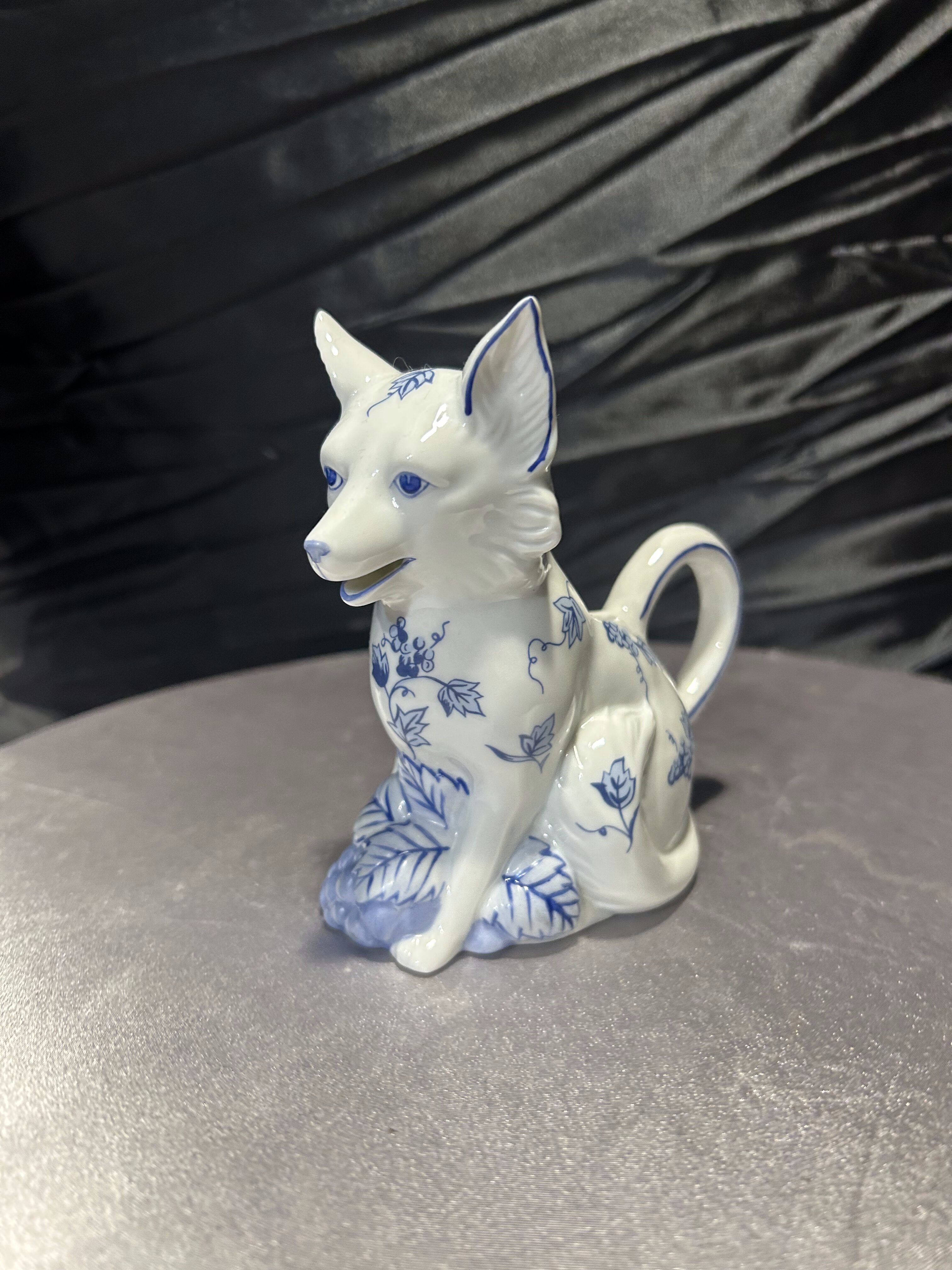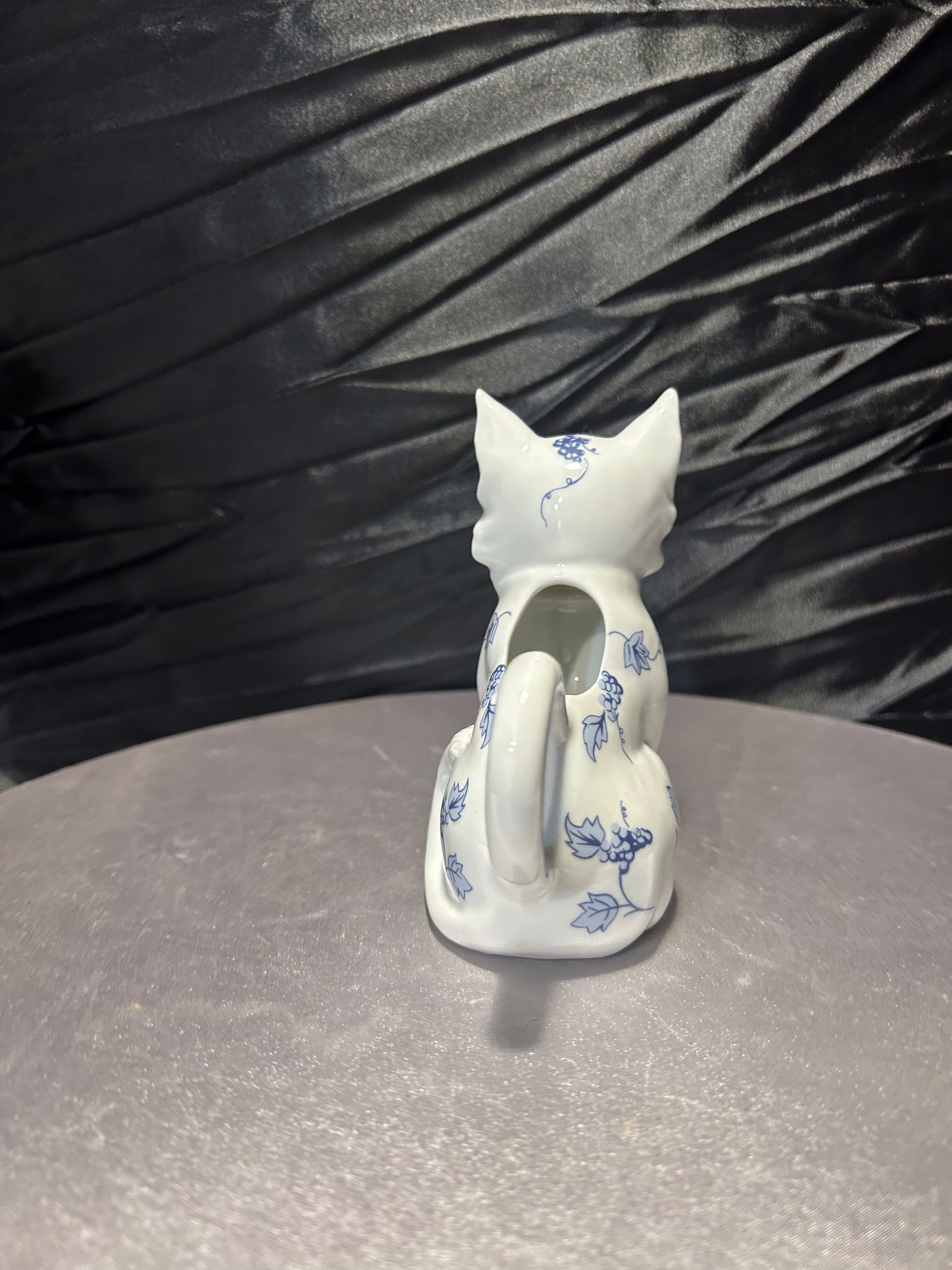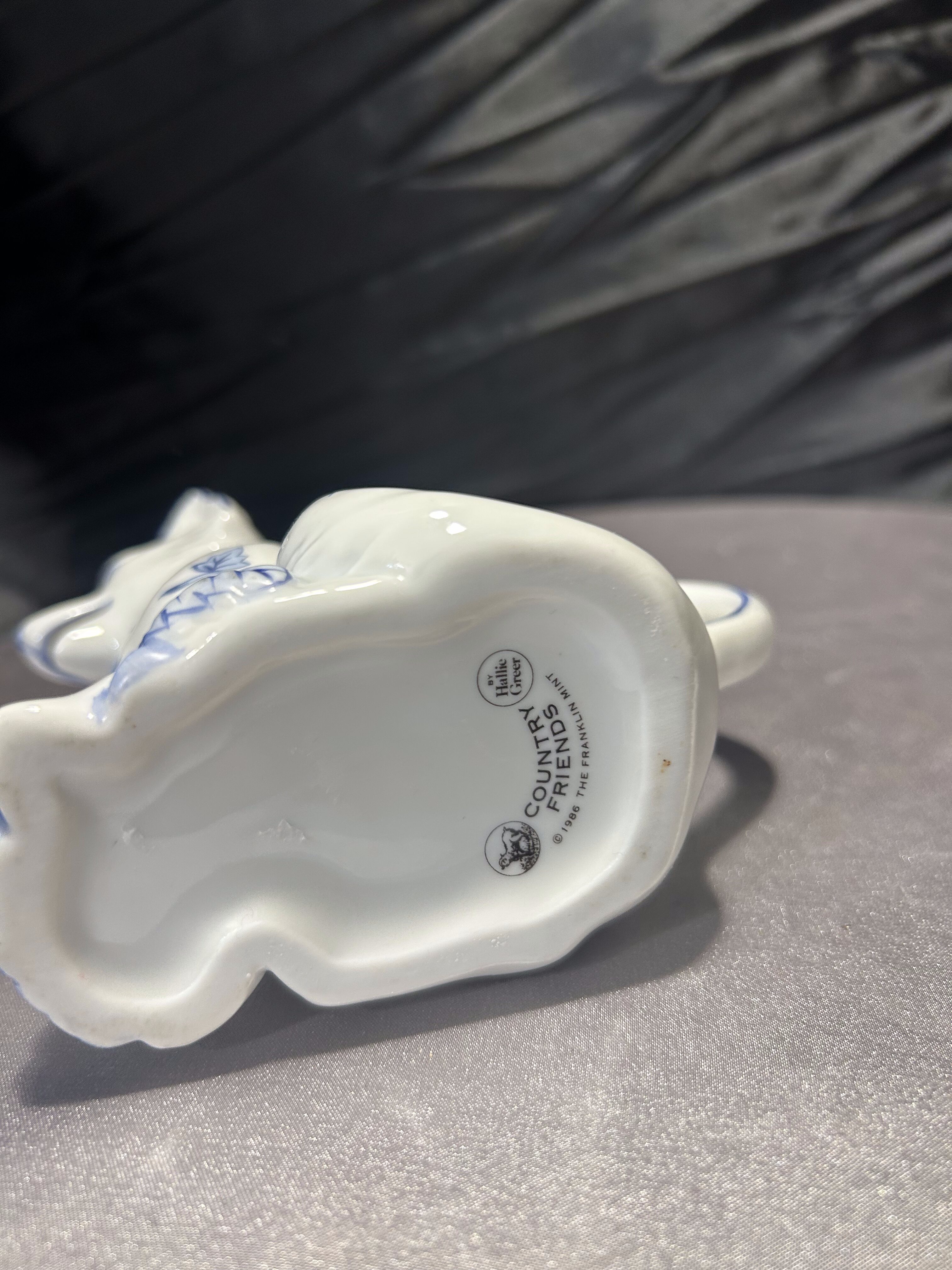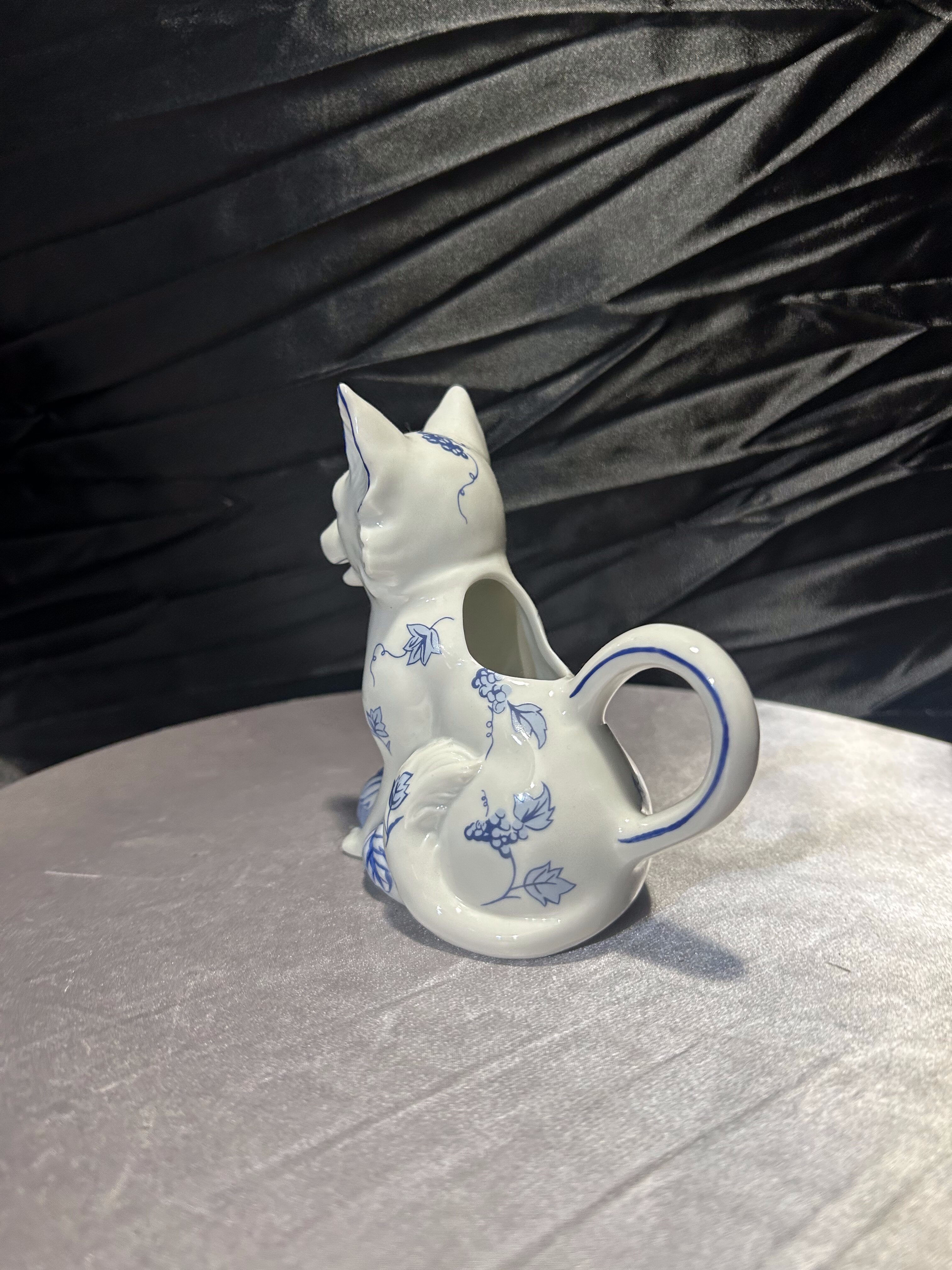 Wyjątkowa porcelanowa figurka przedstawiająca uroczego pieska w białej porcelanie, ozdobioną ręcznie malowanym, niebieskim wzorem roślinnym w stylu blue-and-white. Elementem szczególnym jest zintegrowany z tyłu flakonik, który pozwala na umieszczenie w nim kwiatów, dzięki czemu figurka staje się nie tylko dekoracją, ale również funkcjonalnym dodatkiem wnętrza. Pochodzi z serii Country Friends zaprojektowanej przez Hallie Greer dla renomowanej manufaktury Franklin Mint, specjalizującej się w kolekcjonerskich wyrobach porcelanowych. Produkcja datowana jest na lata 80. XX wieku. Egzemplarz sygnowany od spodu, w idealnym stanie kolekcjonerskim.