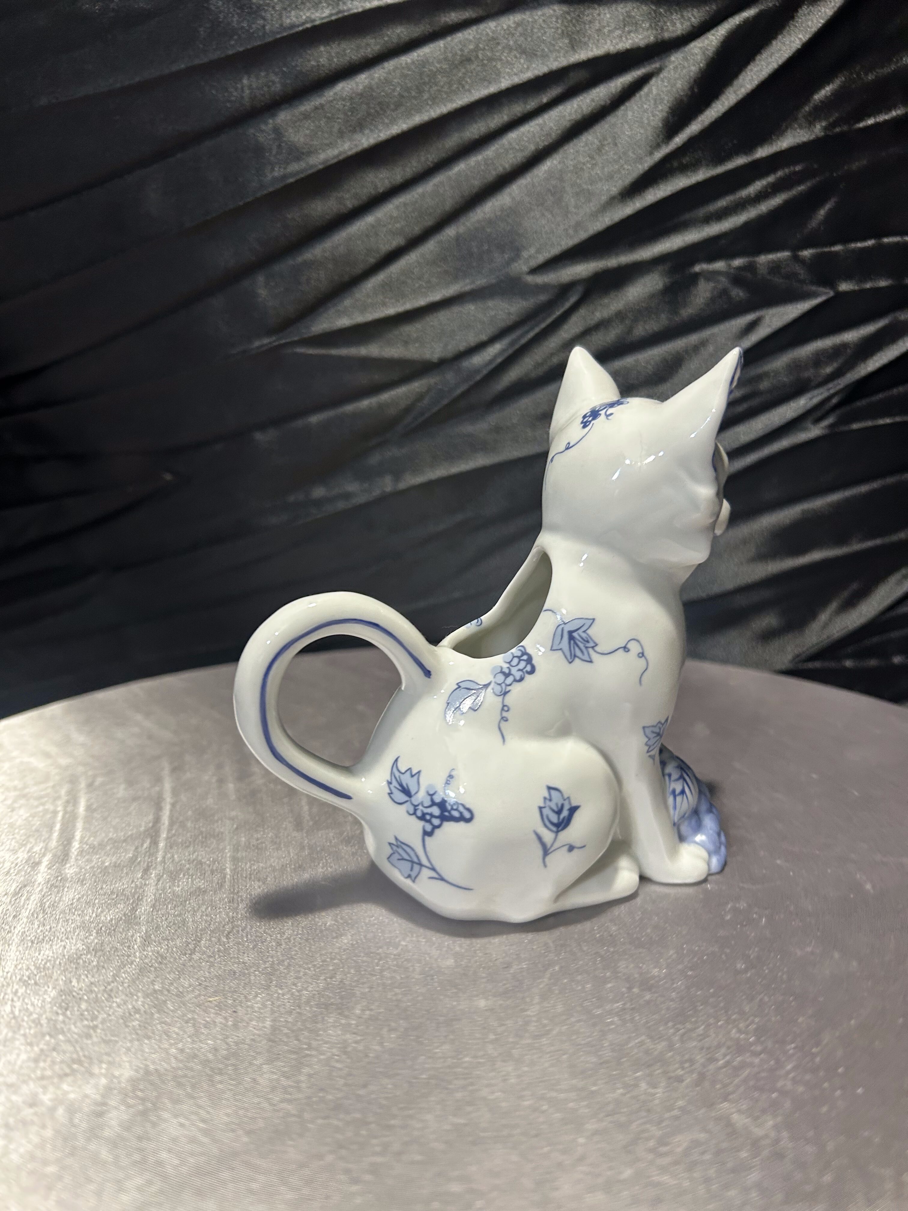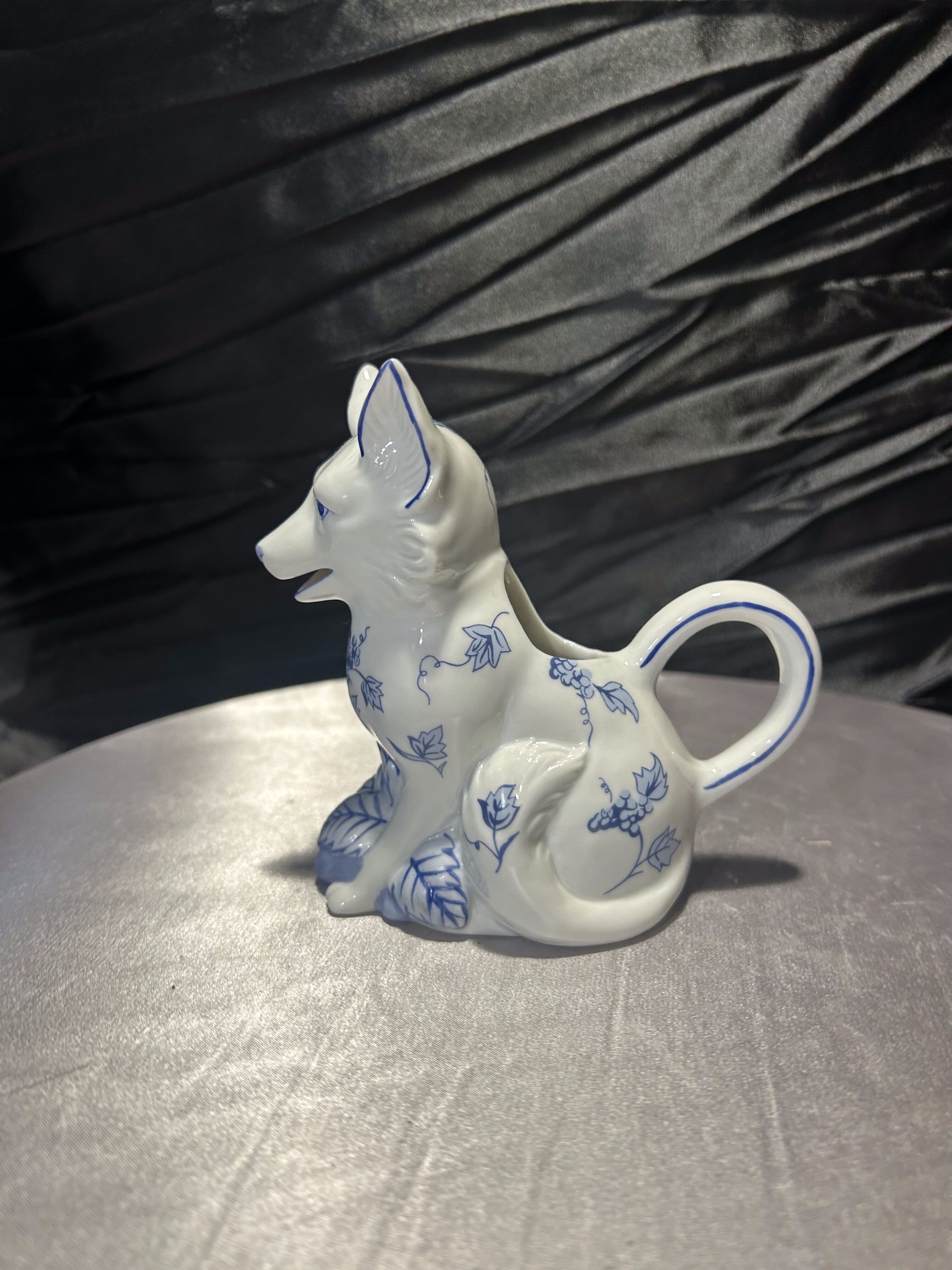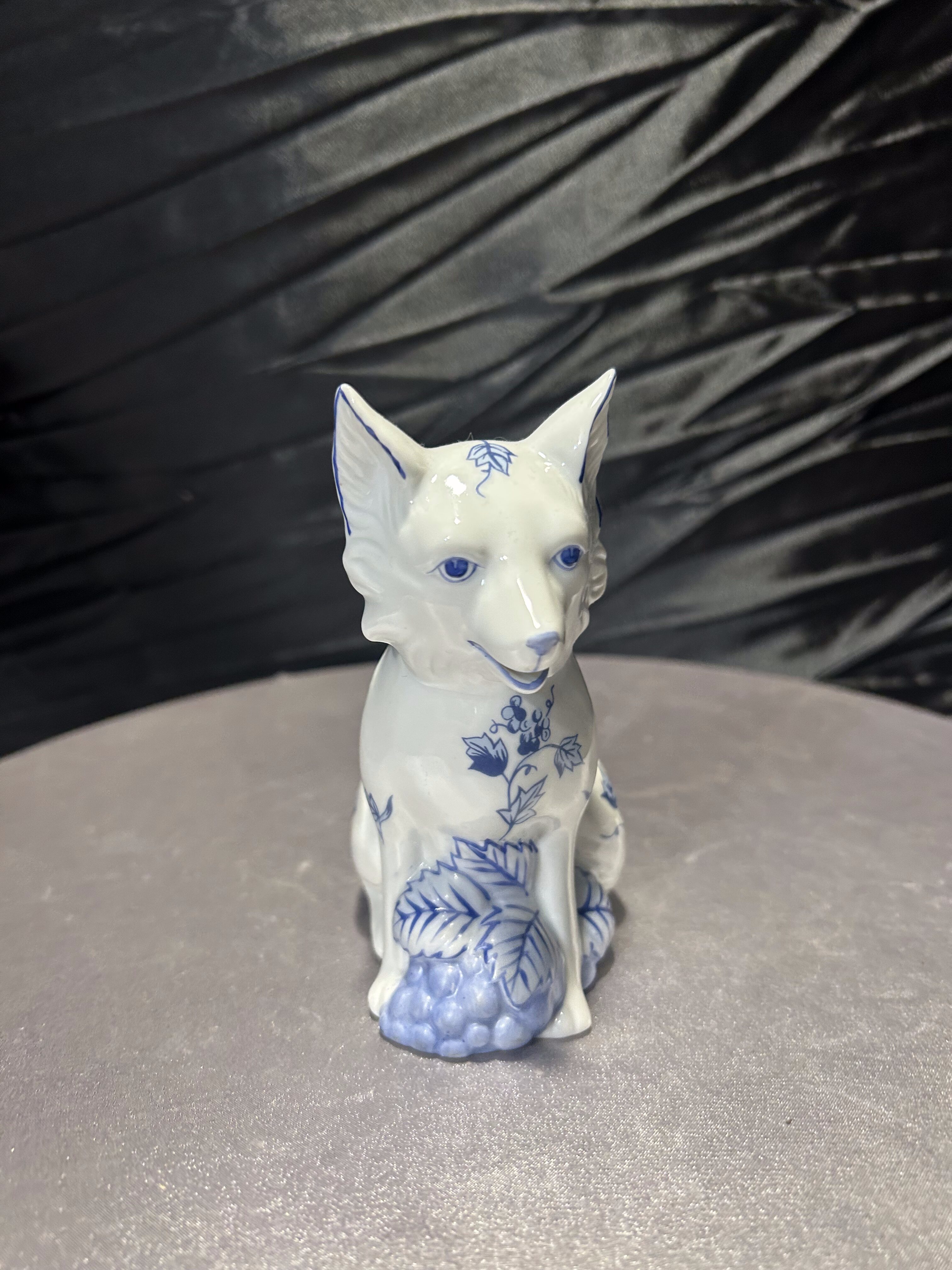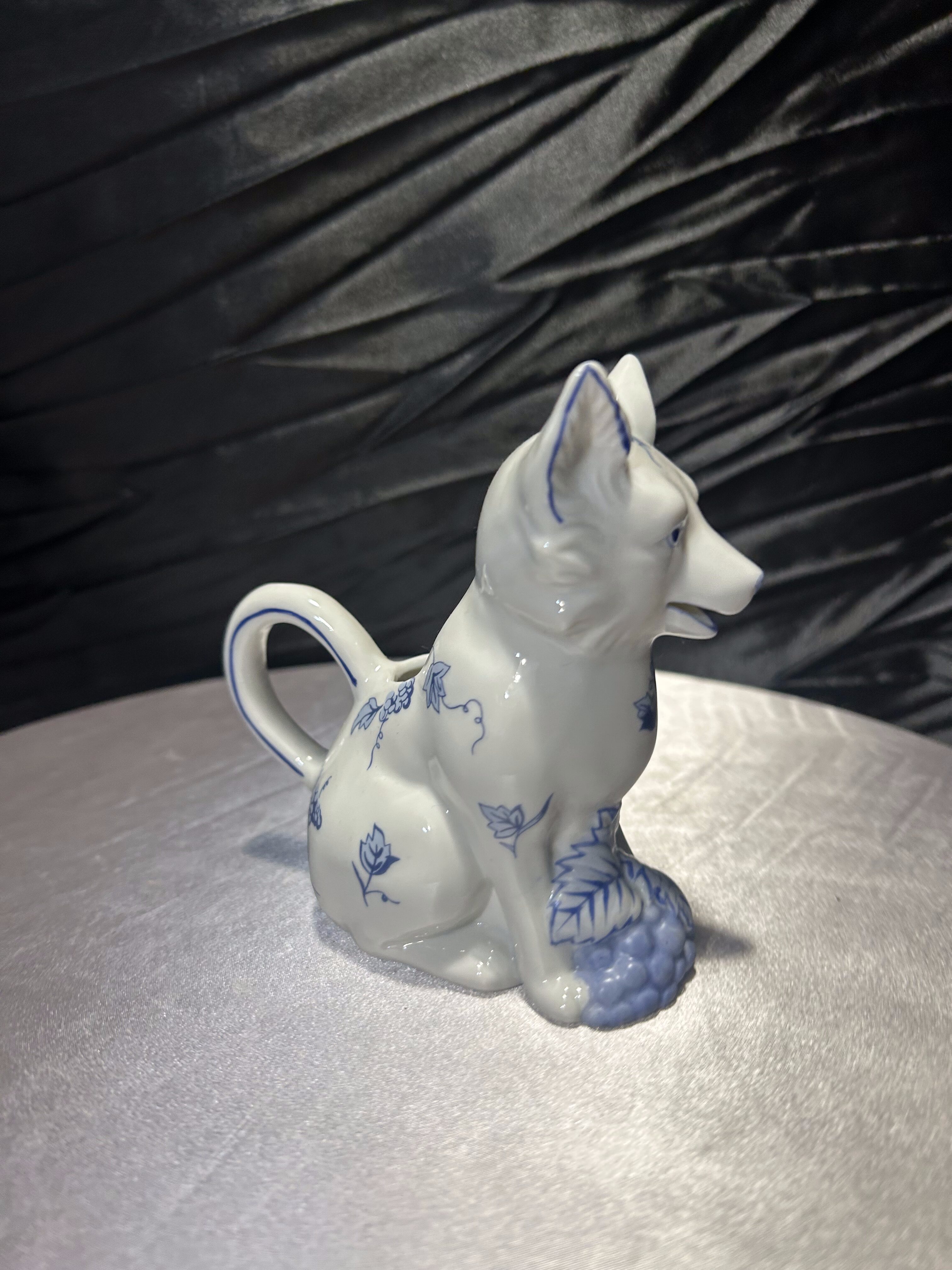 Wyjątkowa porcelanowa figurka przedstawiająca uroczego pieska w białej porcelanie, ozdobioną ręcznie malowanym, niebieskim wzorem roślinnym w stylu blue-and-white. Elementem szczególnym jest zintegrowany z tyłu flakonik, który pozwala na umieszczenie w nim kwiatów, dzięki czemu figurka staje się nie tylko dekoracją, ale również funkcjonalnym dodatkiem wnętrza. Pochodzi z serii Country Friends zaprojektowanej przez Hallie Greer dla renomowanej manufaktury Franklin Mint, specjalizującej się w kolekcjonerskich wyrobach porcelanowych. Produkcja datowana jest na lata 80. XX wieku. Egzemplarz sygnowany od spodu, w idealnym stanie kolekcjonerskim.