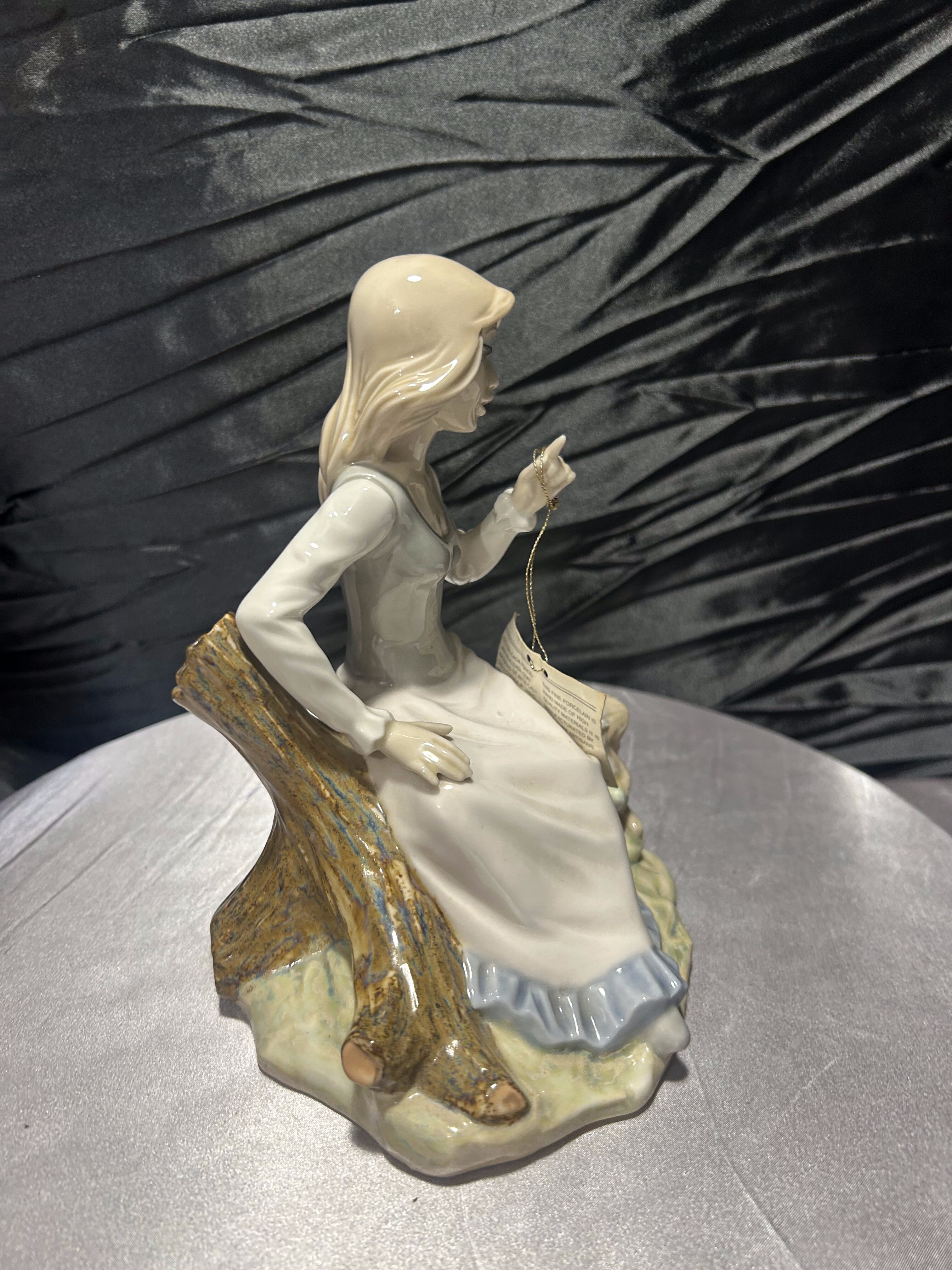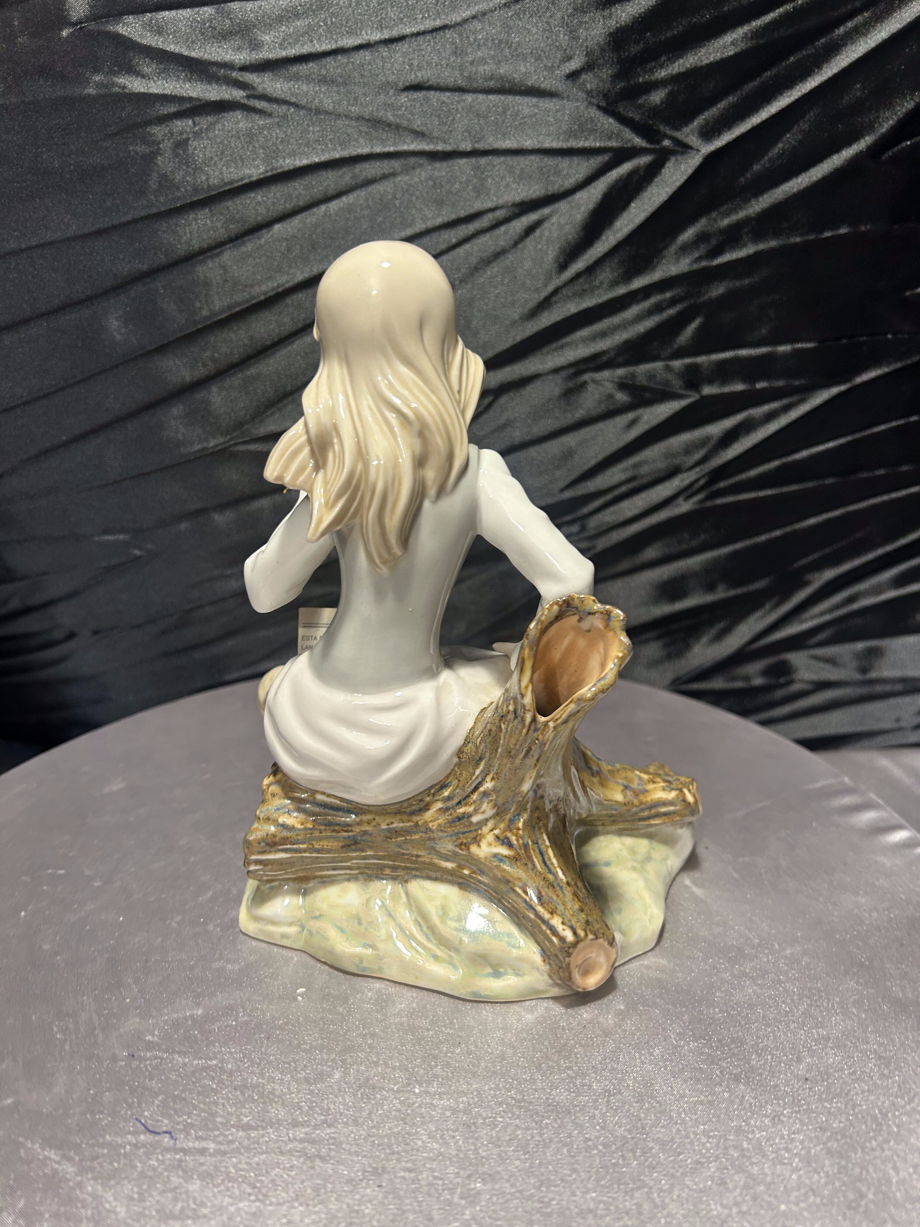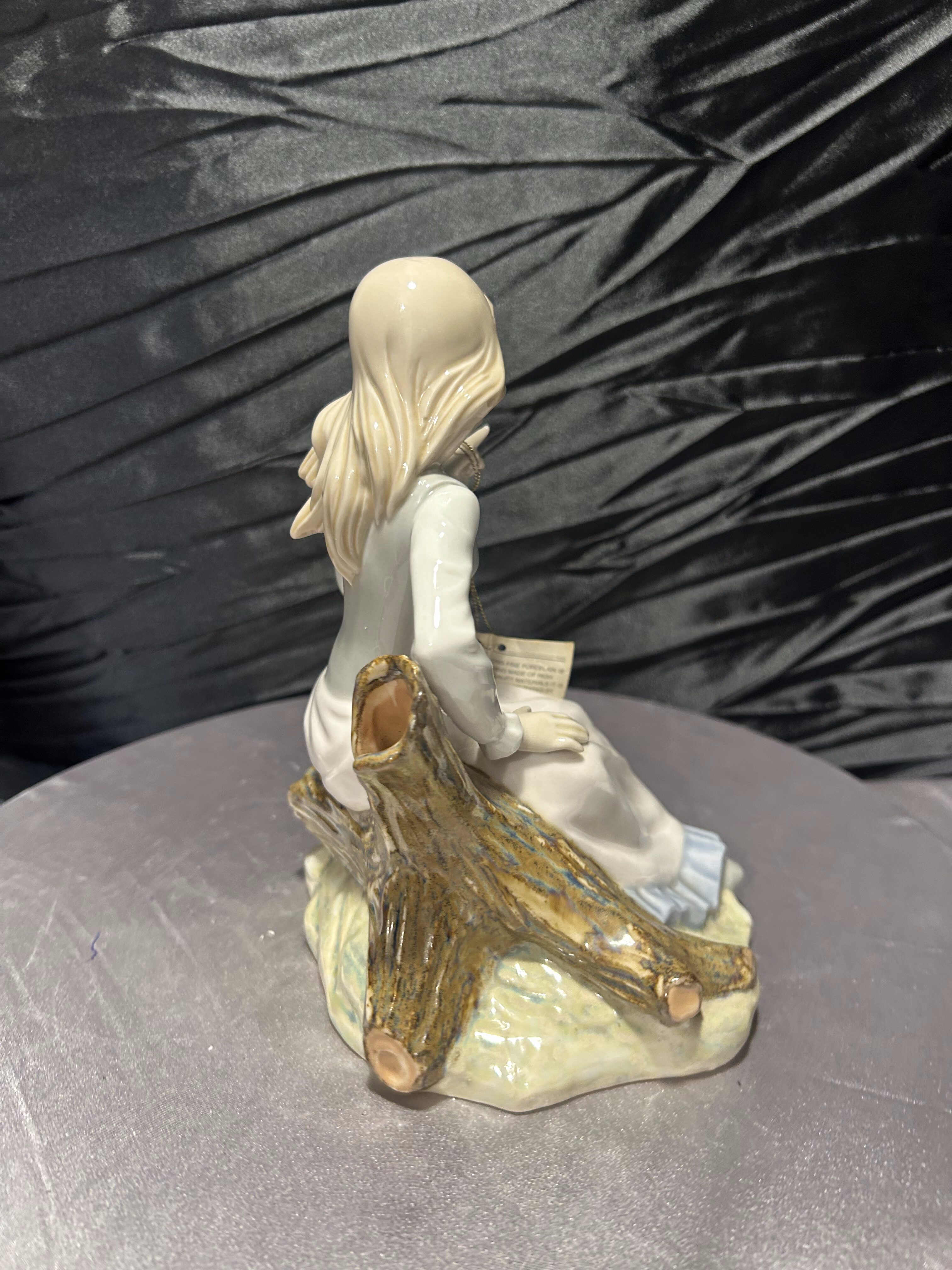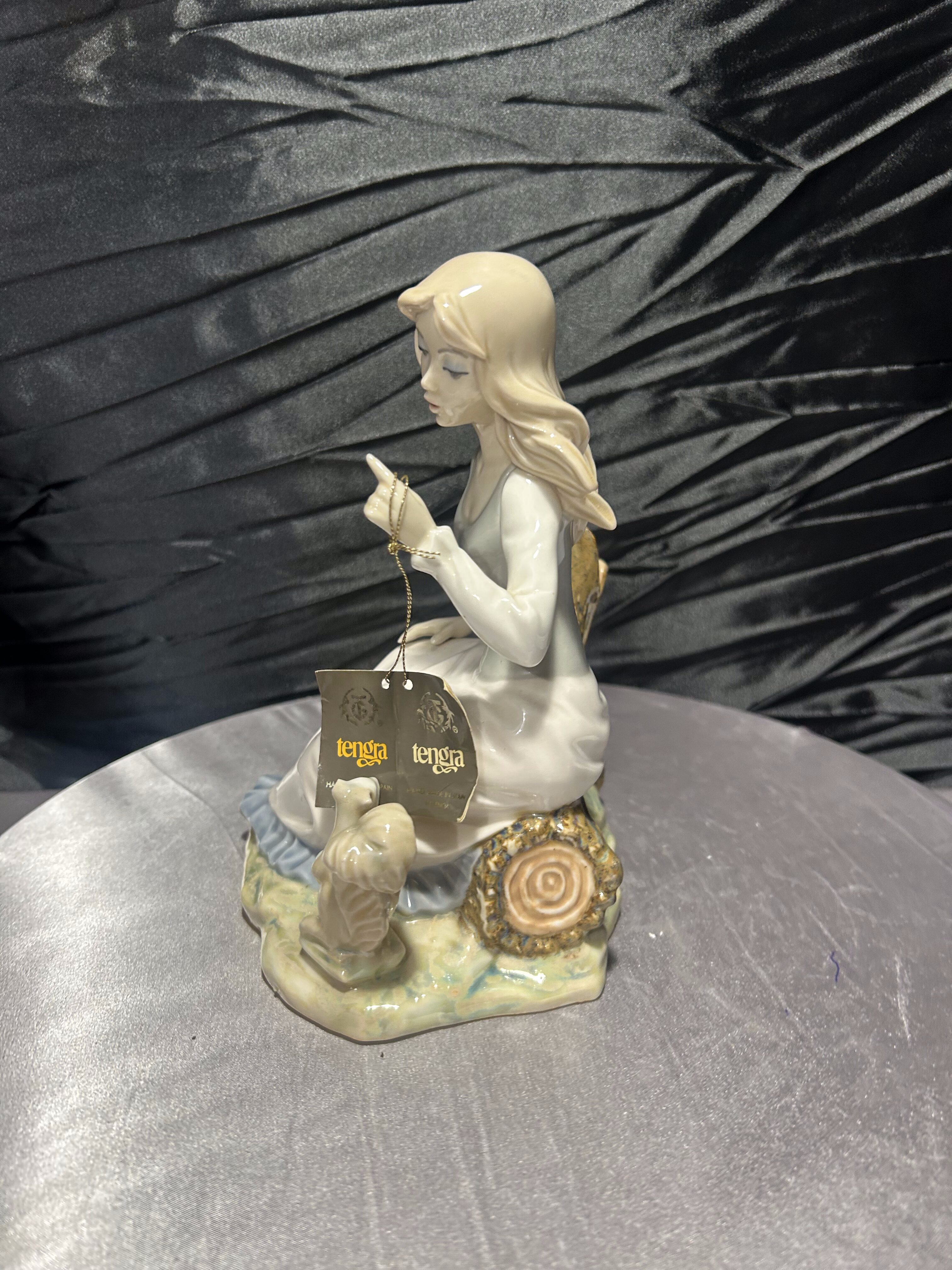 Elegancka porcelanowa figurka marki Tengra, wykonana ręcznie w hiszpańskiej Walencji. Przedstawia młodą dziewczynę siedzącą na pniu drzewa, w delikatnej, pastelowej sukni, w towarzystwie drobnej wiewiórki trzymającej orzech. Kompozycja utrzymana jest w charakterystycznym dla Tengra stylu – subtelnym, miękkim i pełnym wdzięku.