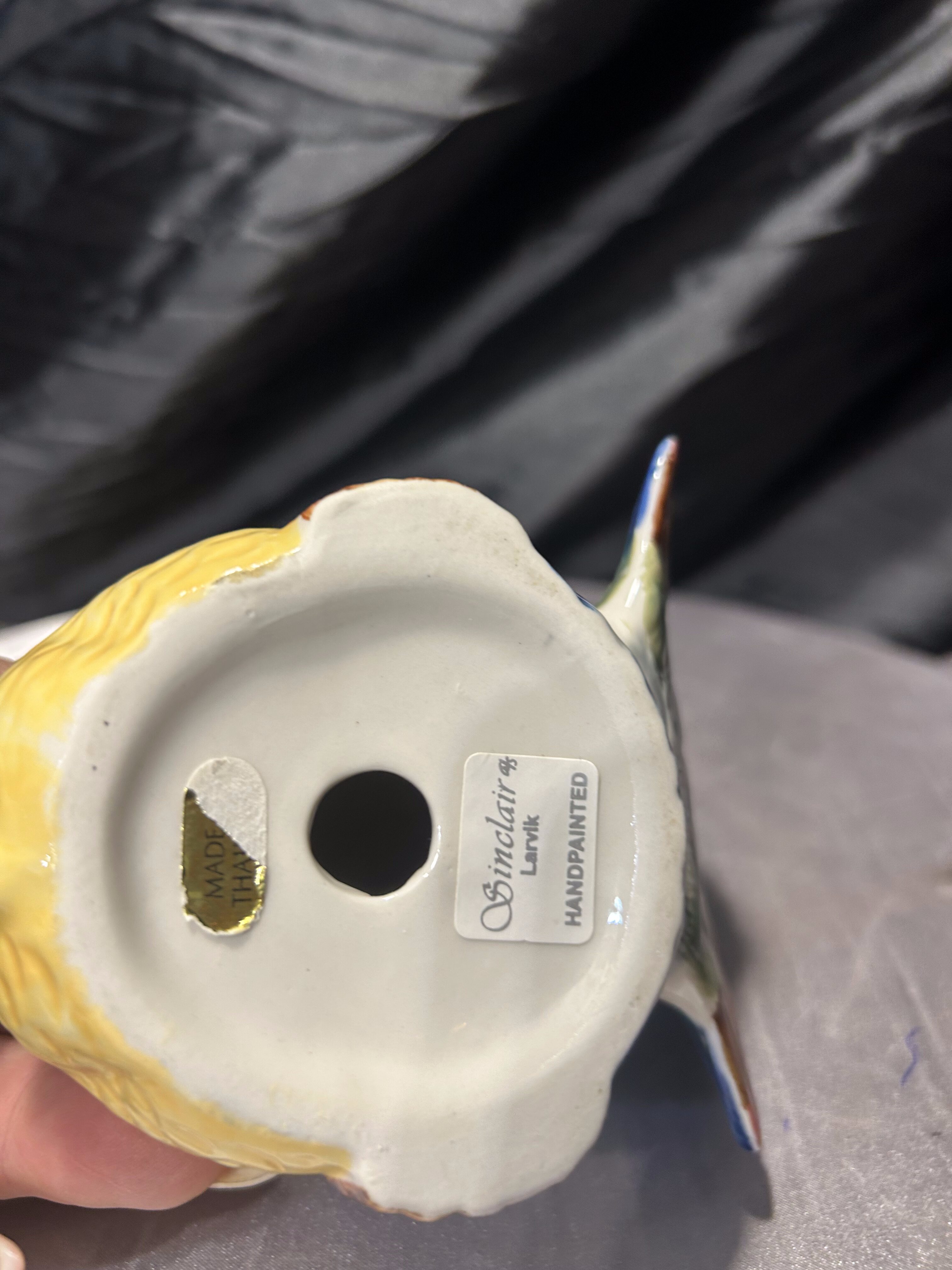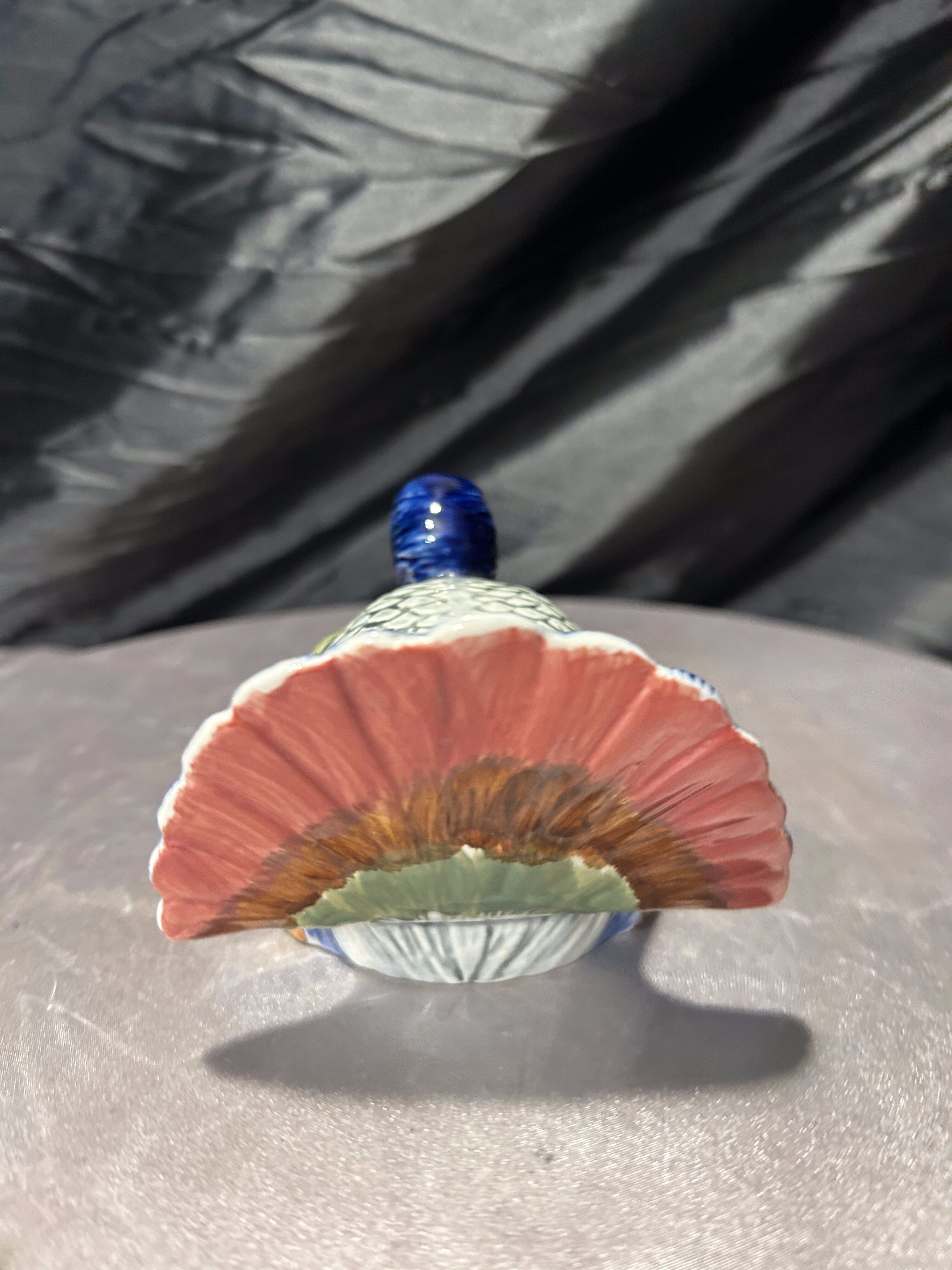 Dekoracyjna figurka porcelanowa przedstawiająca kuropatwę, wykonana z dbałością o detale i ręcznie malowana. Intensywna, a jednocześnie harmonijna kolorystyka oraz wyraźnie zaznaczona faktura upierzenia nadają figurce naturalny, niemal rzeźbiarski charakter. Sygnatura na spodzie oraz oznaczenie „handpainted” potwierdzają ręczne wykonanie i dekorowanie.