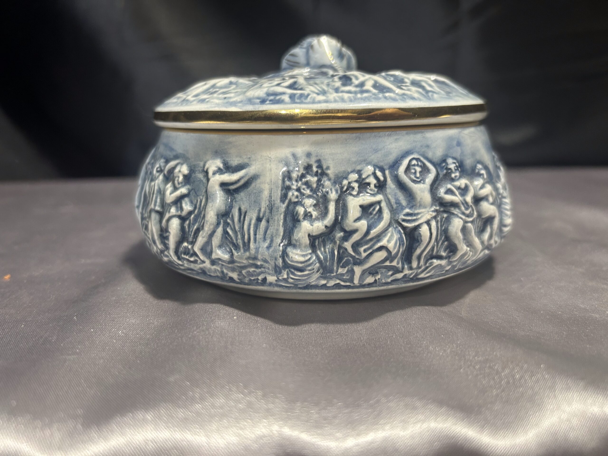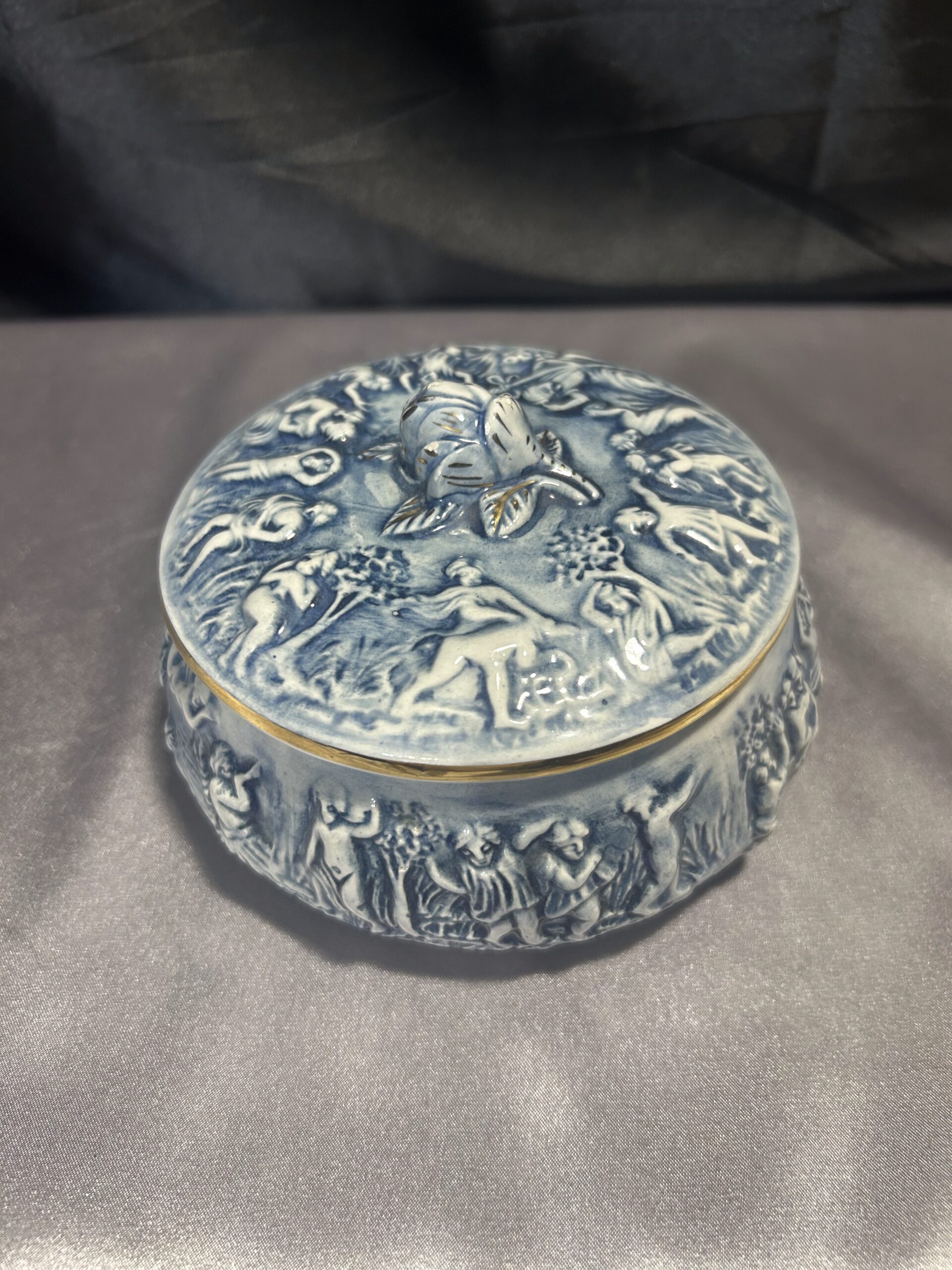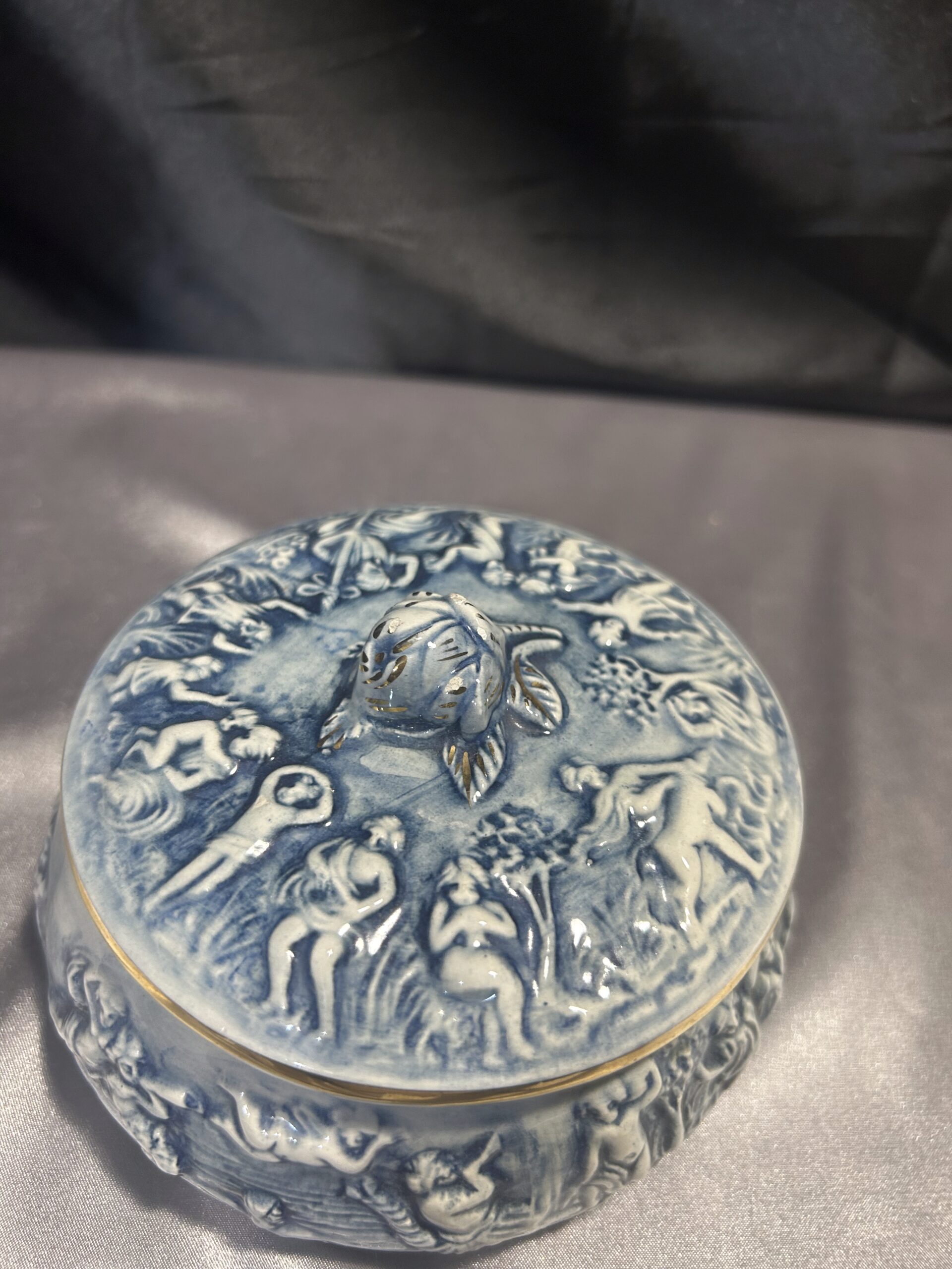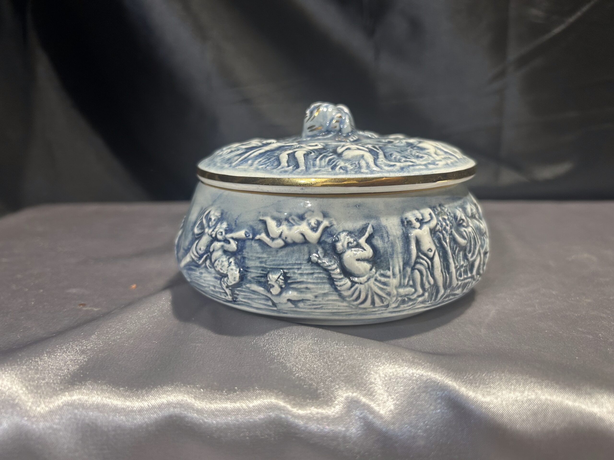 Wyjątkowa porcelanowa szkatułka o delikatnym niebieskim odcieniu, zdobiona tłoczonymi postaciami oraz piękną różą na szczycie pokrywki. Całość uzupełniają złote obwódki, dodające jej elegancji i luksusowego charakteru. Sygnowana R. CAPODIMONTE ITALY M.A.S., co potwierdza jej unikatowość i wartość kolekcjonerską. Zamykana, idealna do przechowywania drobiazgów lub jako element dekoracyjny.