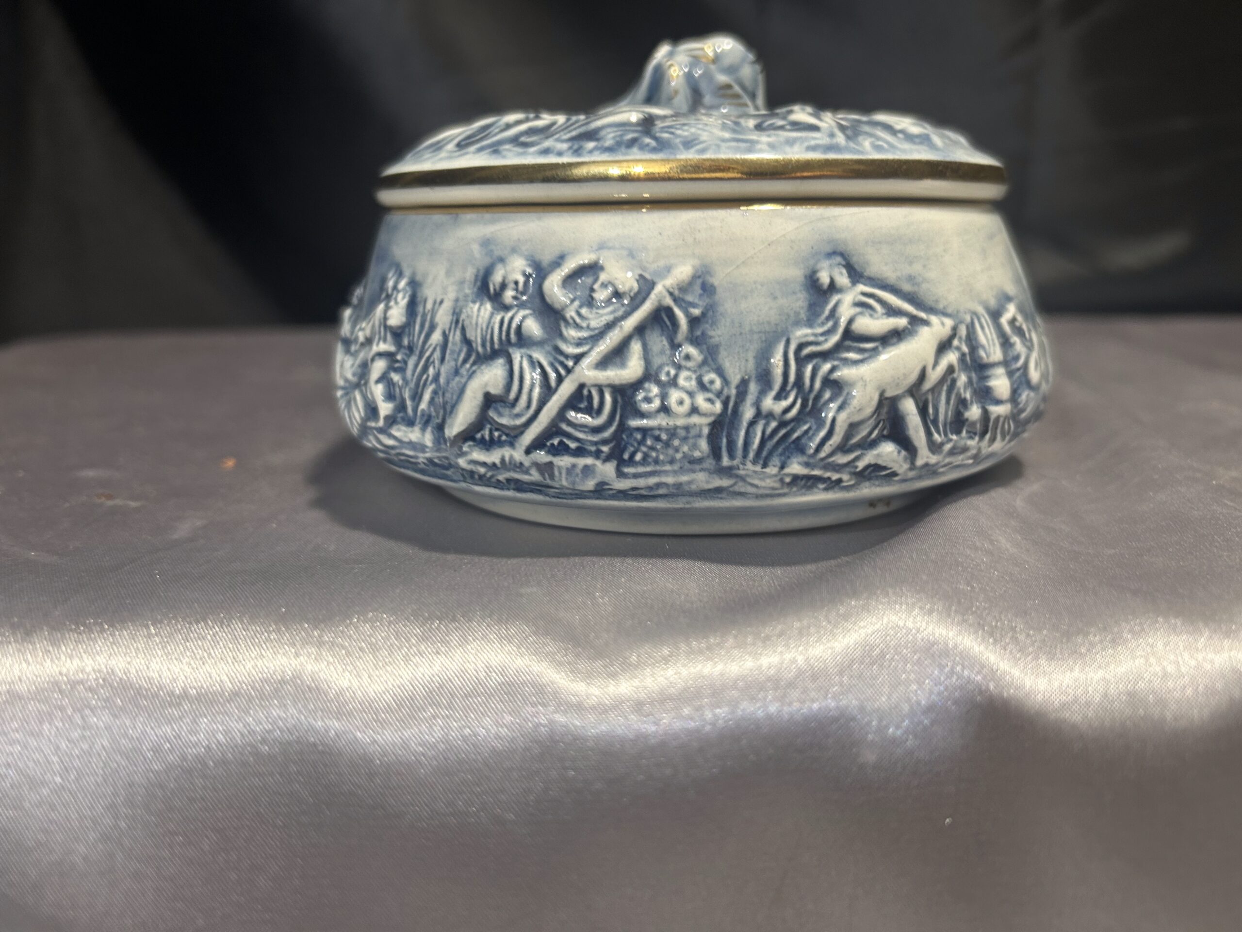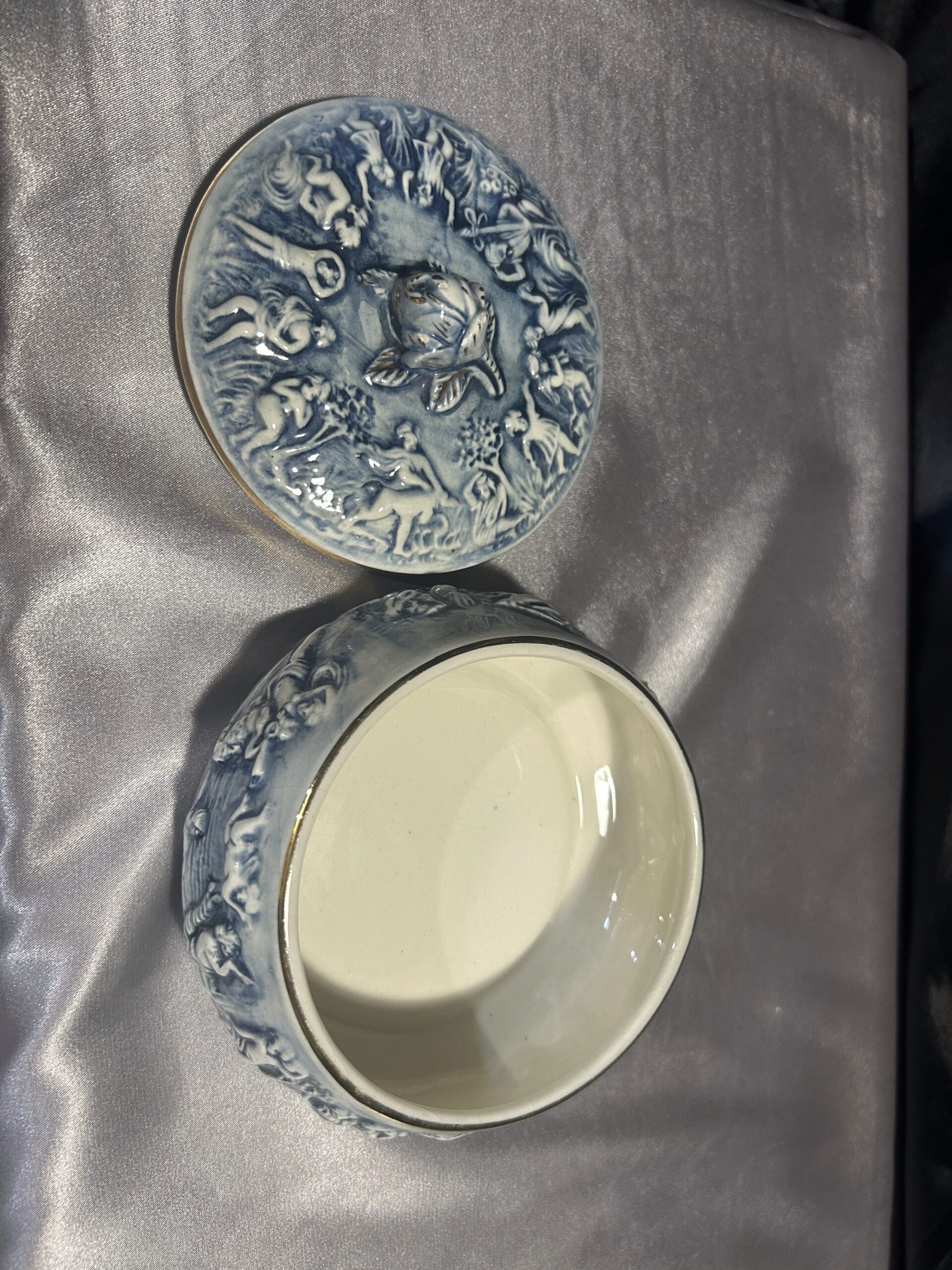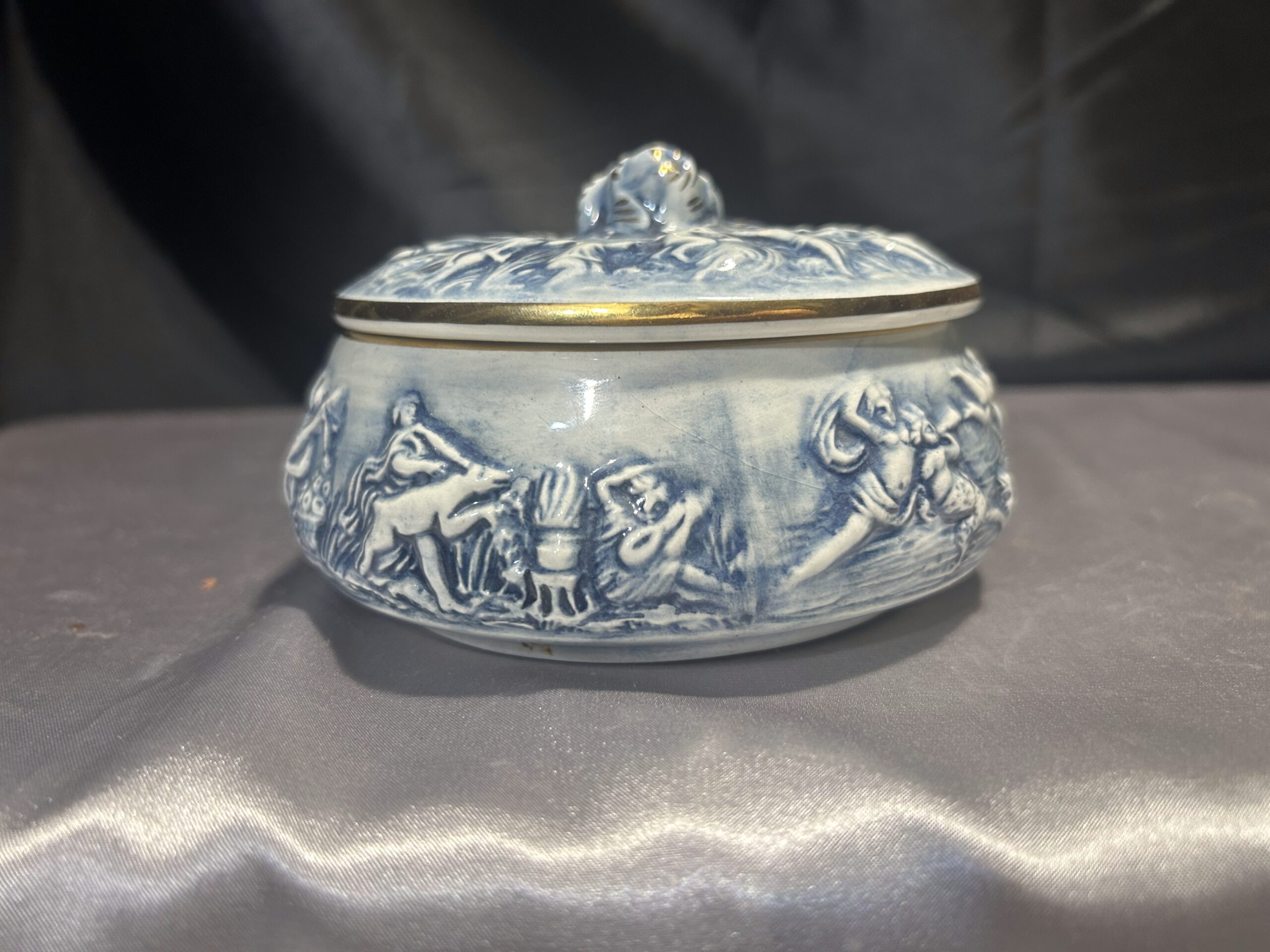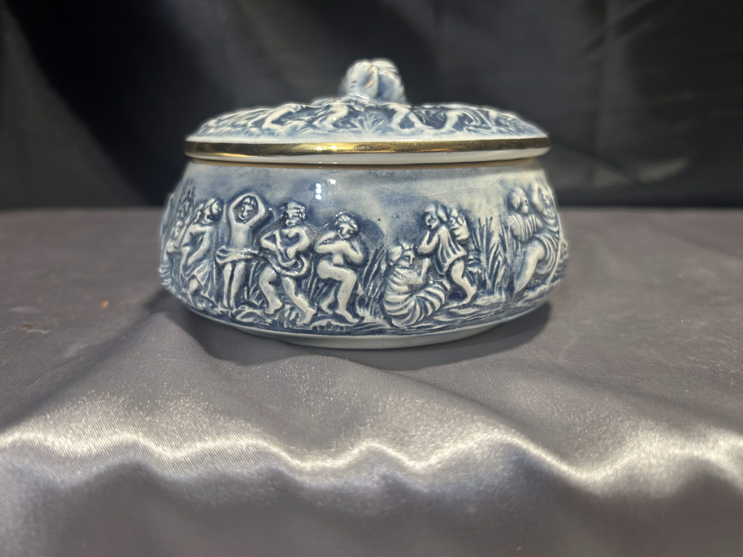 Wyjątkowa porcelanowa szkatułka o delikatnym niebieskim odcieniu, zdobiona tłoczonymi postaciami oraz piękną różą na szczycie pokrywki. Całość uzupełniają złote obwódki, dodające jej elegancji i luksusowego charakteru. Sygnowana R. CAPODIMONTE ITALY M.A.S., co potwierdza jej unikatowość i wartość kolekcjonerską. Zamykana, idealna do przechowywania drobiazgów lub jako element dekoracyjny.
