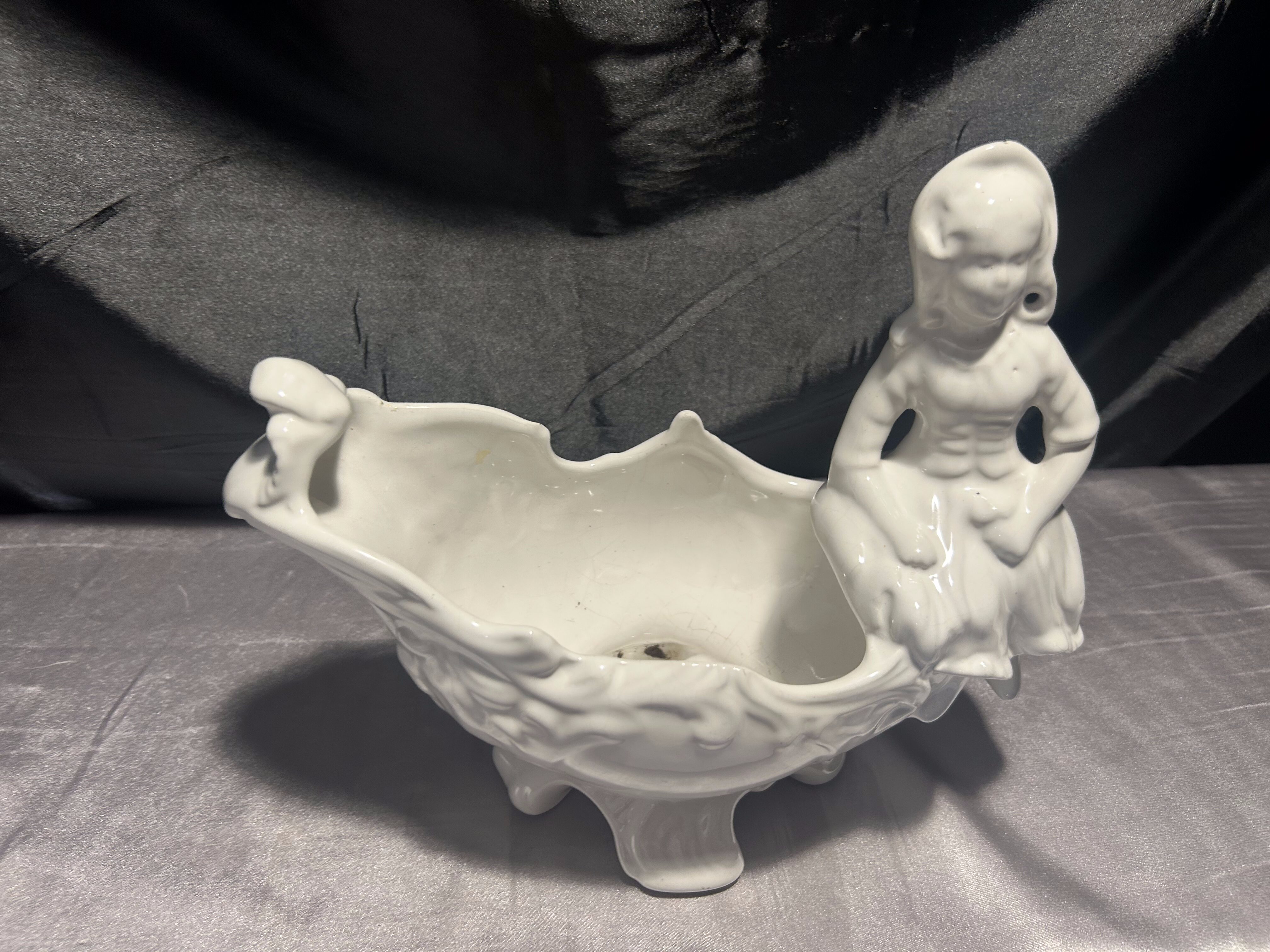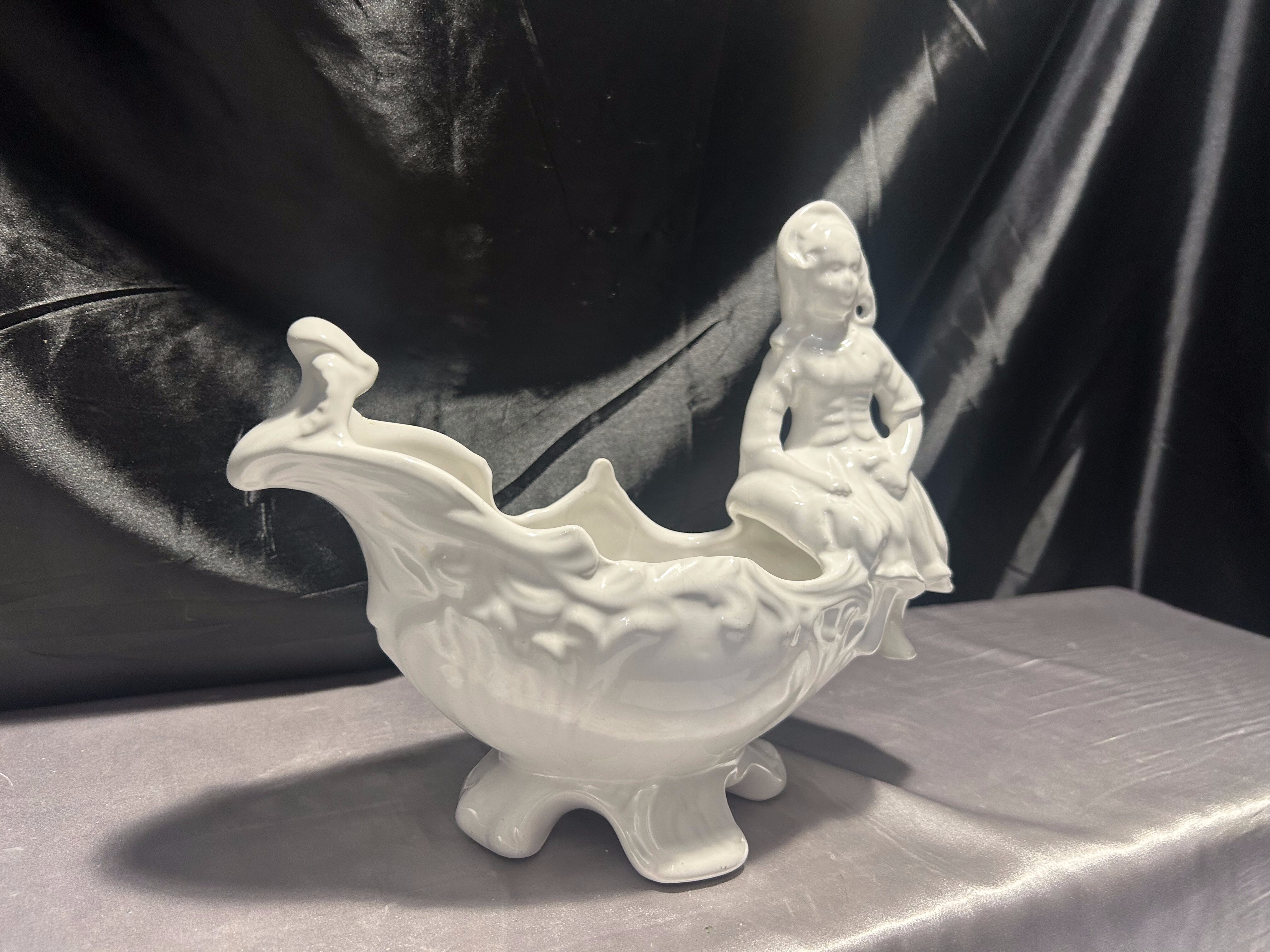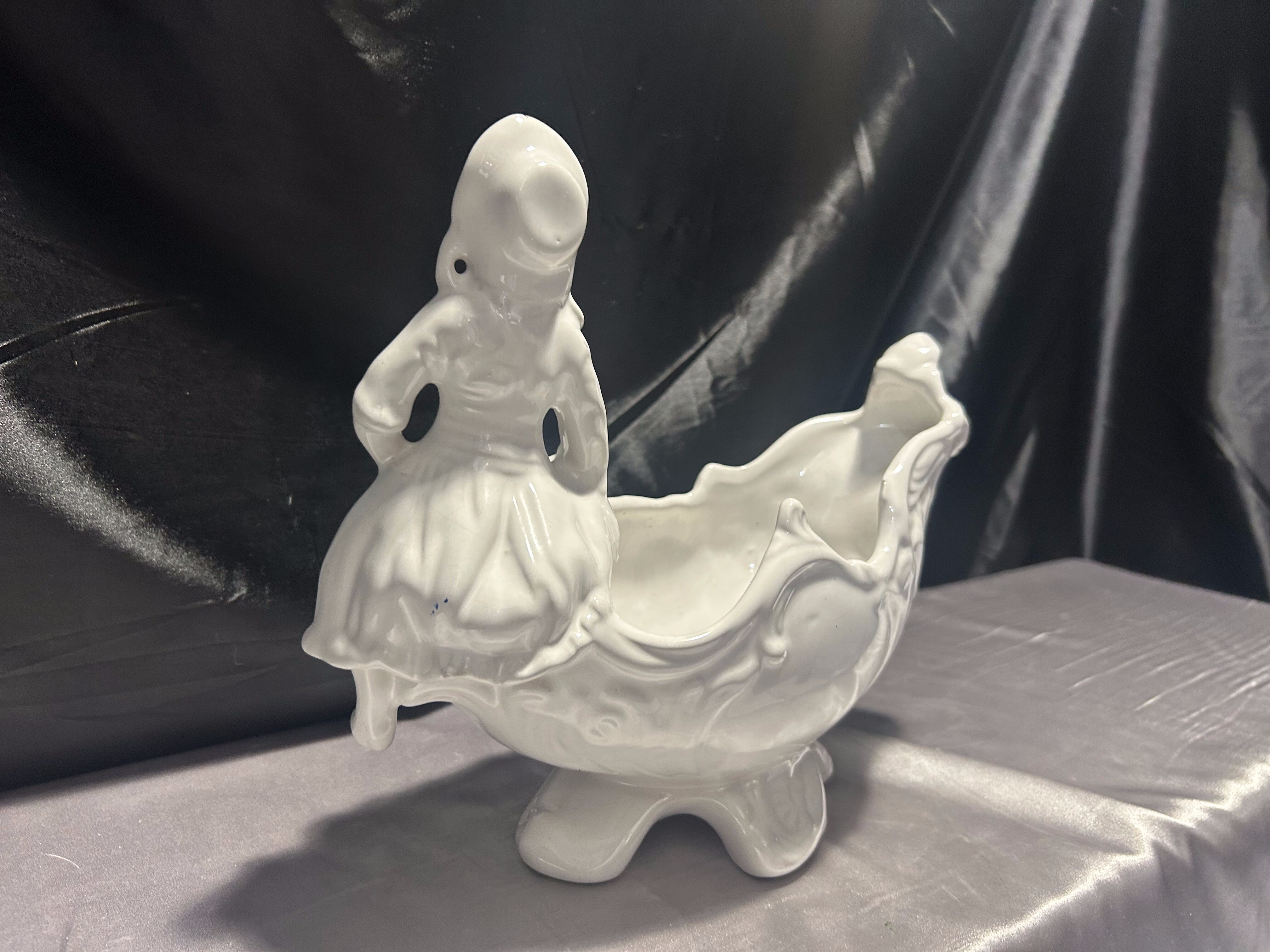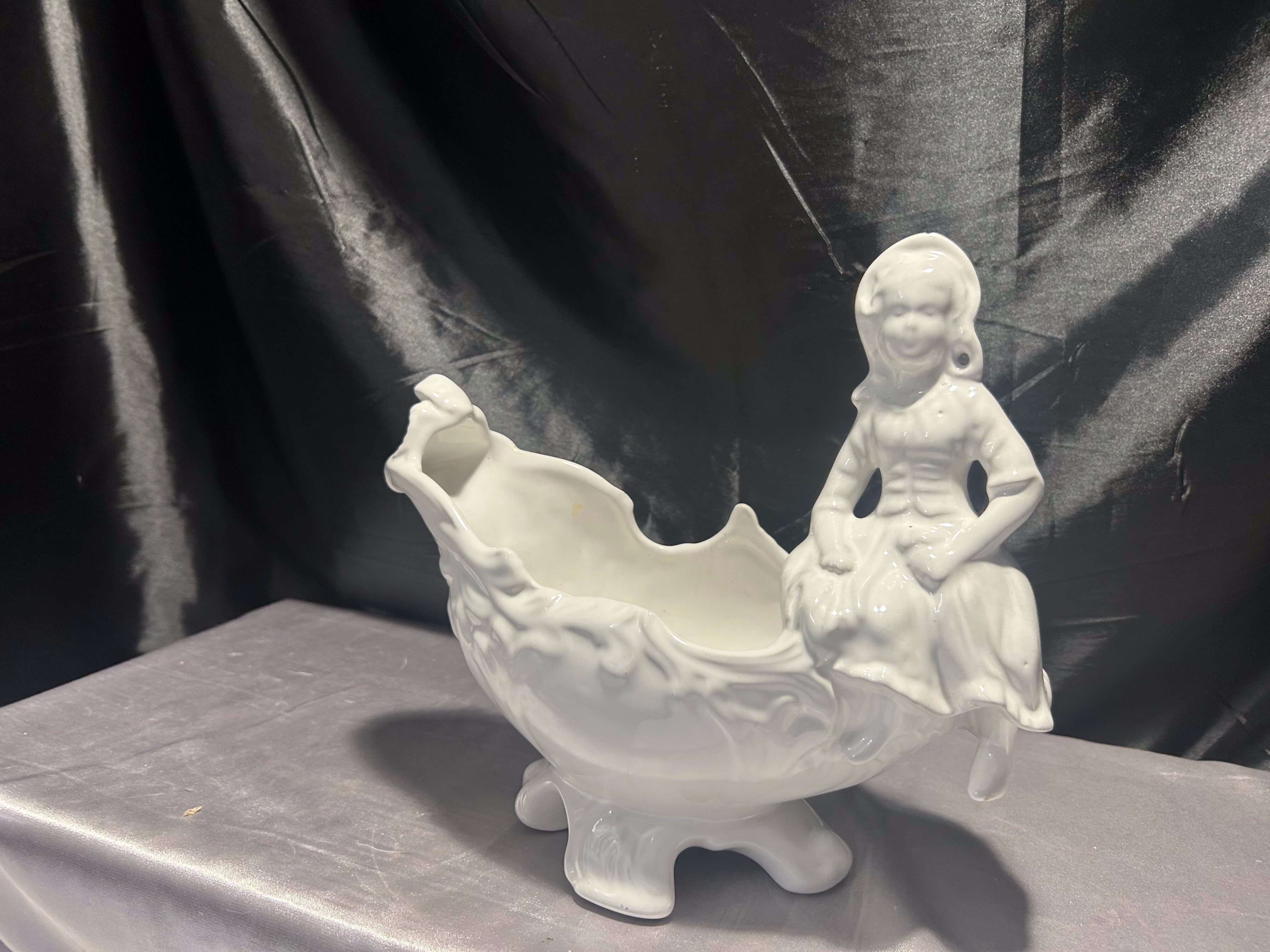 Porcelanowy kwietnik figuralny – z postacią siedzącej dziewczynki – biały