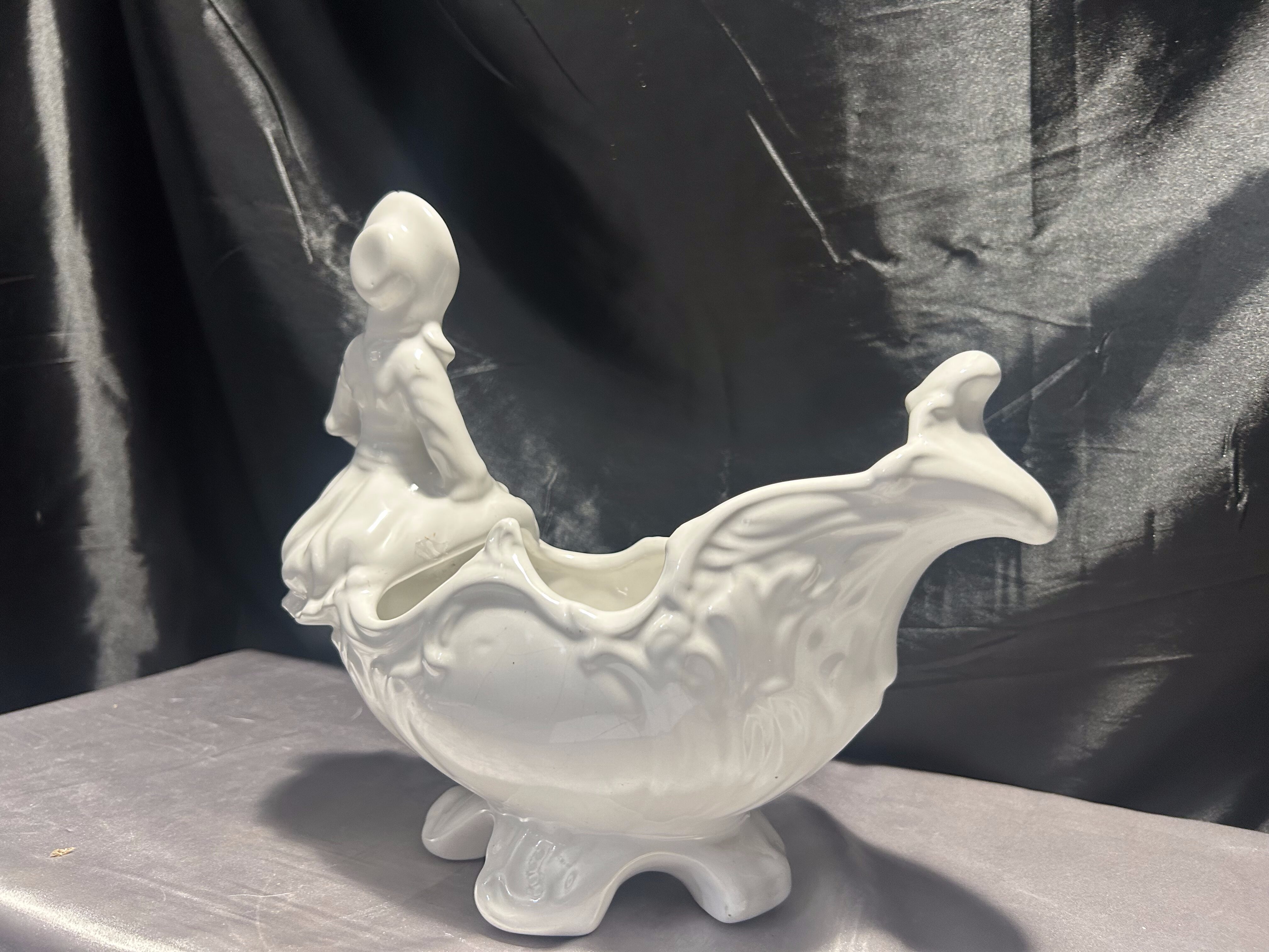Elegancki porcelanowy kwietnik figuralny w odcieniu klasycznej bieli, ozdobiony dekoracyjną postacią siedzącej dziewczynki. Całość utrzymana w romantycznym, nieco rokokowym stylu, z finezyjnie falowanymi krawędziami oraz delikatnym reliefem w formie roślinnych zdobień.