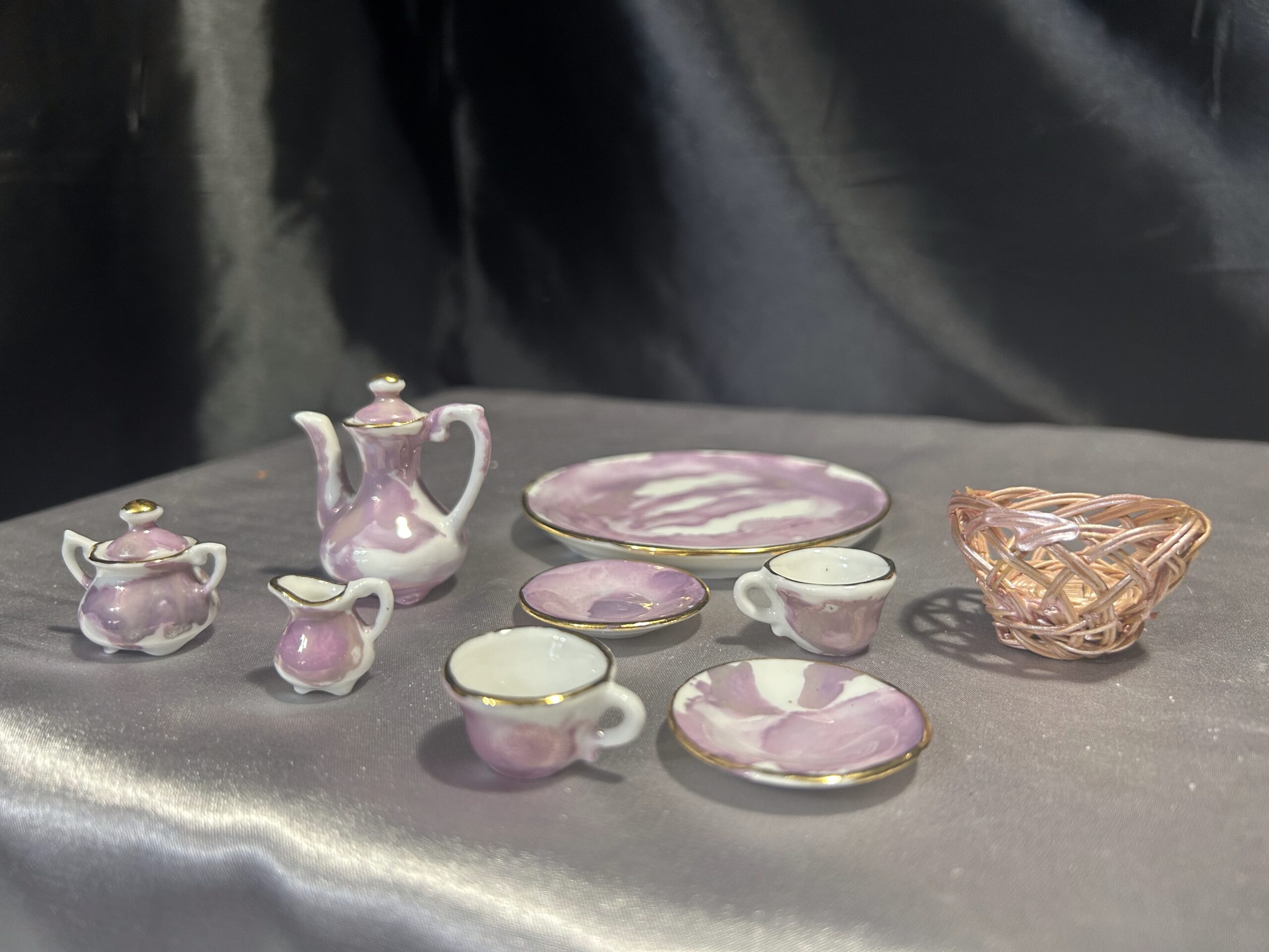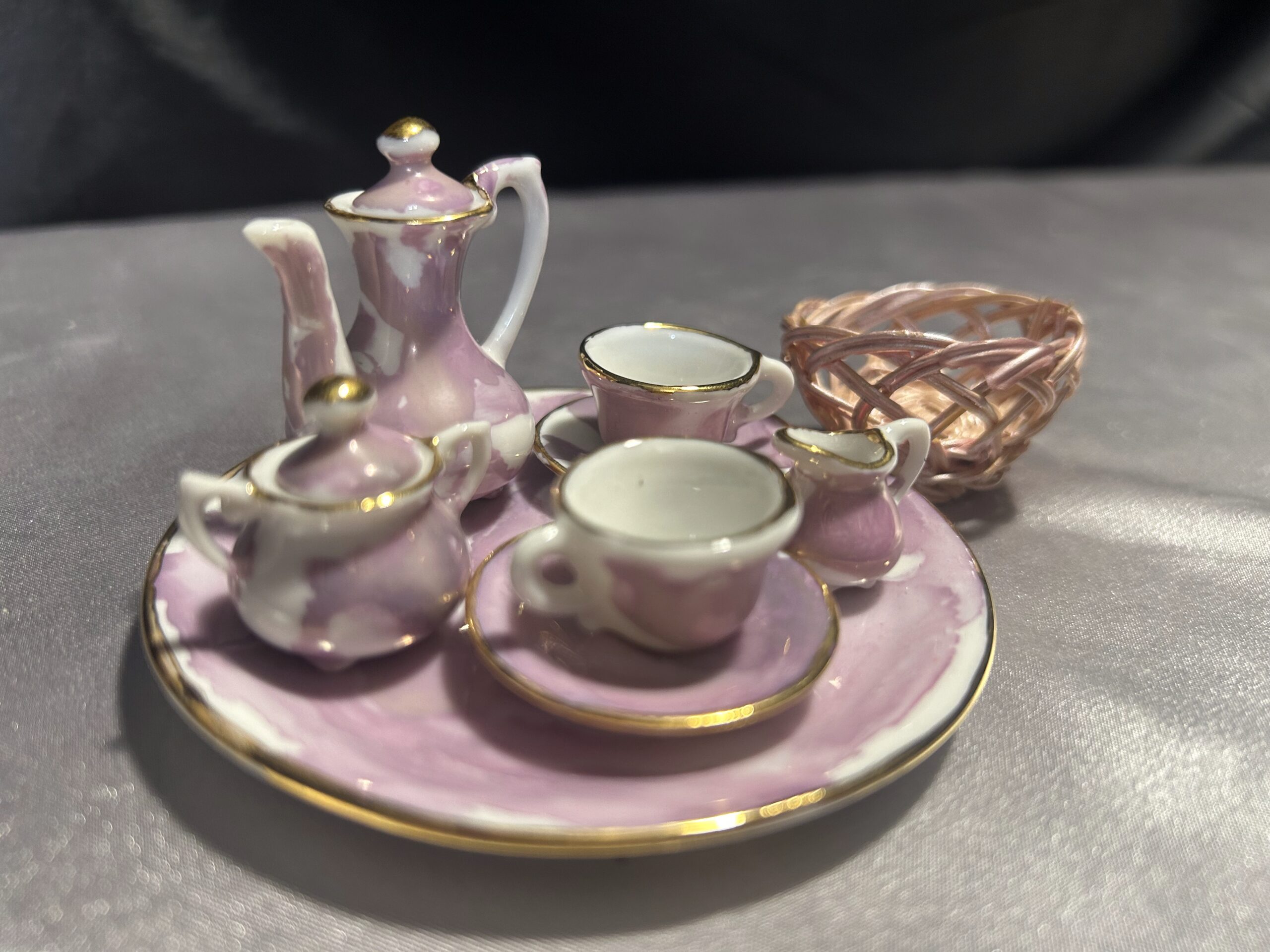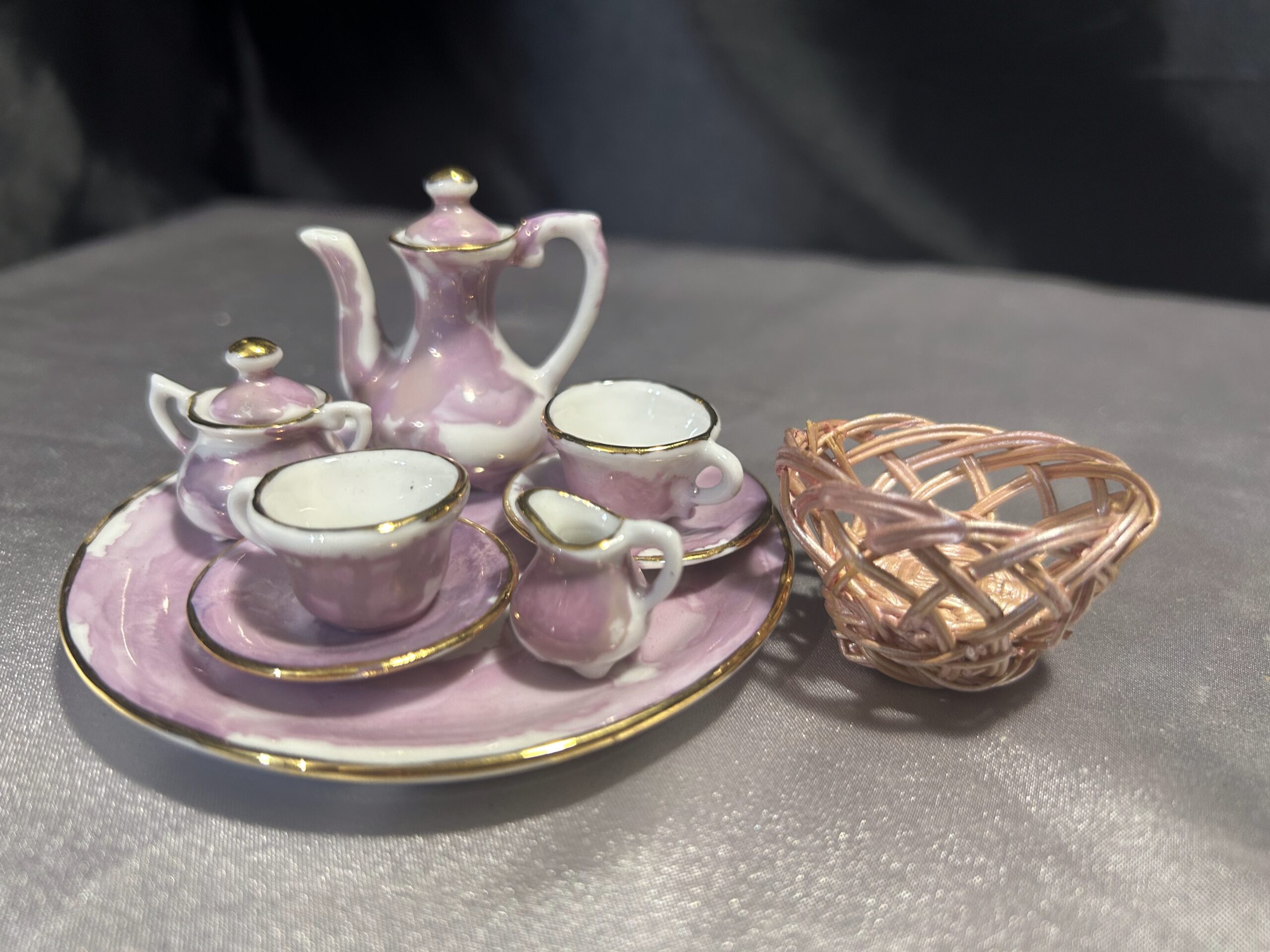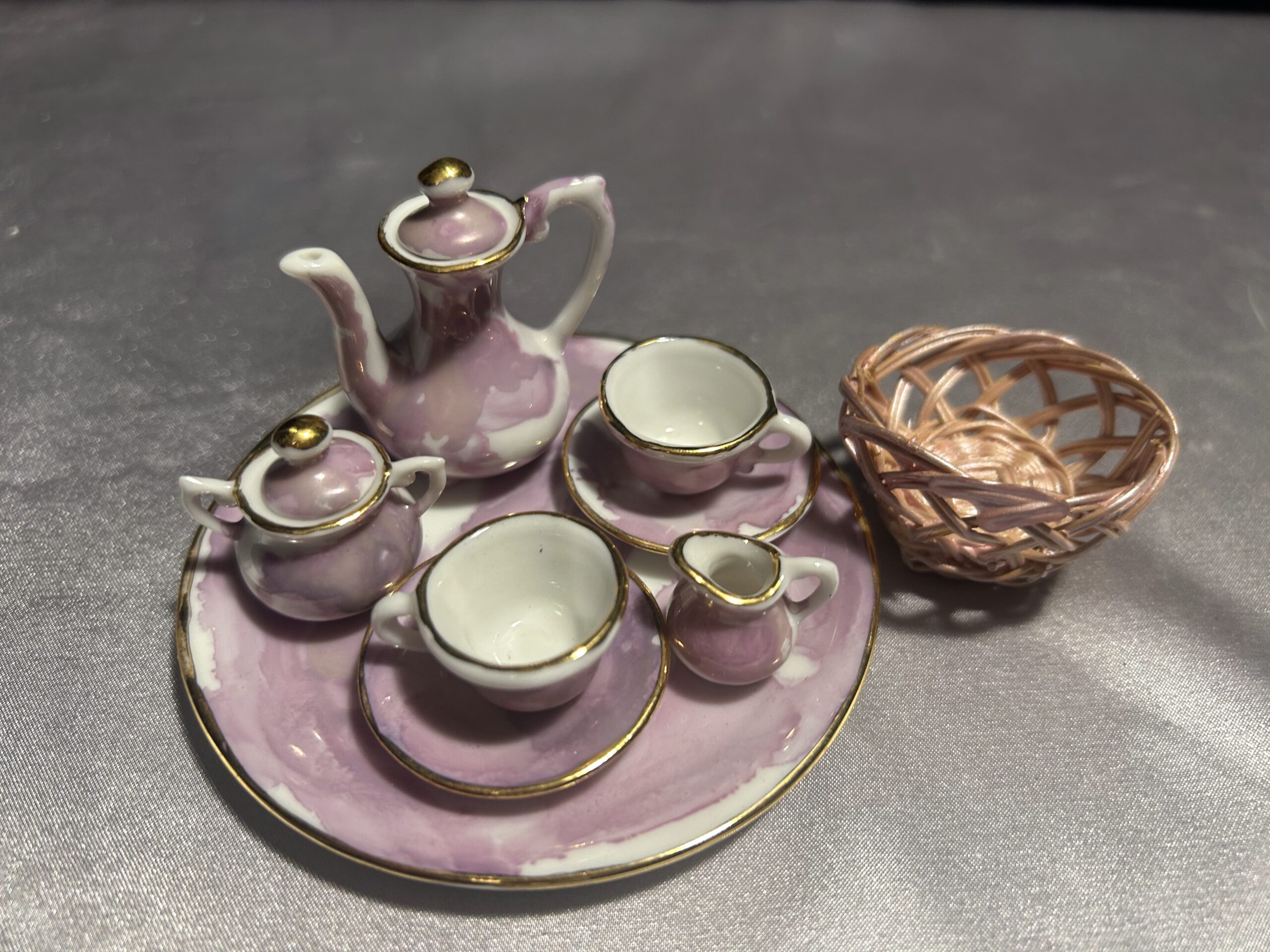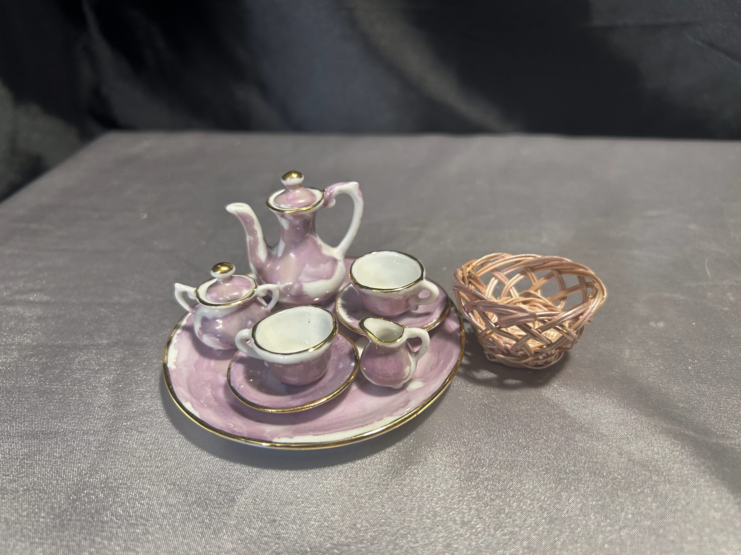 - Elementy zestawu dzbanek, dwie filiżanki ze spodkami, mlecznik, cukiernica, taca, wiklinowy koszyczek