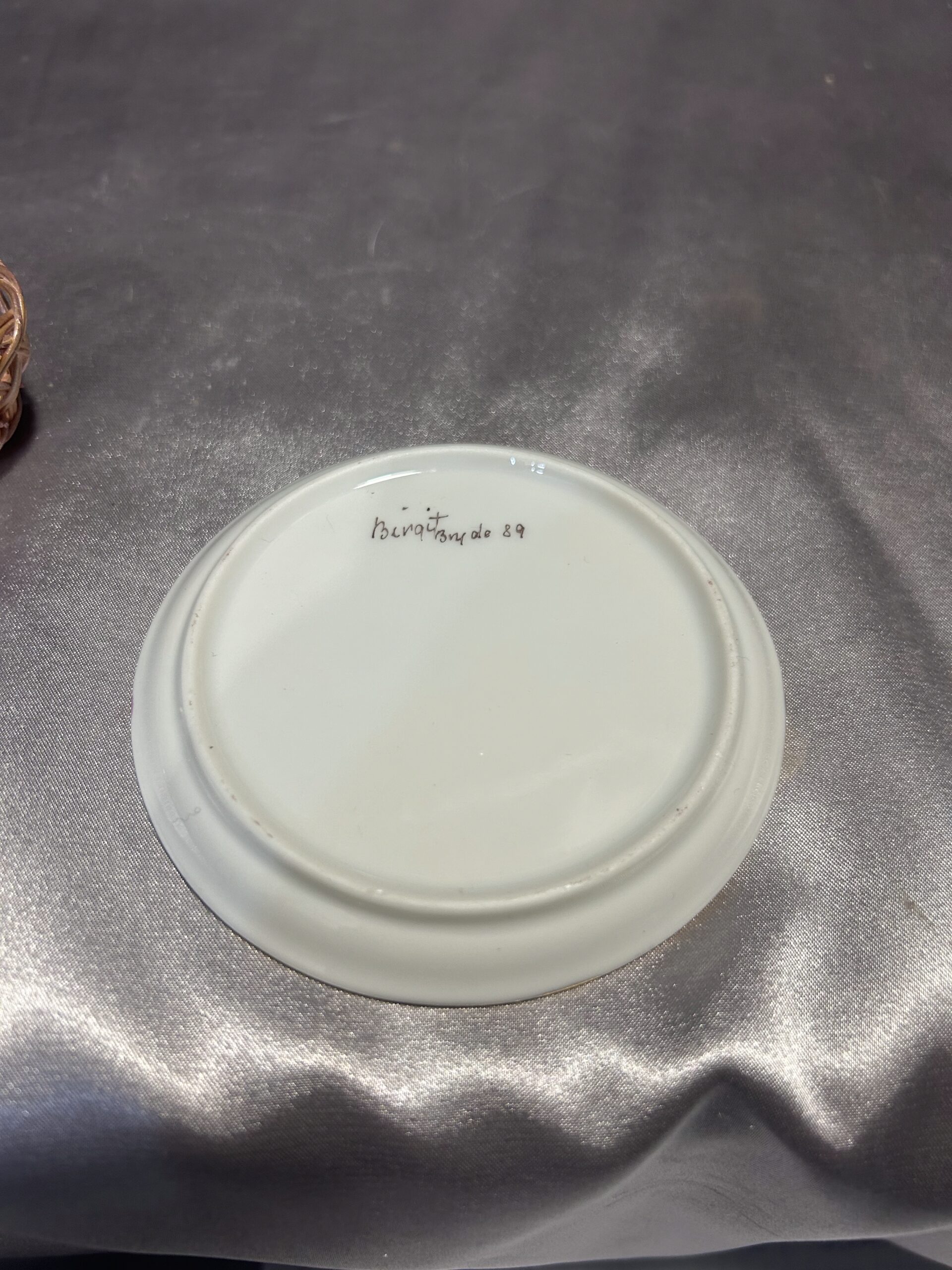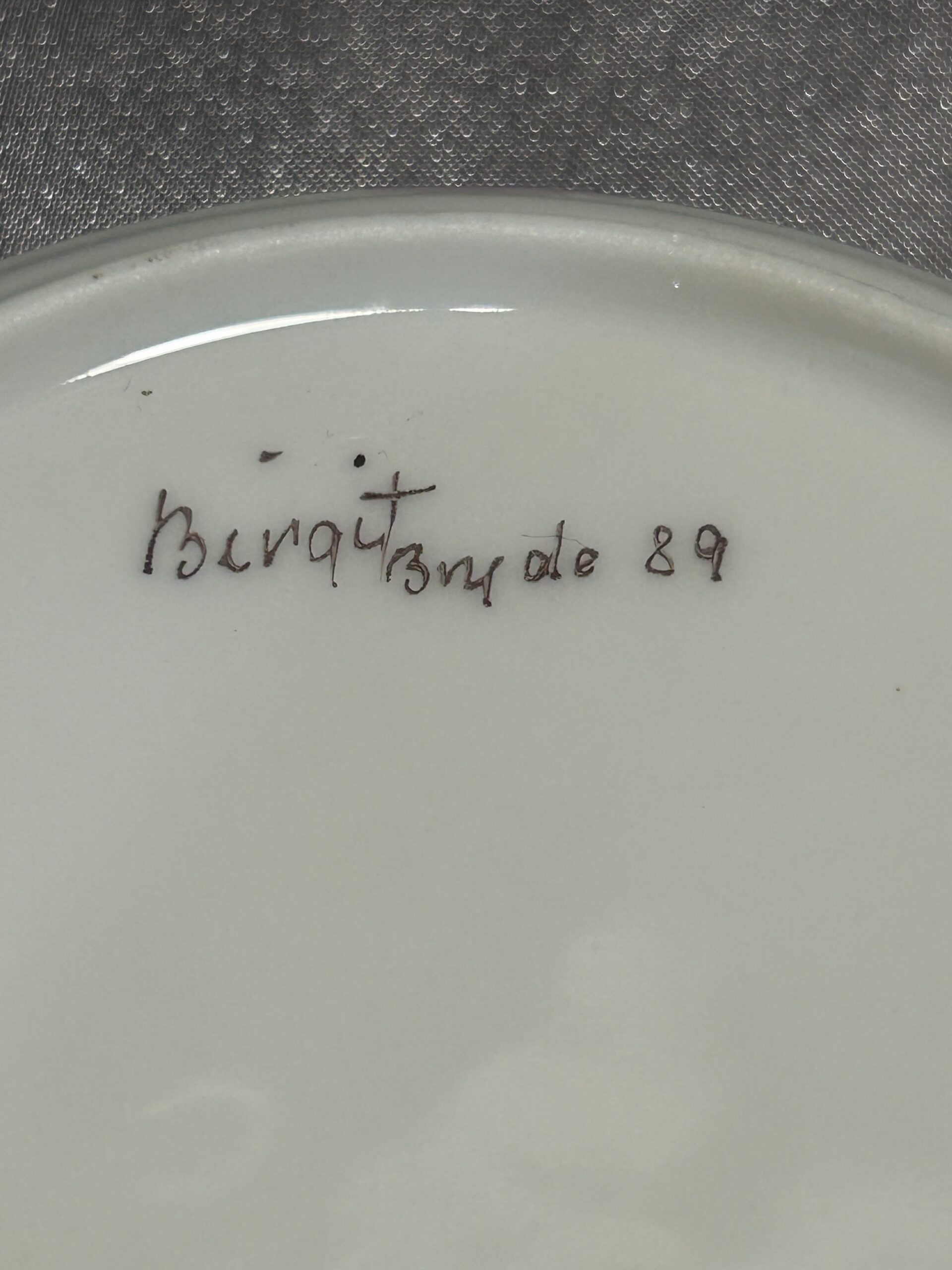 Zdobiony w subtelne fioletowo białe odcienie, prezentuje harmonijną kompozycję, idealnie pasującą do klasycznych i stylowych wnętrz. Na spodzie znajduje się sygnatura Birgit Bryde 89, co świadczy o wyjątkowym pochodzeniu i artystycznej wartości zestawu.