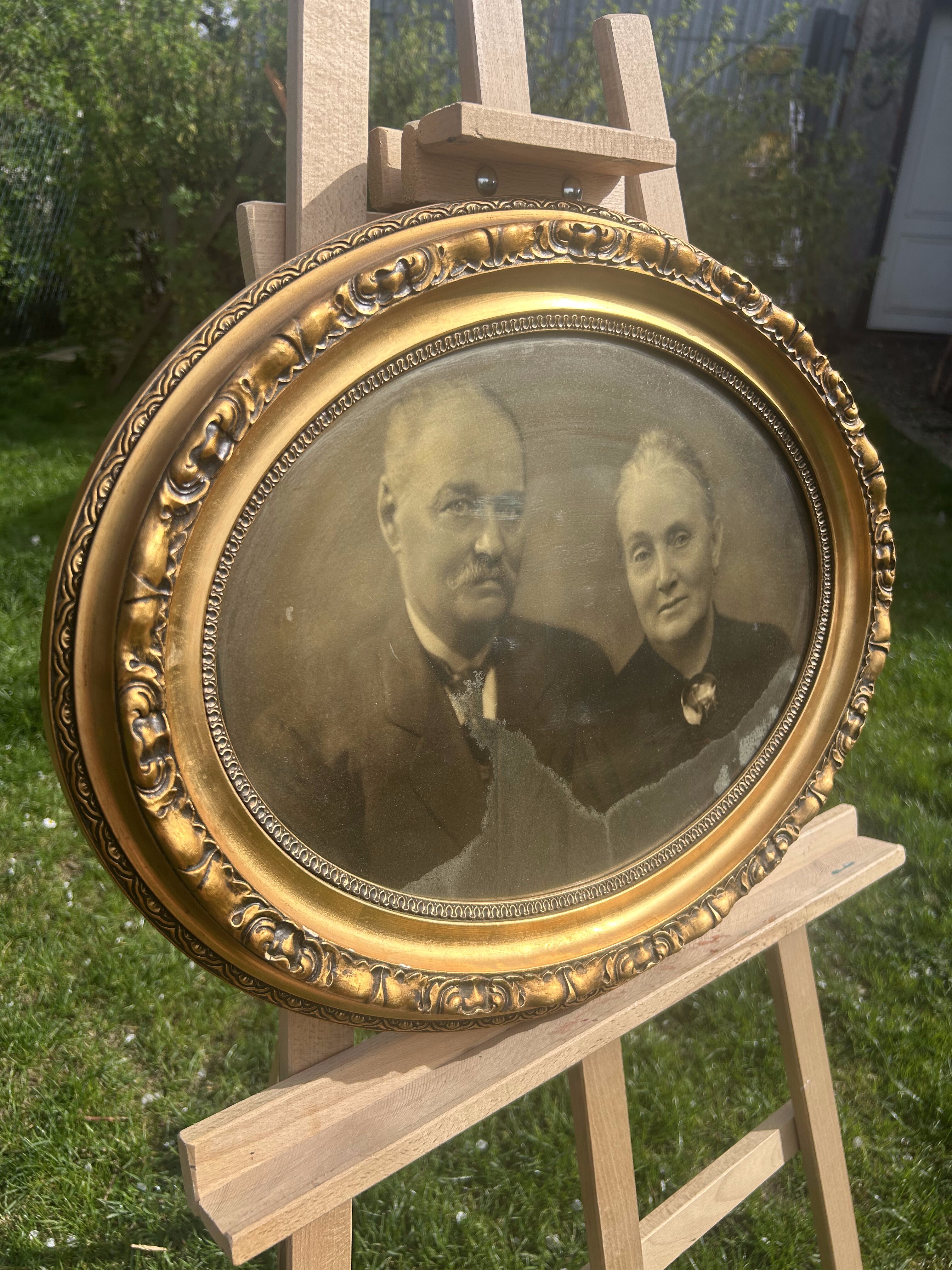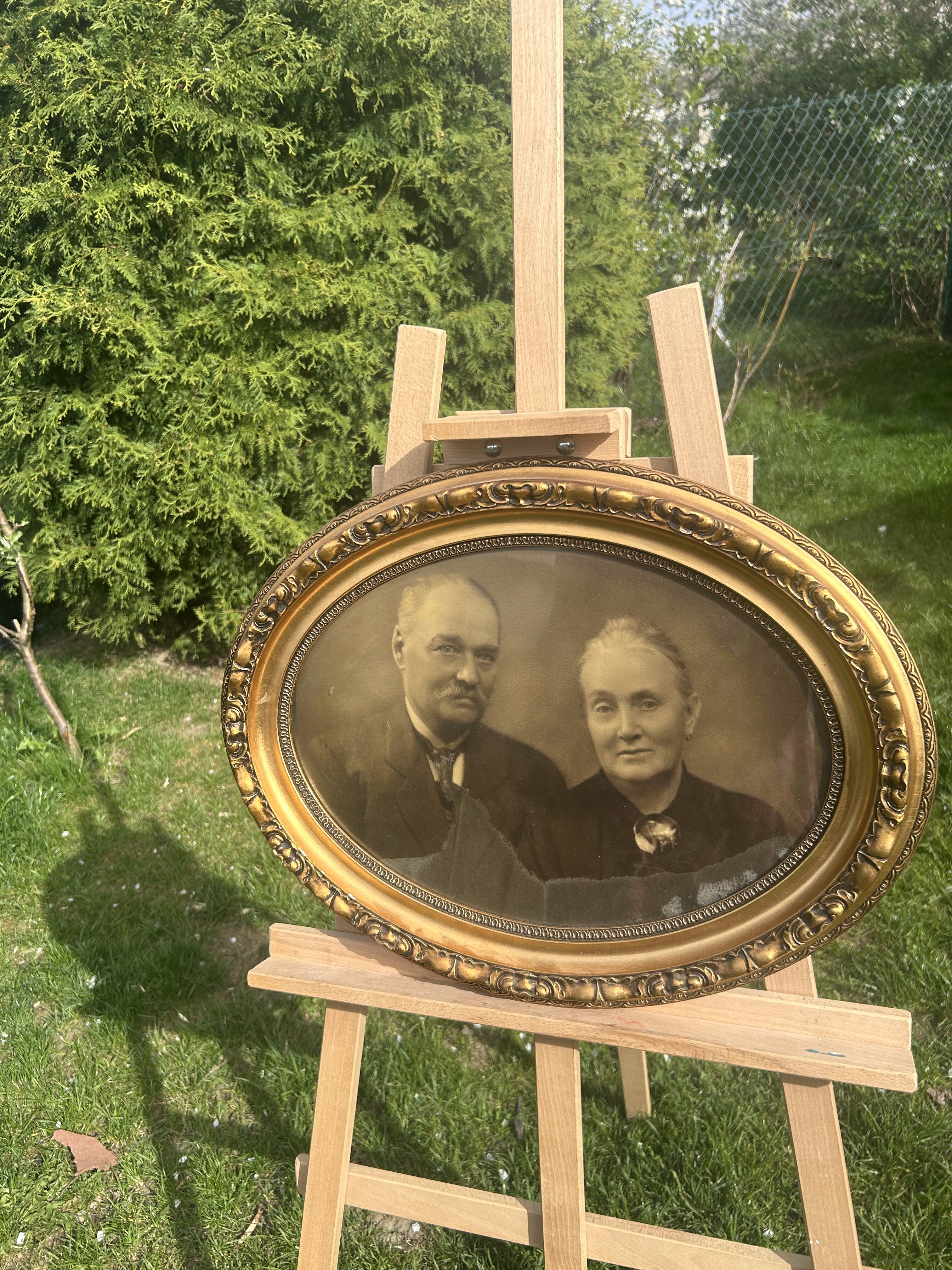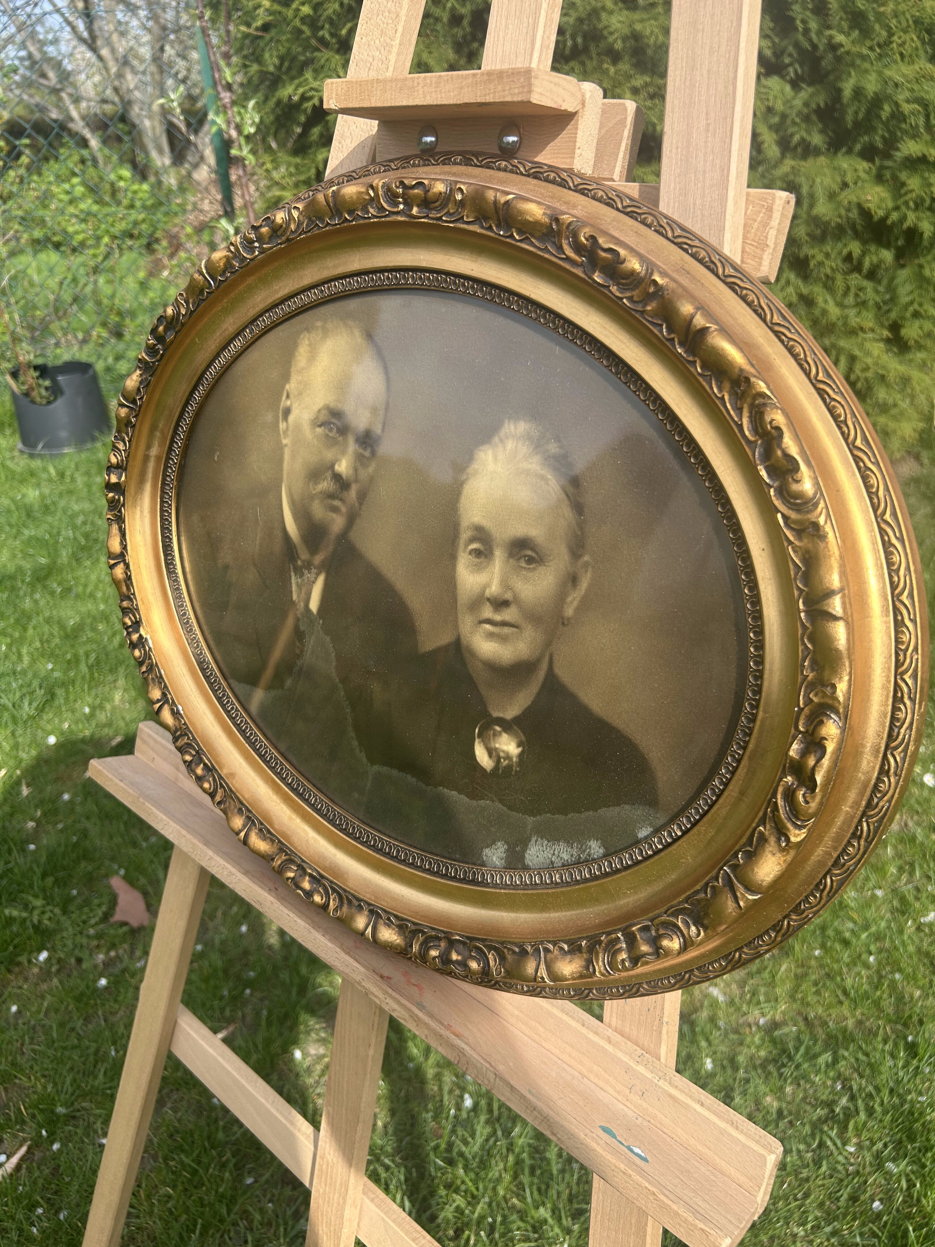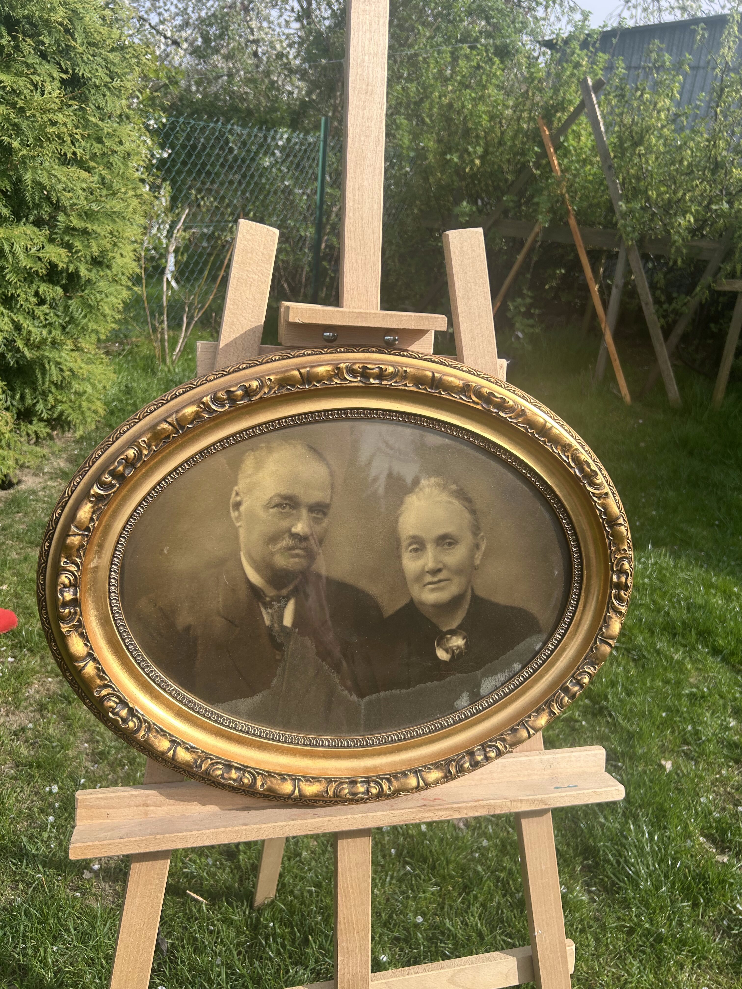 Unikalny portret fotograficzny starszej pary w eleganckiej, owalnej ramie drewnianej, bogato zdobionej i wyposażonej w oryginalne szkło. Fotografia utrzymana jest w sepii, co nadaje jej nostalgicznego, sentymentalnego charakteru – idealnie oddaje ducha dawnych czasów. Rama posiada finezyjny relief w stylu klasycznym, dzięki czemu stanowi nie tylko oprawę zdjęcia, ale również dekoracyjny element wystroju wnętrza.