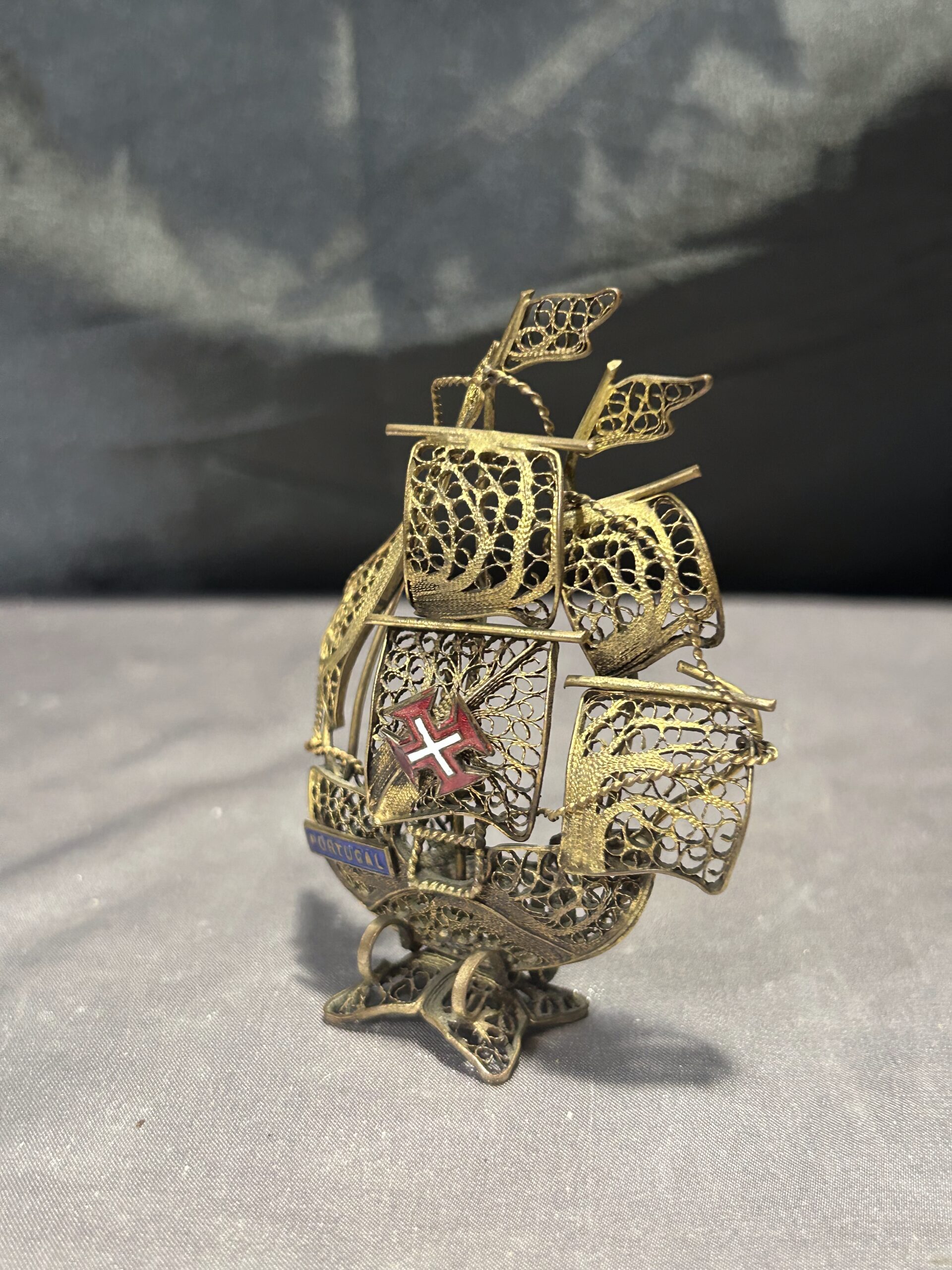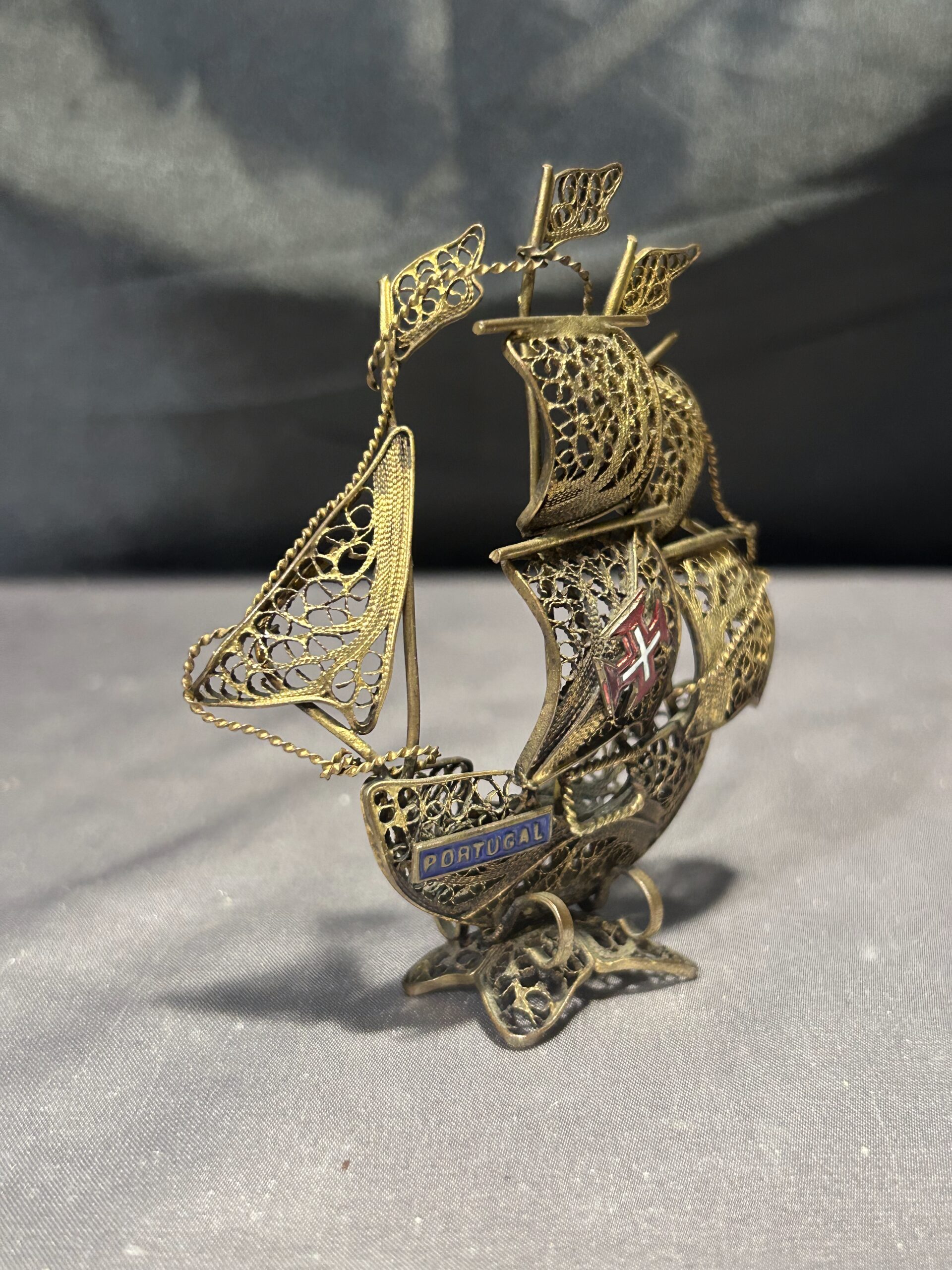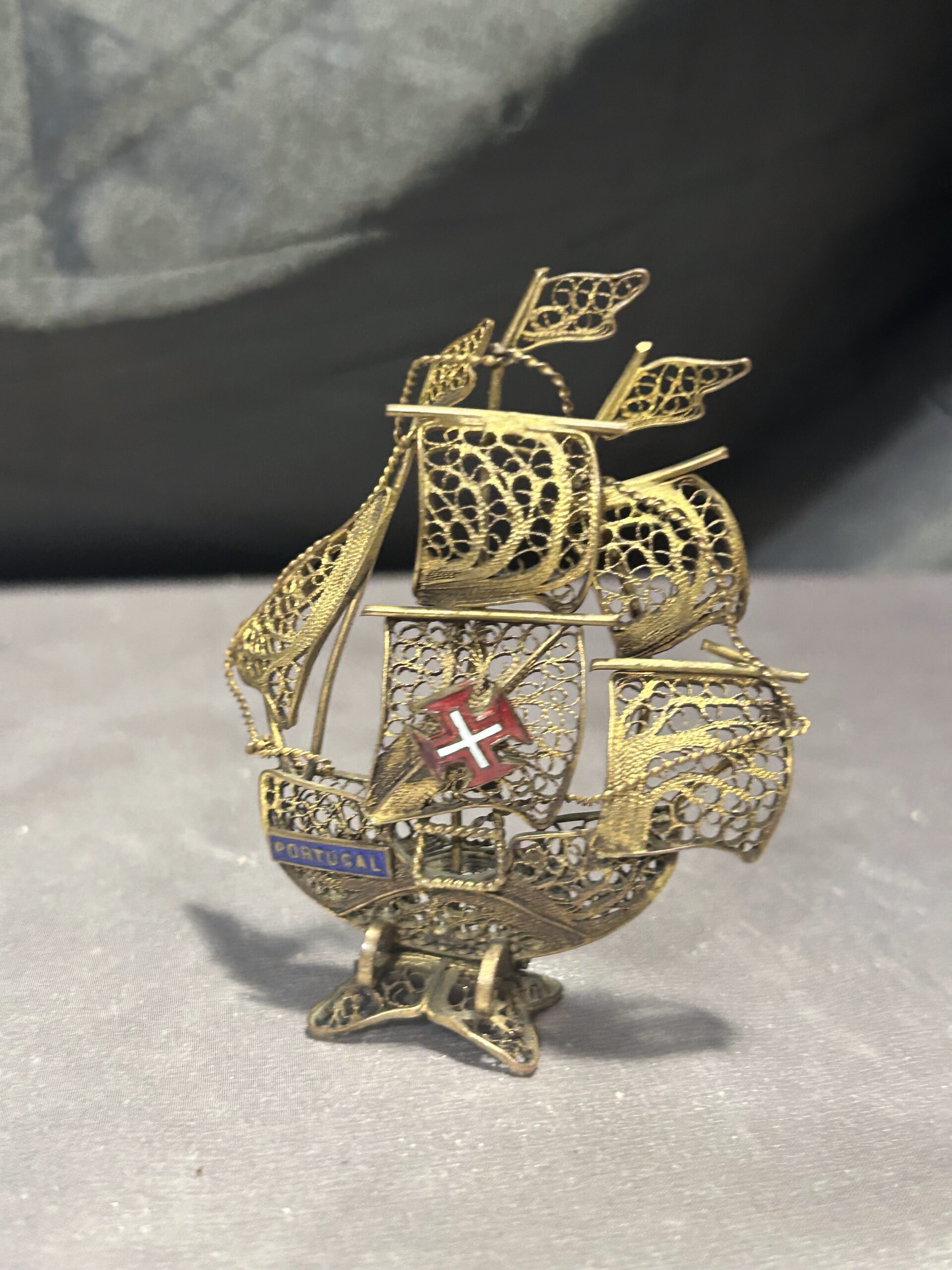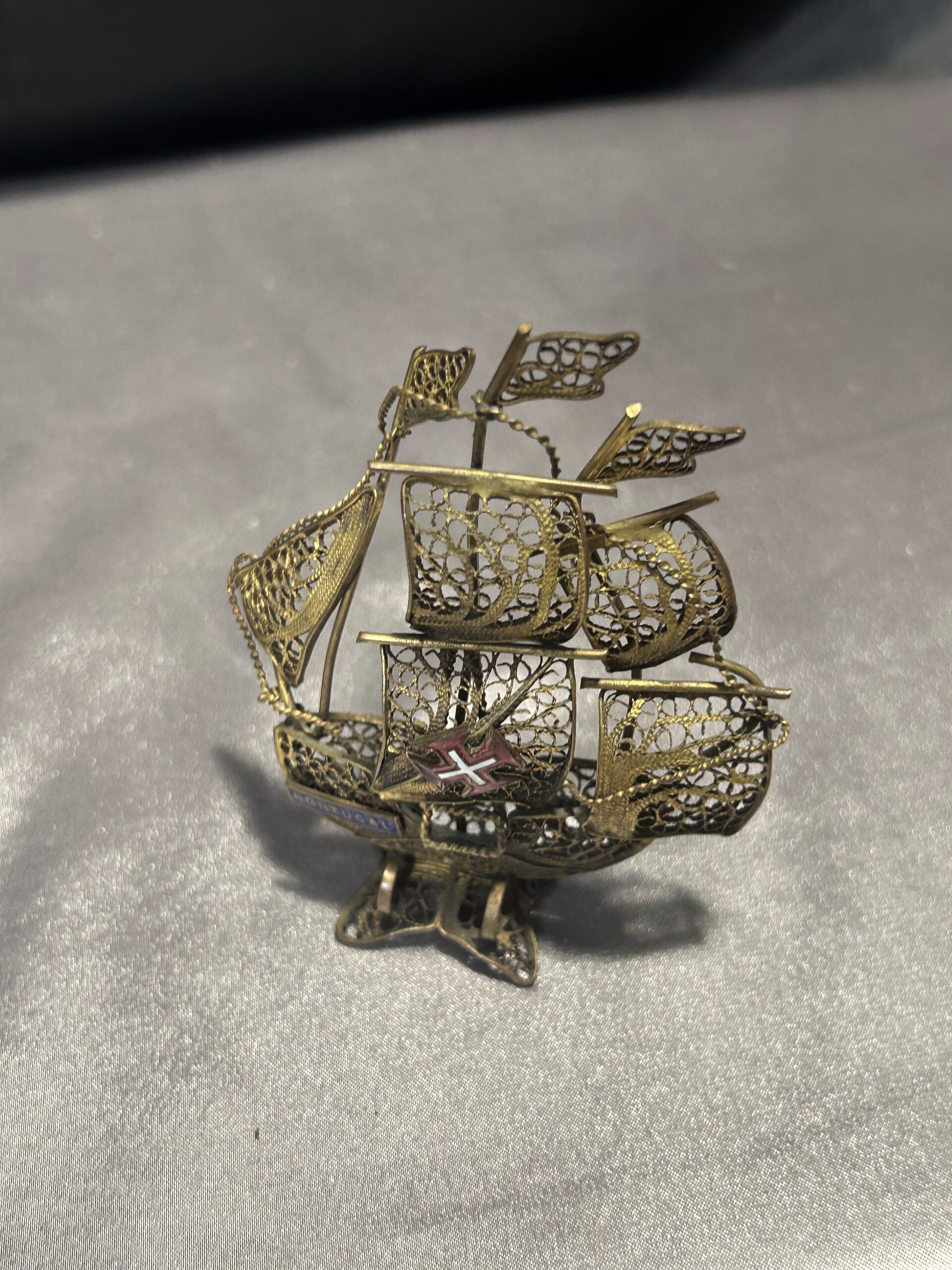 Typ: portugalski żaglowiec, statek z mosiądzu, ażurowa figurka